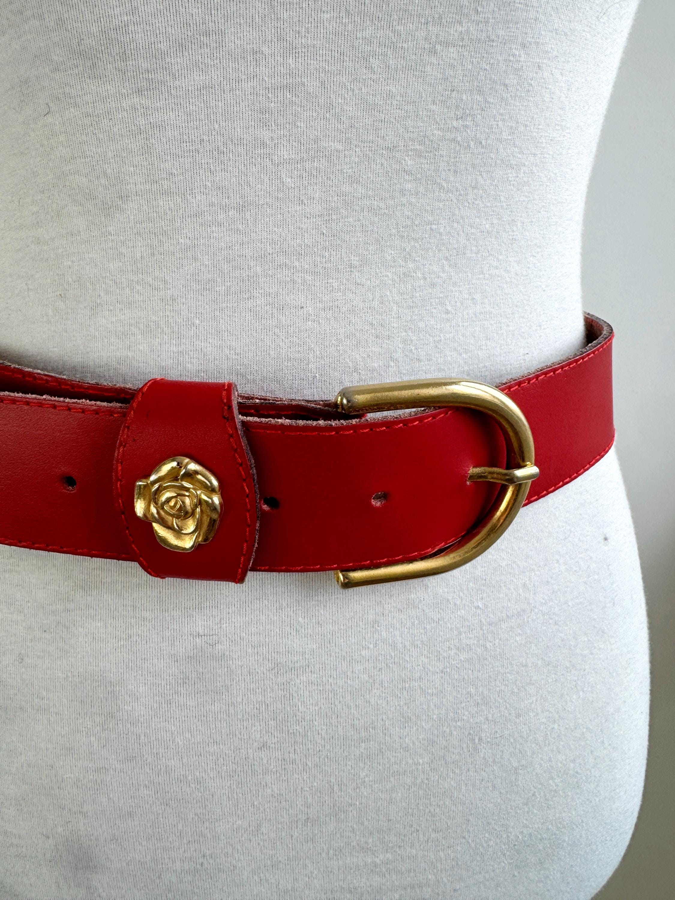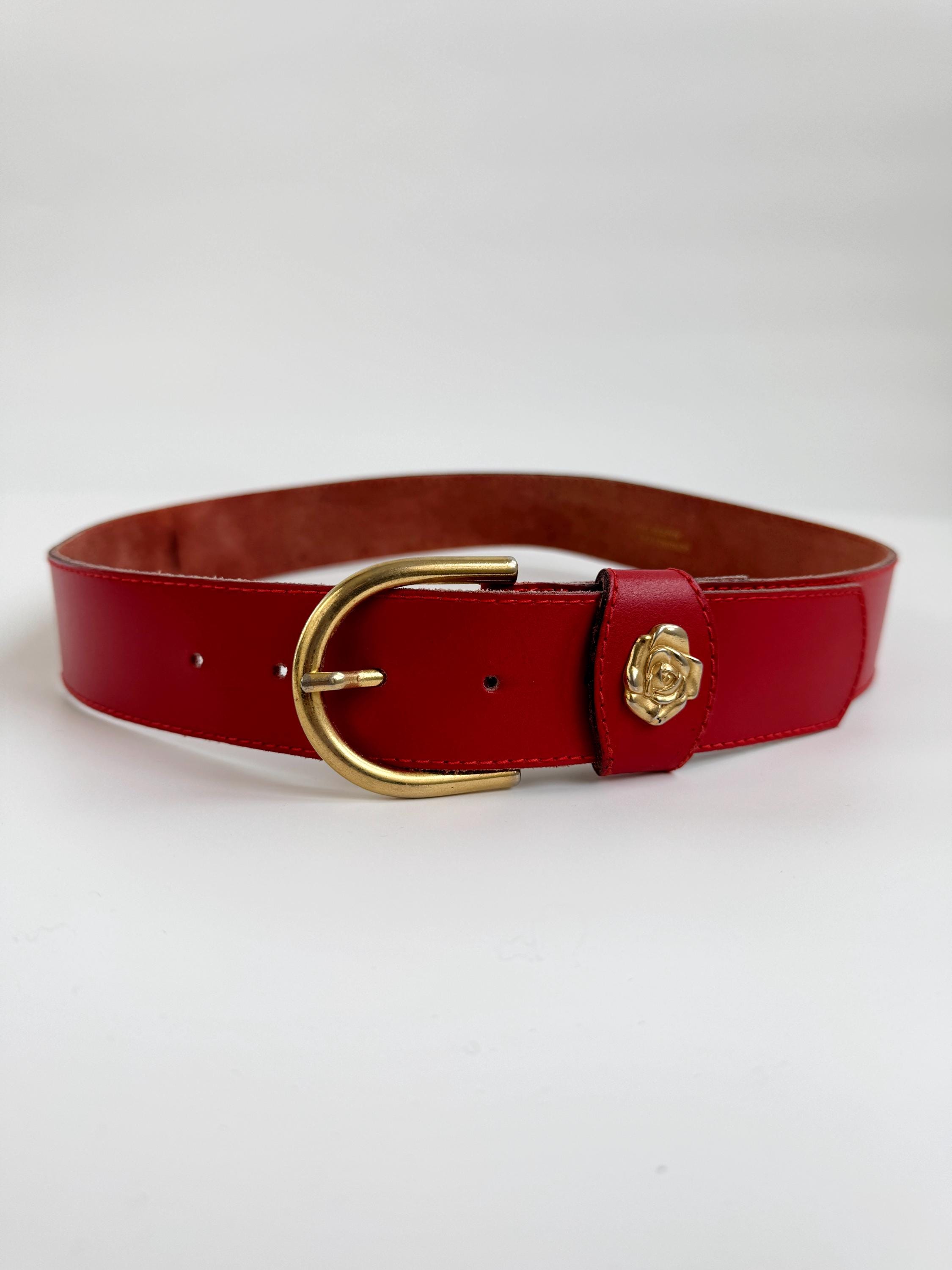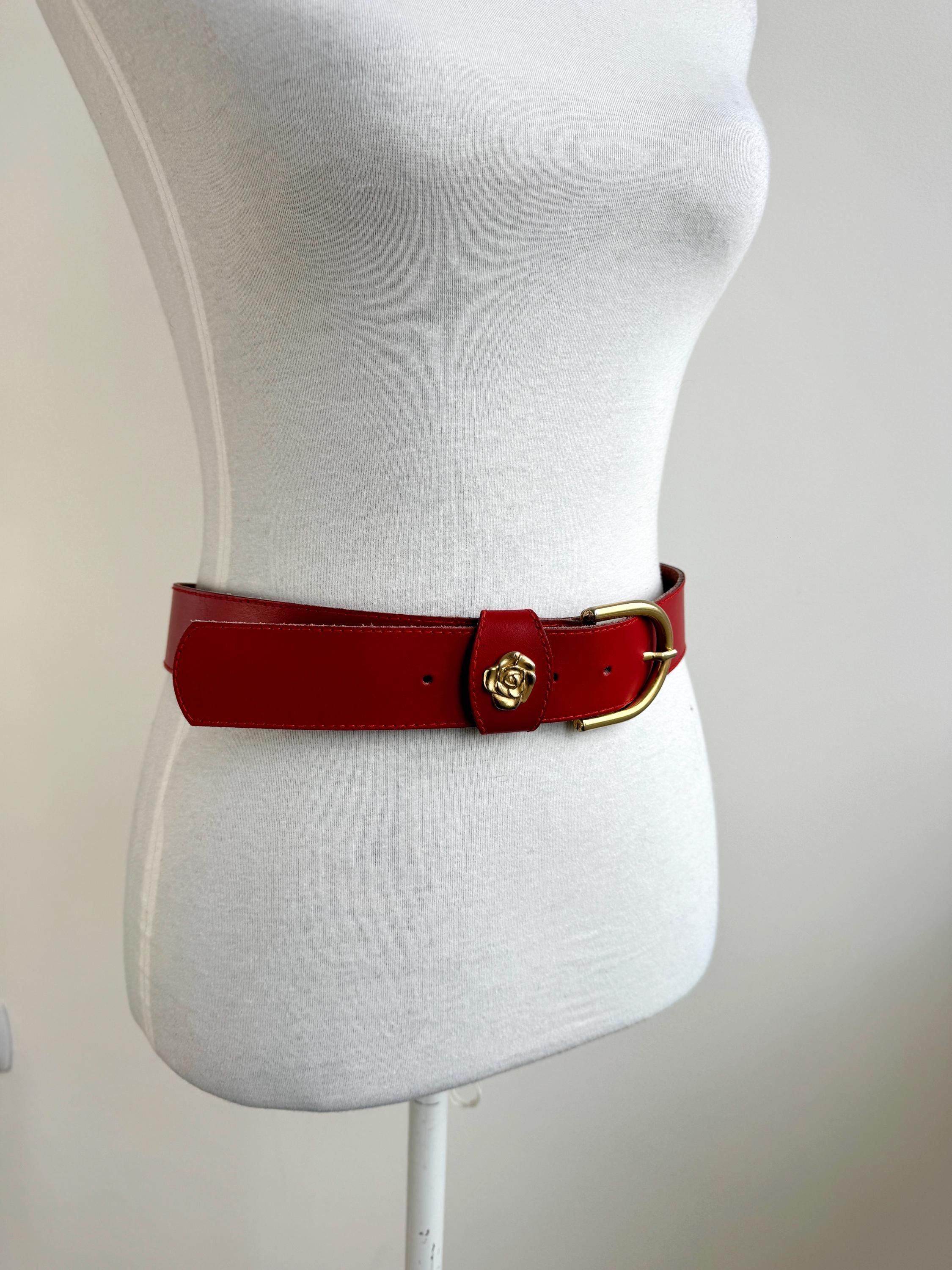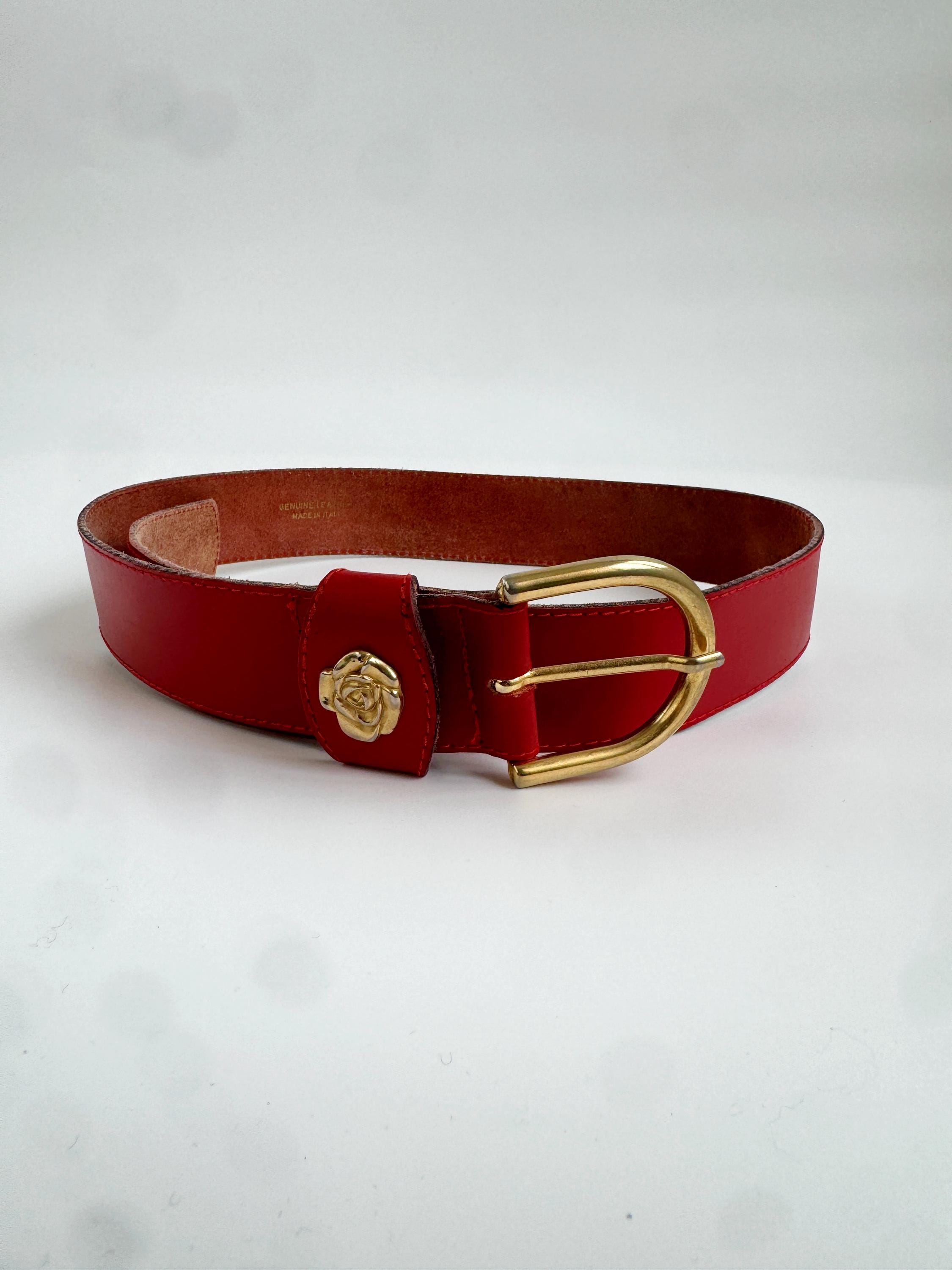 Make a bold statement with this vibrant red vintage belt, expertly crafted in Italy. This eye-catching real leather belt features a substantial width that’s perfect for cinching the waist of a blazer, oversized shirt, or your favorite high-waisted denim. The highlight is the gorgeous 3D gold-tone rose embellishment on the keeper, adding a touch of romantic, feminine flair to the smooth genuine leather.
