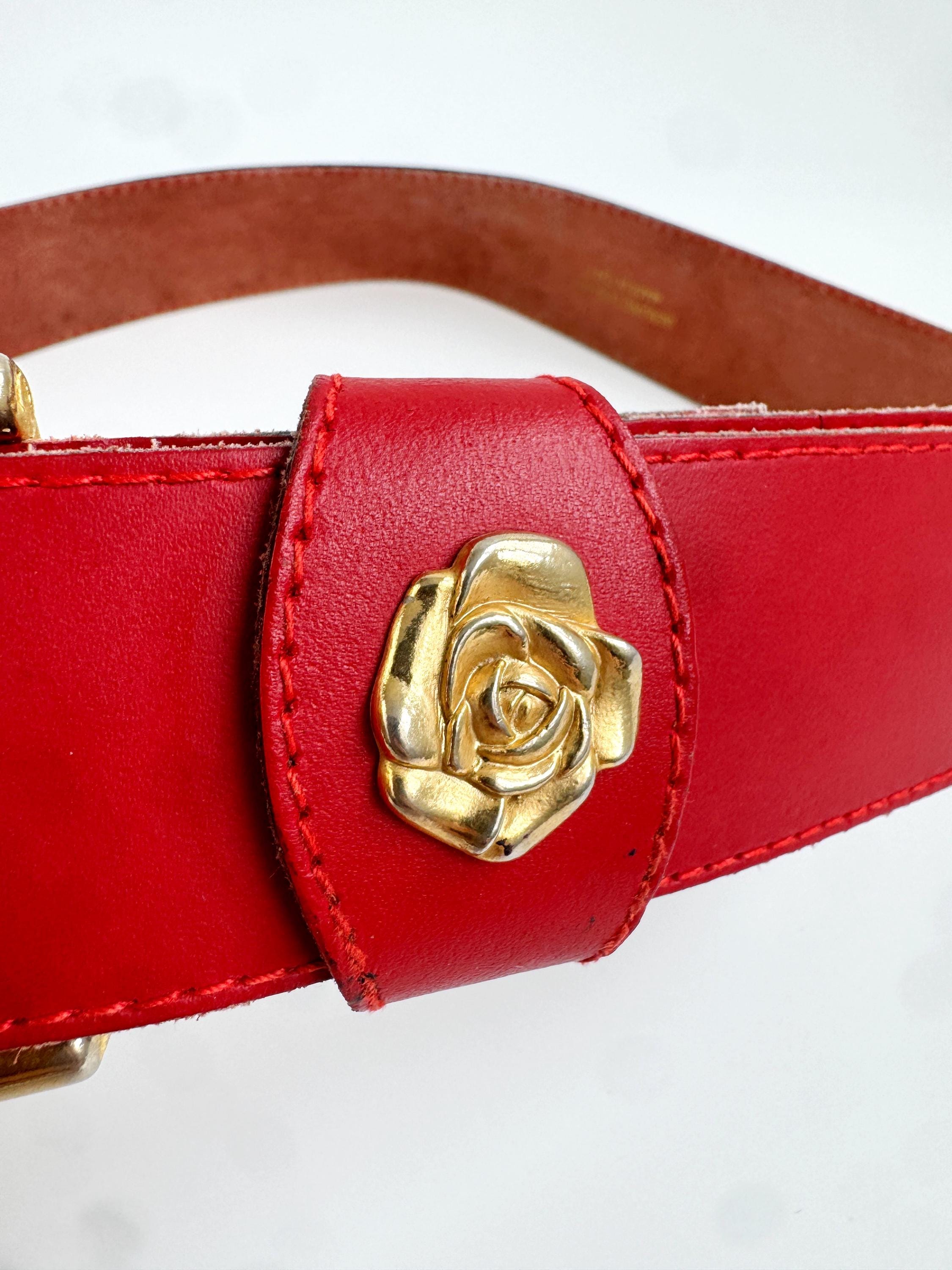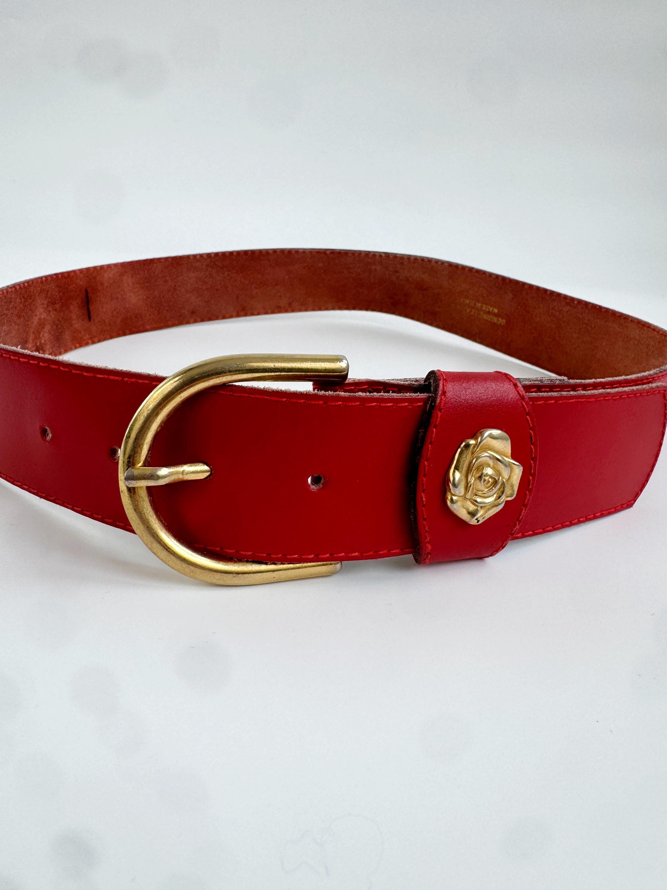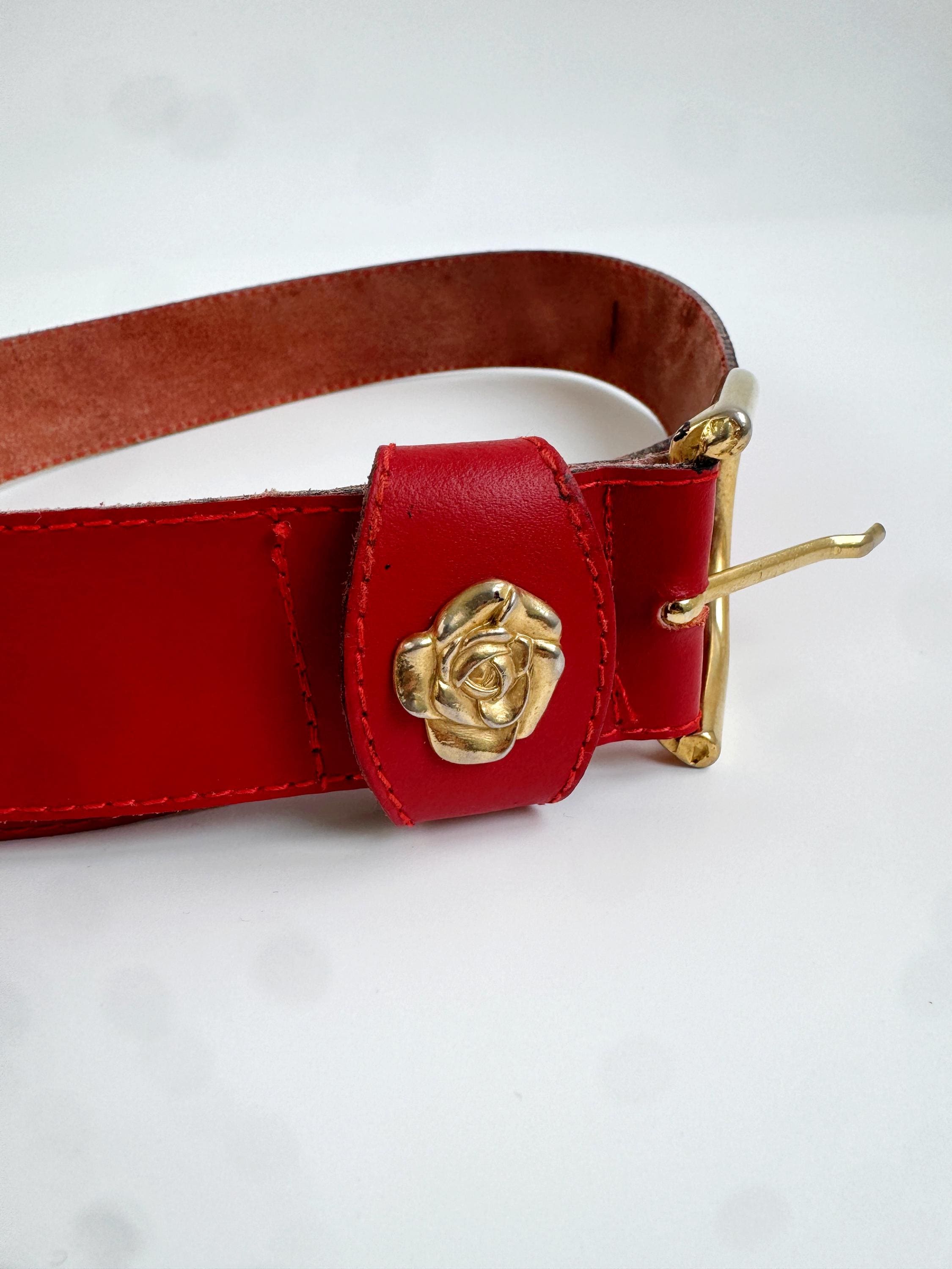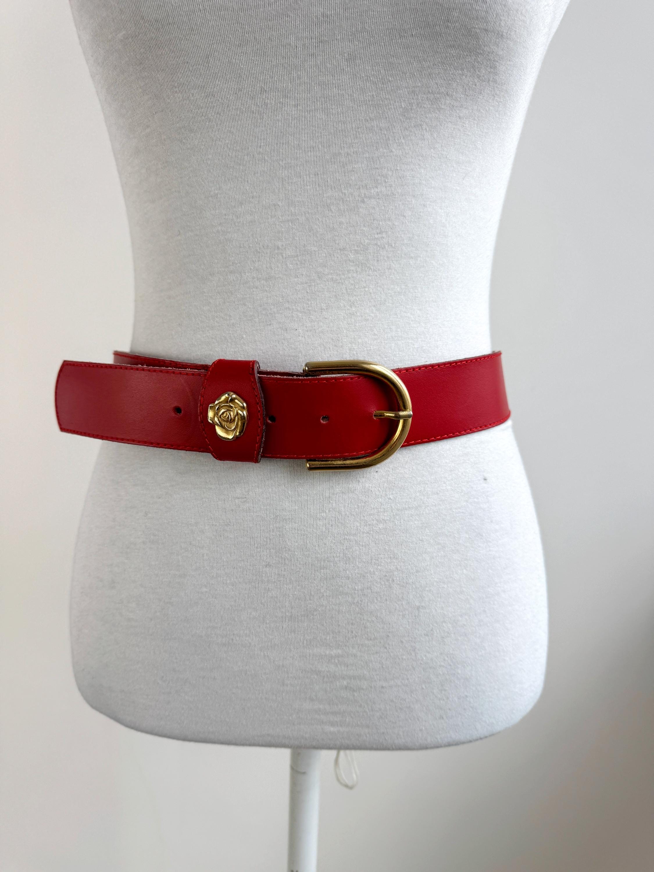 Make a bold statement with this vibrant red vintage belt, expertly crafted in Italy. This eye-catching real leather belt features a substantial width that’s perfect for cinching the waist of a blazer, oversized shirt, or your favorite high-waisted denim. The highlight is the gorgeous 3D gold-tone rose embellishment on the keeper, adding a touch of romantic, feminine flair to the smooth genuine leather.