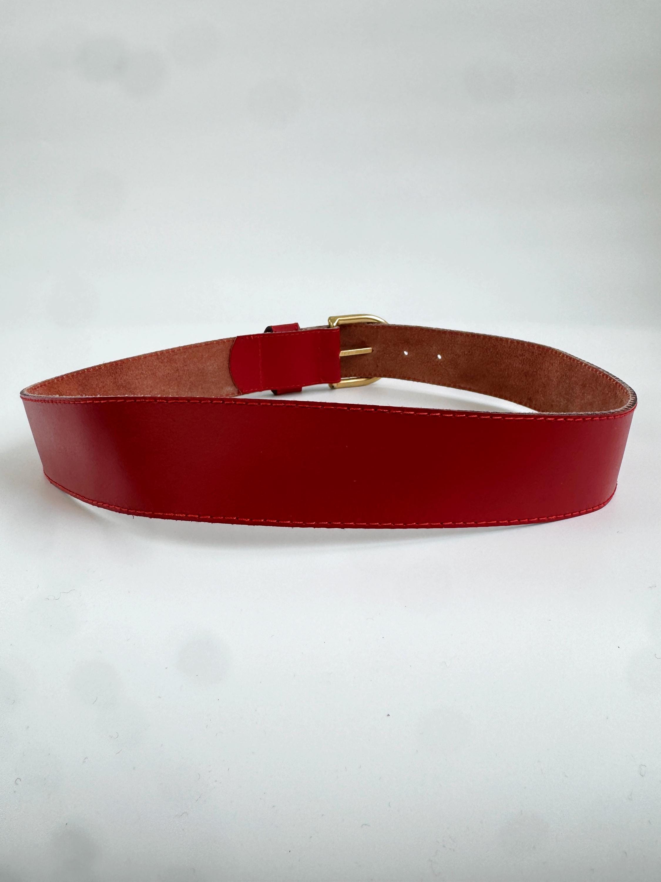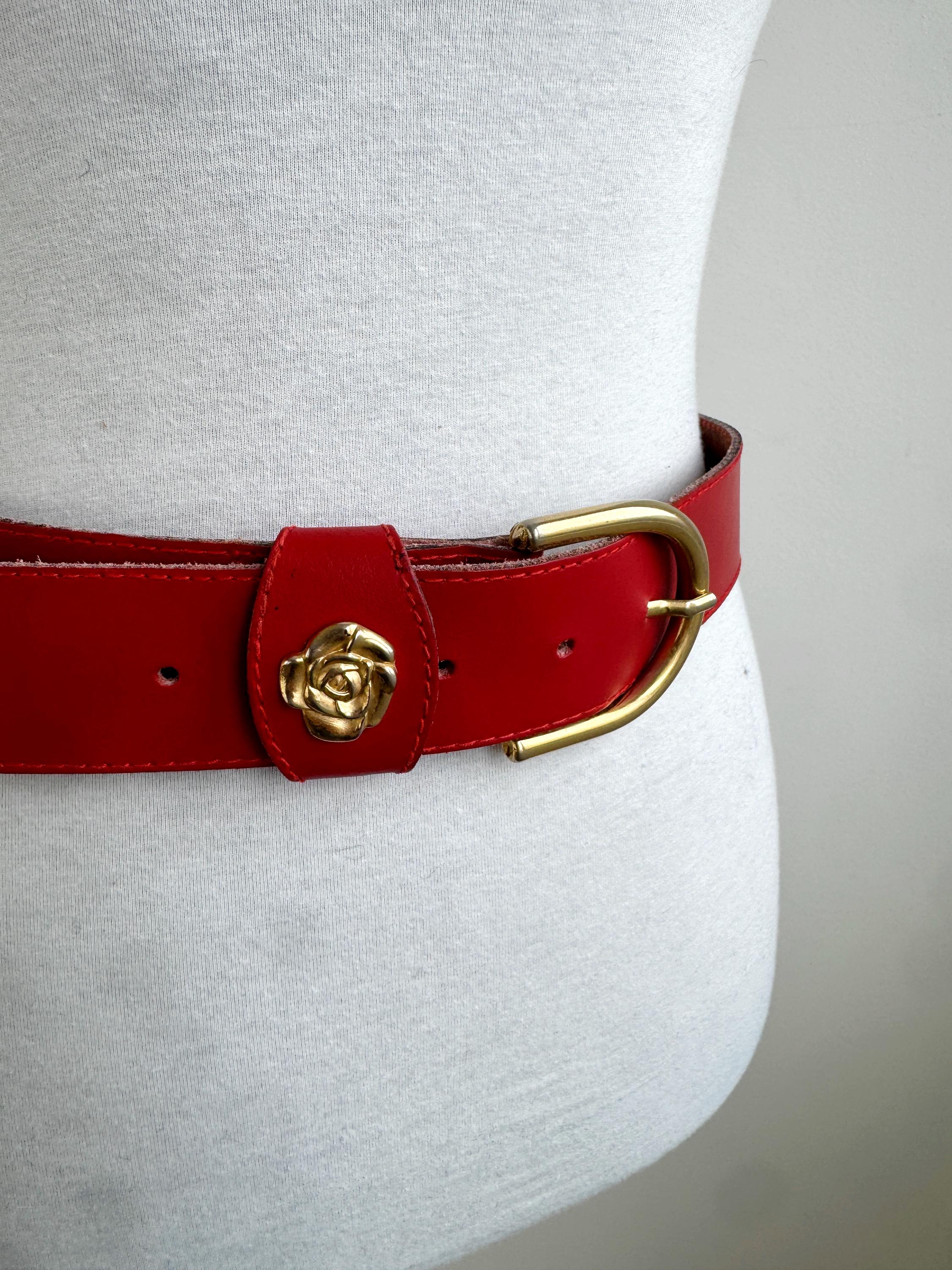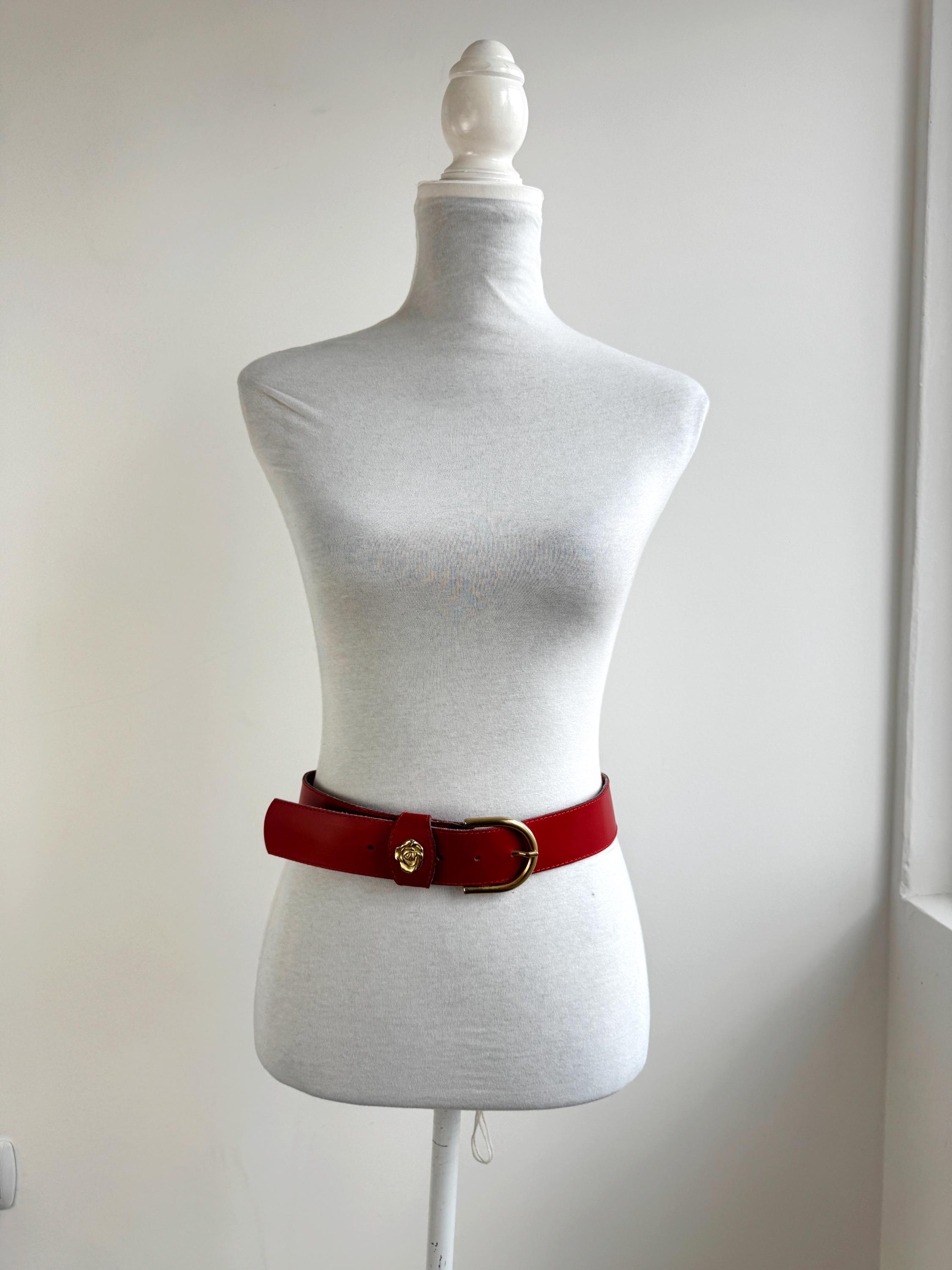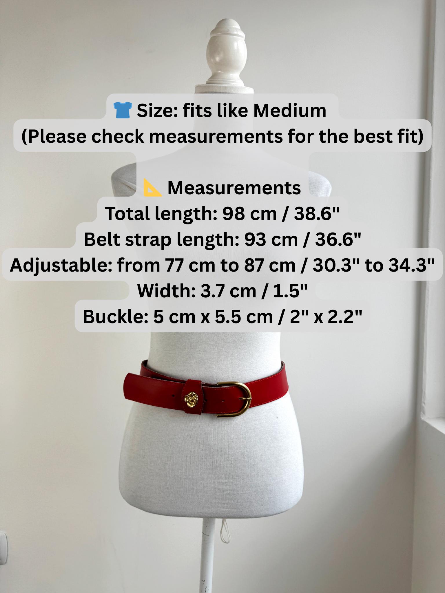Make a bold statement with this vibrant red vintage belt, expertly crafted in Italy. This eye-catching real leather belt features a substantial width that’s perfect for cinching the waist of a blazer, oversized shirt, or your favorite high-waisted denim. The highlight is the gorgeous 3D gold-tone rose embellishment on the keeper, adding a touch of romantic, feminine flair to the smooth genuine leather.
