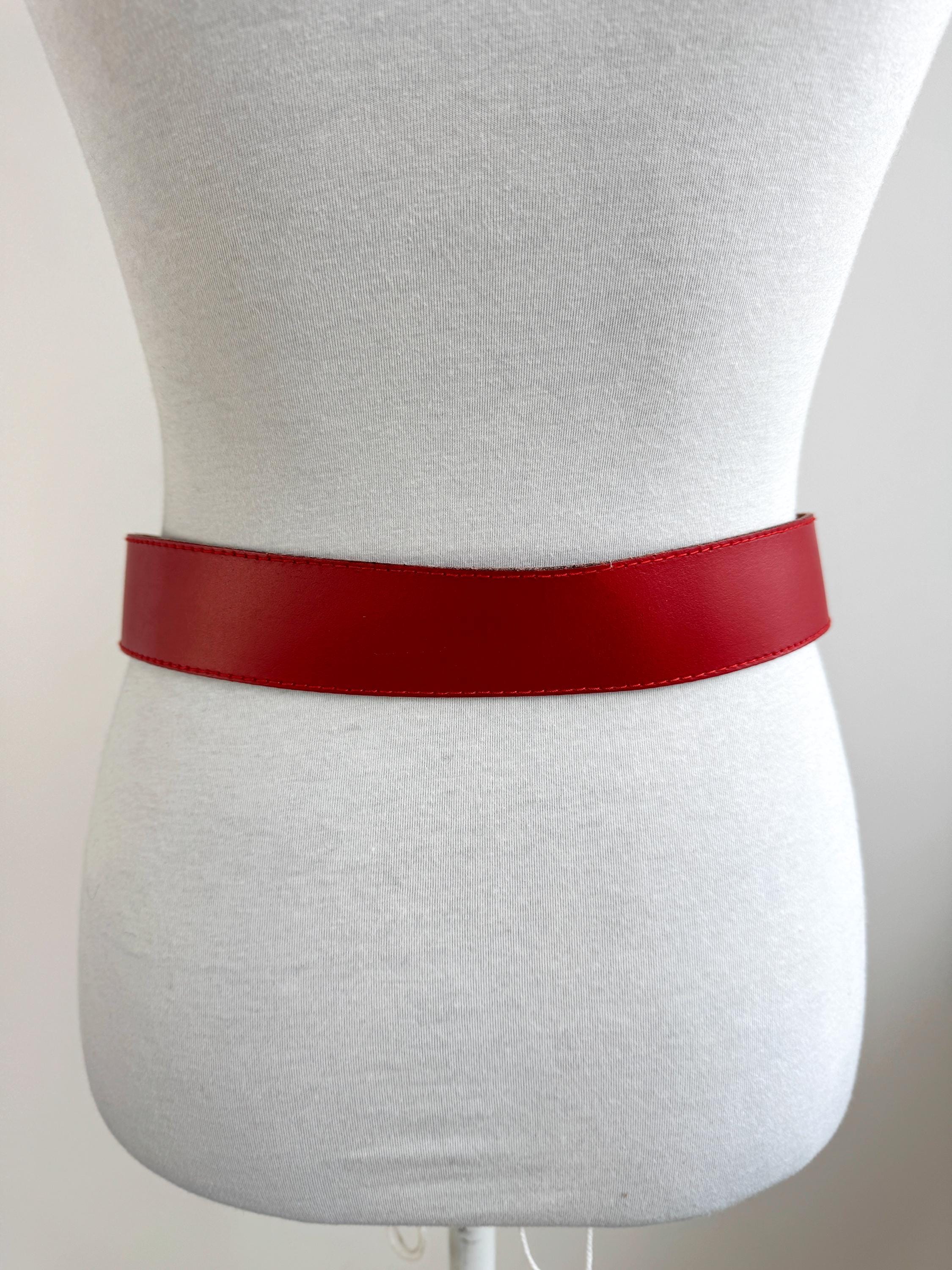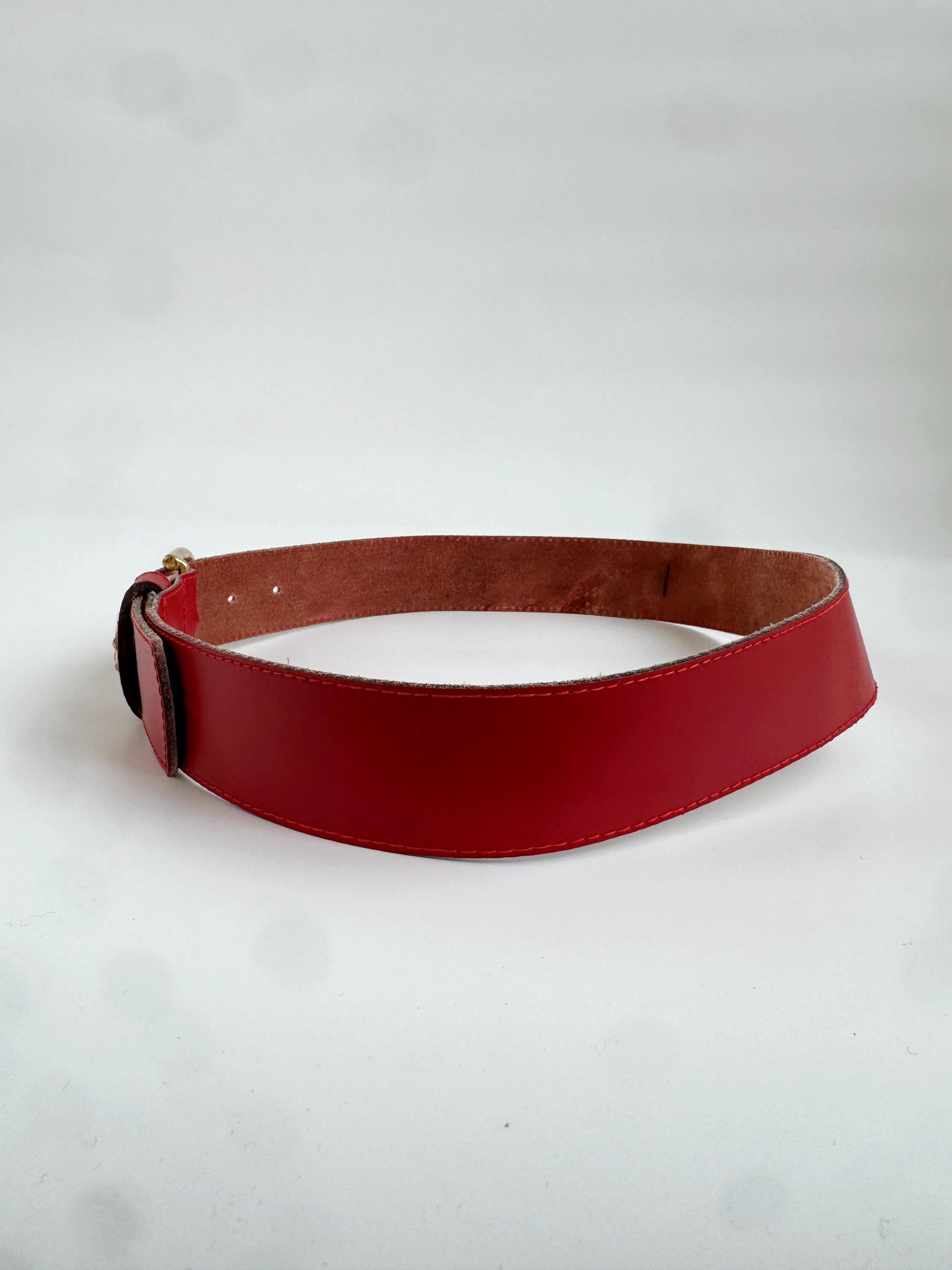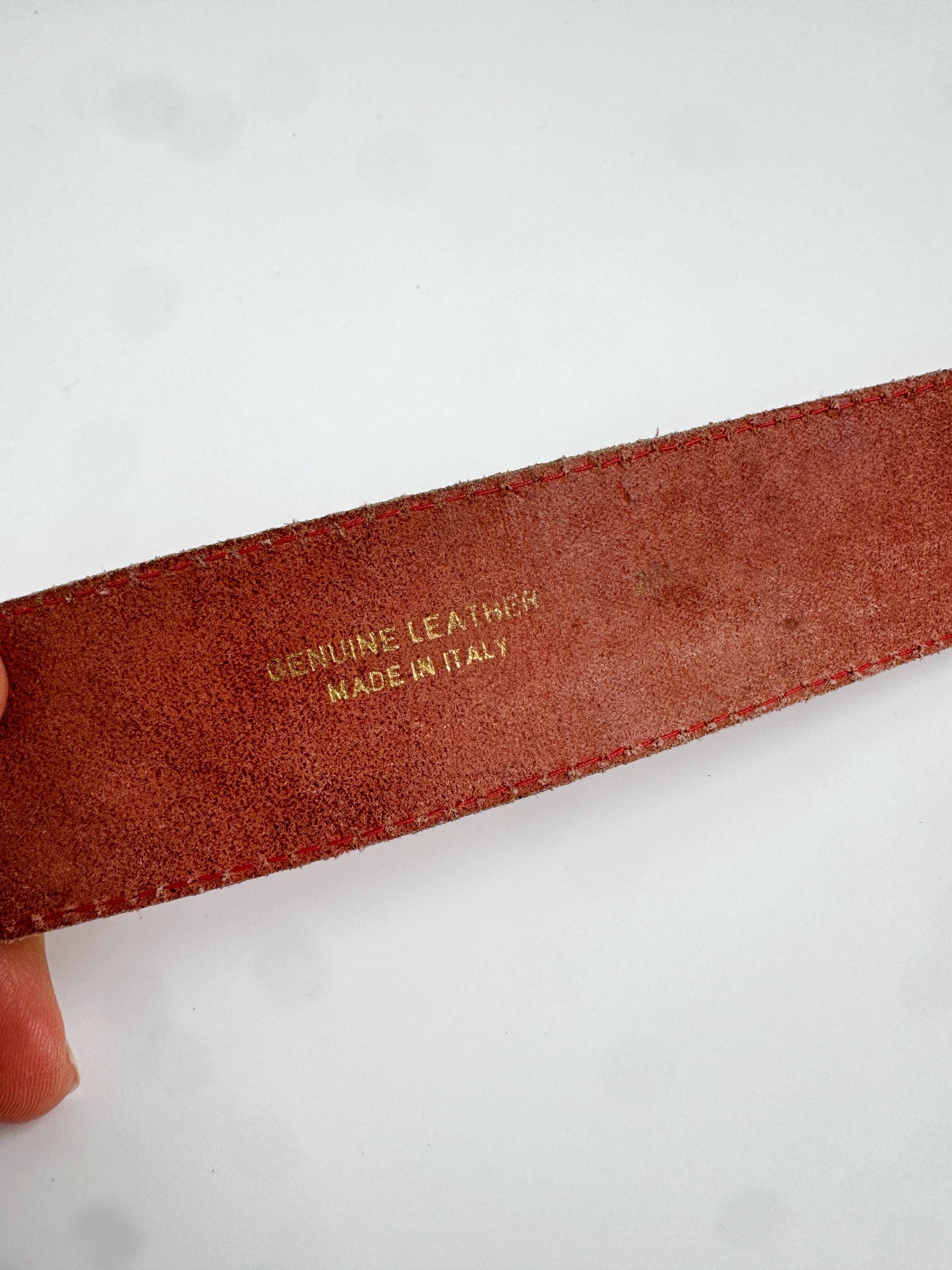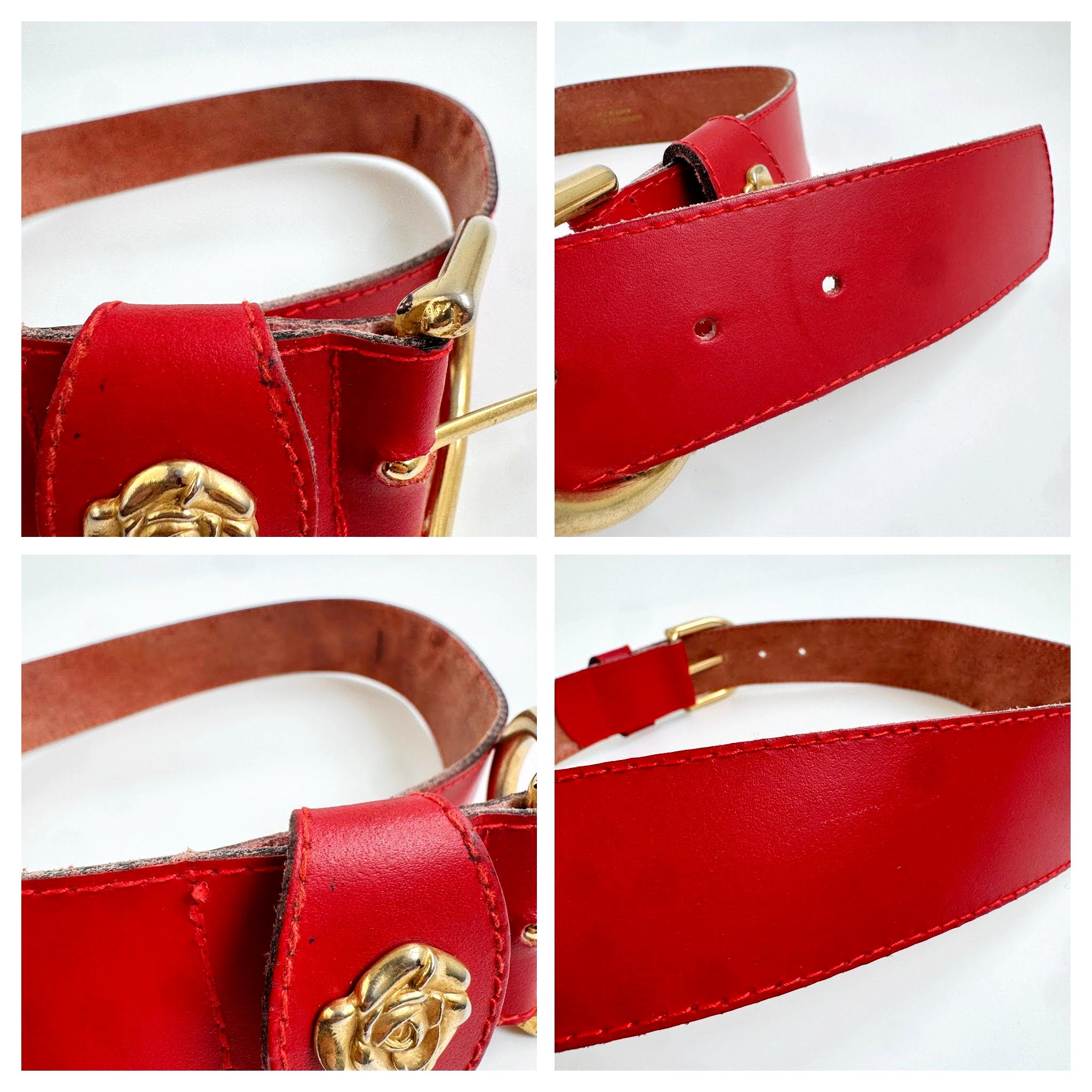 Make a bold statement with this vibrant red vintage belt, expertly crafted in Italy. This eye-catching real leather belt features a substantial width that’s perfect for cinching the waist of a blazer, oversized shirt, or your favorite high-waisted denim. The highlight is the gorgeous 3D gold-tone rose embellishment on the keeper, adding a touch of romantic, feminine flair to the smooth genuine leather.