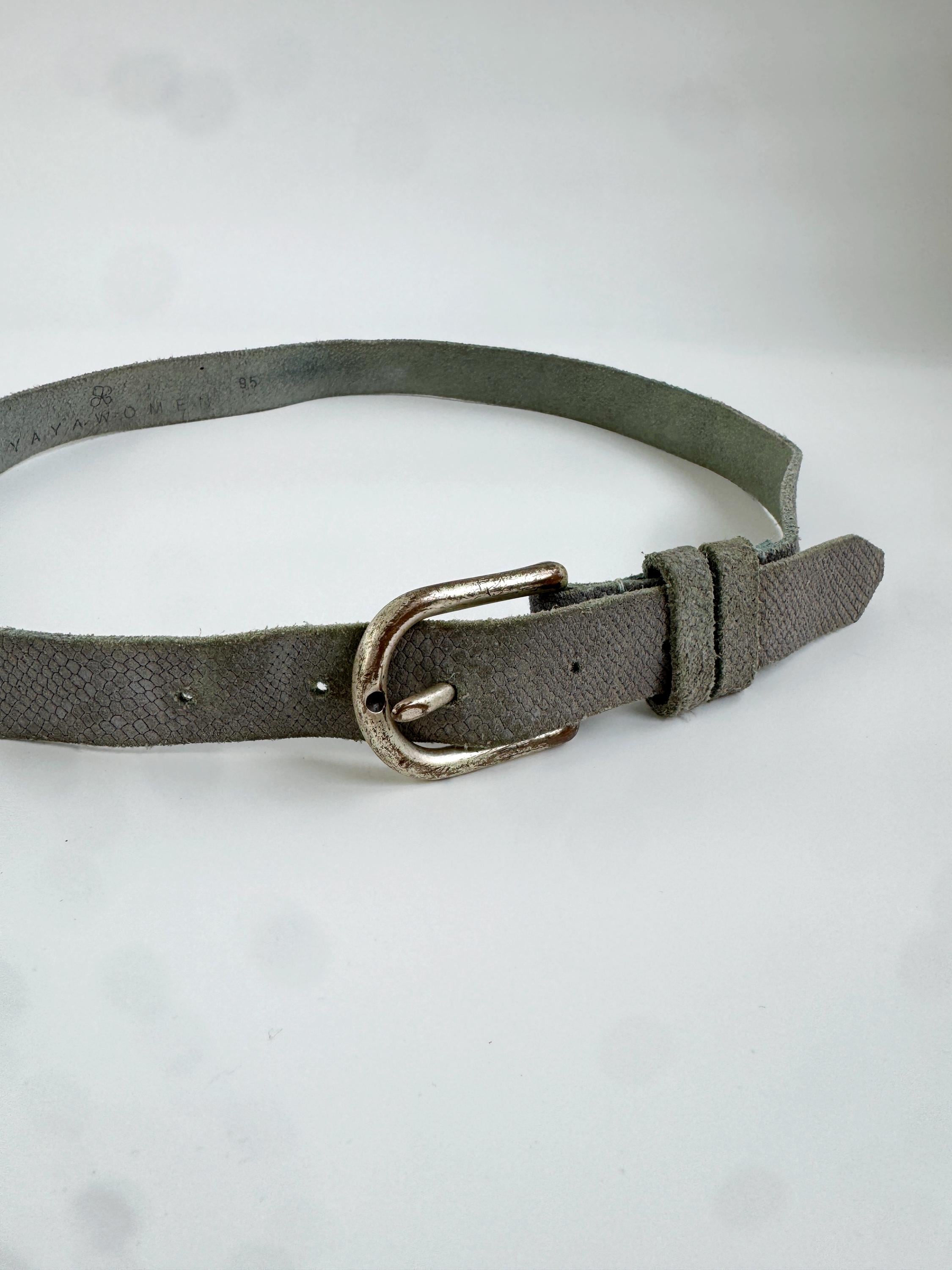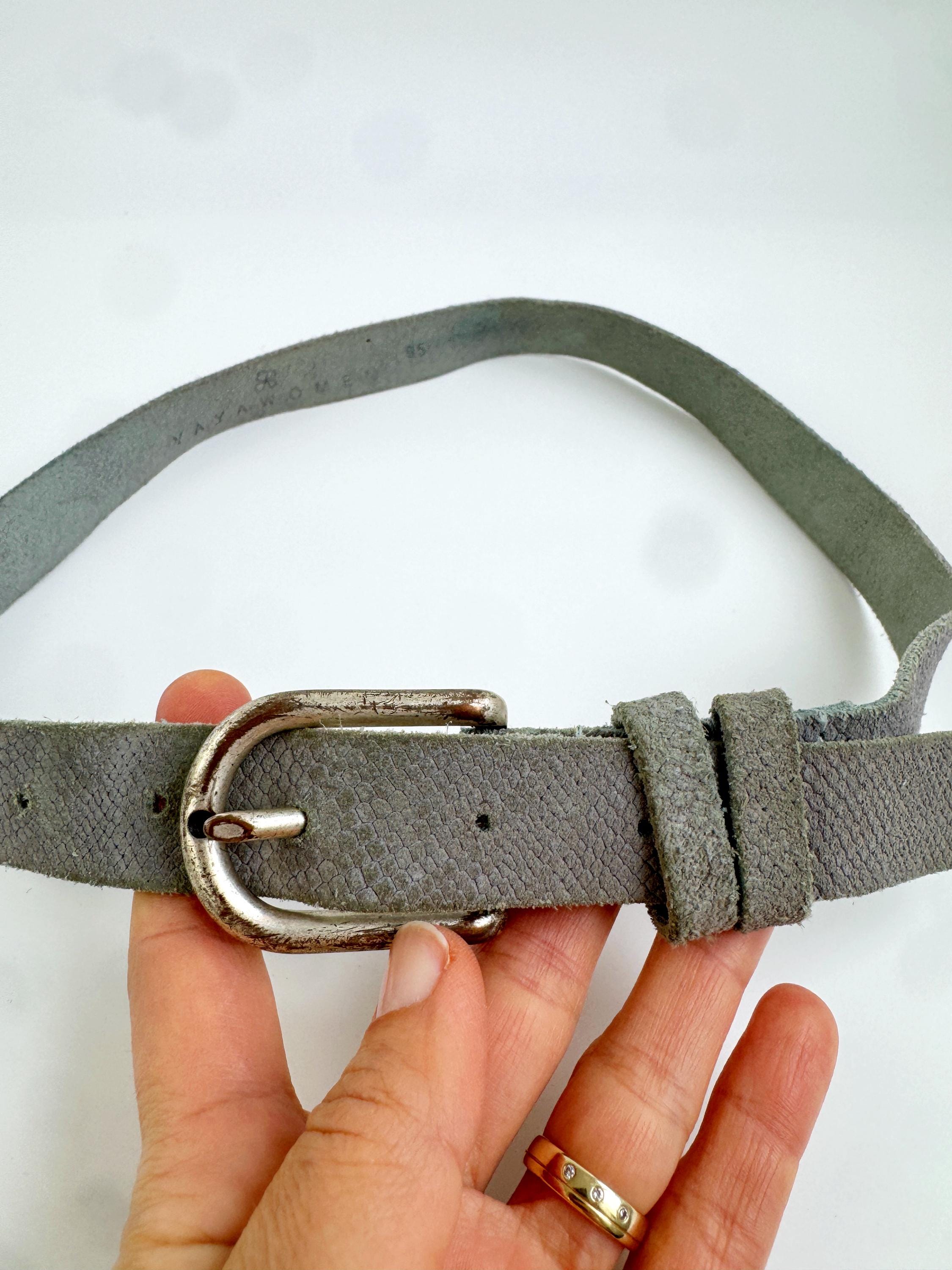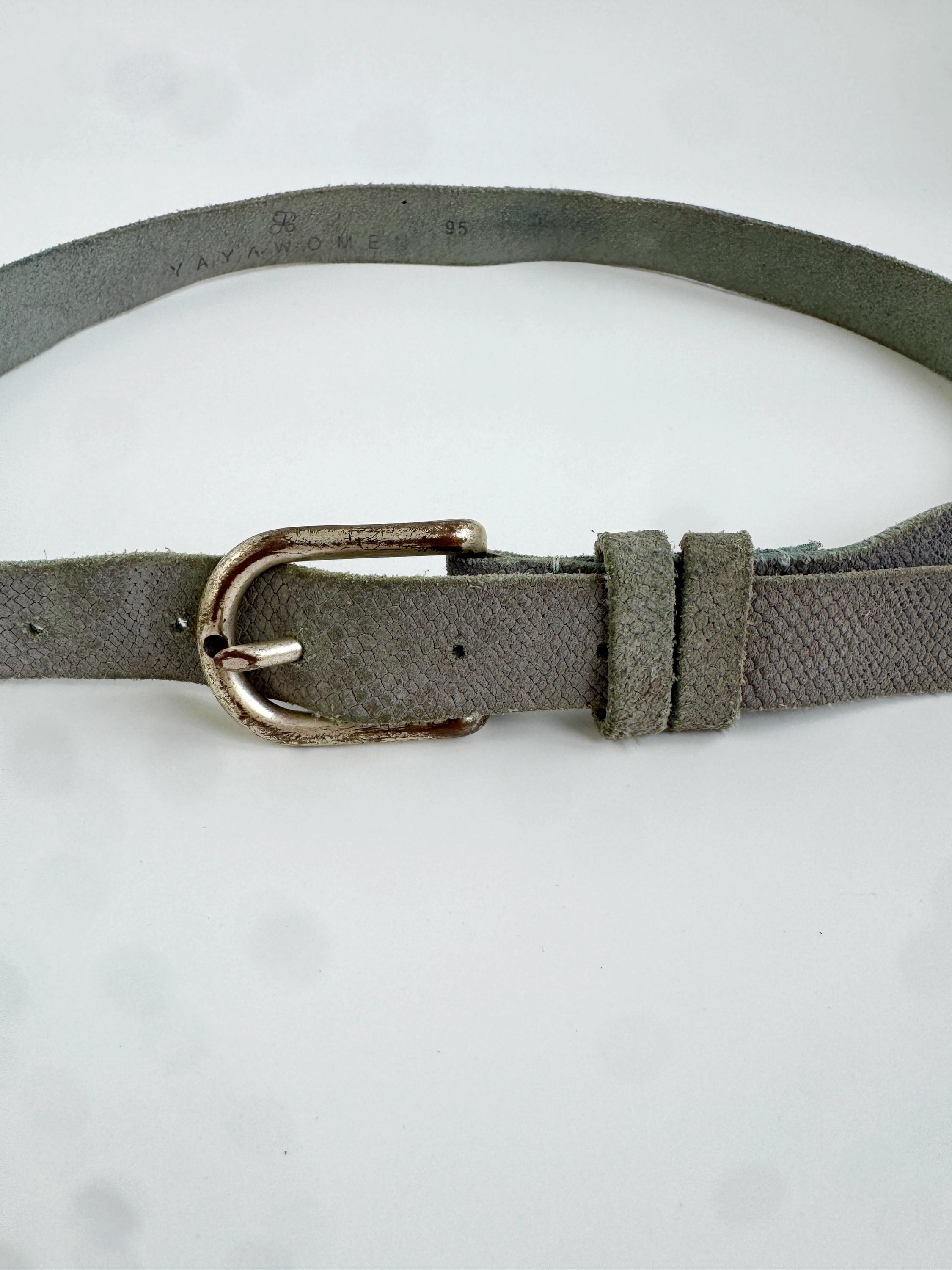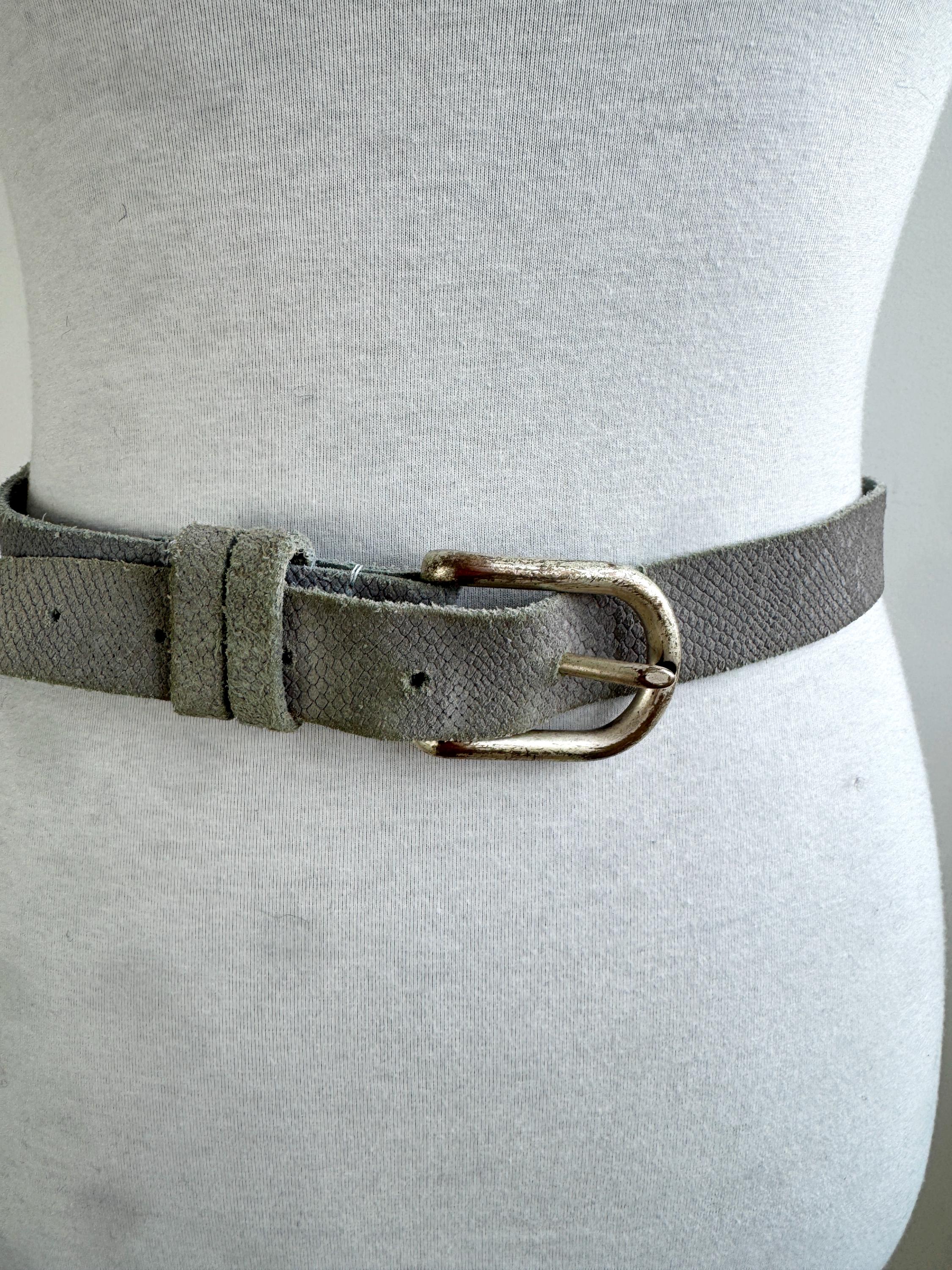 This is a vintage Y2K YAYA Women grey suede leather belt. Featuring a subtle yet sophisticated reptile-embossed texture, this leather accessory perfectly captures the minimalist aesthetic of the late 90s to early 2000s. The soft, muted grey tone and slim profile make it an incredibly versatile piece, whether you are cinching a flowy bohemian dress or adding a refined touch to high-waisted denim.
