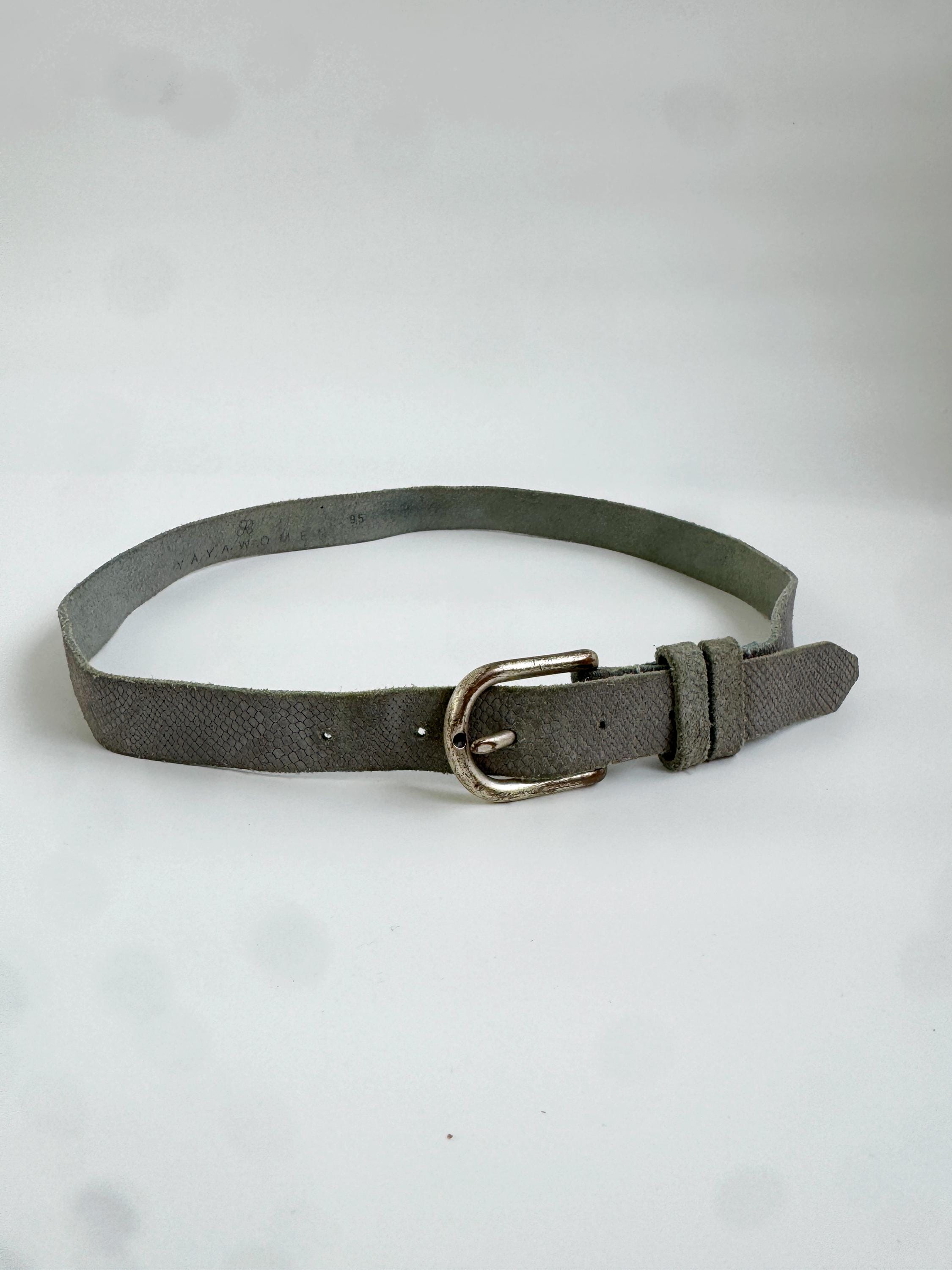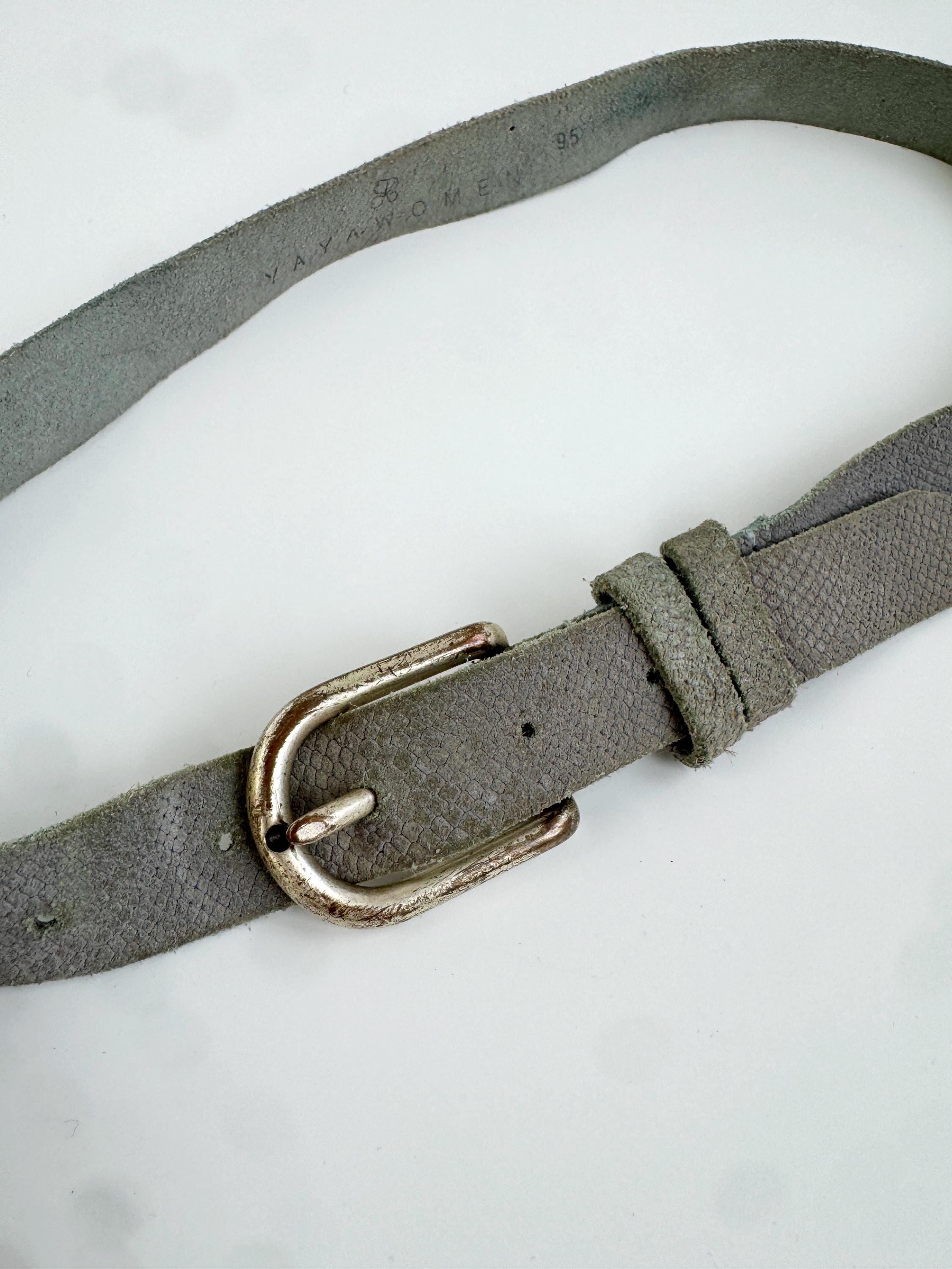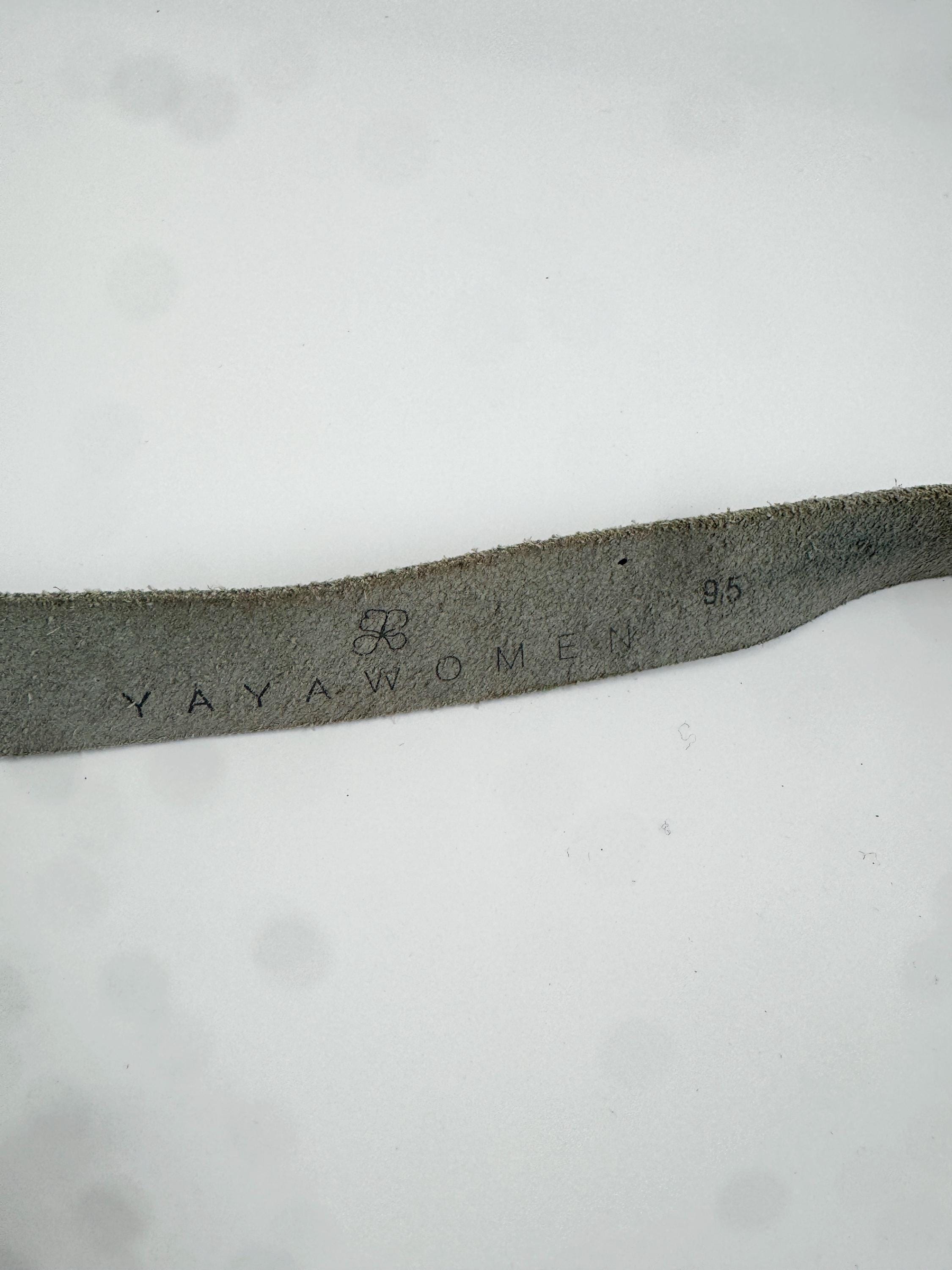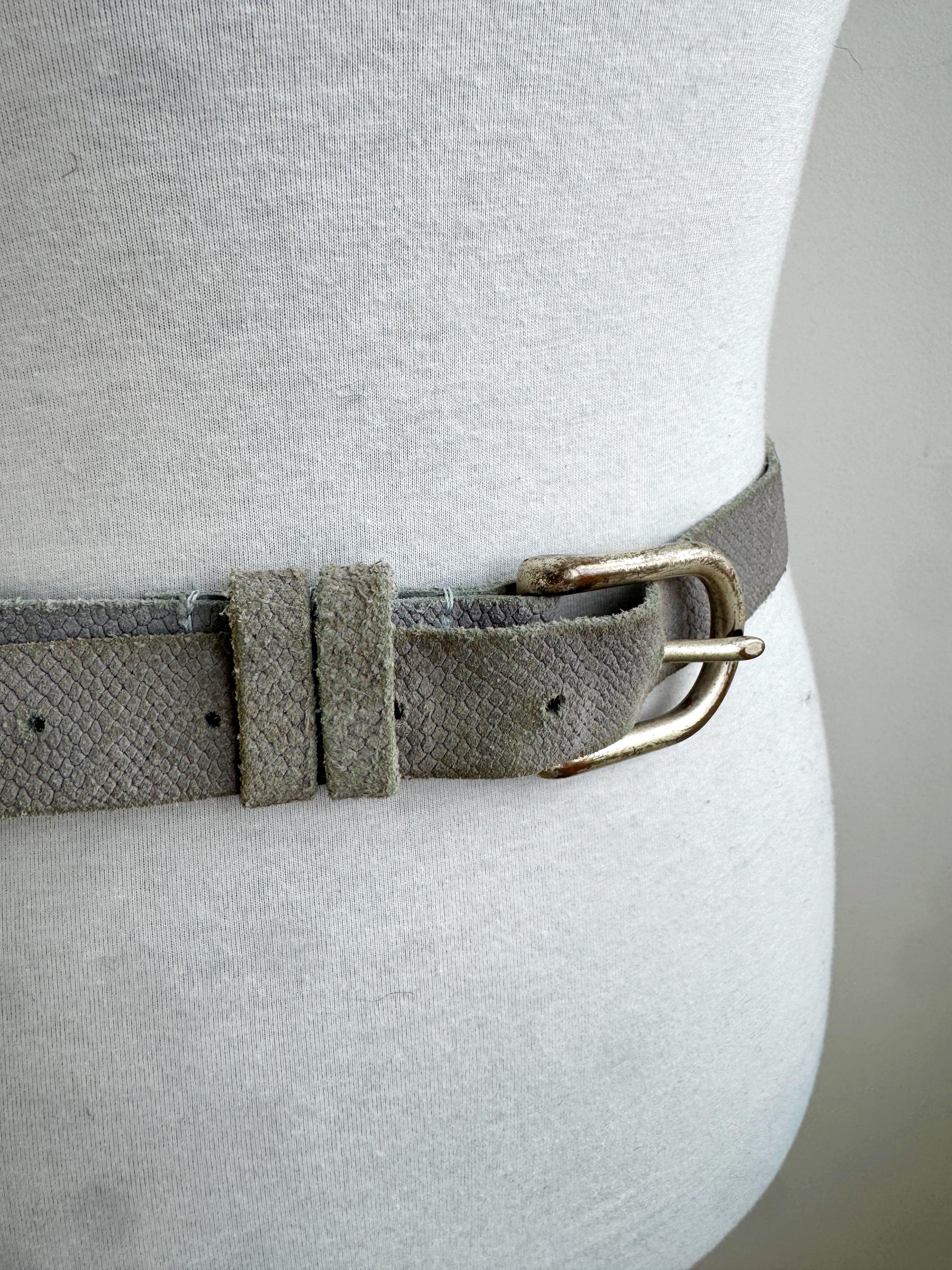 This is a vintage Y2K YAYA Women grey suede leather belt. Featuring a subtle yet sophisticated reptile-embossed texture, this leather accessory perfectly captures the minimalist aesthetic of the late 90s to early 2000s. The soft, muted grey tone and slim profile make it an incredibly versatile piece, whether you are cinching a flowy bohemian dress or adding a refined touch to high-waisted denim.