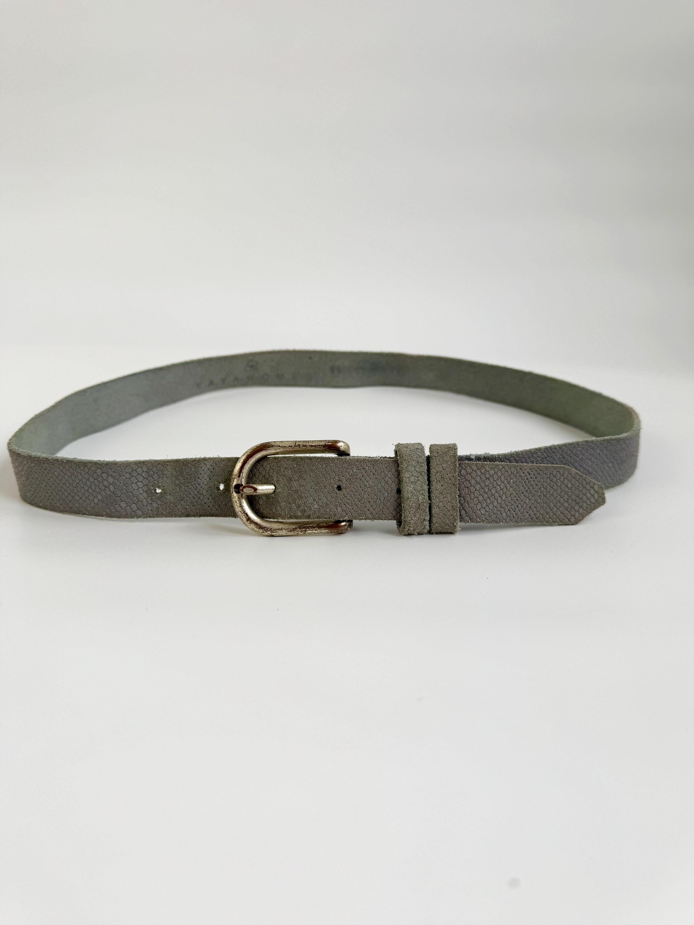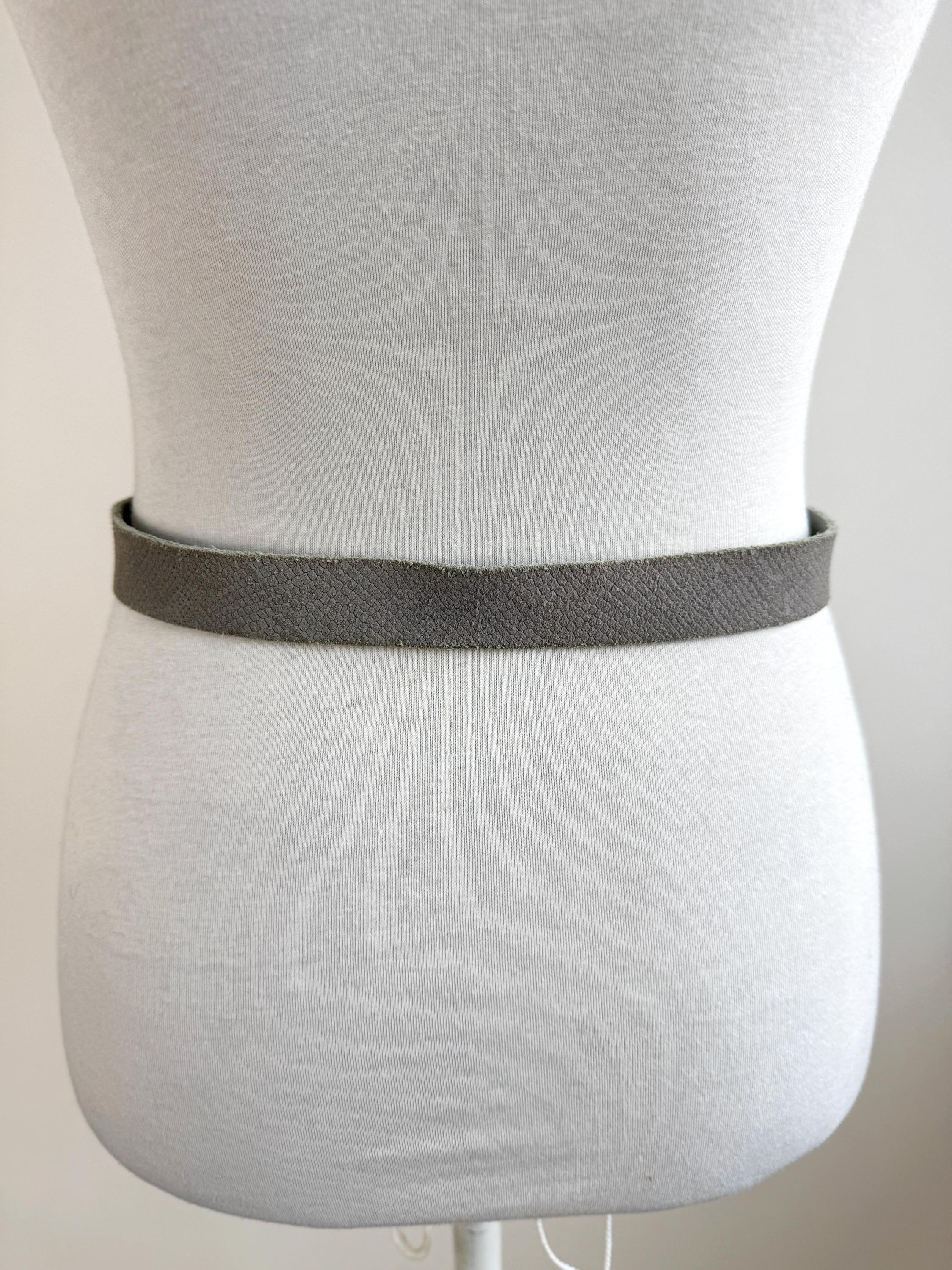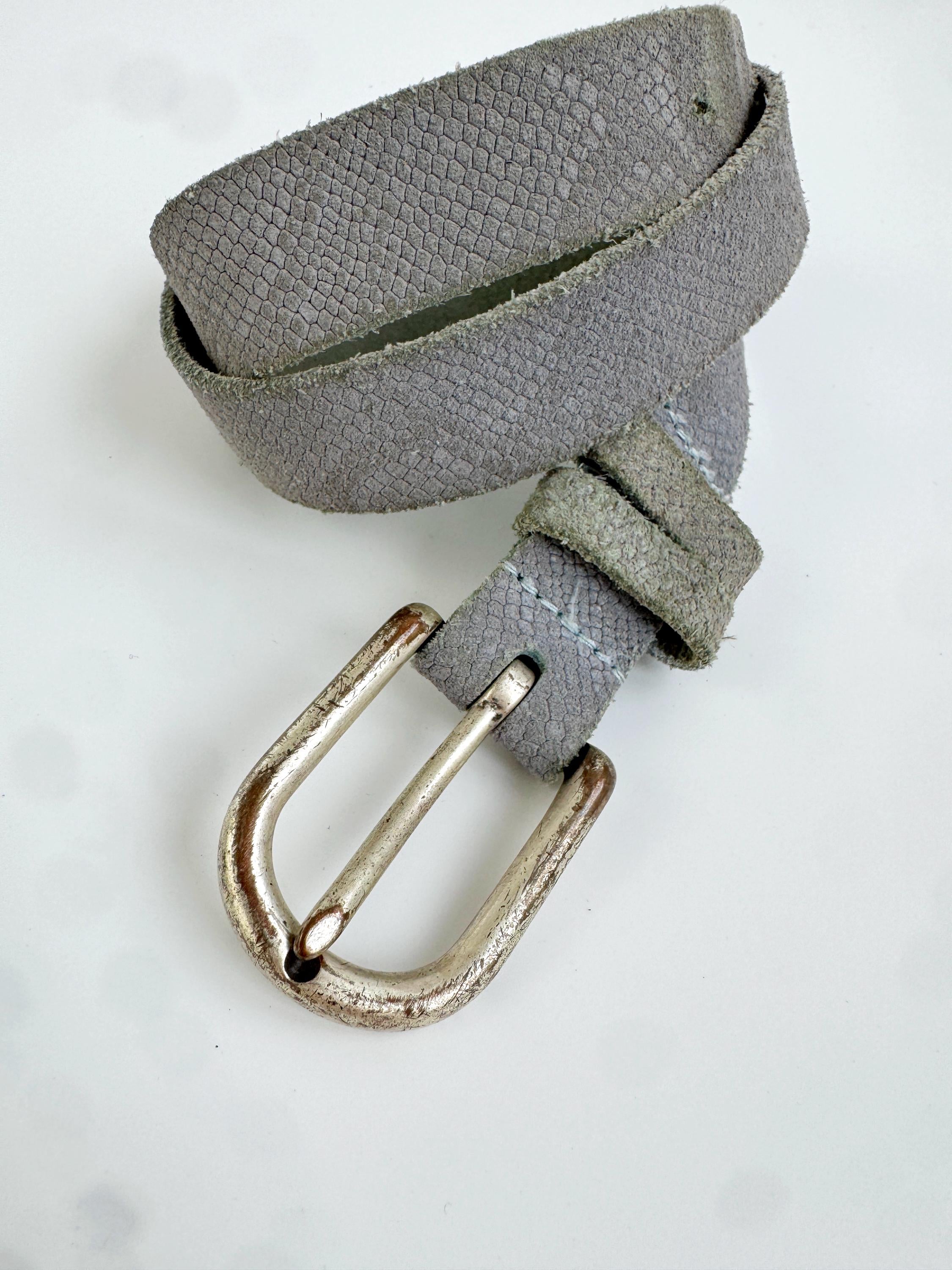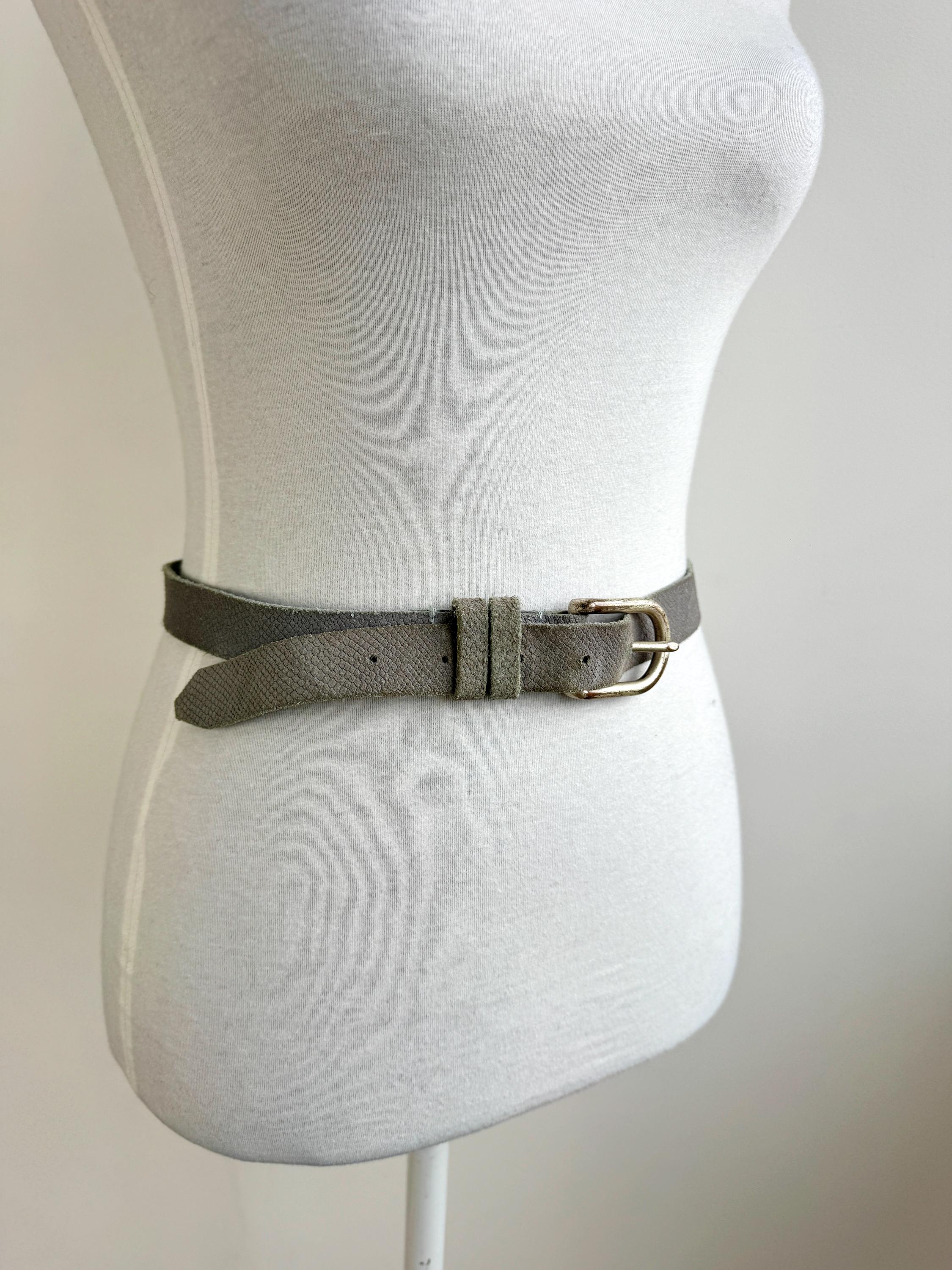 This is a vintage Y2K YAYA Women grey suede leather belt. Featuring a subtle yet sophisticated reptile-embossed texture, this leather accessory perfectly captures the minimalist aesthetic of the late 90s to early 2000s. The soft, muted grey tone and slim profile make it an incredibly versatile piece, whether you are cinching a flowy bohemian dress or adding a refined touch to high-waisted denim.
