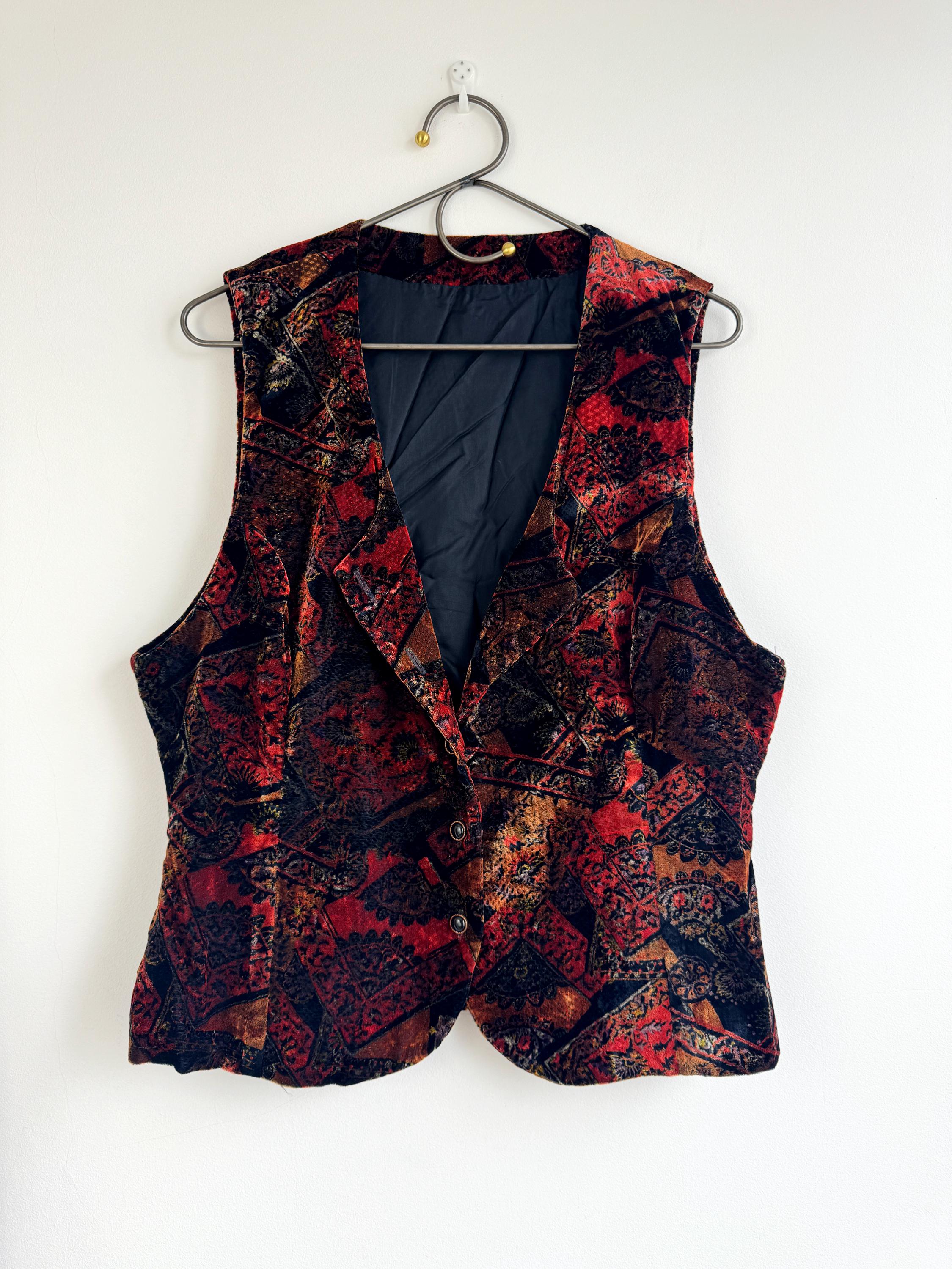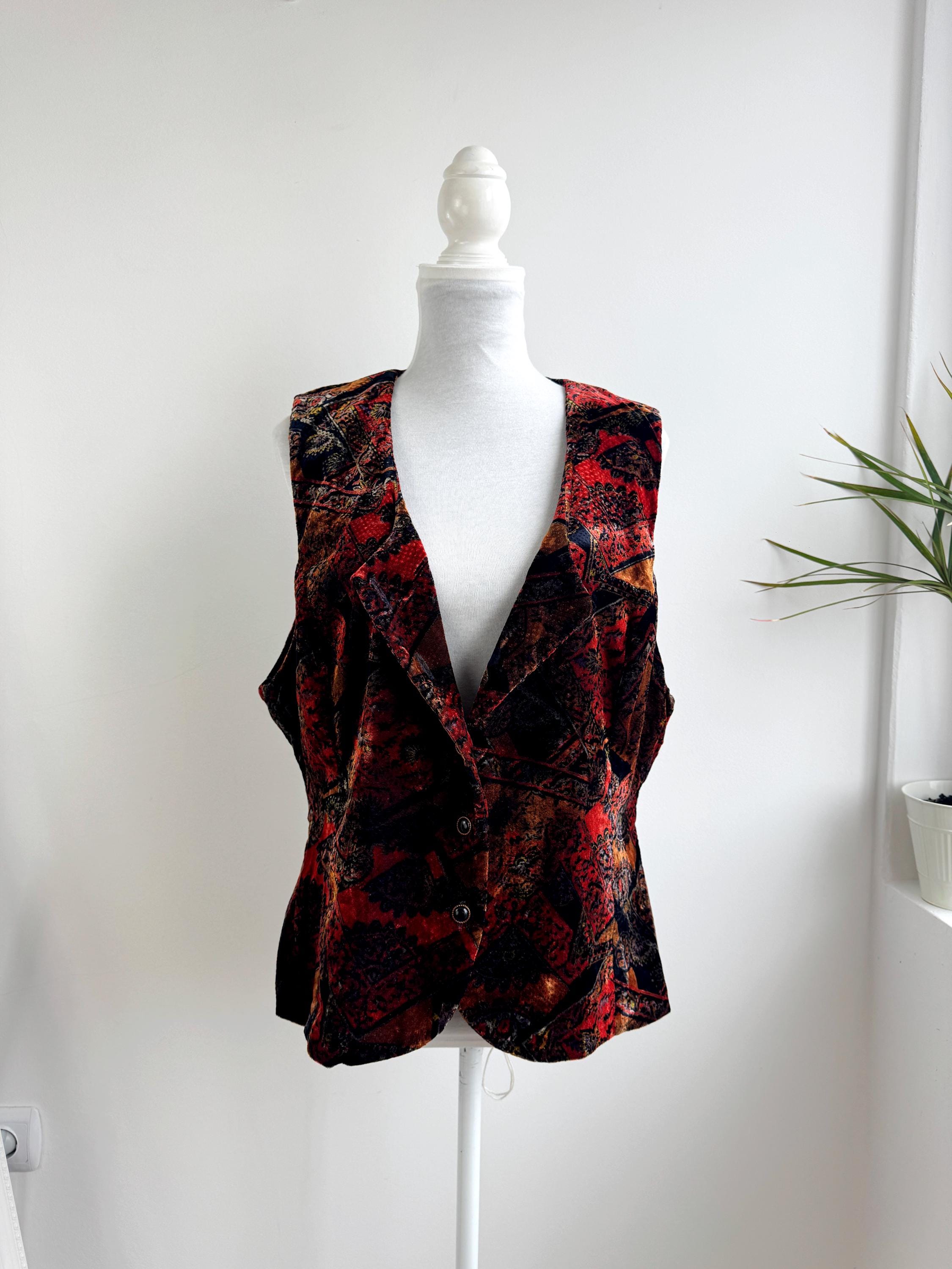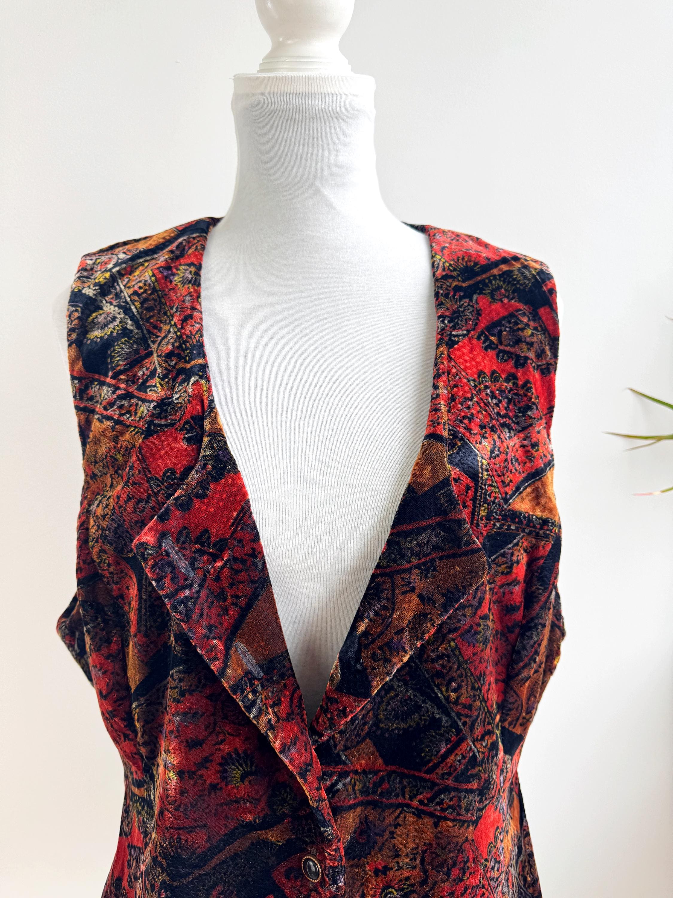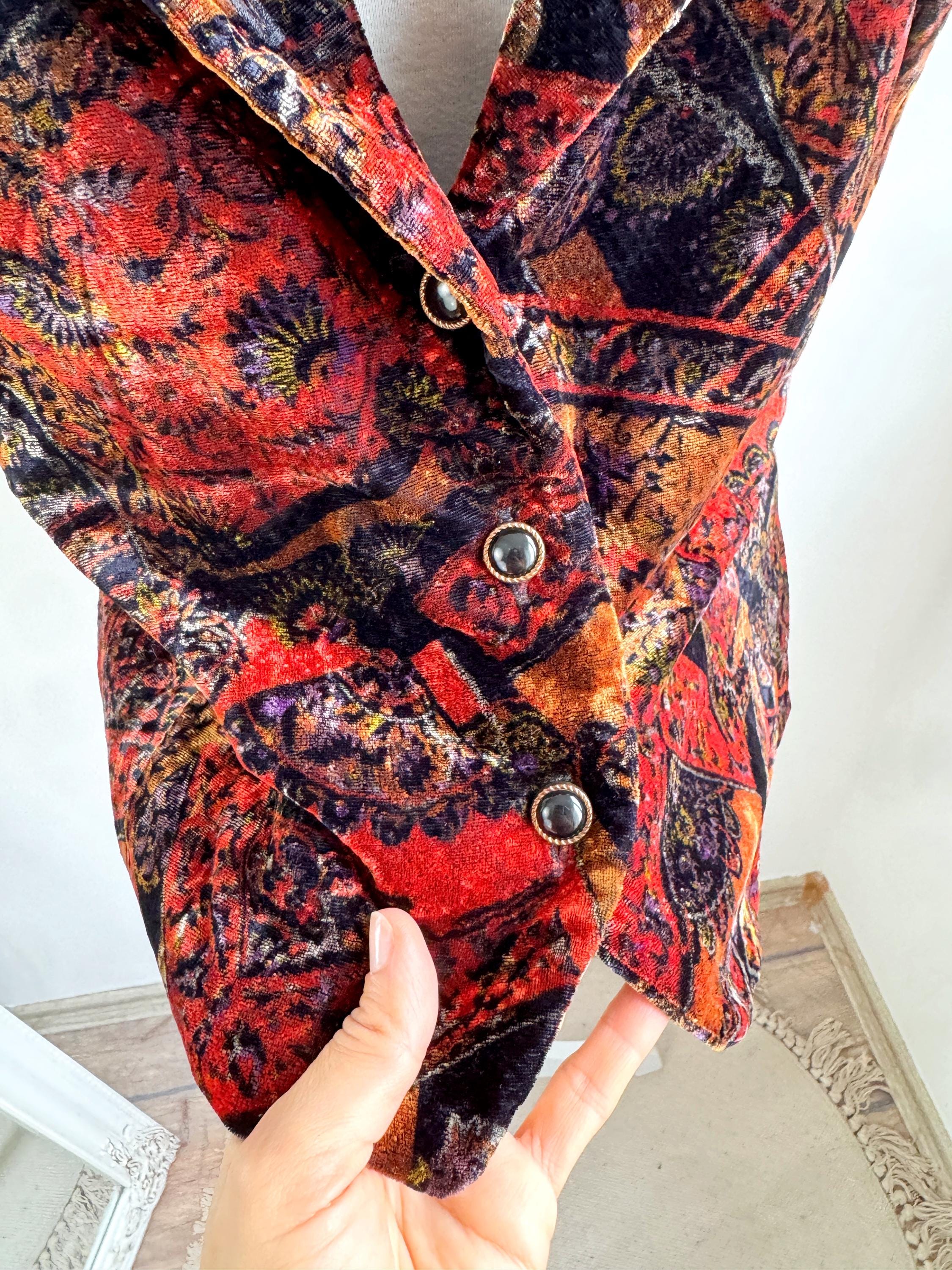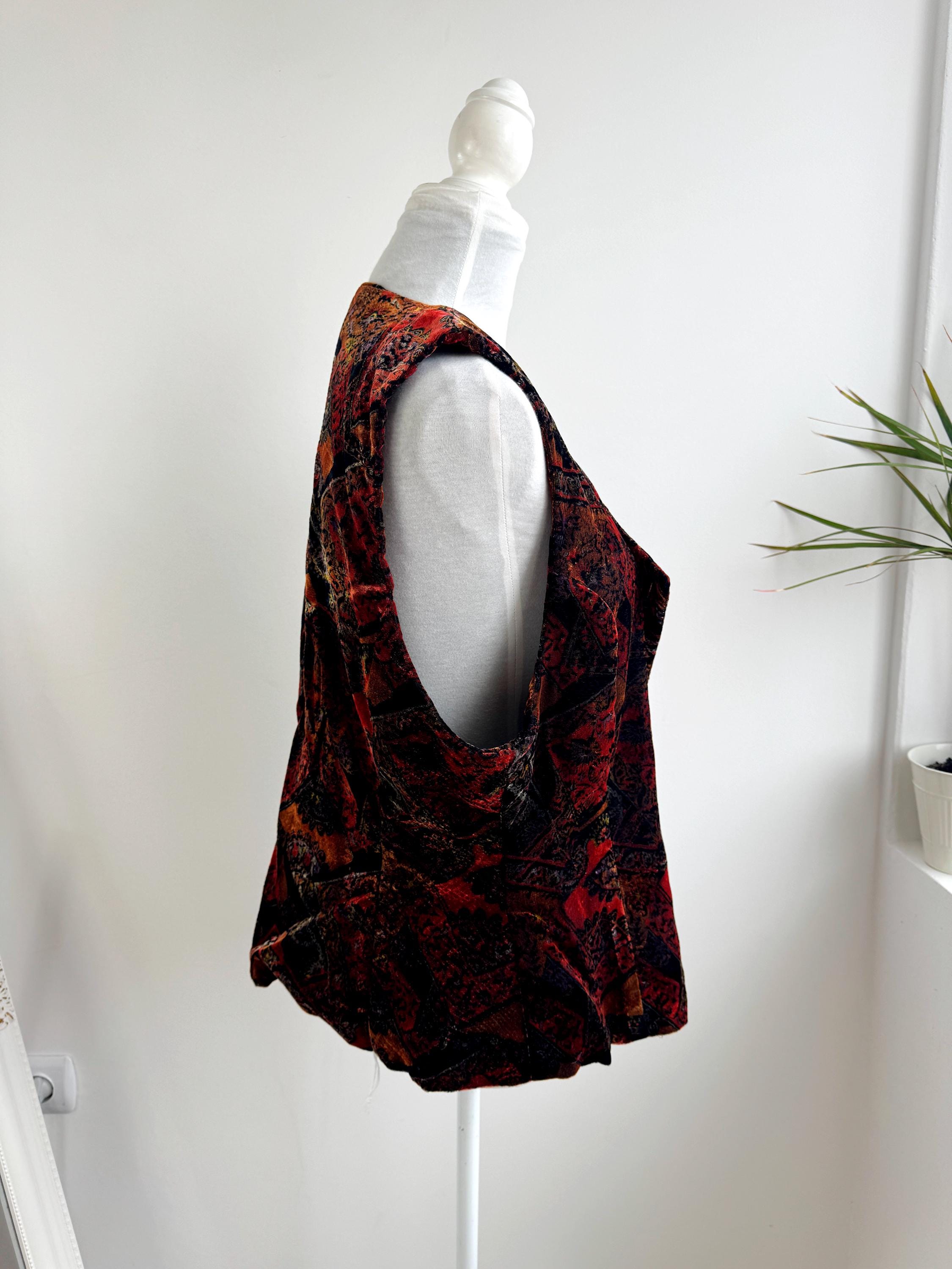 This is a beautiful vintage 80s velvet waistcoat for women with button front closure and elegant fitted silhouette with lapels. There are no tags or labels - the velvet fabric is in great shape. It represents gorgeous paisley geometric pattern in earthy tones - burgindy red, rust brown, burnt orange. This velvet sleeveless blazer fits like size L. Please check the measurements below.