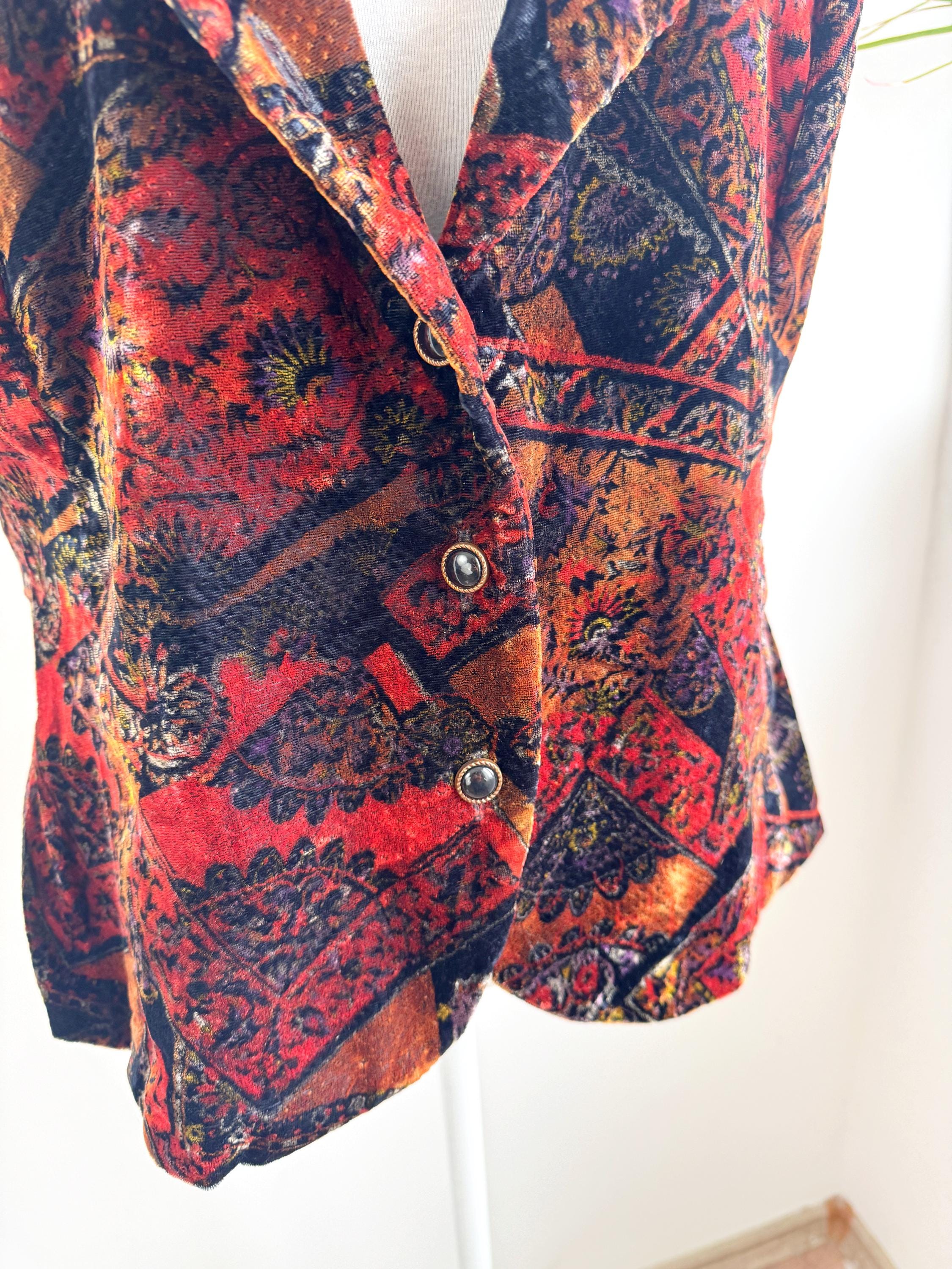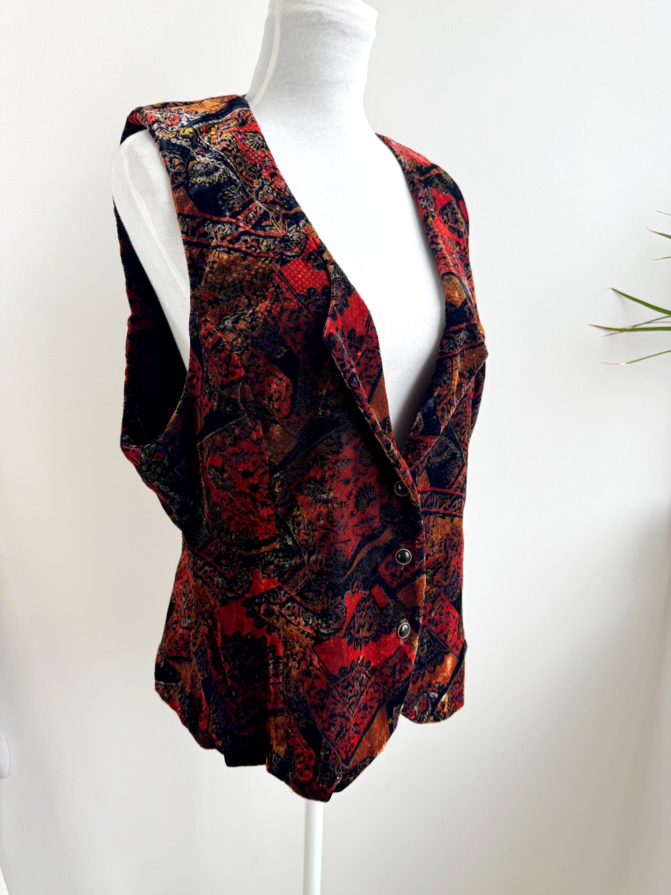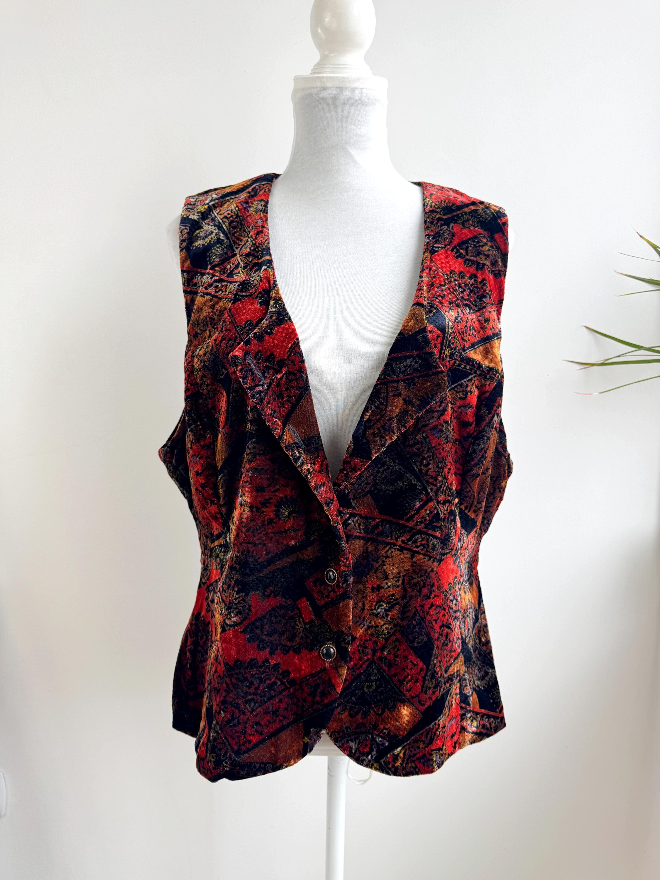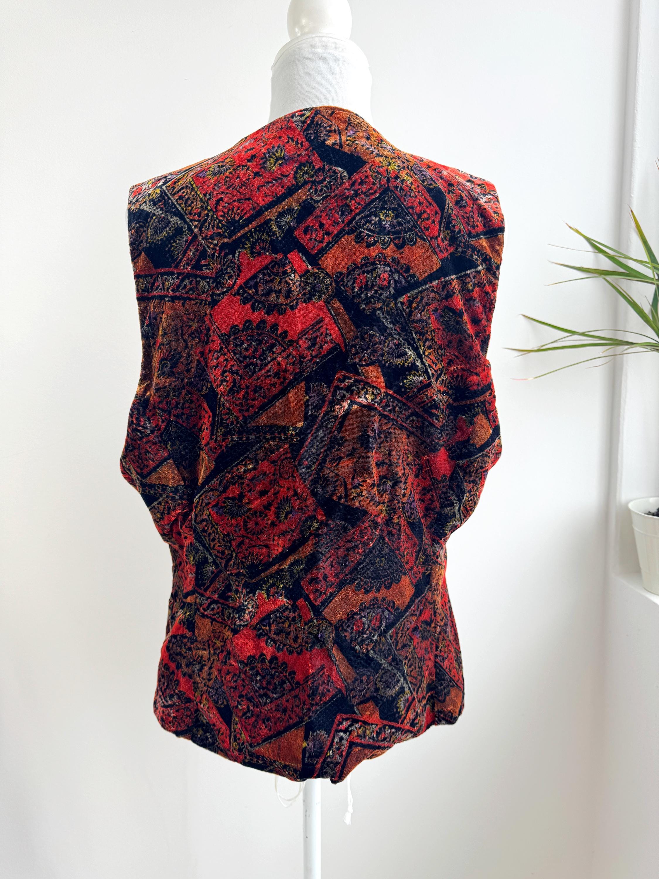 This is a beautiful vintage 80s velvet waistcoat for women with button front closure and elegant fitted silhouette with lapels. There are no tags or labels - the velvet fabric is in great shape. It represents gorgeous paisley geometric pattern in earthy tones - burgindy red, rust brown, burnt orange. This velvet sleeveless blazer fits like size L. Please check the measurements below.