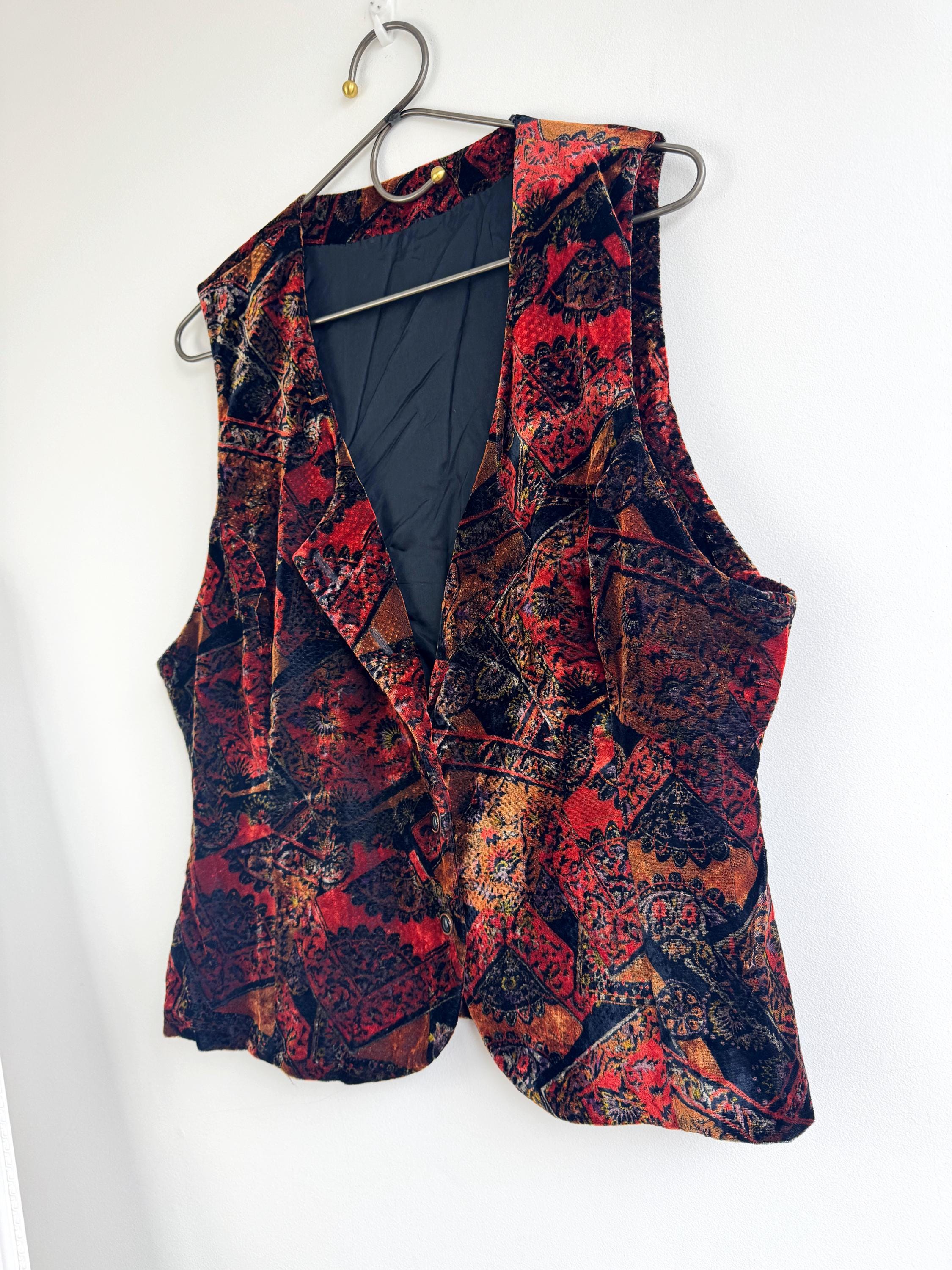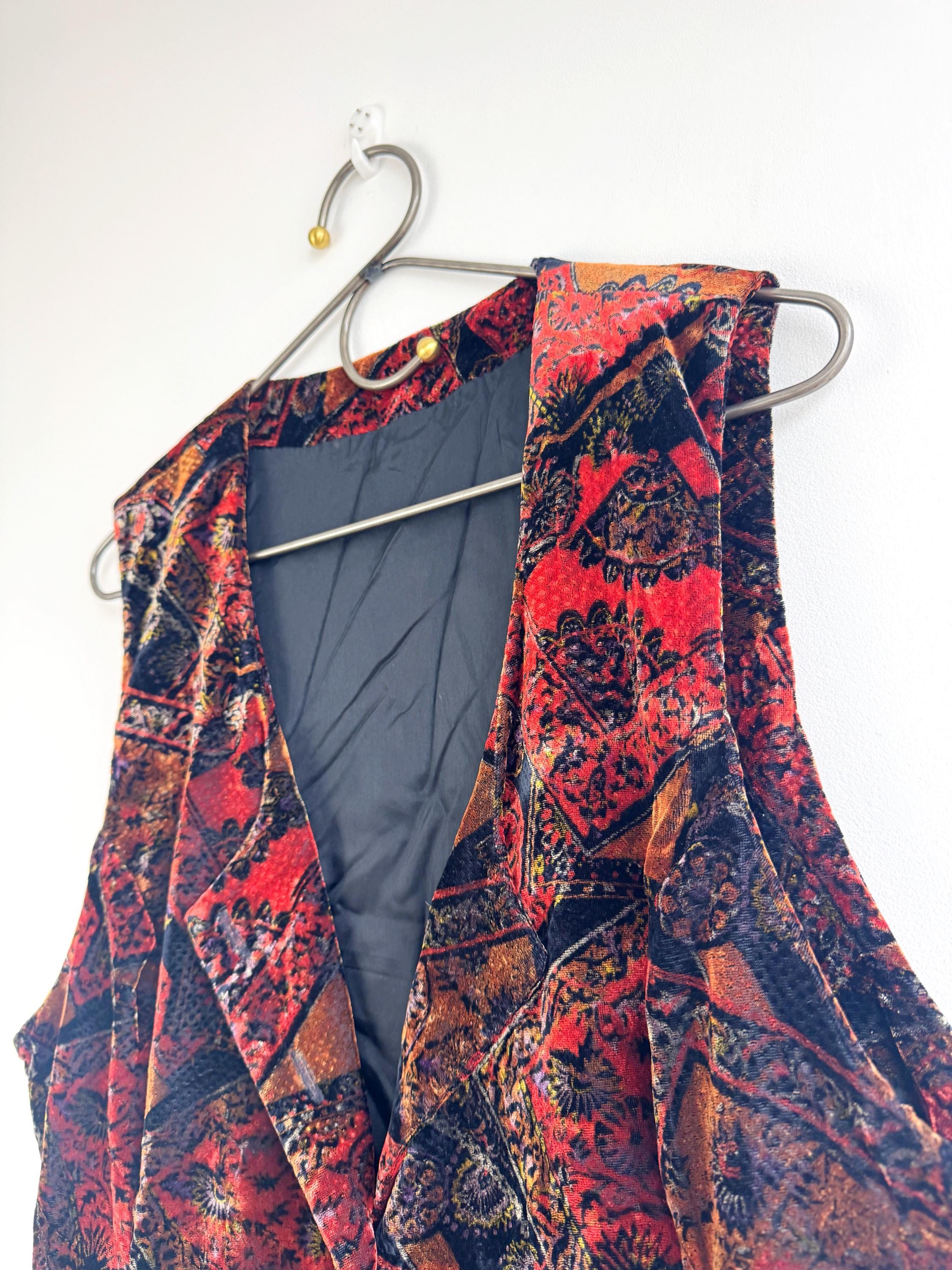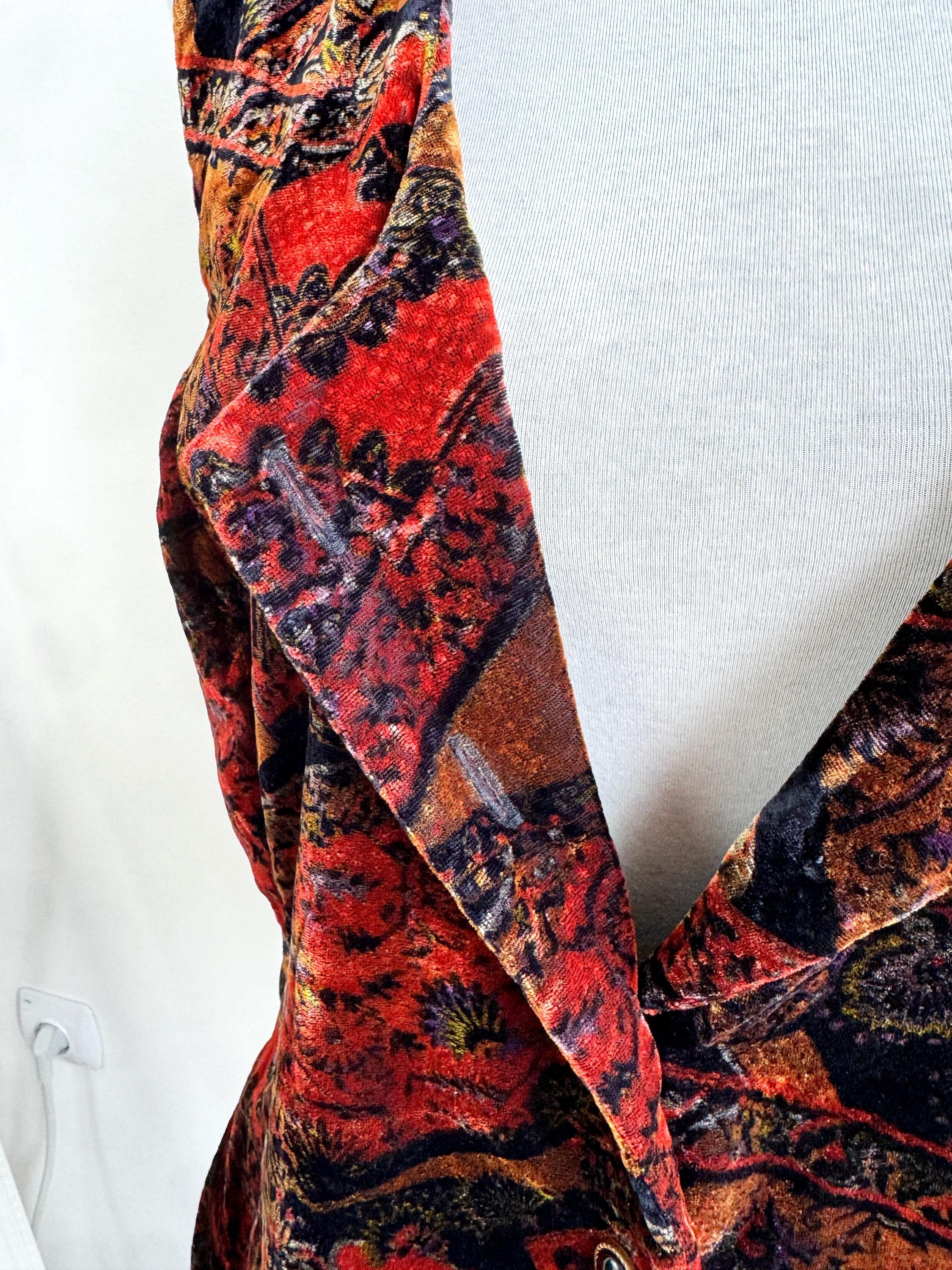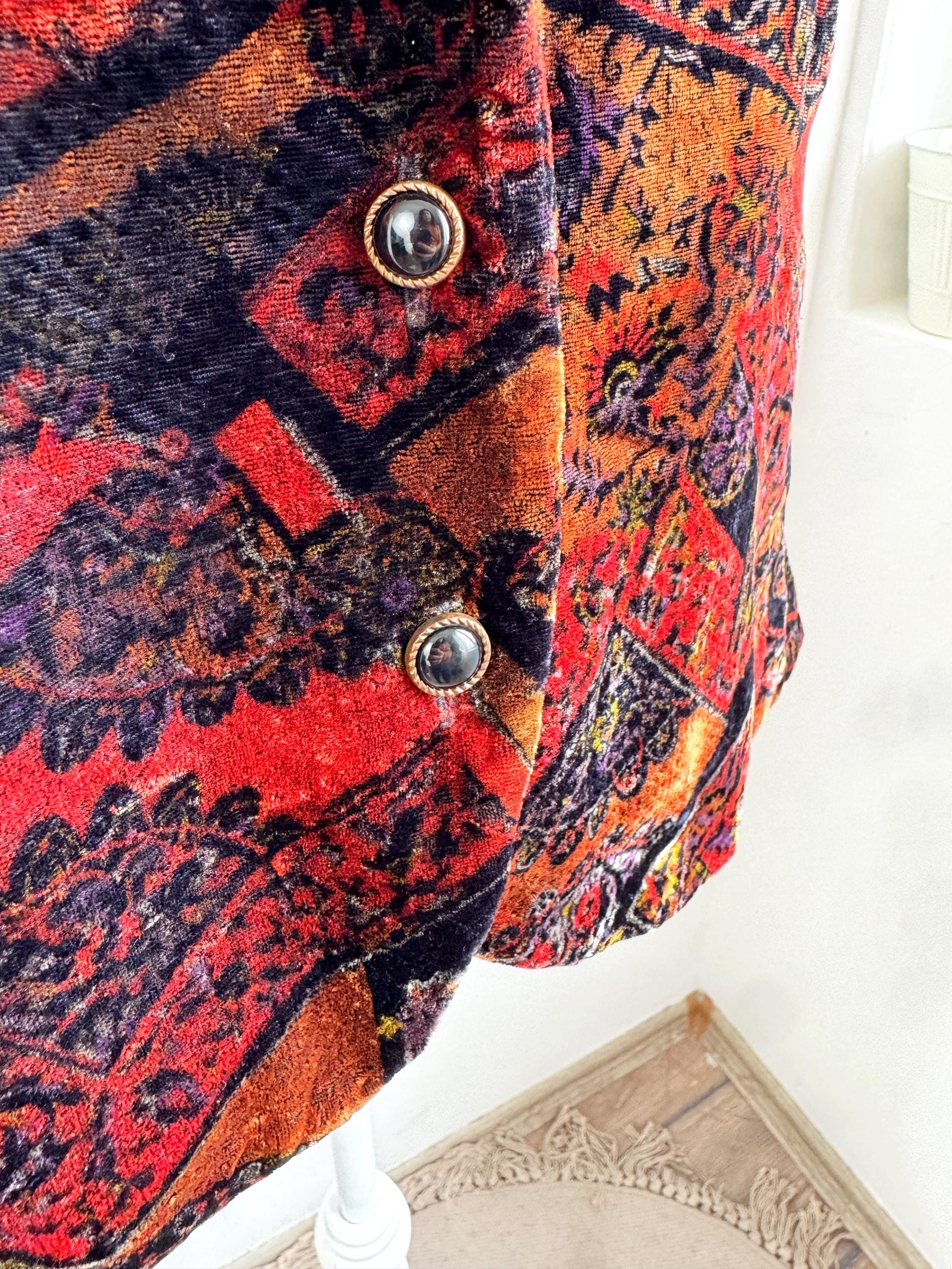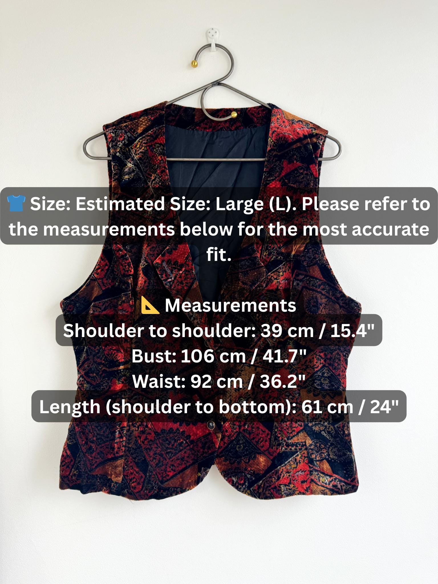 This is a beautiful vintage 80s velvet waistcoat for women with button front closure and elegant fitted silhouette with lapels. There are no tags or labels - the velvet fabric is in great shape. It represents gorgeous paisley geometric pattern in earthy tones - burgindy red, rust brown, burnt orange. This velvet sleeveless blazer fits like size L. Please check the measurements below.