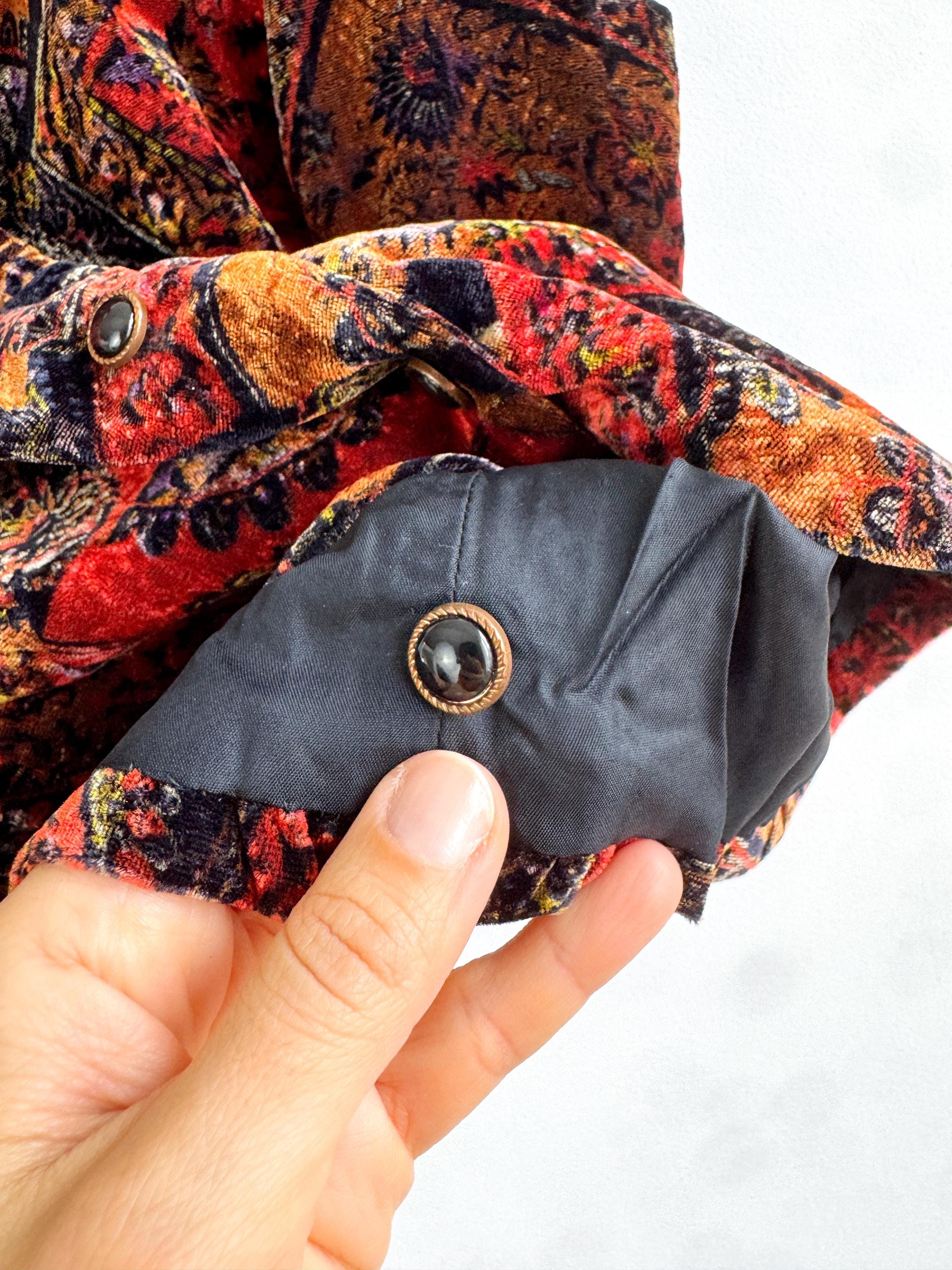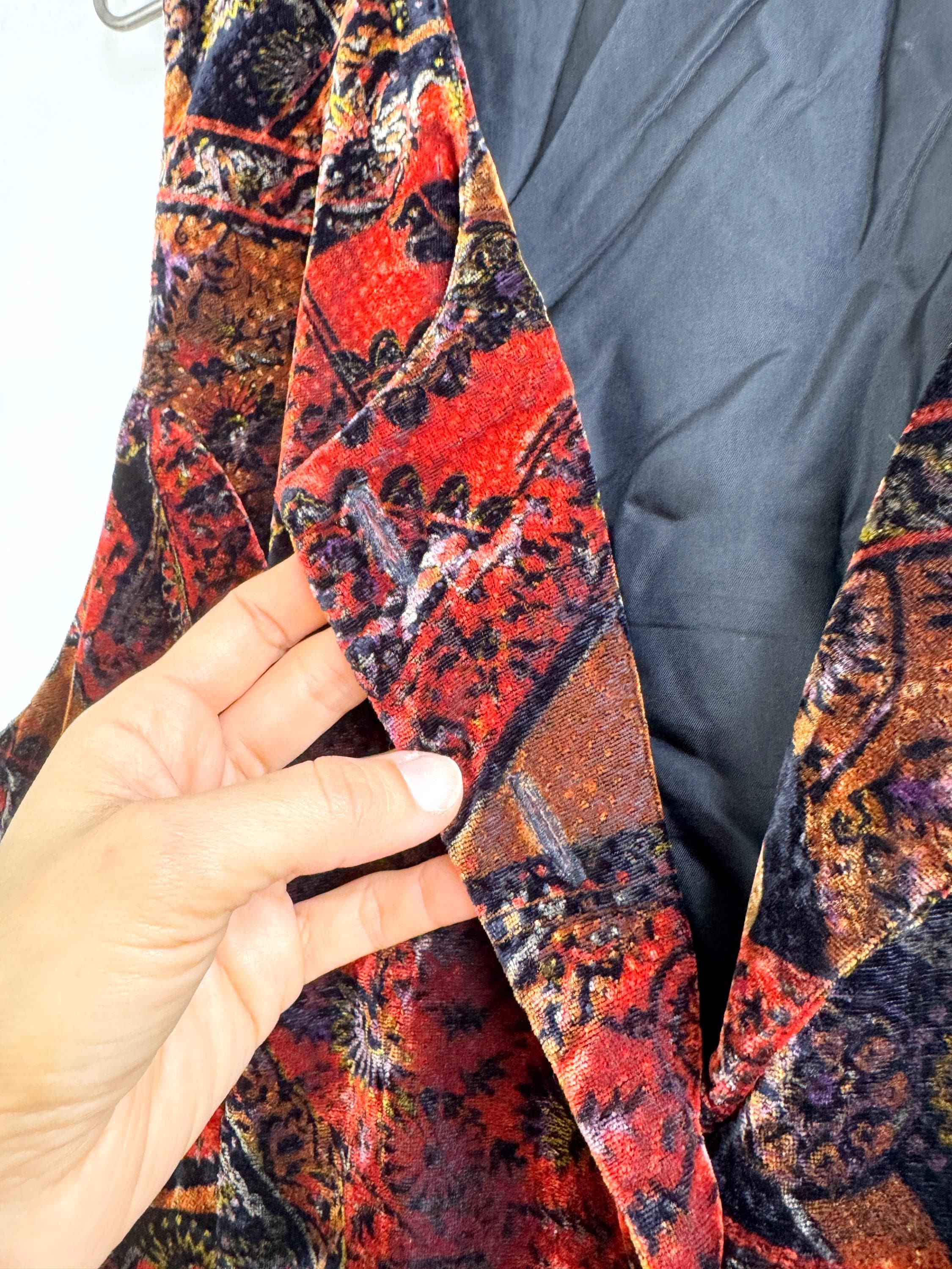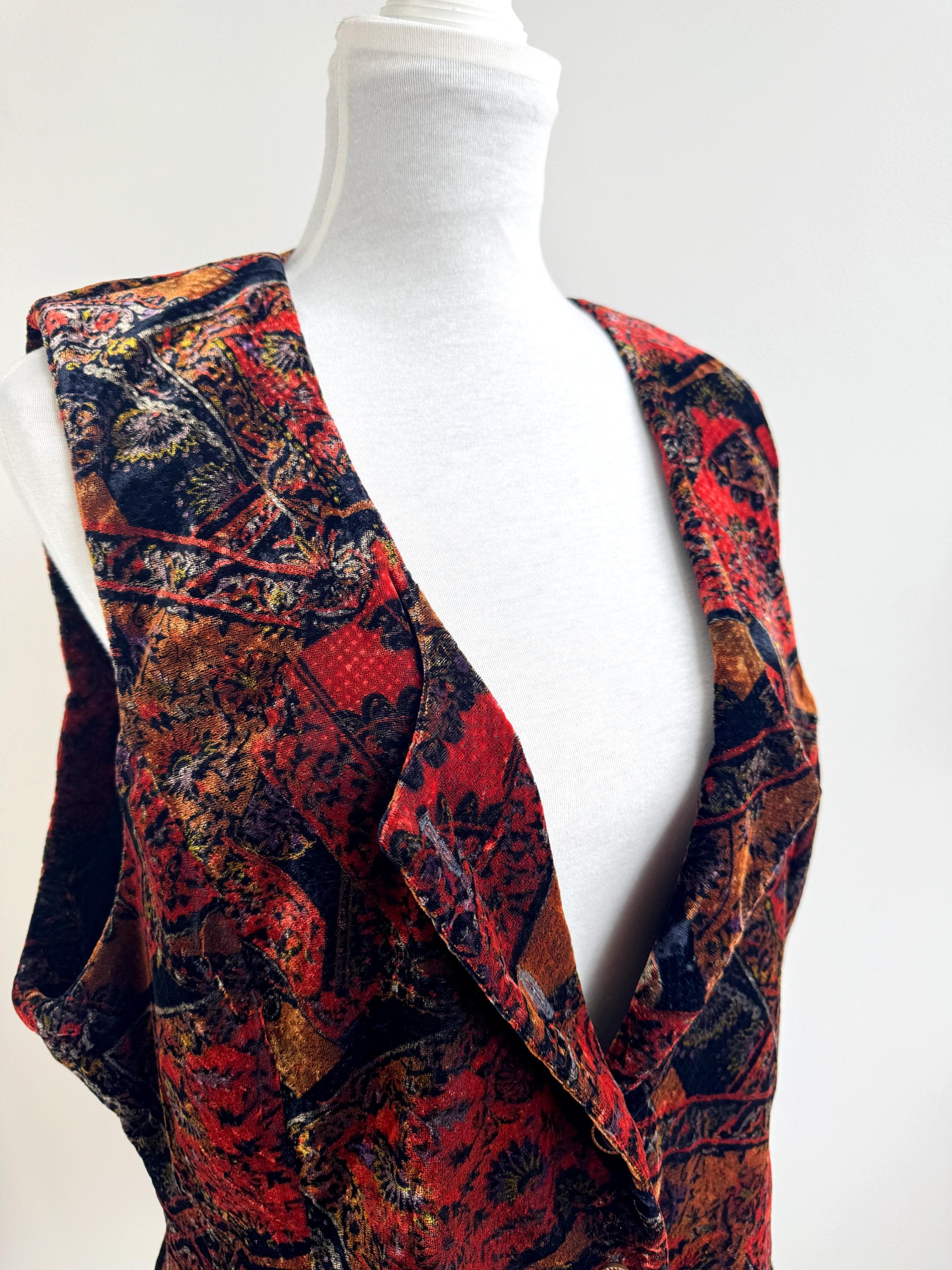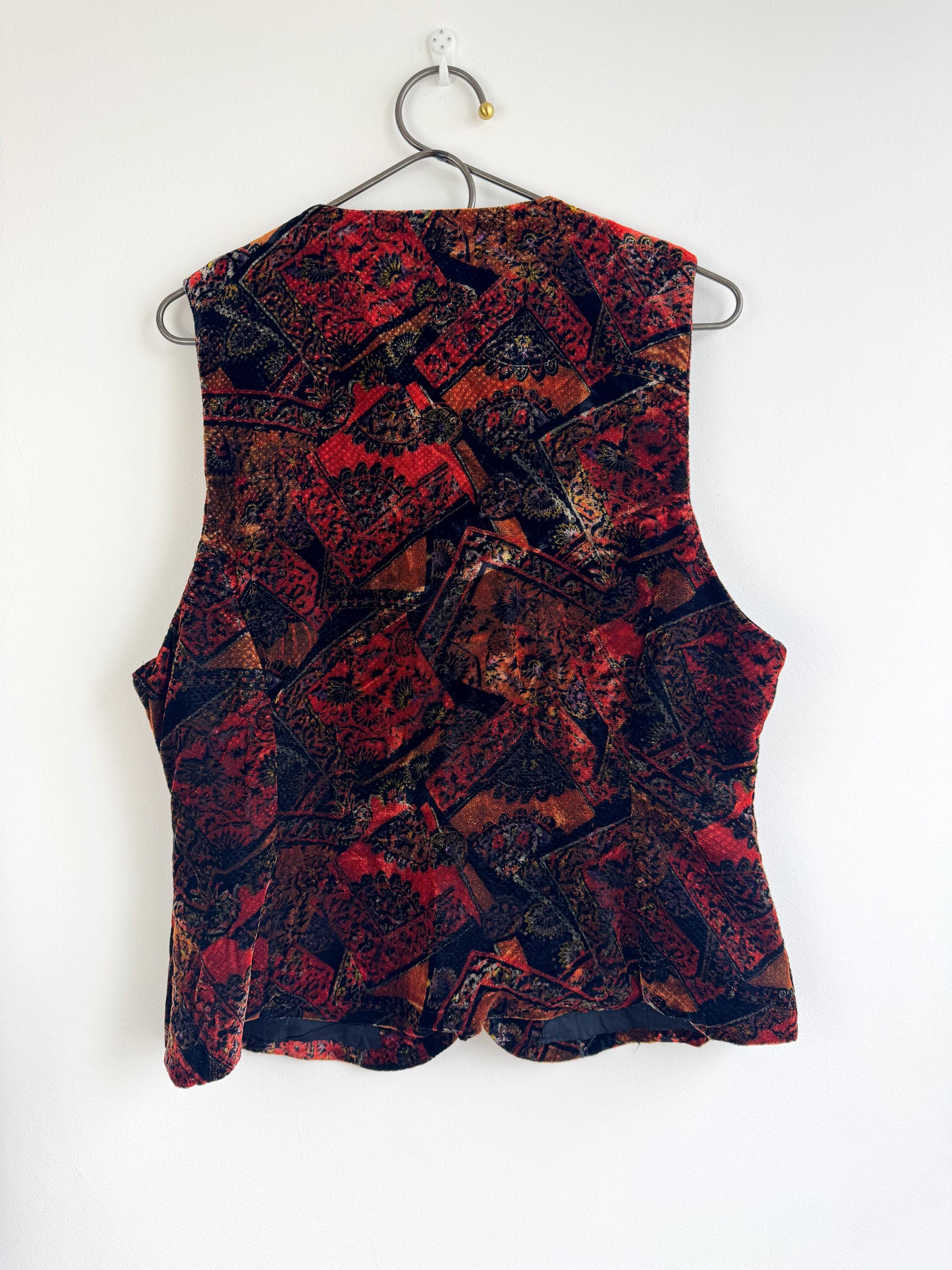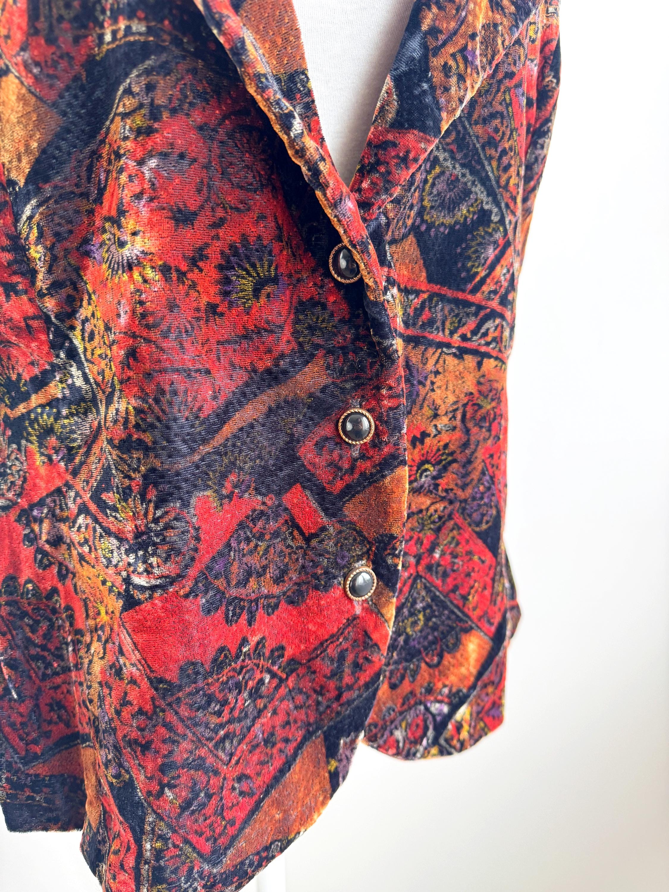 This is a beautiful vintage 80s velvet waistcoat for women with button front closure and elegant fitted silhouette with lapels. There are no tags or labels - the velvet fabric is in great shape. It represents gorgeous paisley geometric pattern in earthy tones - burgindy red, rust brown, burnt orange. This velvet sleeveless blazer fits like size L. Please check the measurements below.