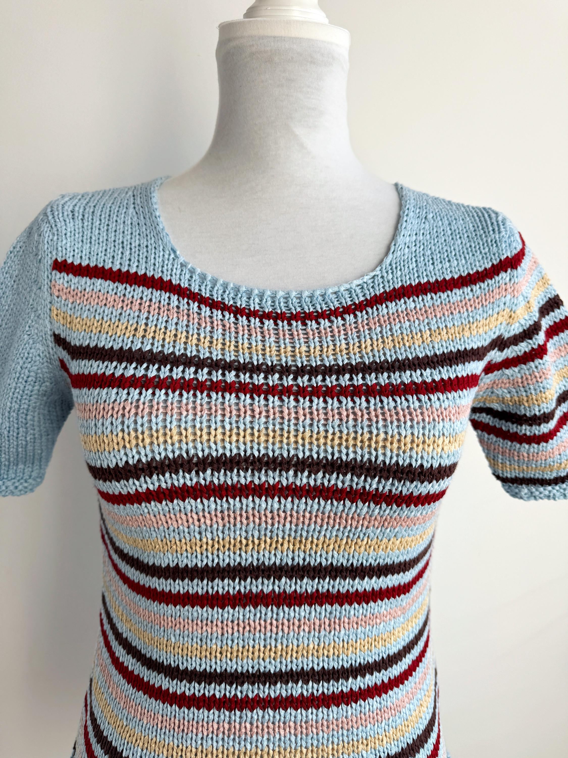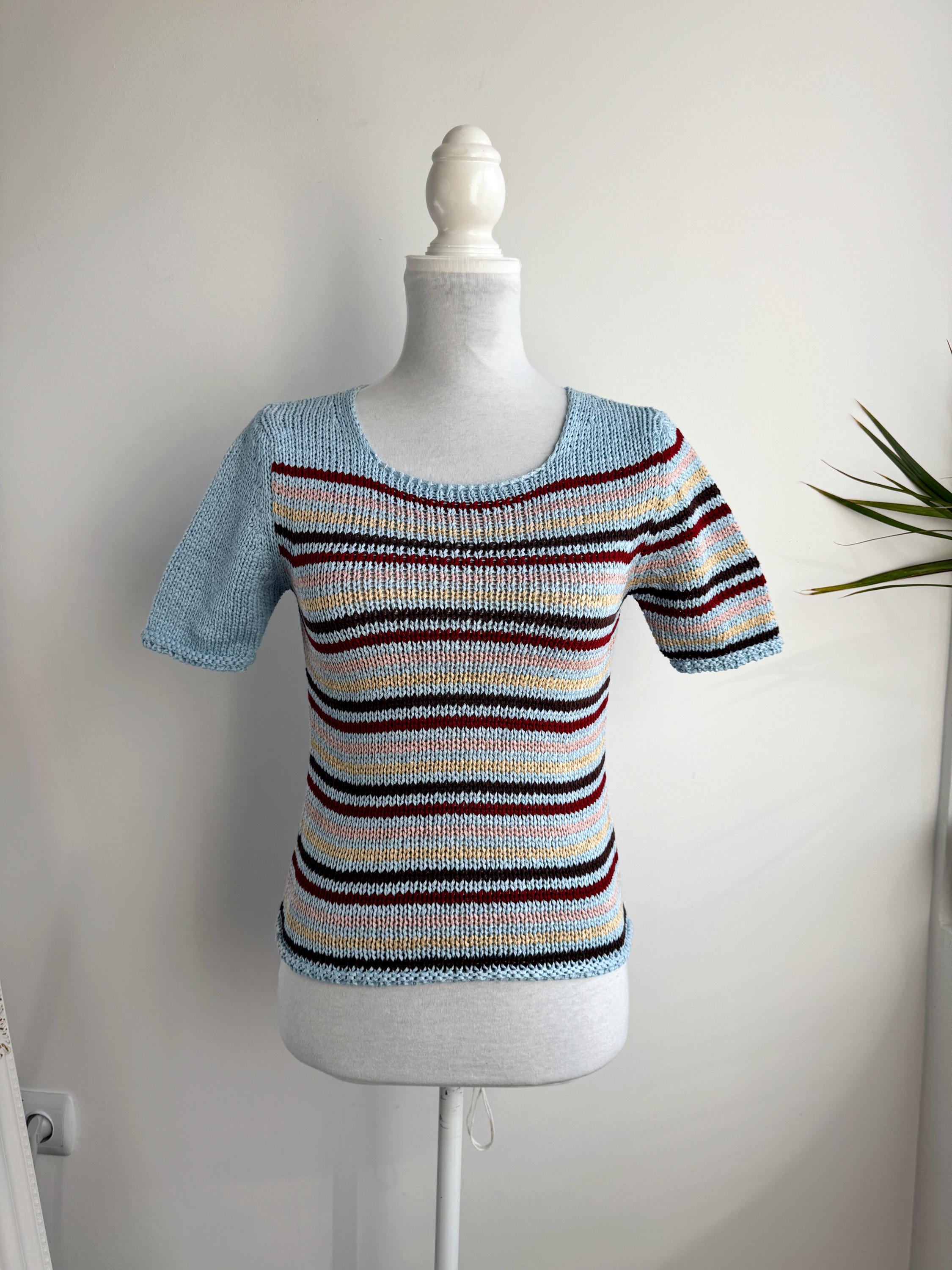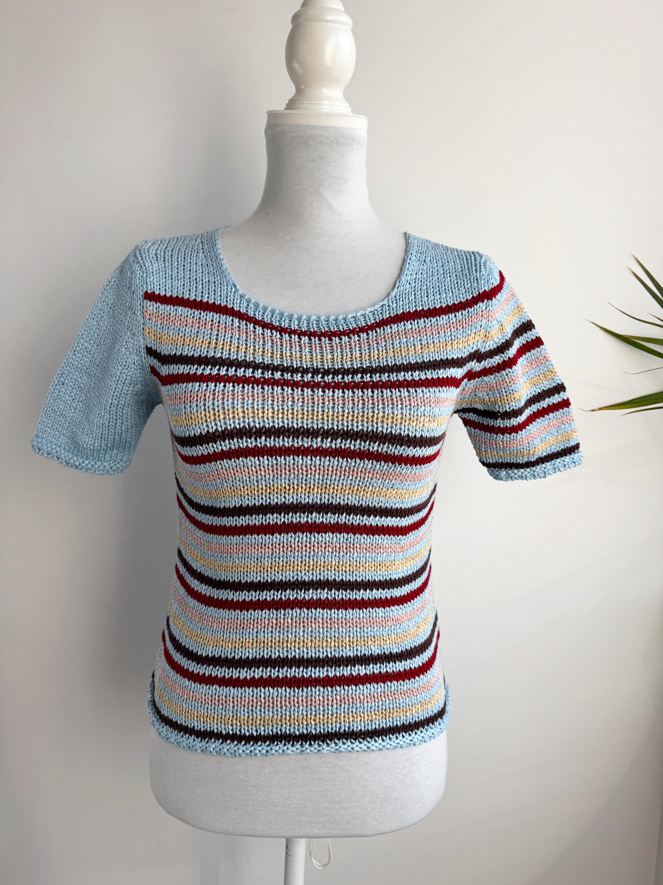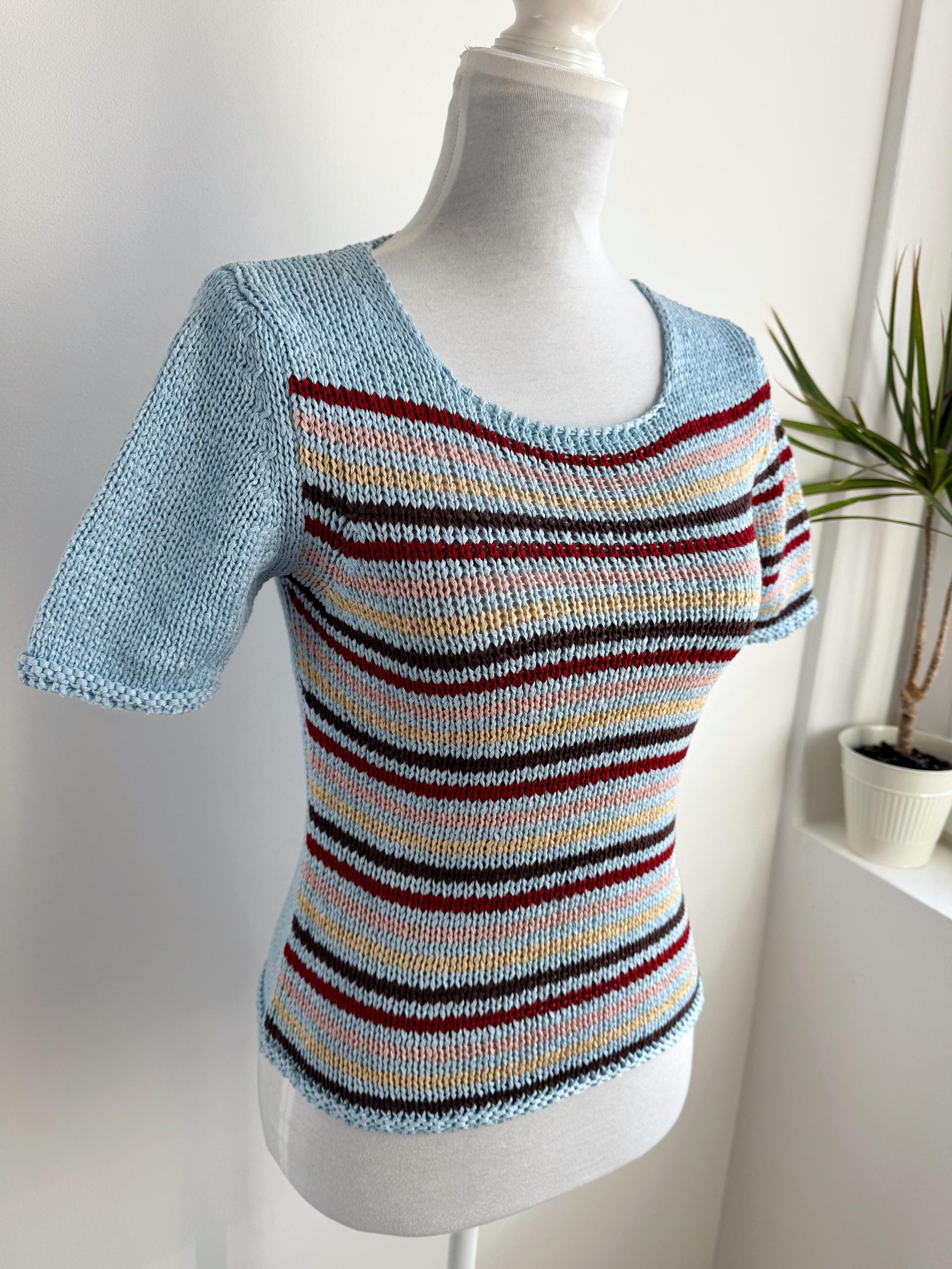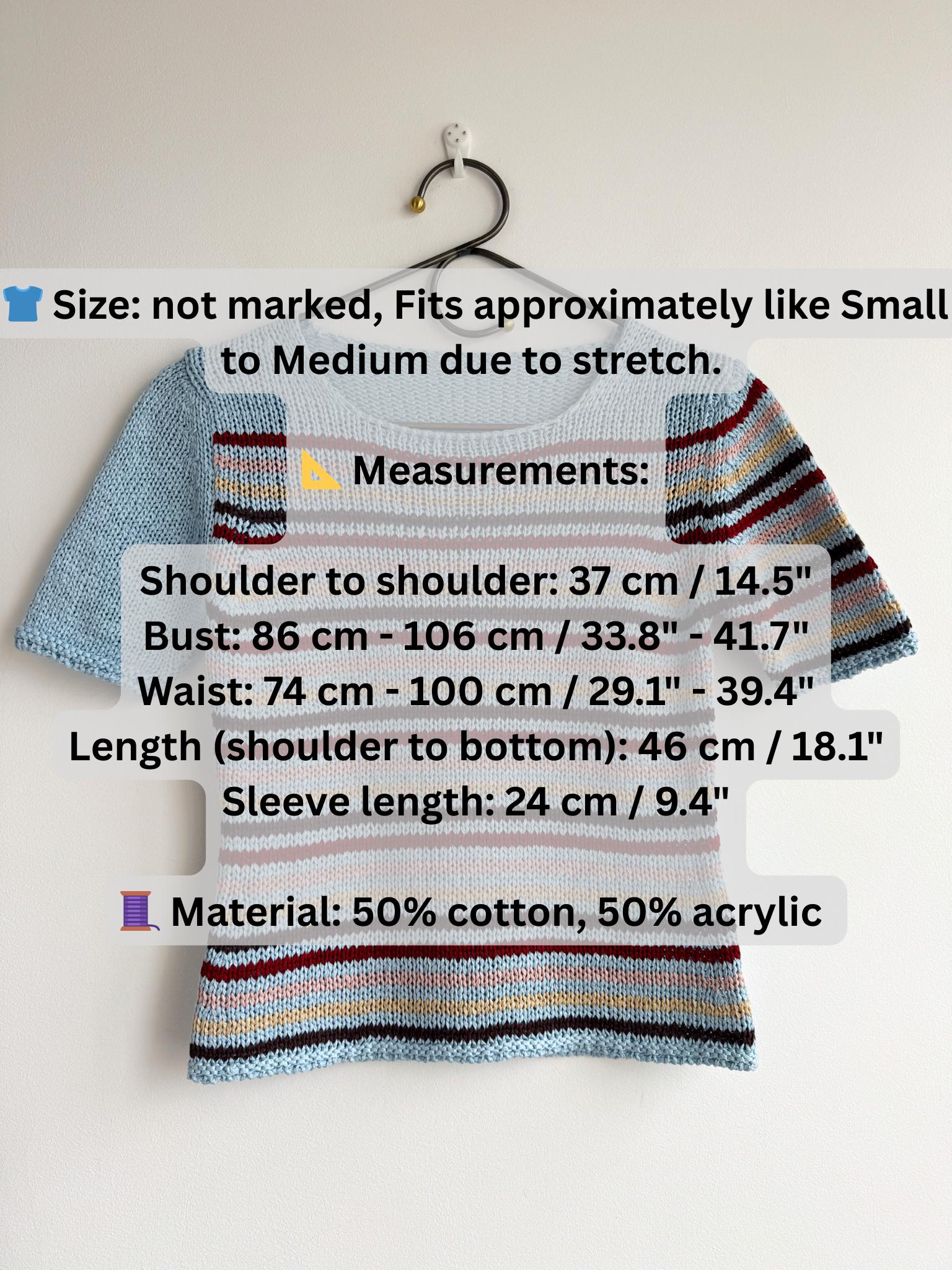 This is a lovely vintage 90s knitted short sleeve sweater in light blue color with horizontal stripes burgundy red, peach pink, pale yellow and brown. This vintage knit jumper top was made in Italy of cotton and acrylic blend fabric (50% cotton, 50% acrylic). This summer pullover has short sleeves with asymmetrical print - one sleeve is solid light blue color and the other one is stipes. This Vintage 90s grunge sweater has no size marked, it fits like size S. Please check the measurements below.