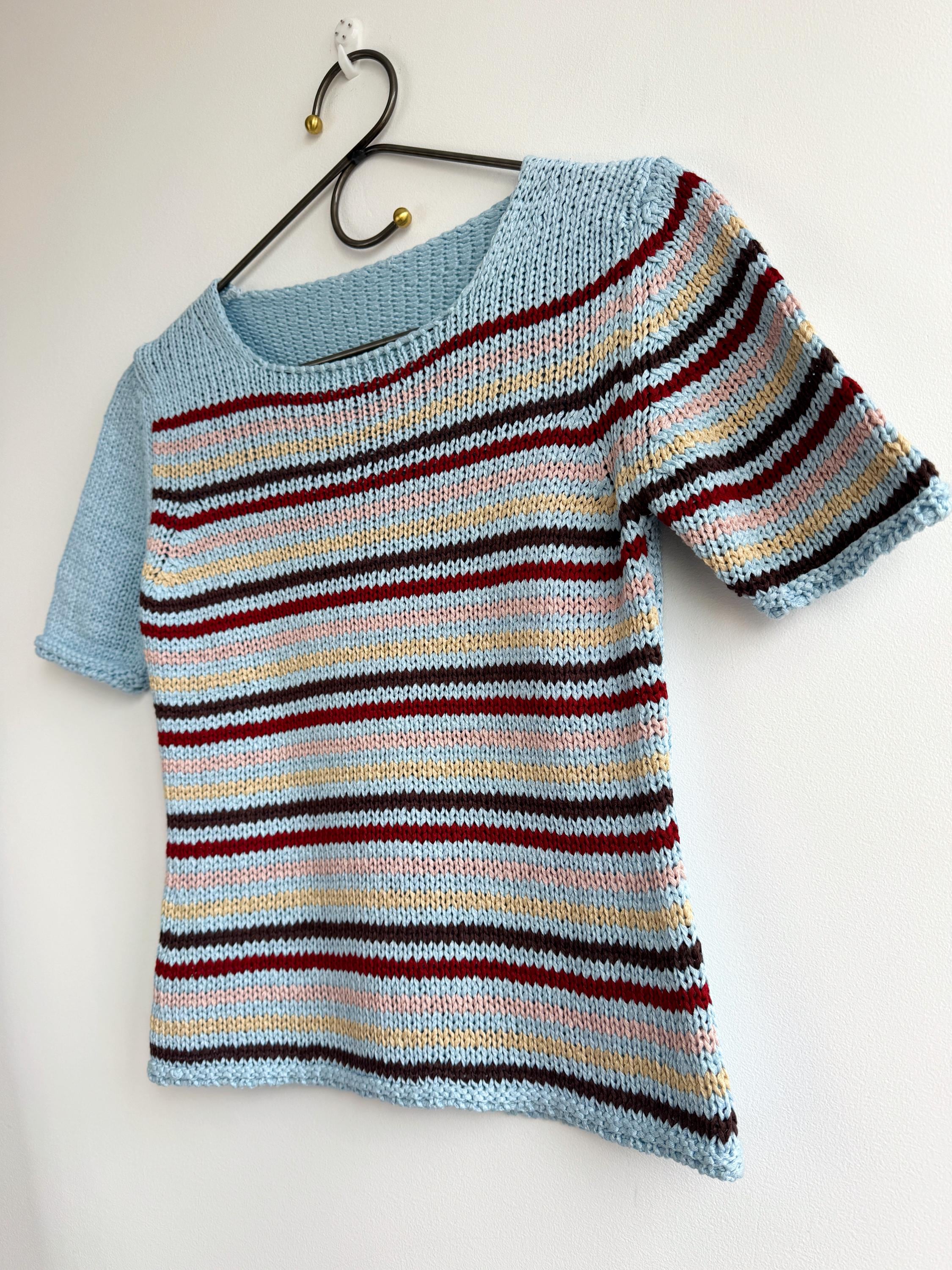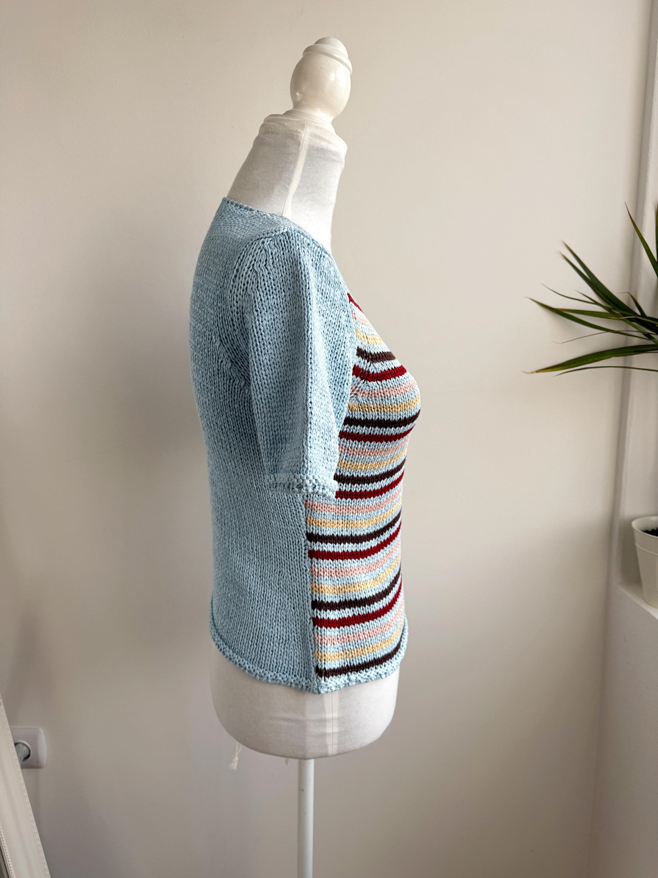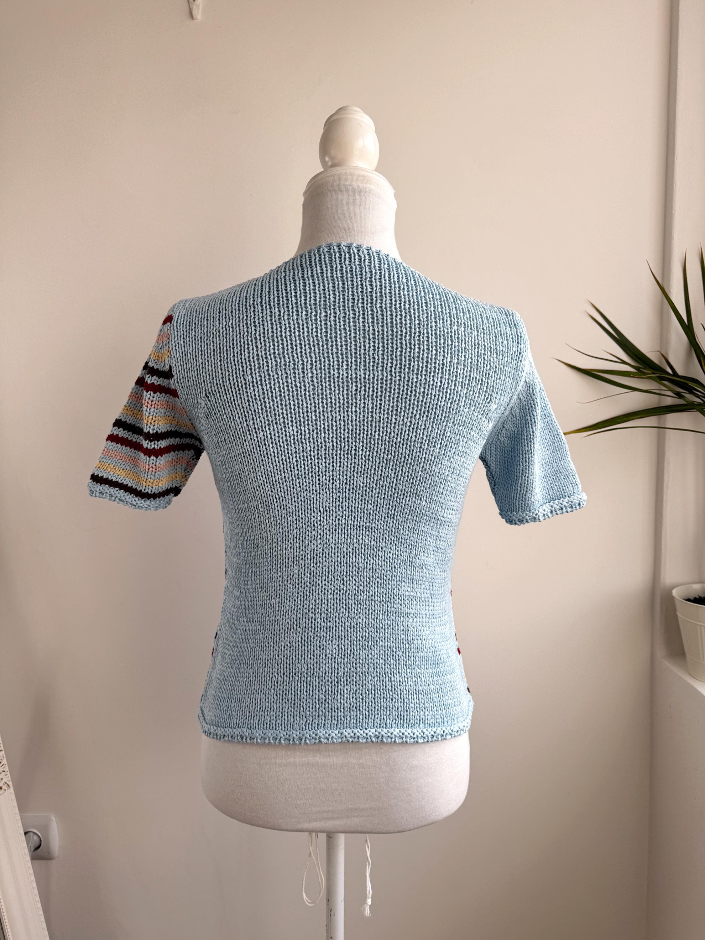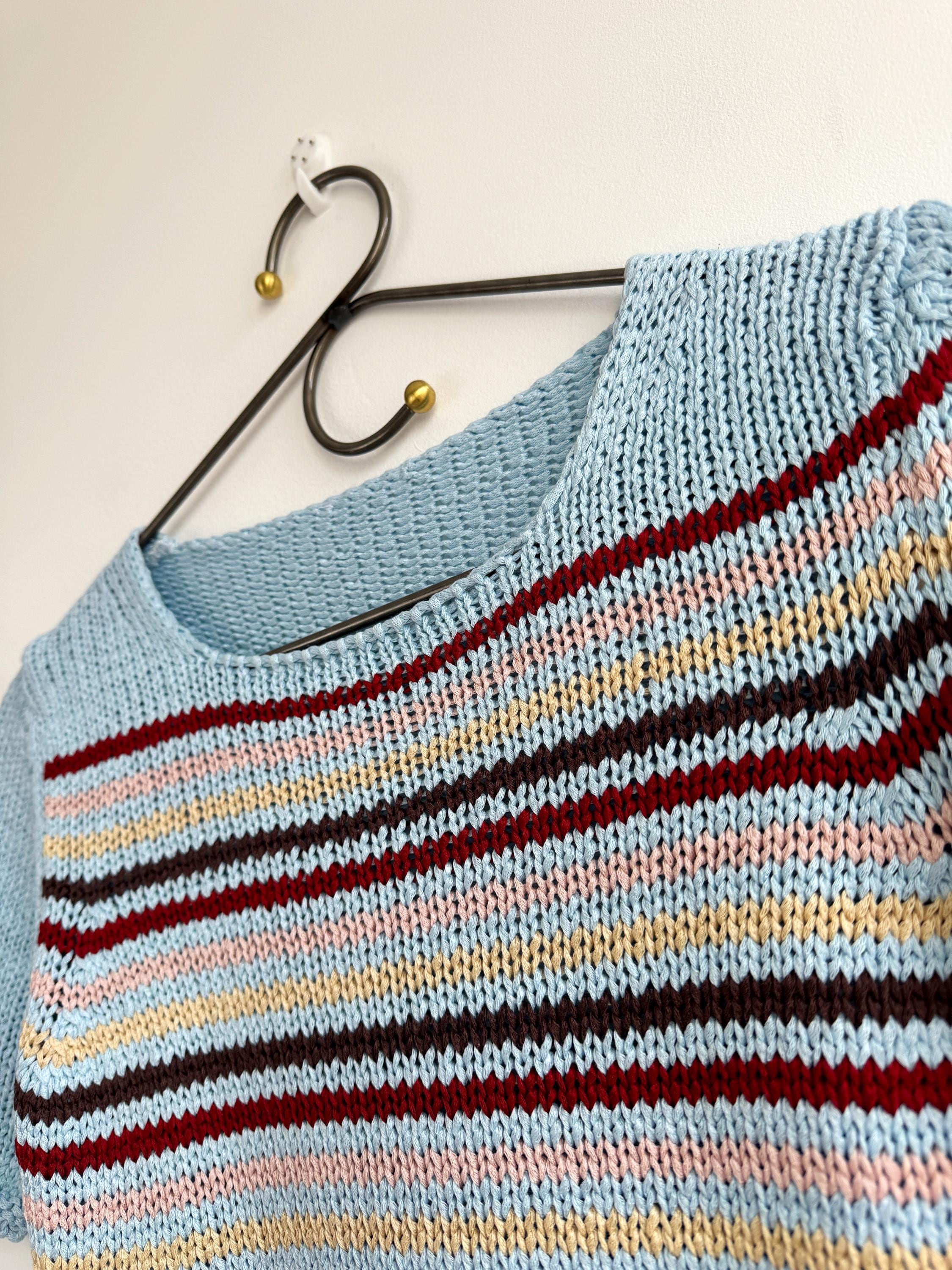 This is a lovely vintage 90s knitted short sleeve sweater in light blue color with horizontal stripes burgundy red, peach pink, pale yellow and brown. This vintage knit jumper top was made in Italy of cotton and acrylic blend fabric (50% cotton, 50% acrylic). This summer pullover has short sleeves with asymmetrical print - one sleeve is solid light blue color and the other one is stipes. This Vintage 90s grunge sweater has no size marked, it fits like size S. Please check the measurements below.
