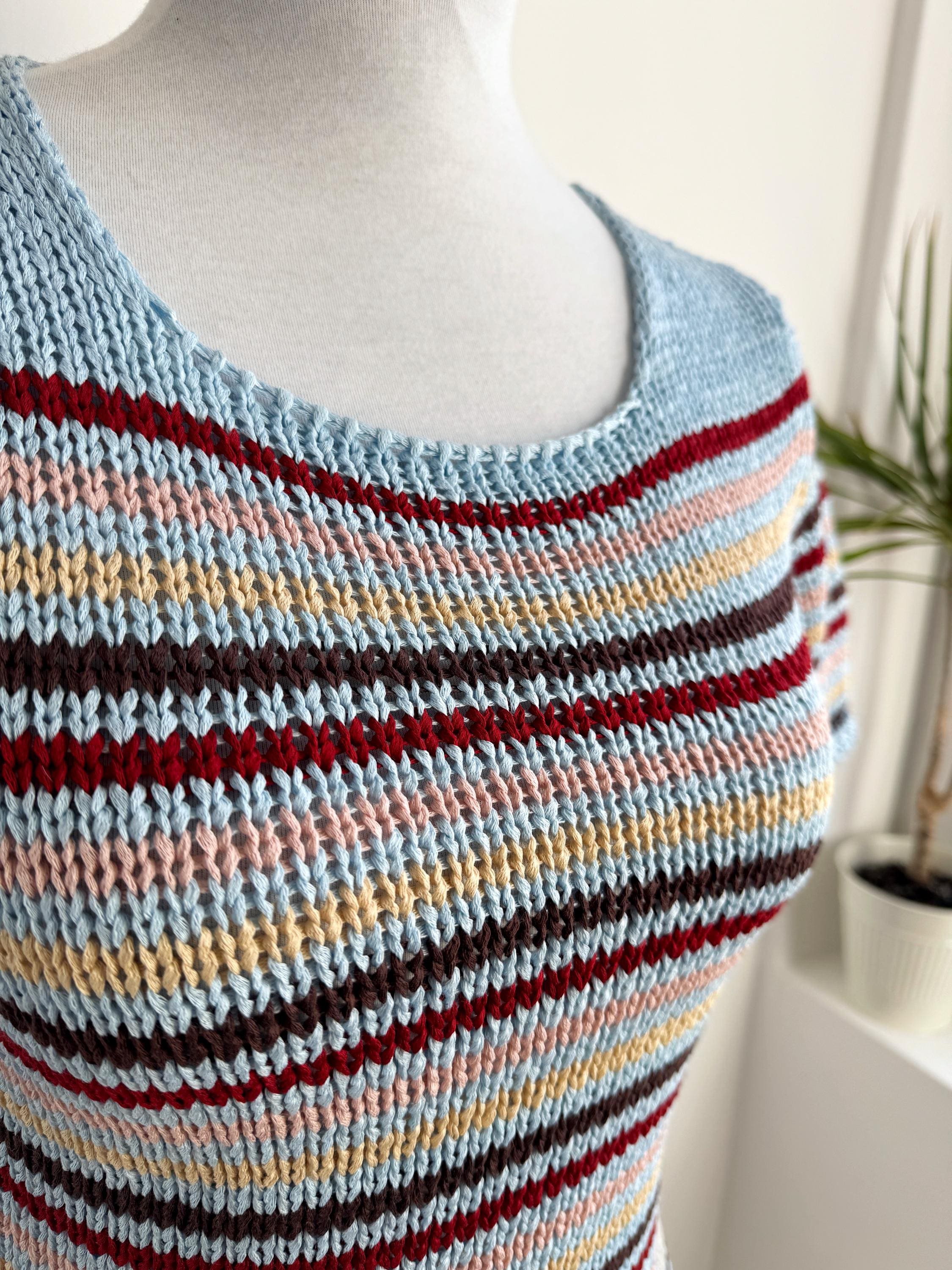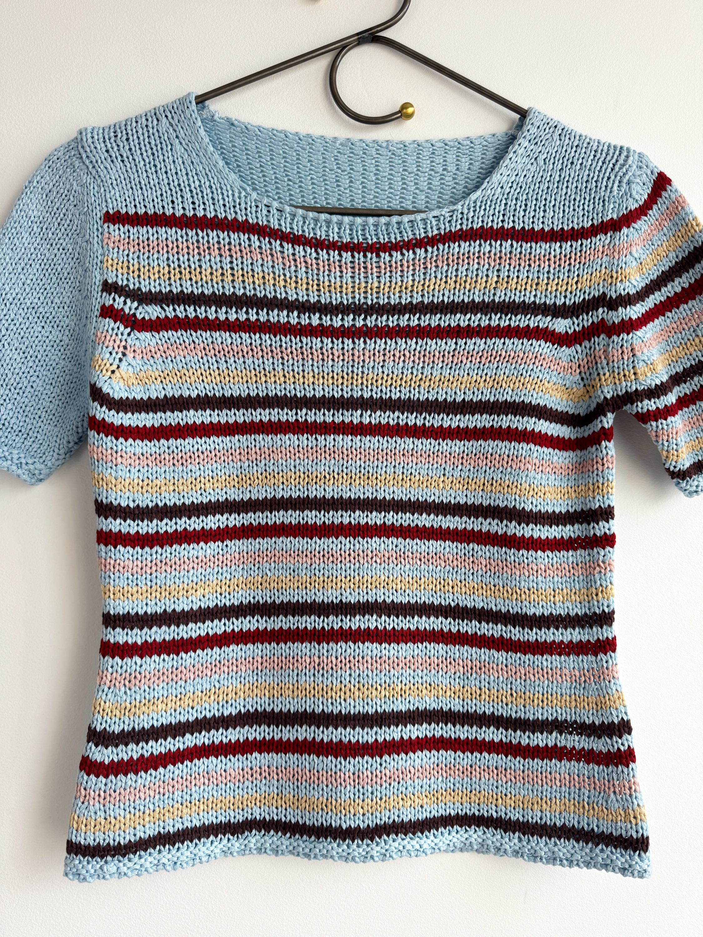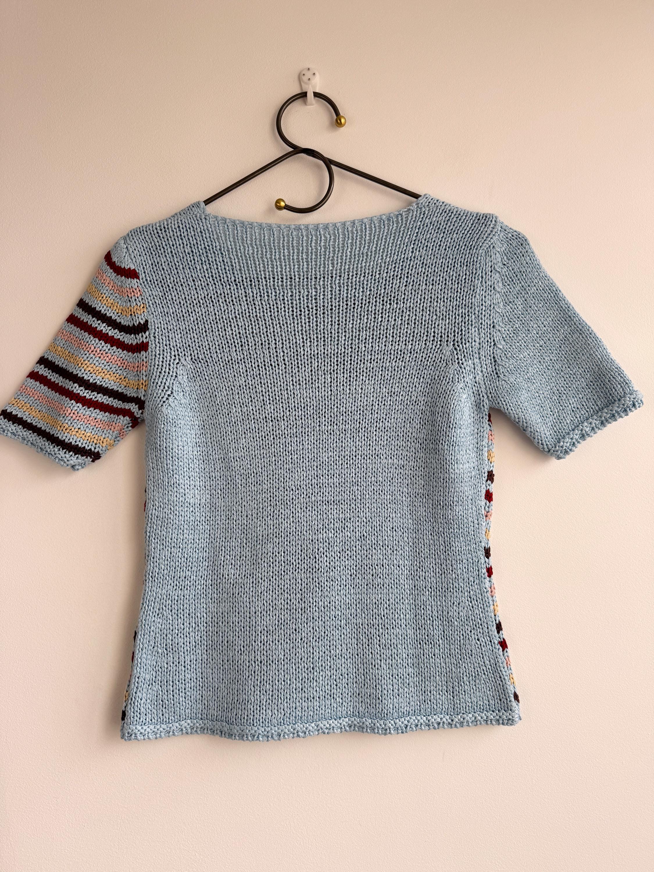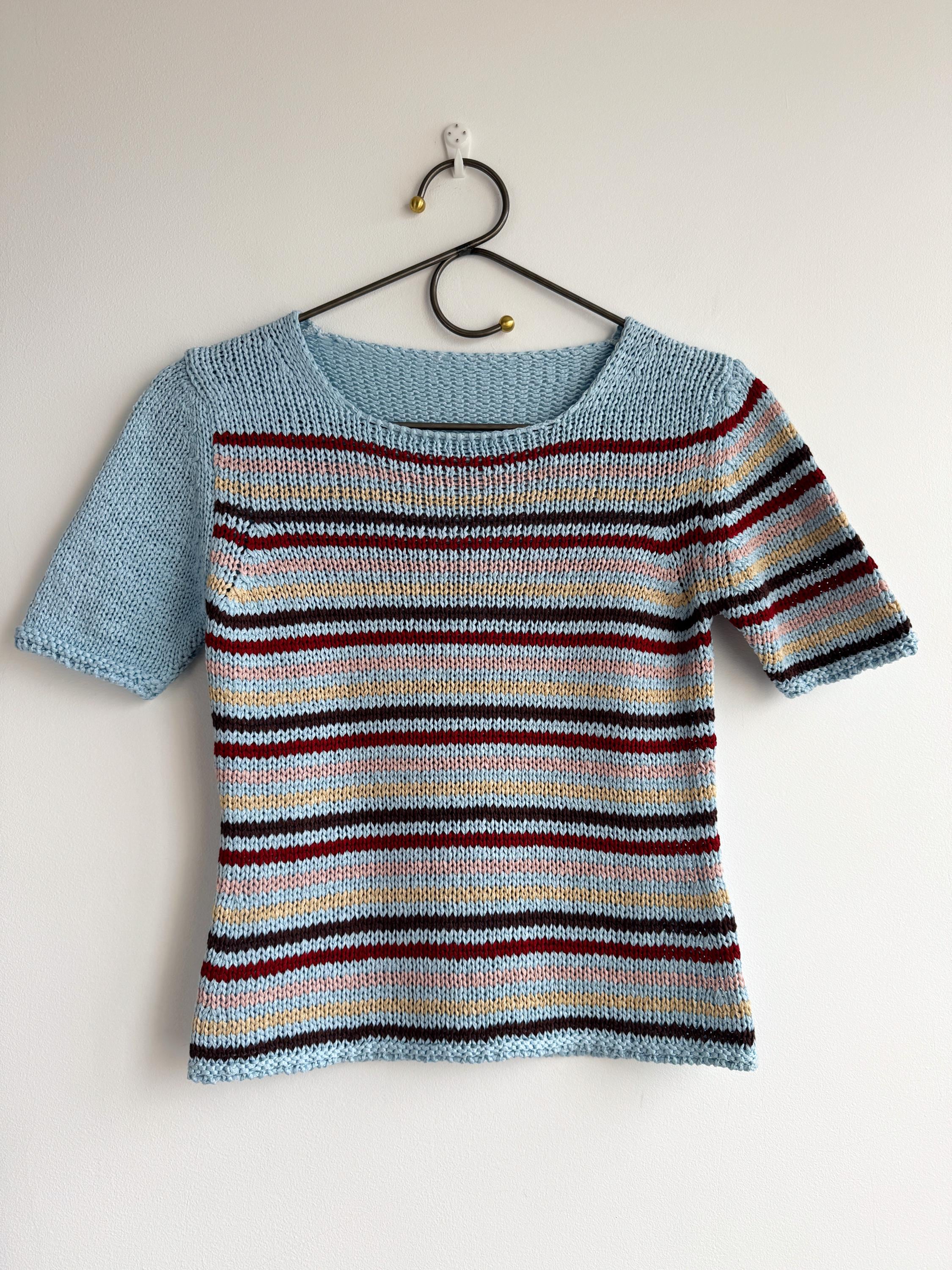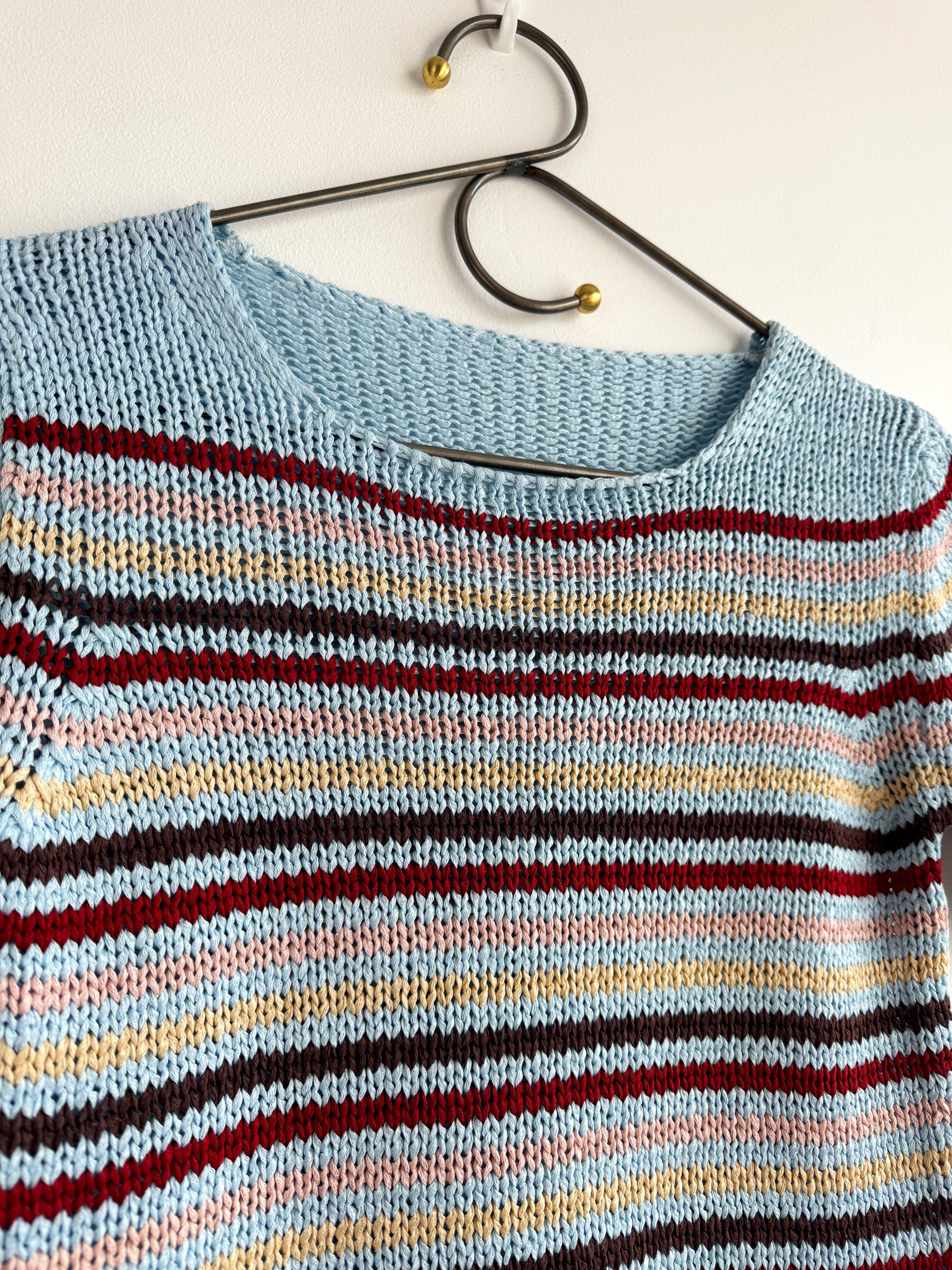 This is a lovely vintage 90s knitted short sleeve sweater in light blue color with horizontal stripes burgundy red, peach pink, pale yellow and brown. This vintage knit jumper top was made in Italy of cotton and acrylic blend fabric (50% cotton, 50% acrylic). This summer pullover has short sleeves with asymmetrical print - one sleeve is solid light blue color and the other one is stipes. This Vintage 90s grunge sweater has no size marked, it fits like size S. Please check the measurements below.
