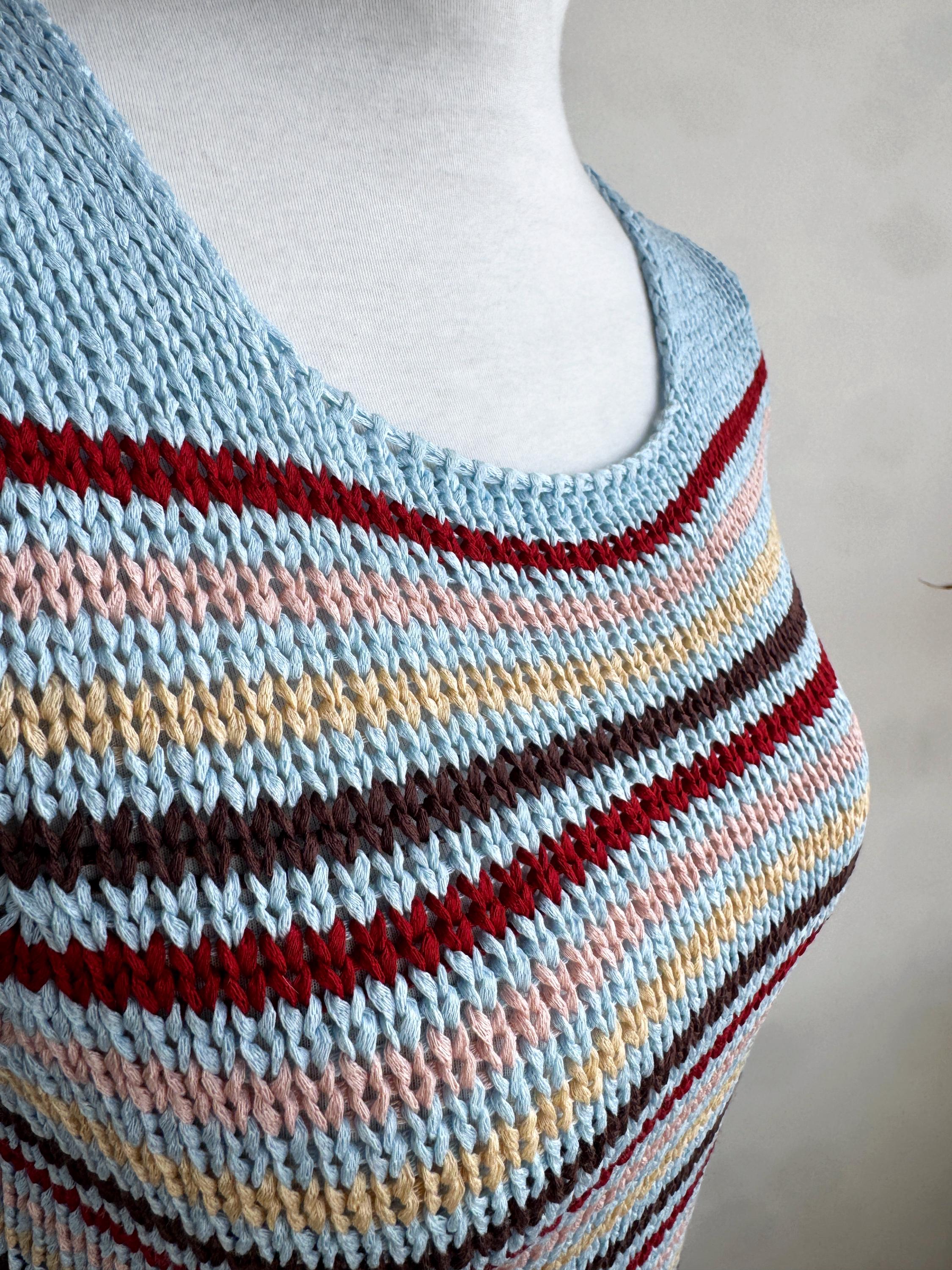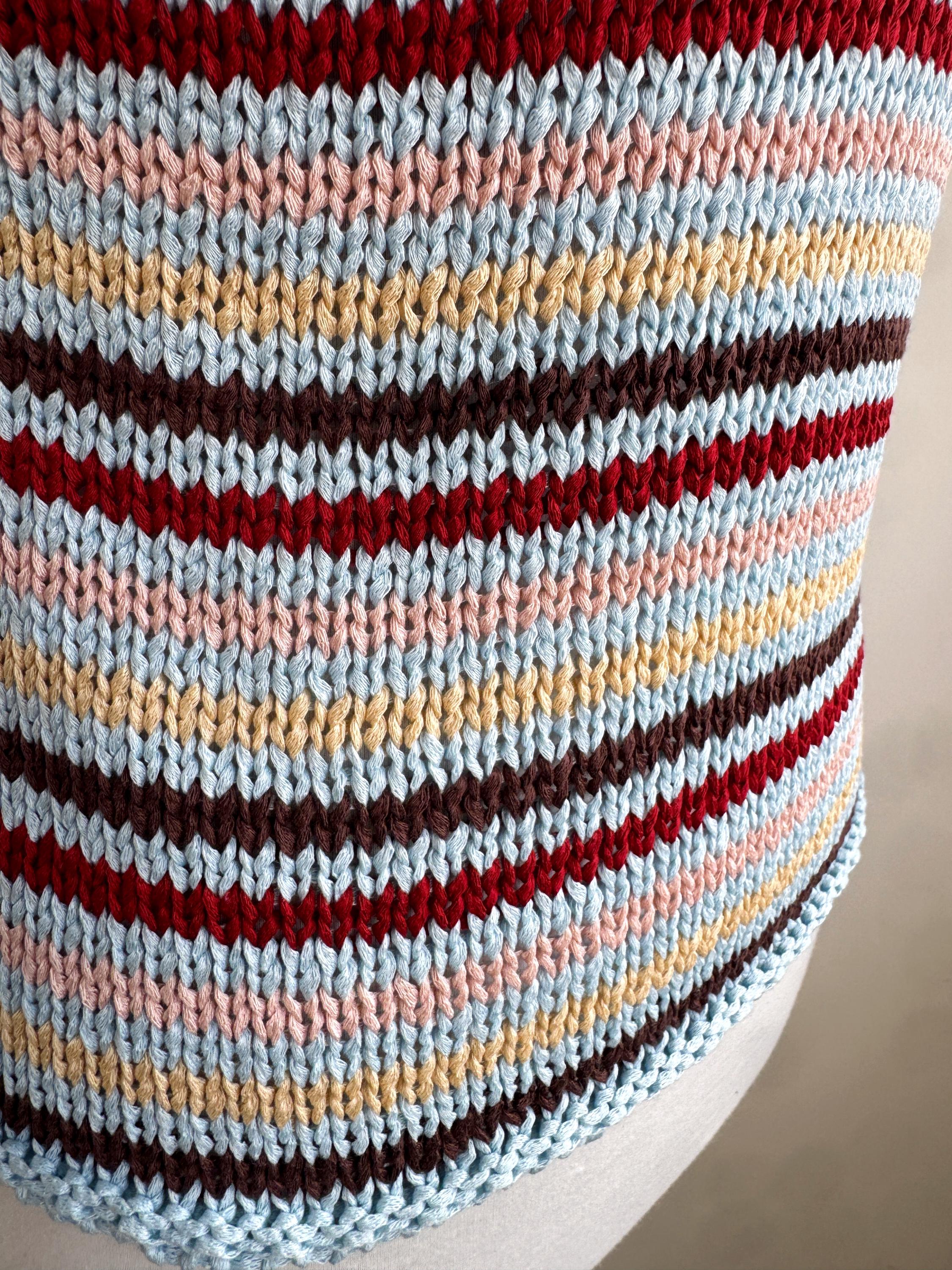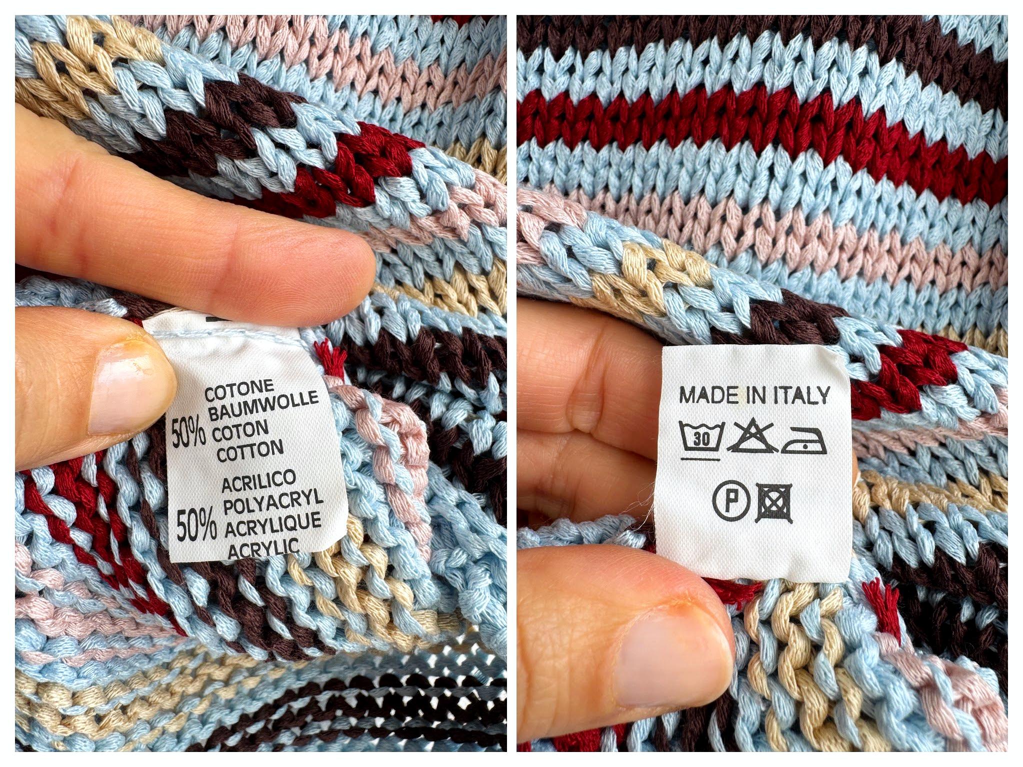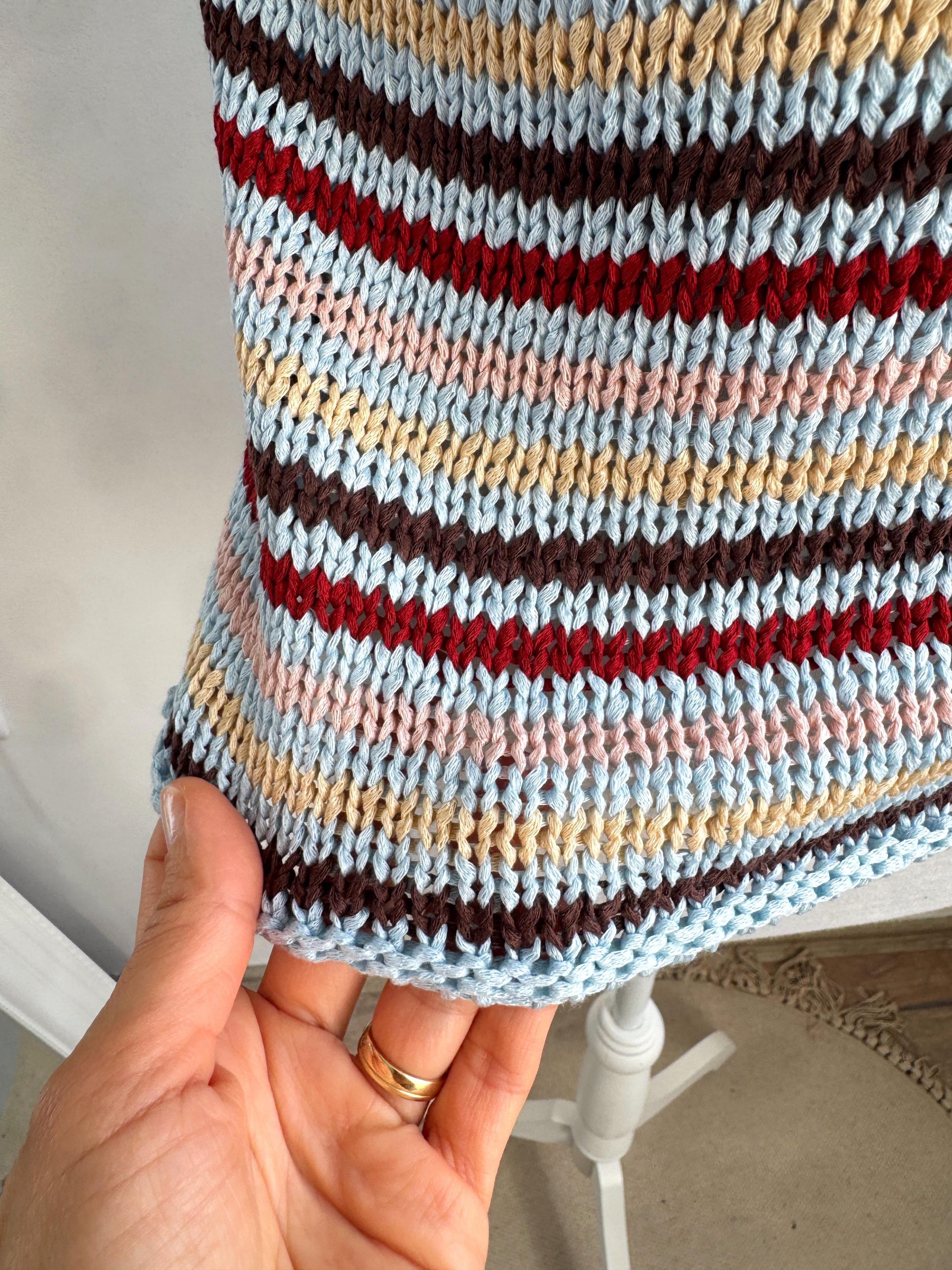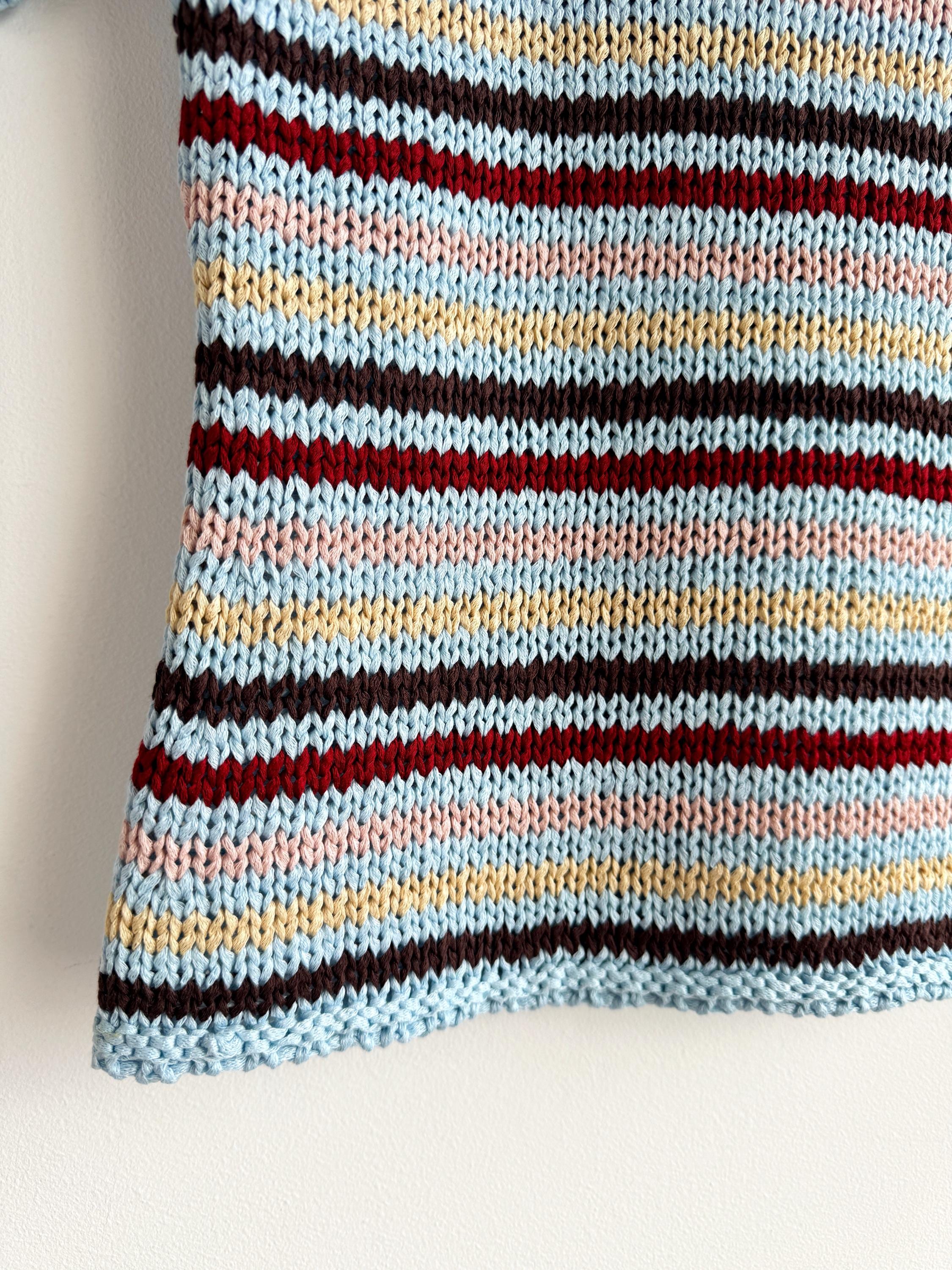 This is a lovely vintage 90s knitted short sleeve sweater in light blue color with horizontal stripes burgundy red, peach pink, pale yellow and brown. This vintage knit jumper top was made in Italy of cotton and acrylic blend fabric (50% cotton, 50% acrylic). This summer pullover has short sleeves with asymmetrical print - one sleeve is solid light blue color and the other one is stipes. This Vintage 90s grunge sweater has no size marked, it fits like size S. Please check the measurements below.