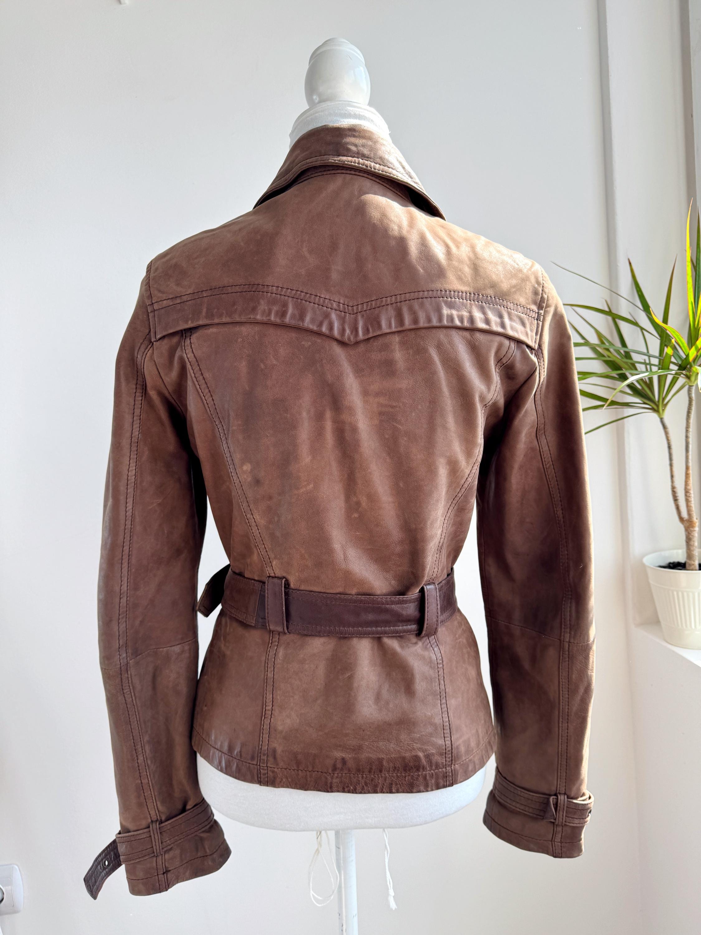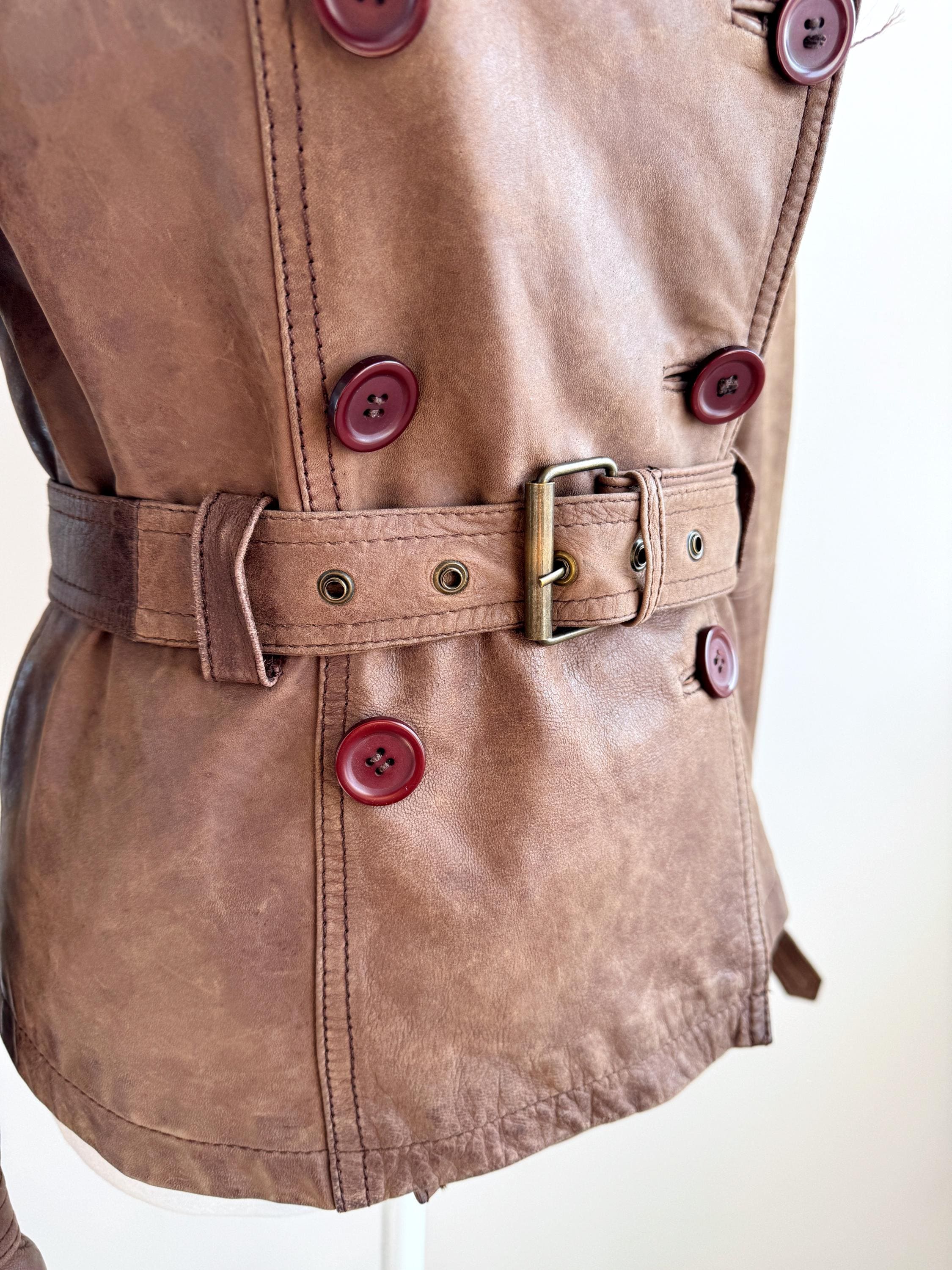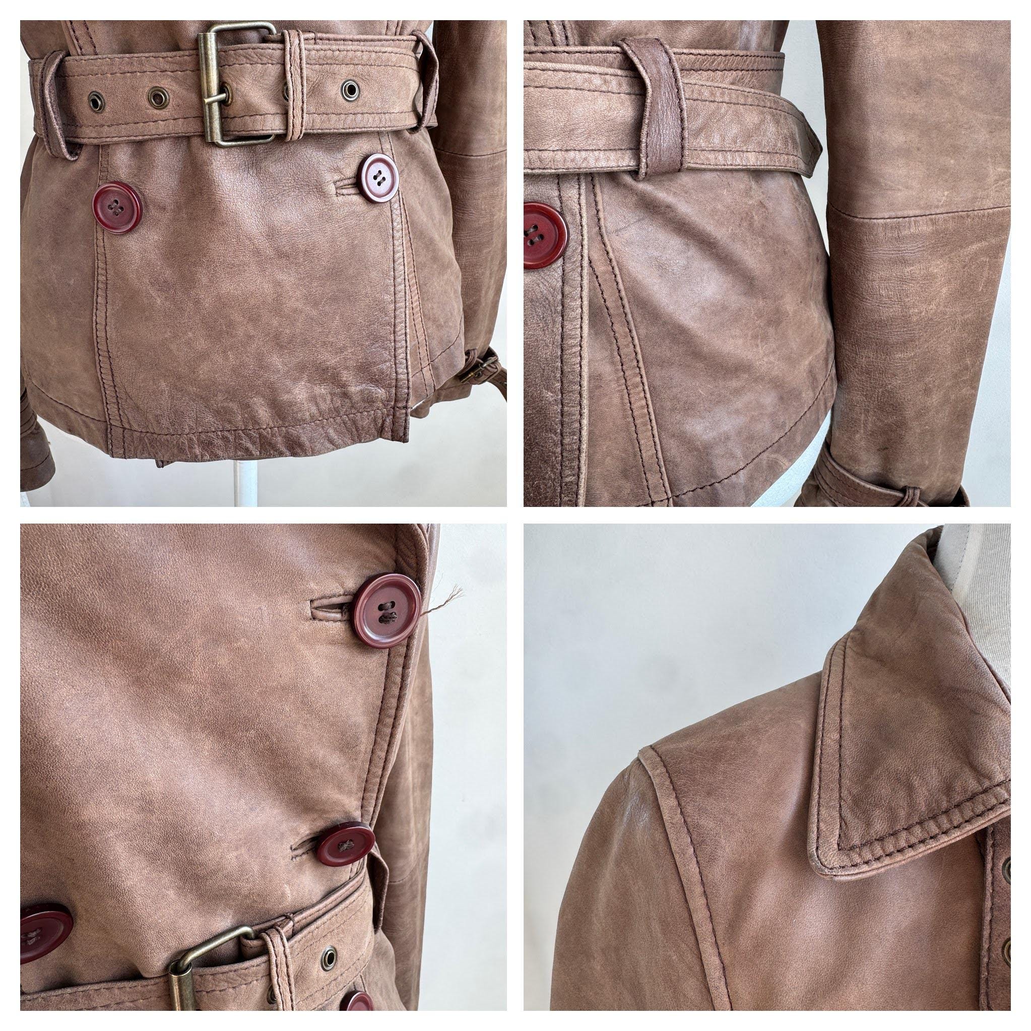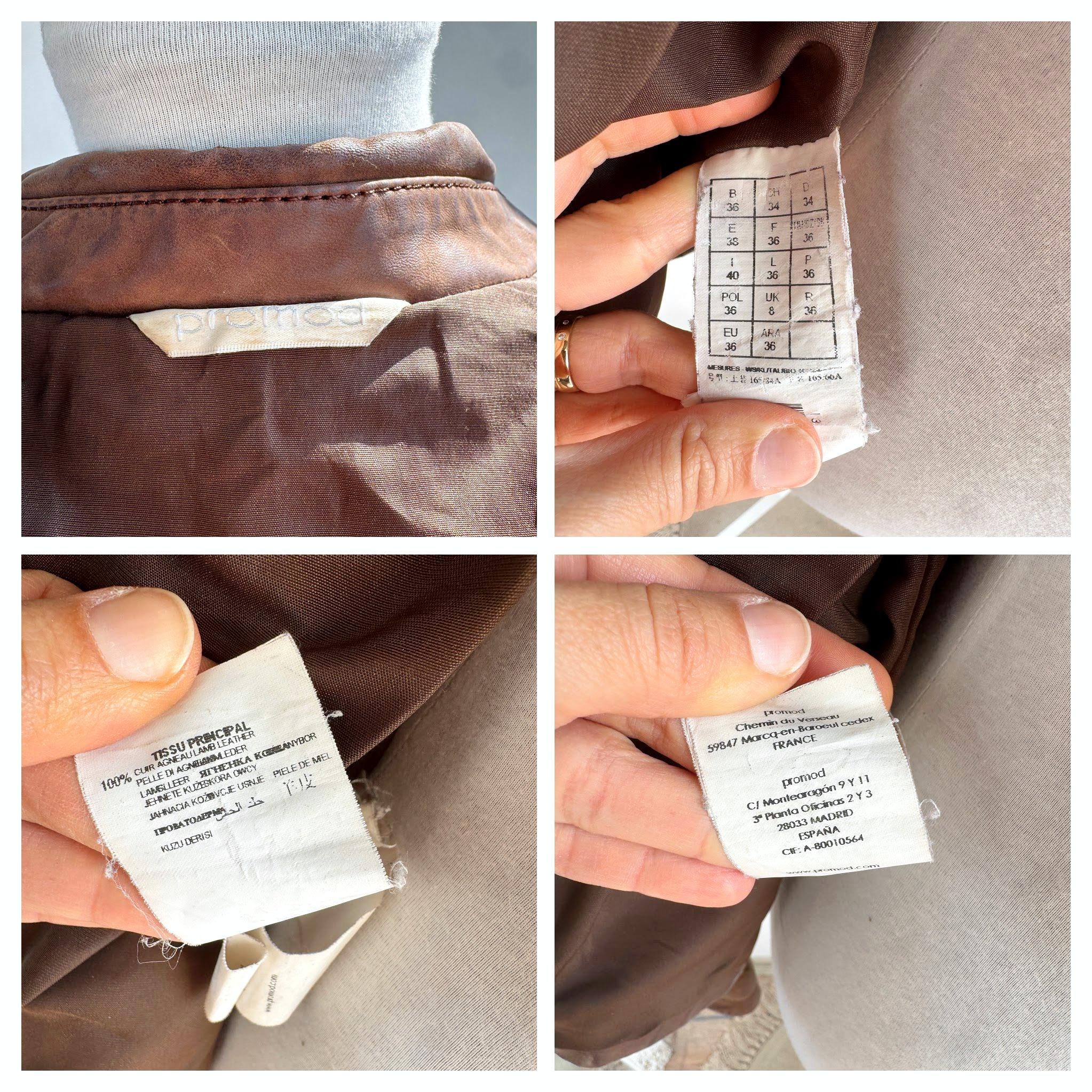 This stunning vintage Promod leather jacket is a statement of the 90s-meets-Y2K minimalism. Crafted from incredibly soft, genuine lamb leather in a rich taupe brown hue, it features a sophisticated button-down front and a tailored silhouette that effortlessly bridges the gap between a classic blazer and a short trench coat. The leather is supple and "buttery" to the touch, characteristic of high-quality lambskin. Whether paired with flared denim for a full retro look or thrown over a slip dress, this cropped leather coat is a timeless staple for any vintage collector.