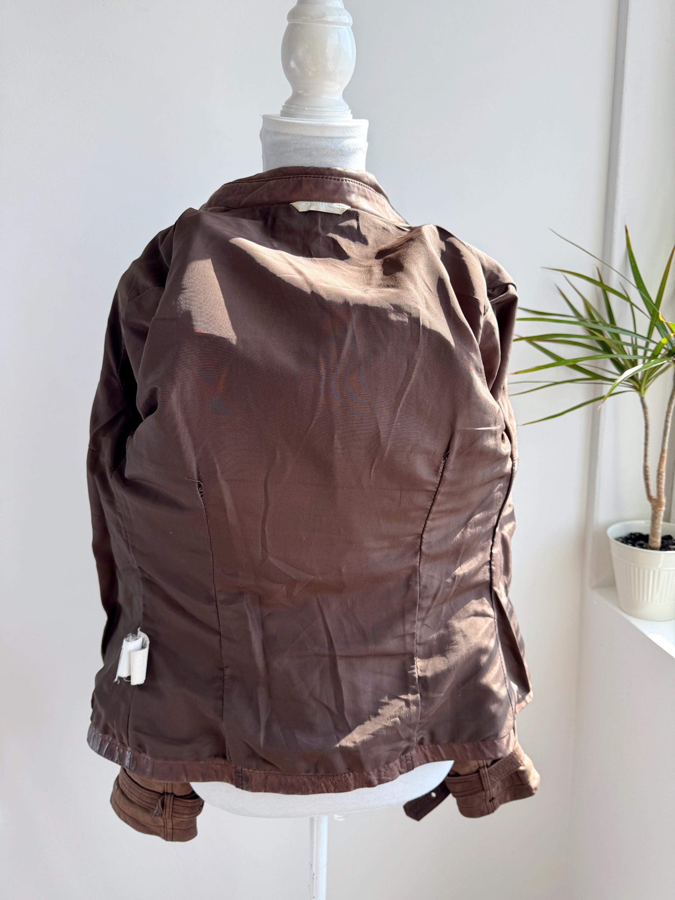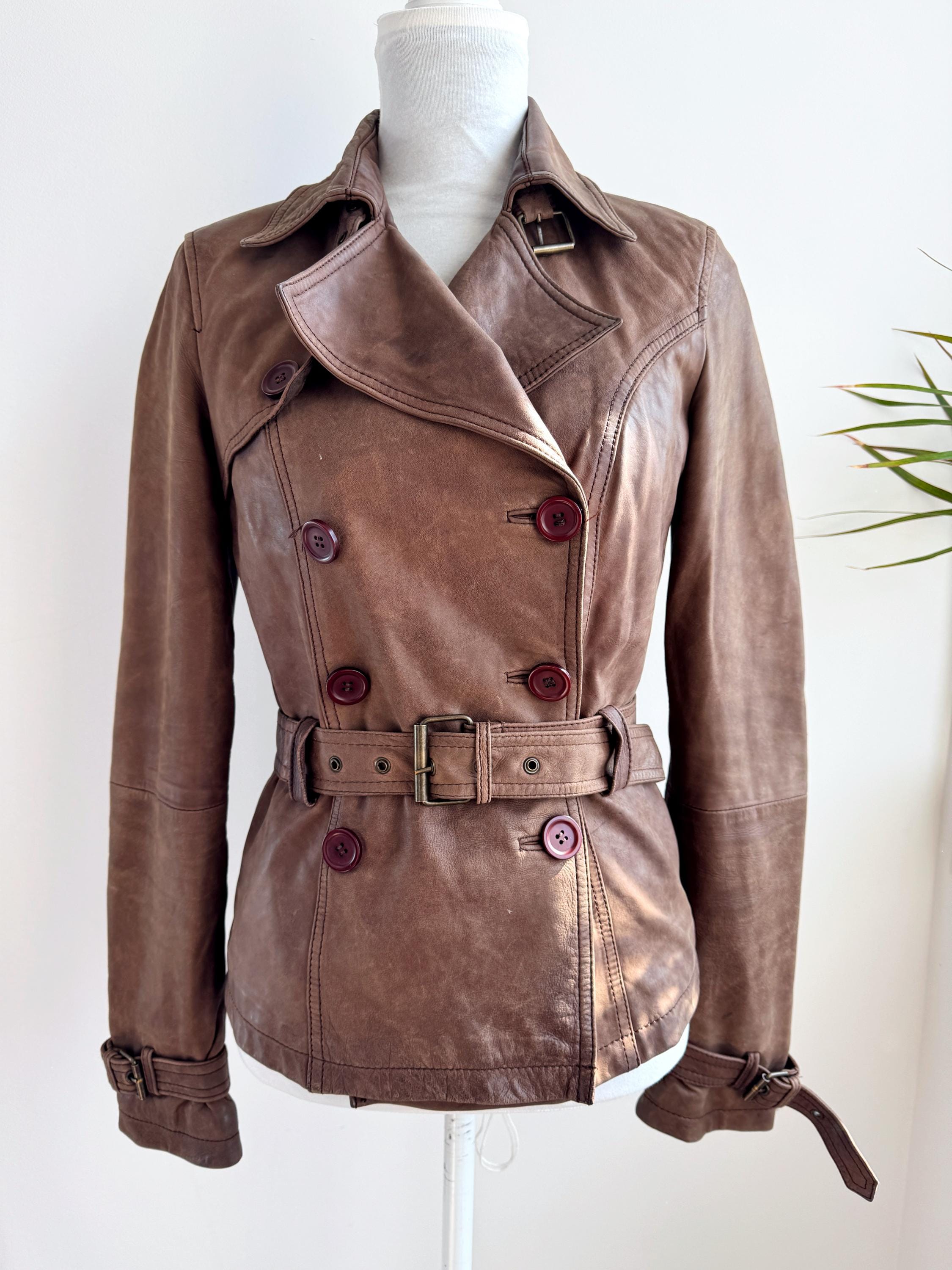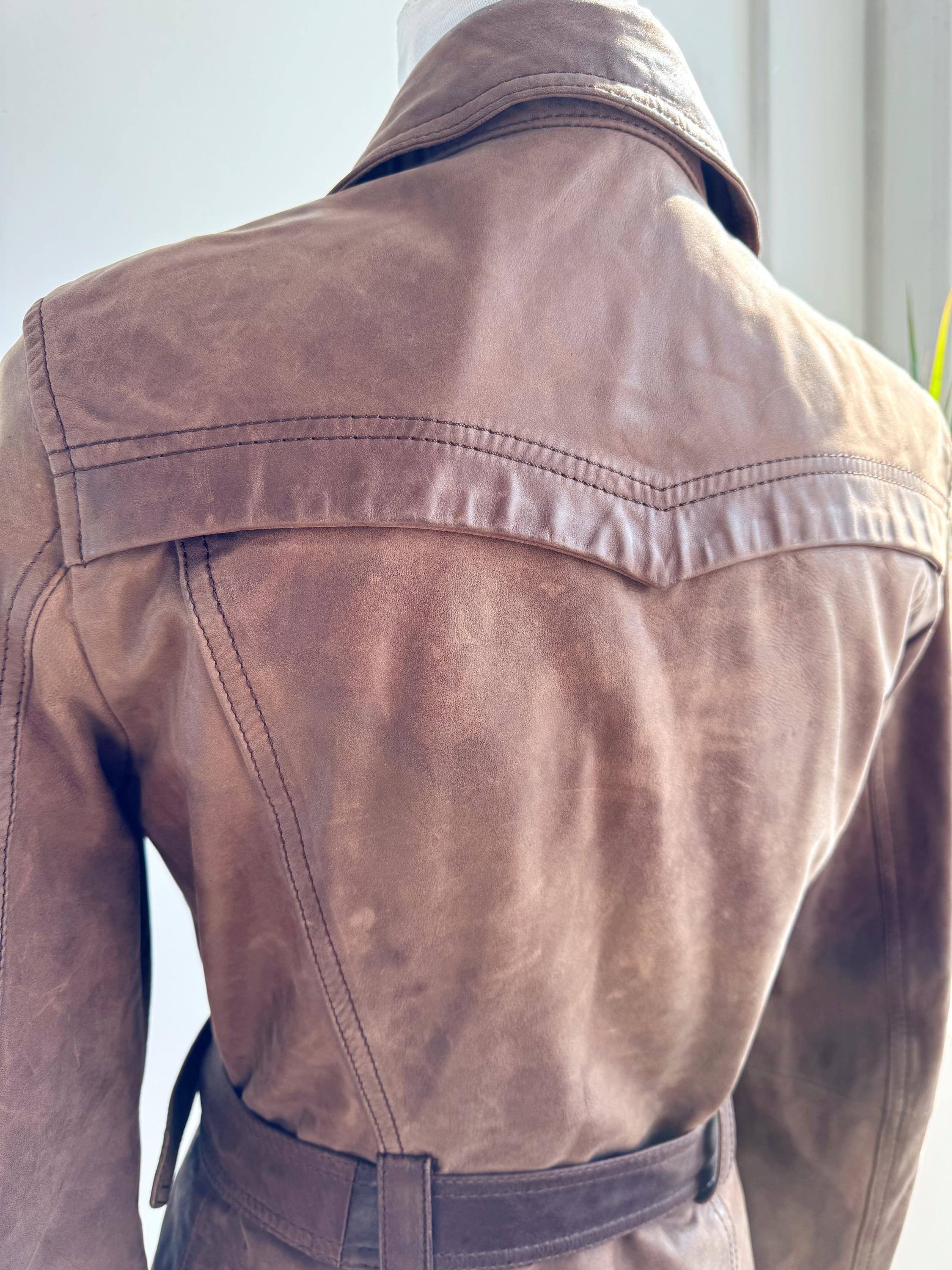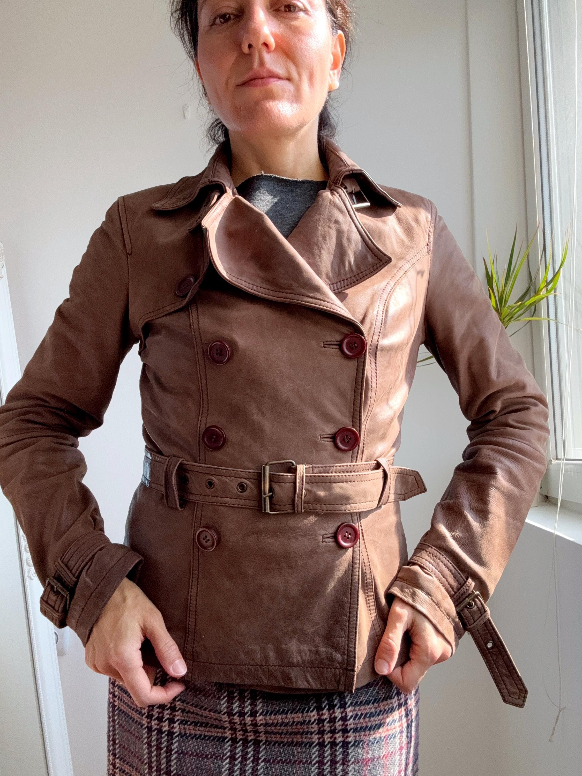 This stunning vintage Promod leather jacket is a statement of the 90s-meets-Y2K minimalism. Crafted from incredibly soft, genuine lamb leather in a rich taupe brown hue, it features a sophisticated button-down front and a tailored silhouette that effortlessly bridges the gap between a classic blazer and a short trench coat. The leather is supple and "buttery" to the touch, characteristic of high-quality lambskin. Whether paired with flared denim for a full retro look or thrown over a slip dress, this cropped leather coat is a timeless staple for any vintage collector.