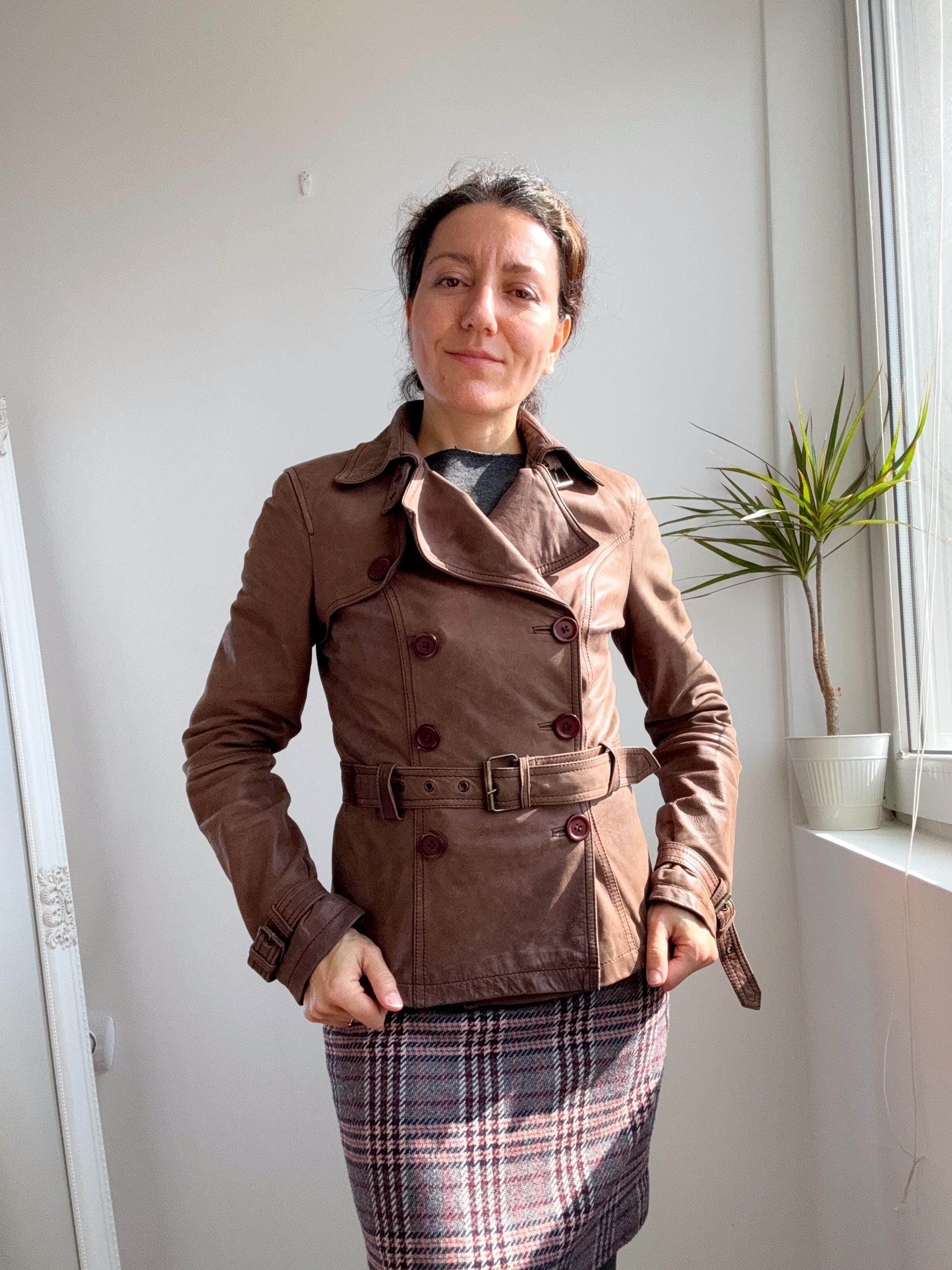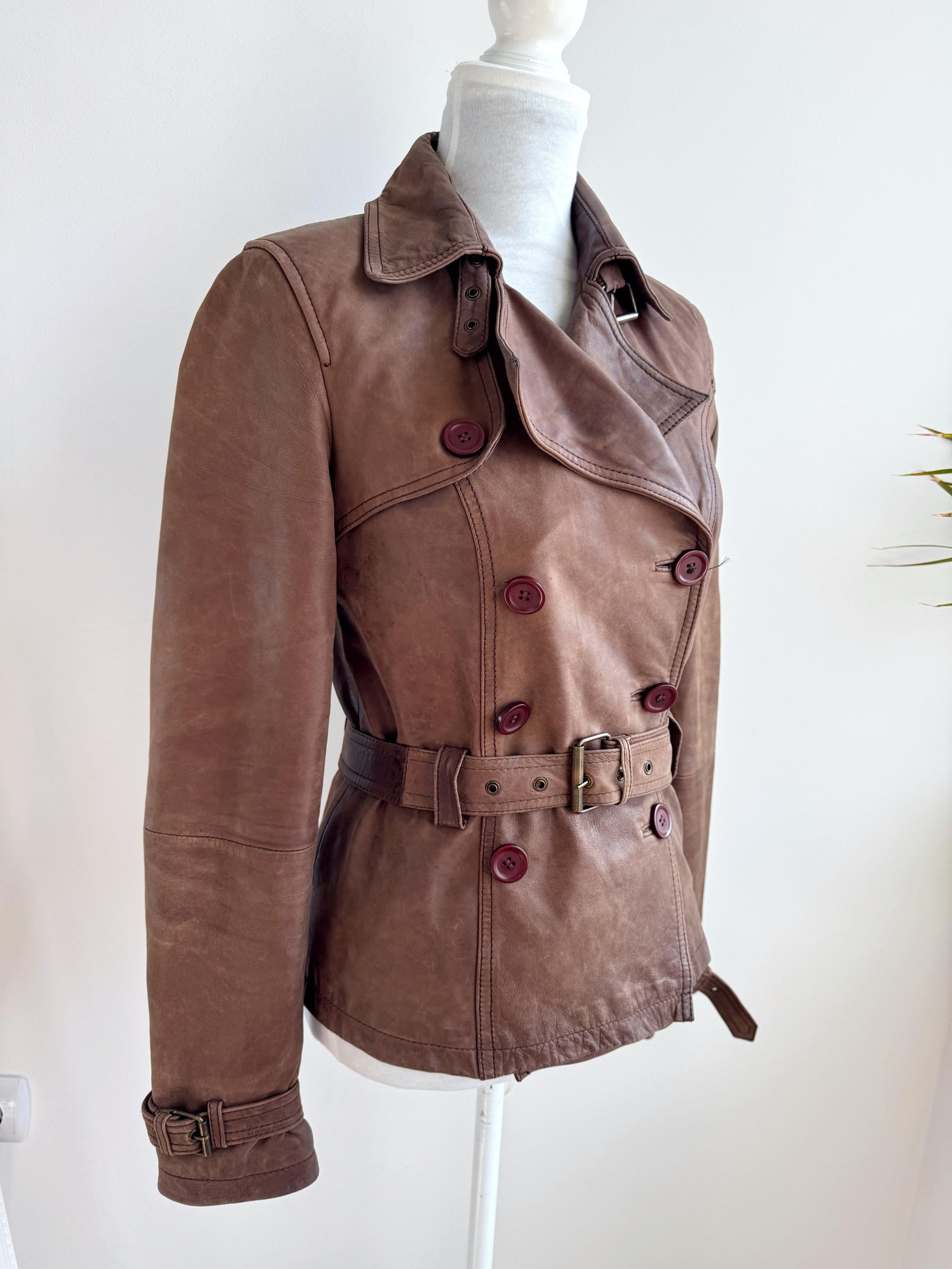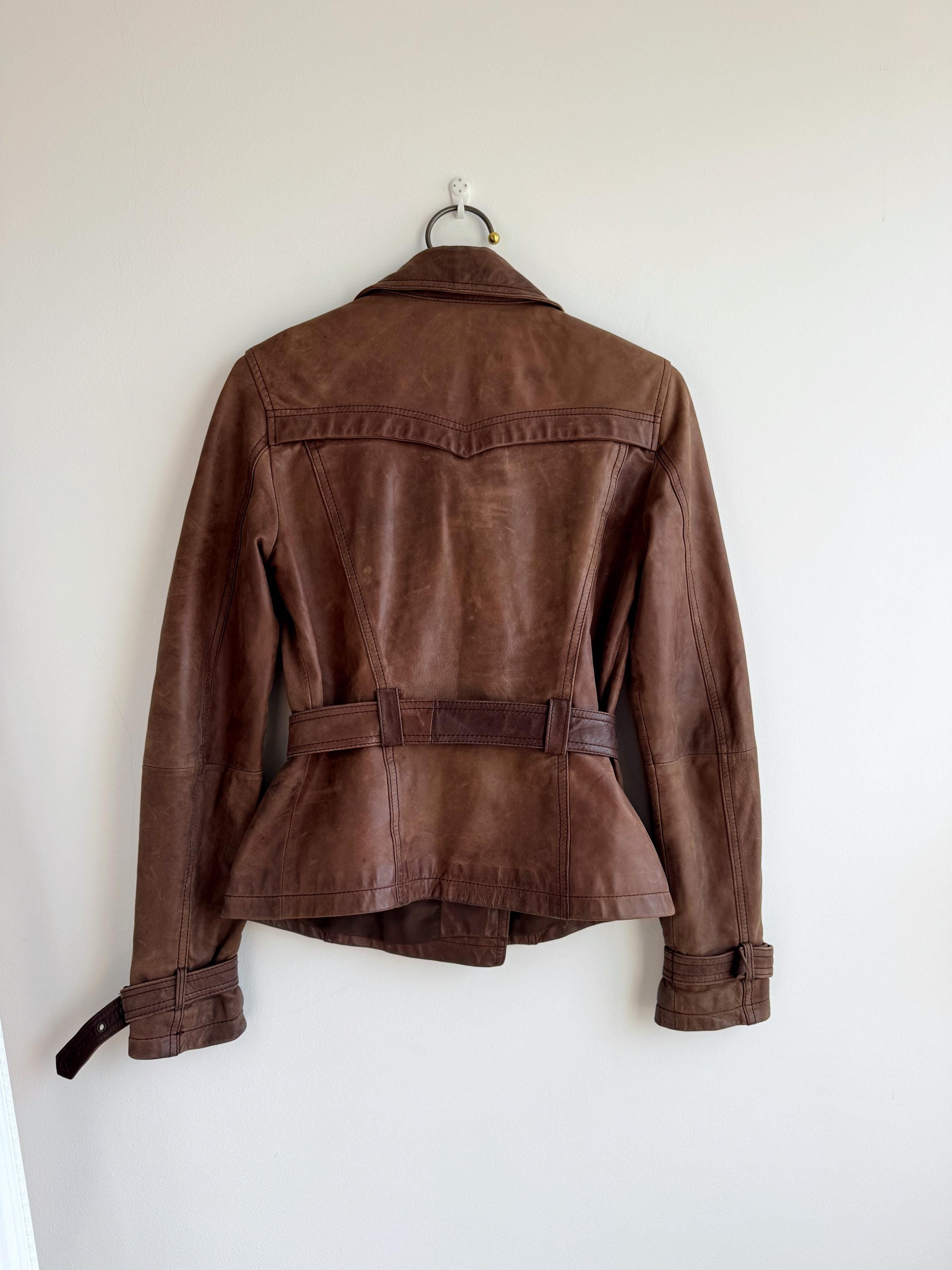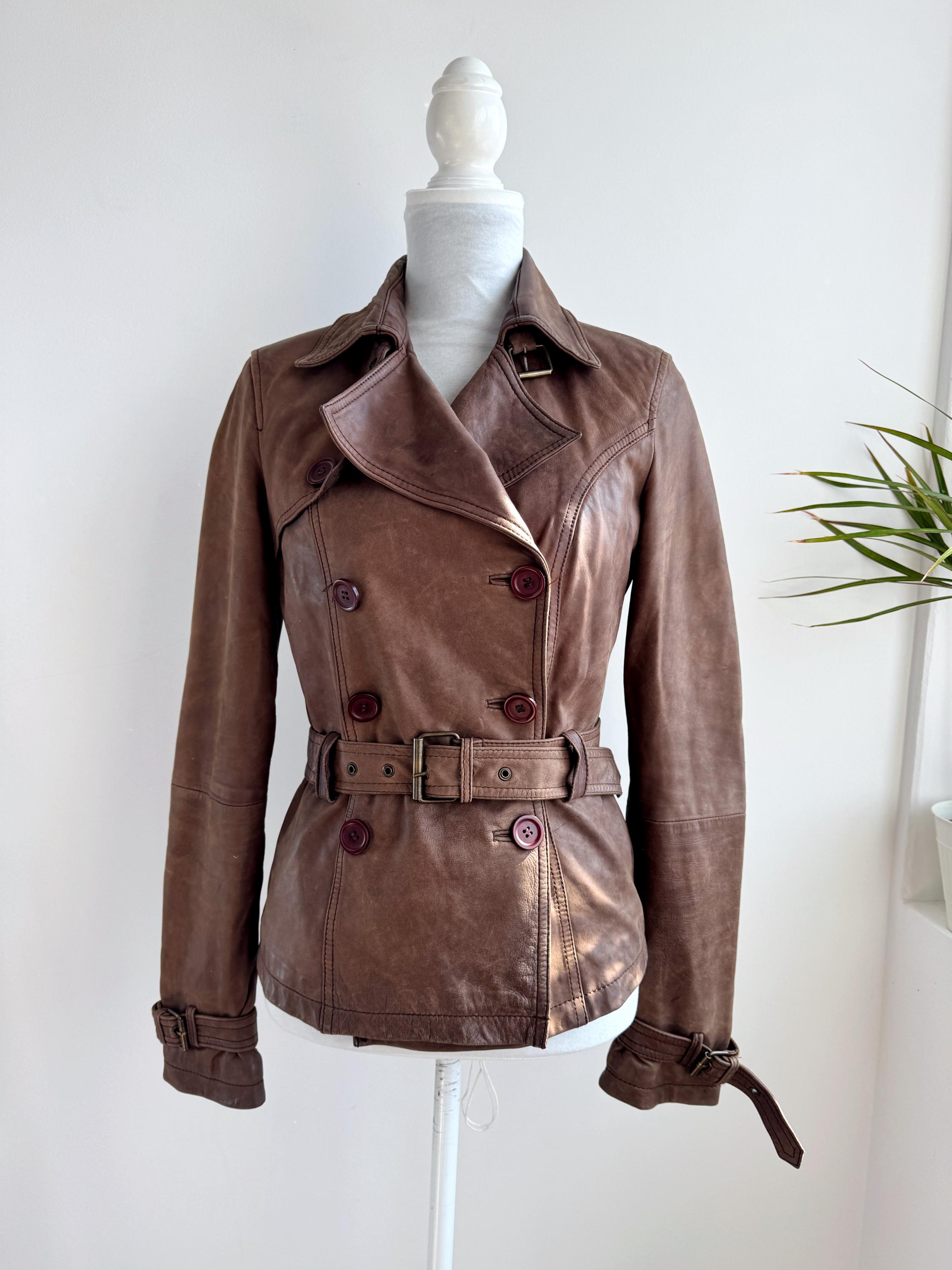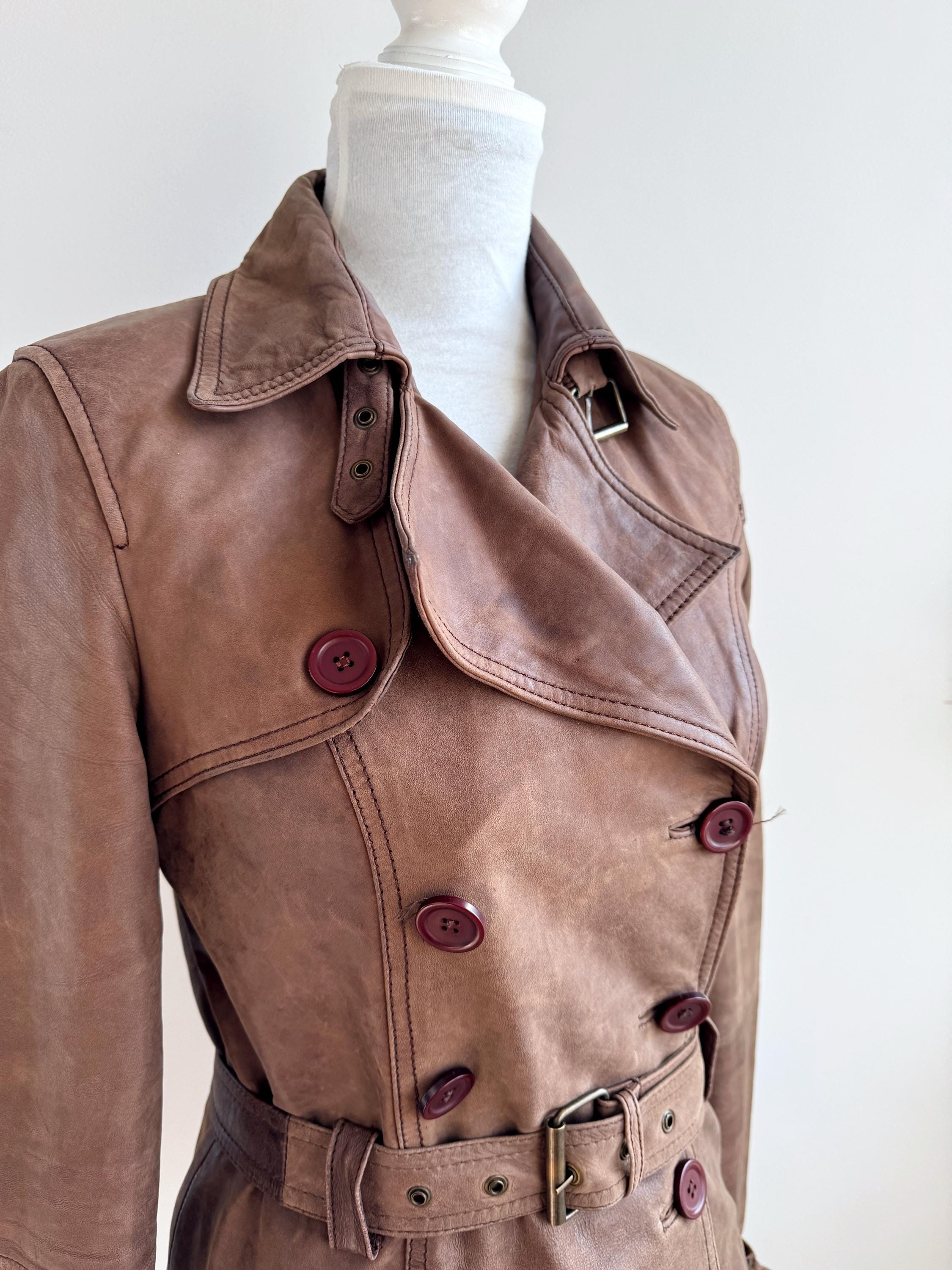 This stunning vintage Promod leather jacket is a statement of the 90s-meets-Y2K minimalism. Crafted from incredibly soft, genuine lamb leather in a rich taupe brown hue, it features a sophisticated button-down front and a tailored silhouette that effortlessly bridges the gap between a classic blazer and a short trench coat. The leather is supple and "buttery" to the touch, characteristic of high-quality lambskin. Whether paired with flared denim for a full retro look or thrown over a slip dress, this cropped leather coat is a timeless staple for any vintage collector.