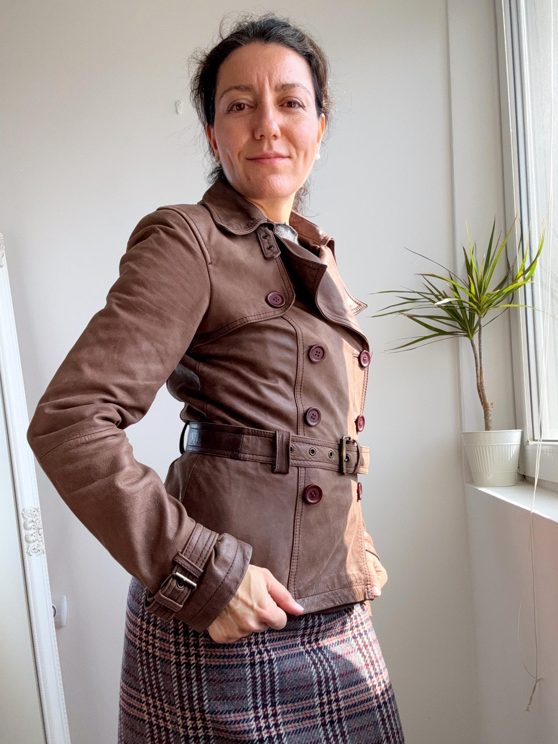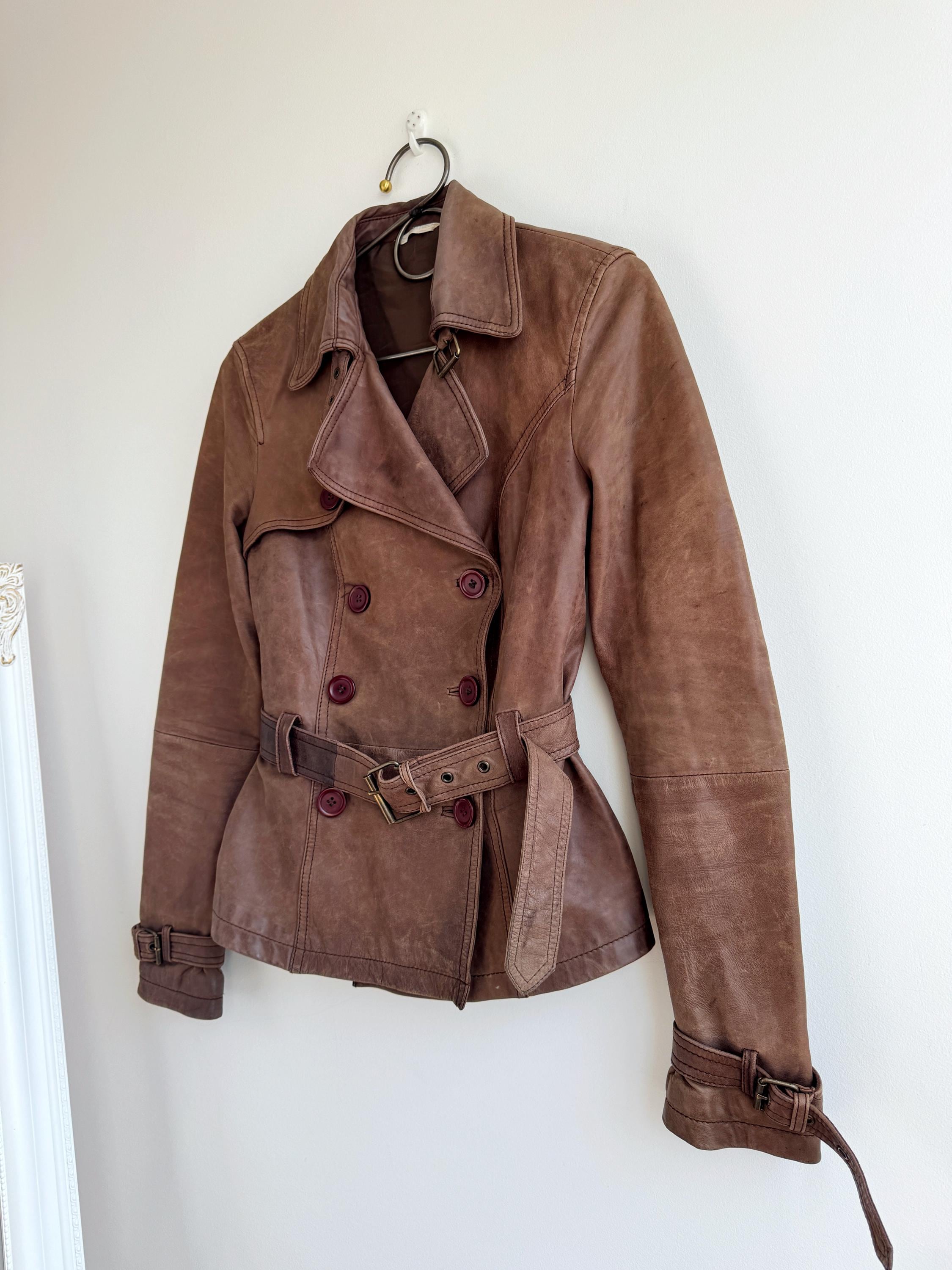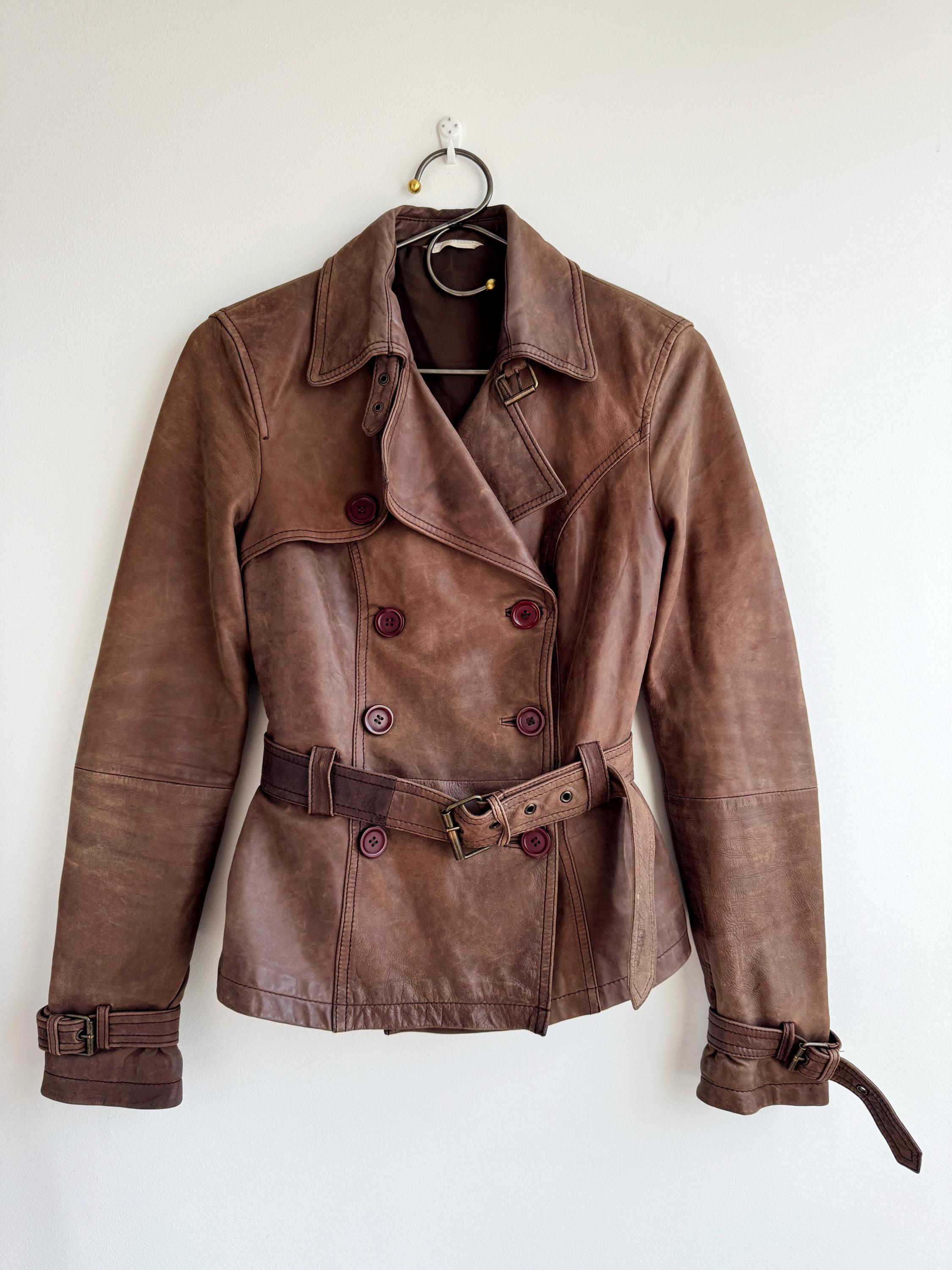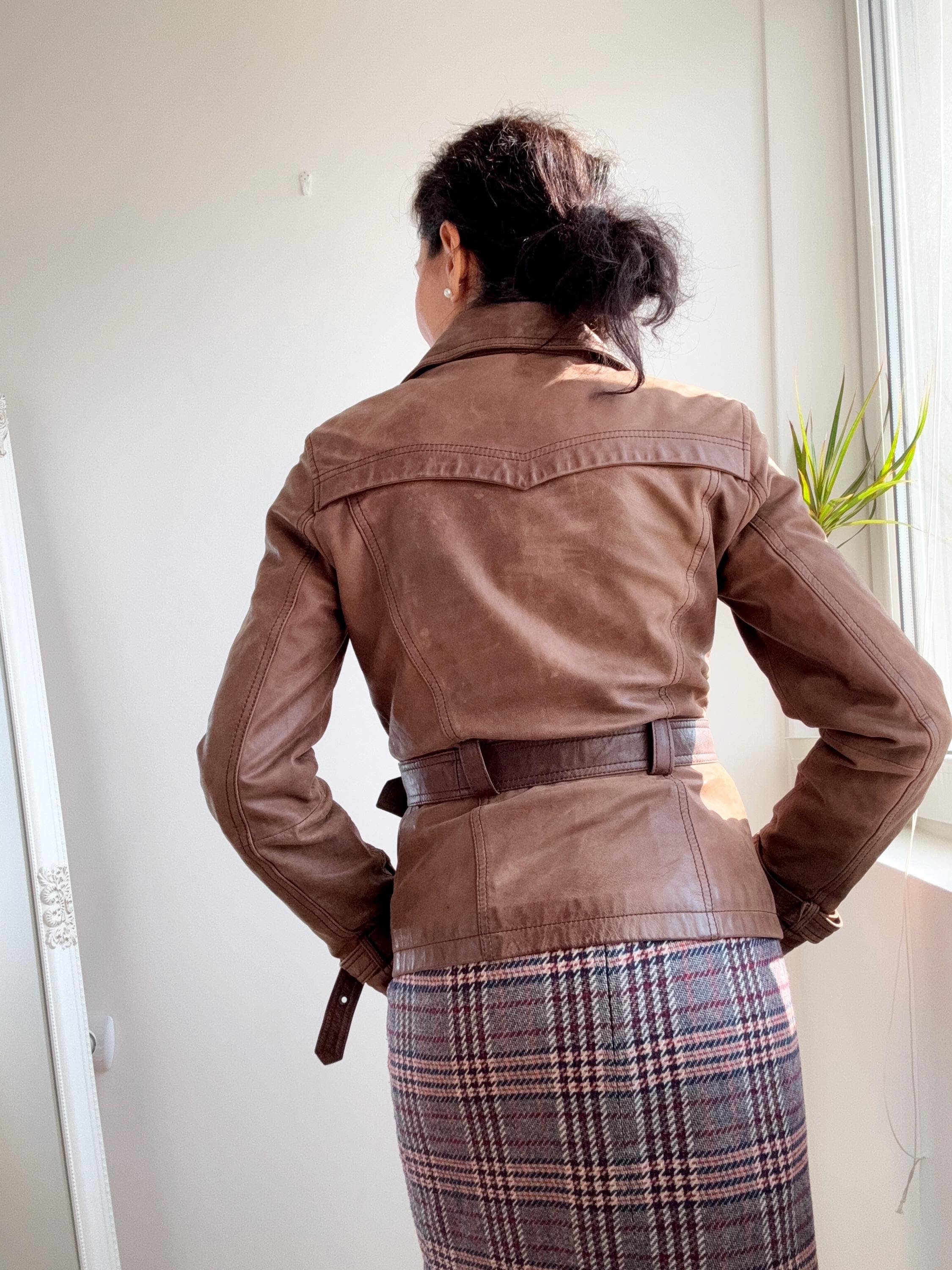 This stunning vintage Promod leather jacket is a statement of the 90s-meets-Y2K minimalism. Crafted from incredibly soft, genuine lamb leather in a rich taupe brown hue, it features a sophisticated button-down front and a tailored silhouette that effortlessly bridges the gap between a classic blazer and a short trench coat. The leather is supple and "buttery" to the touch, characteristic of high-quality lambskin. Whether paired with flared denim for a full retro look or thrown over a slip dress, this cropped leather coat is a timeless staple for any vintage collector.
