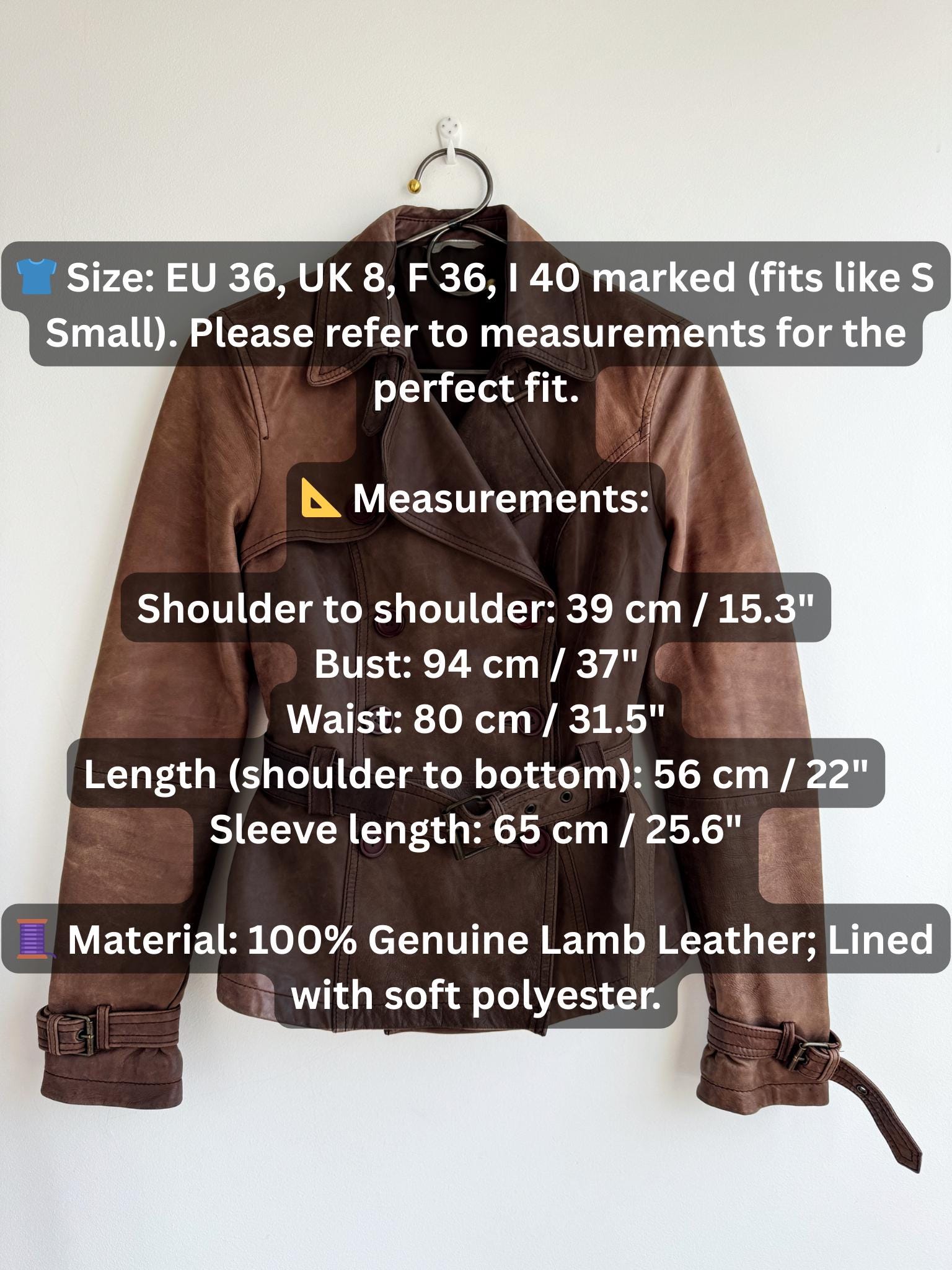 👕 Size: EU 36, UK 8, F 36, I 40 marked (fits like S Small). Please refer to measurements for the perfect fit. I am modelling the jacket, I am size S small and I normally wear clothing size S/ EUR 36 / US 6/ UK 10.