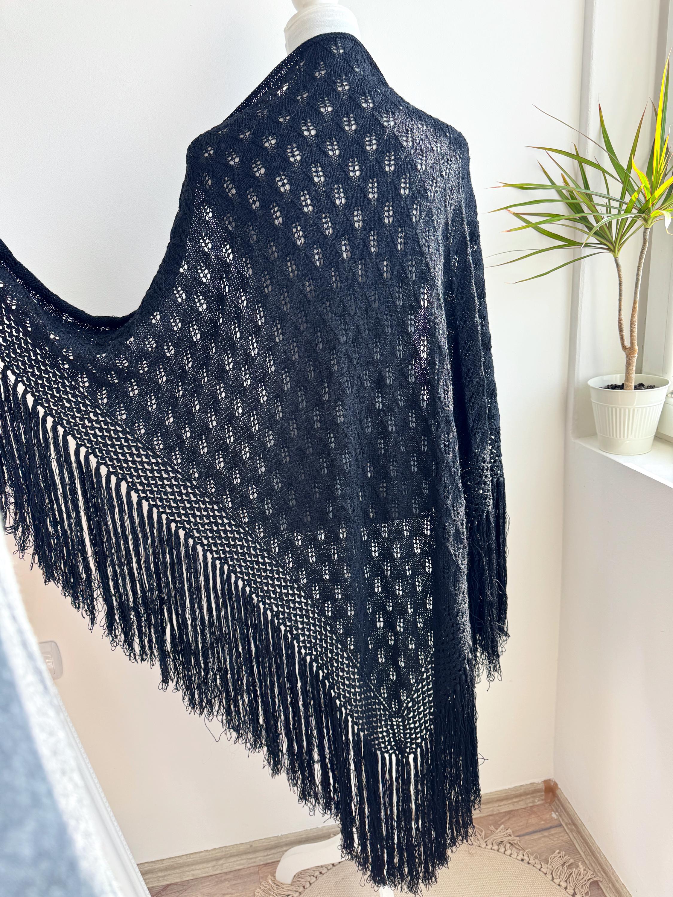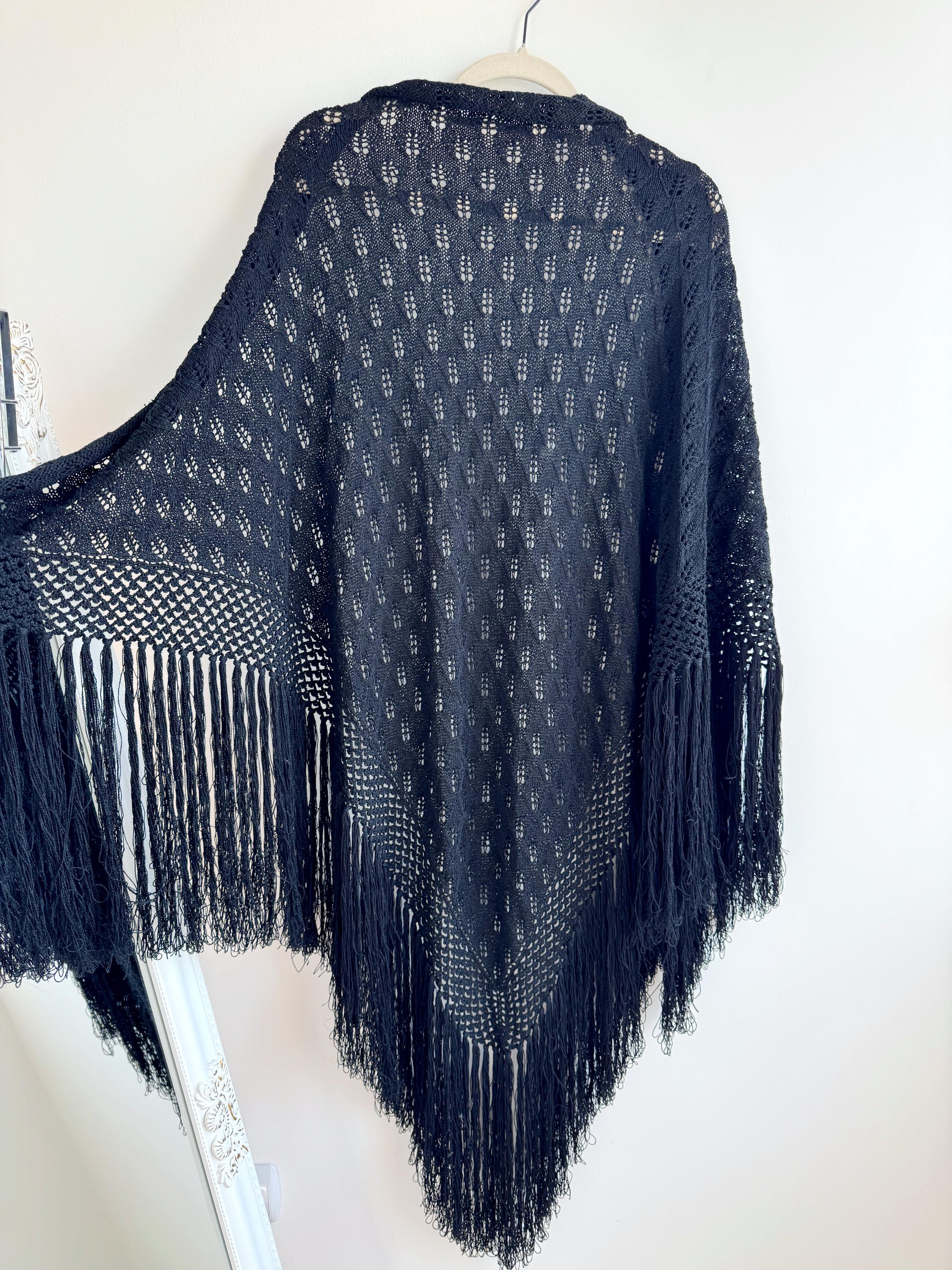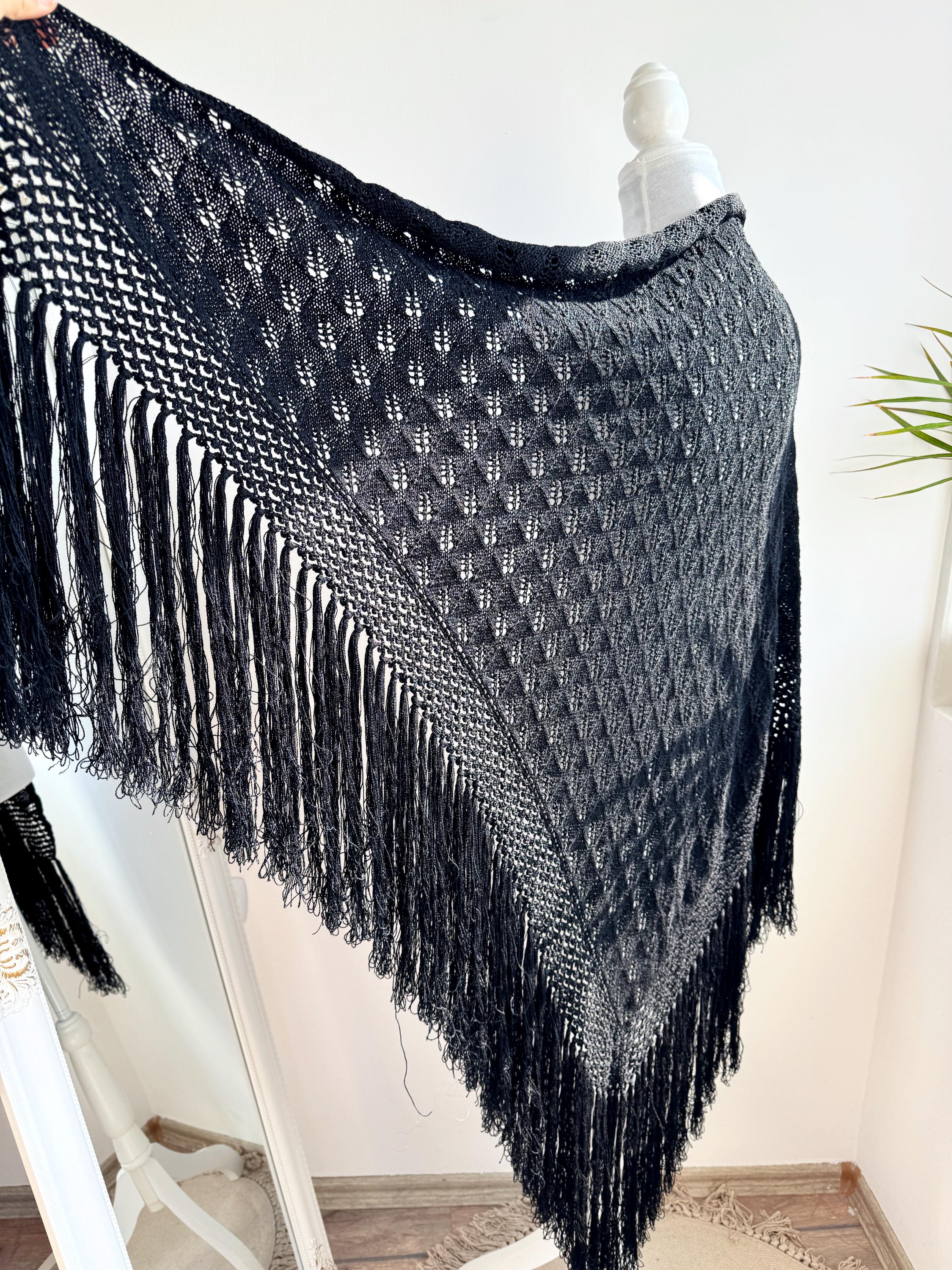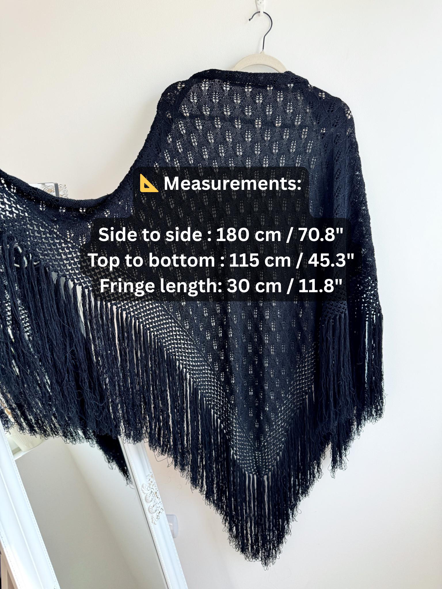 Add a touch of timeless drama to your wardrobe with this exquisite vintage black knitted shawl with leaf pattern and extra long fringe. Hand-crafted with an intricate open-weave pattern, this triangular wrap features spectacular 30 cm (11.8") fringe that creates beautiful movement with every step.