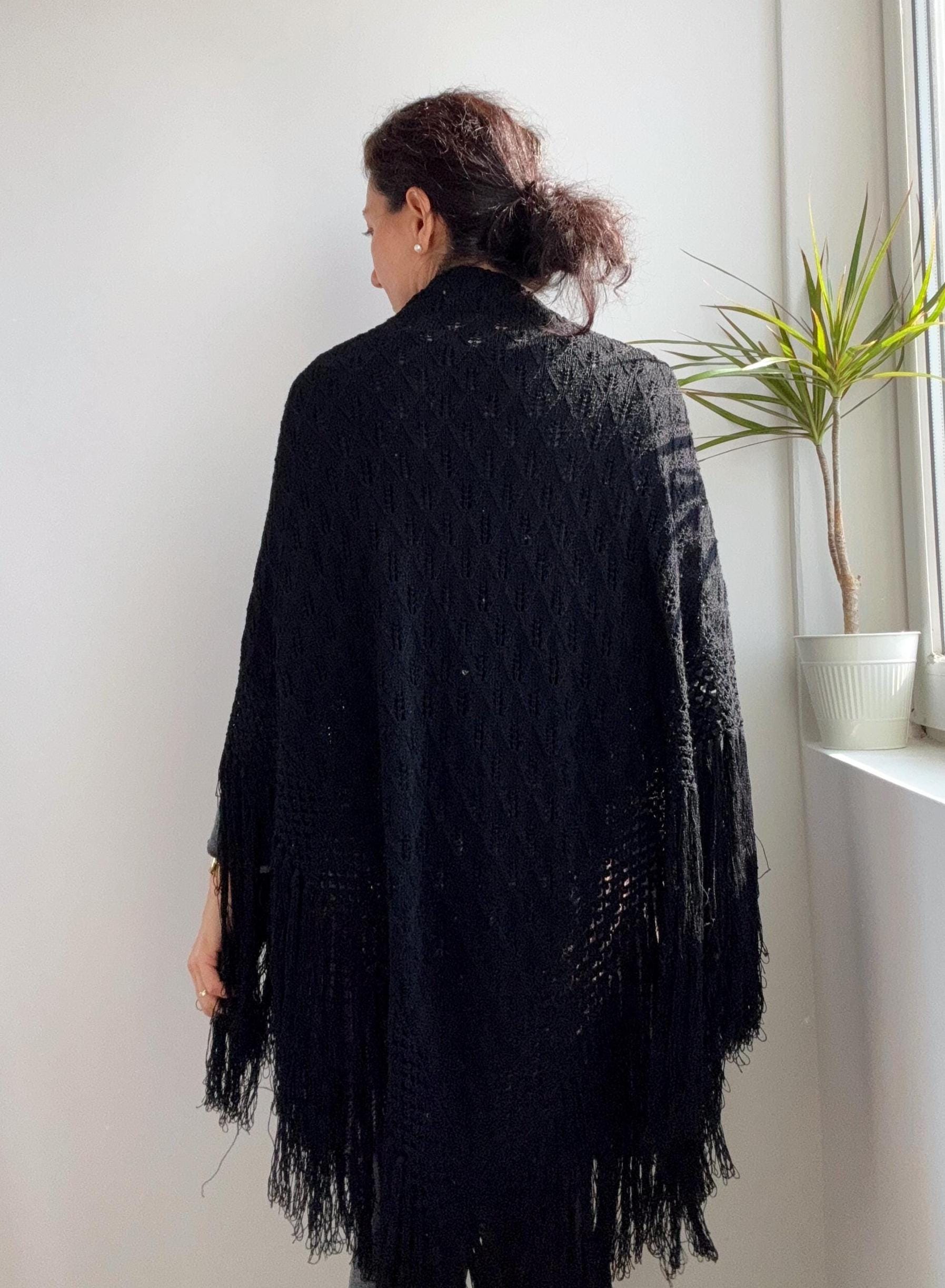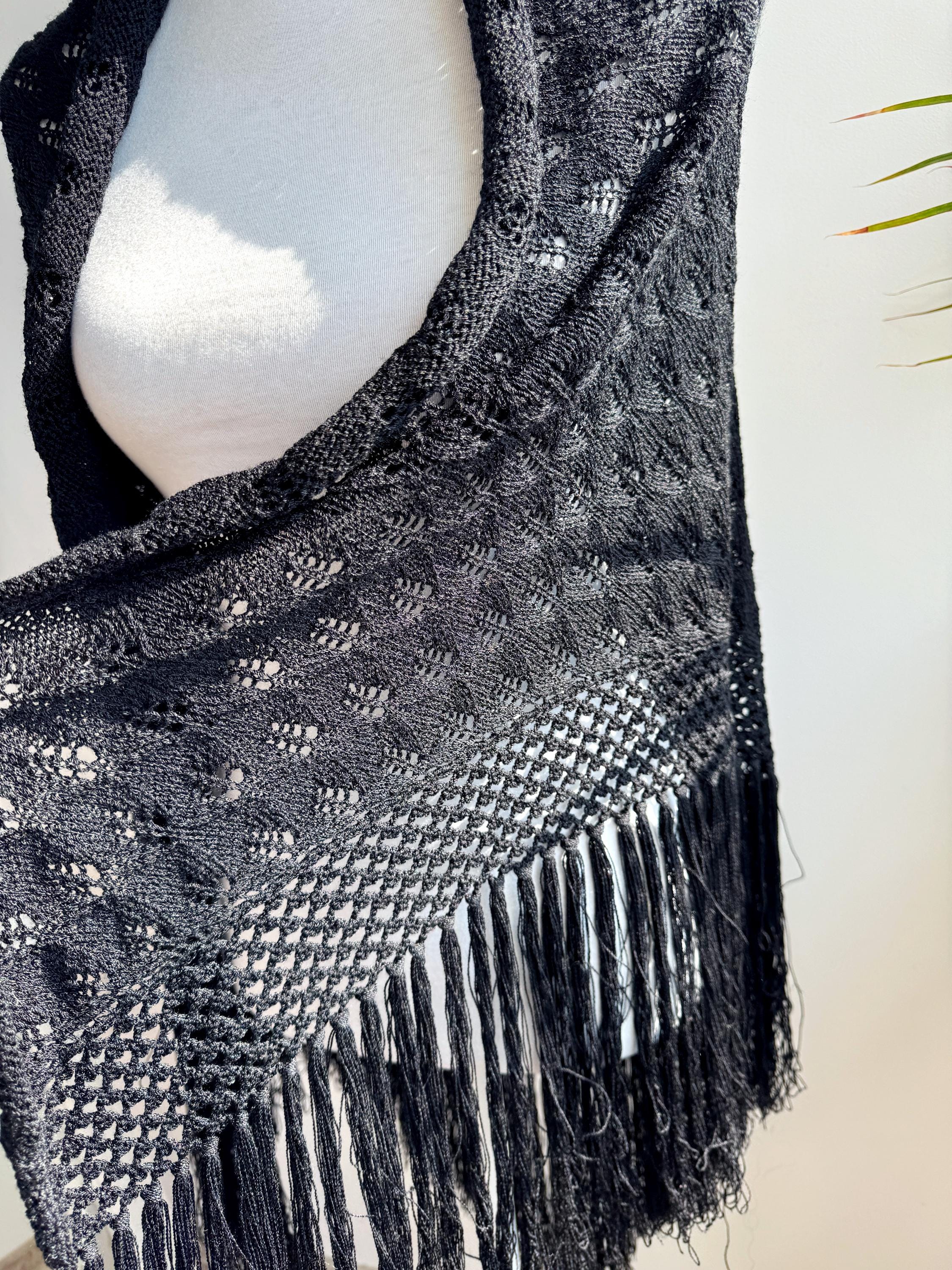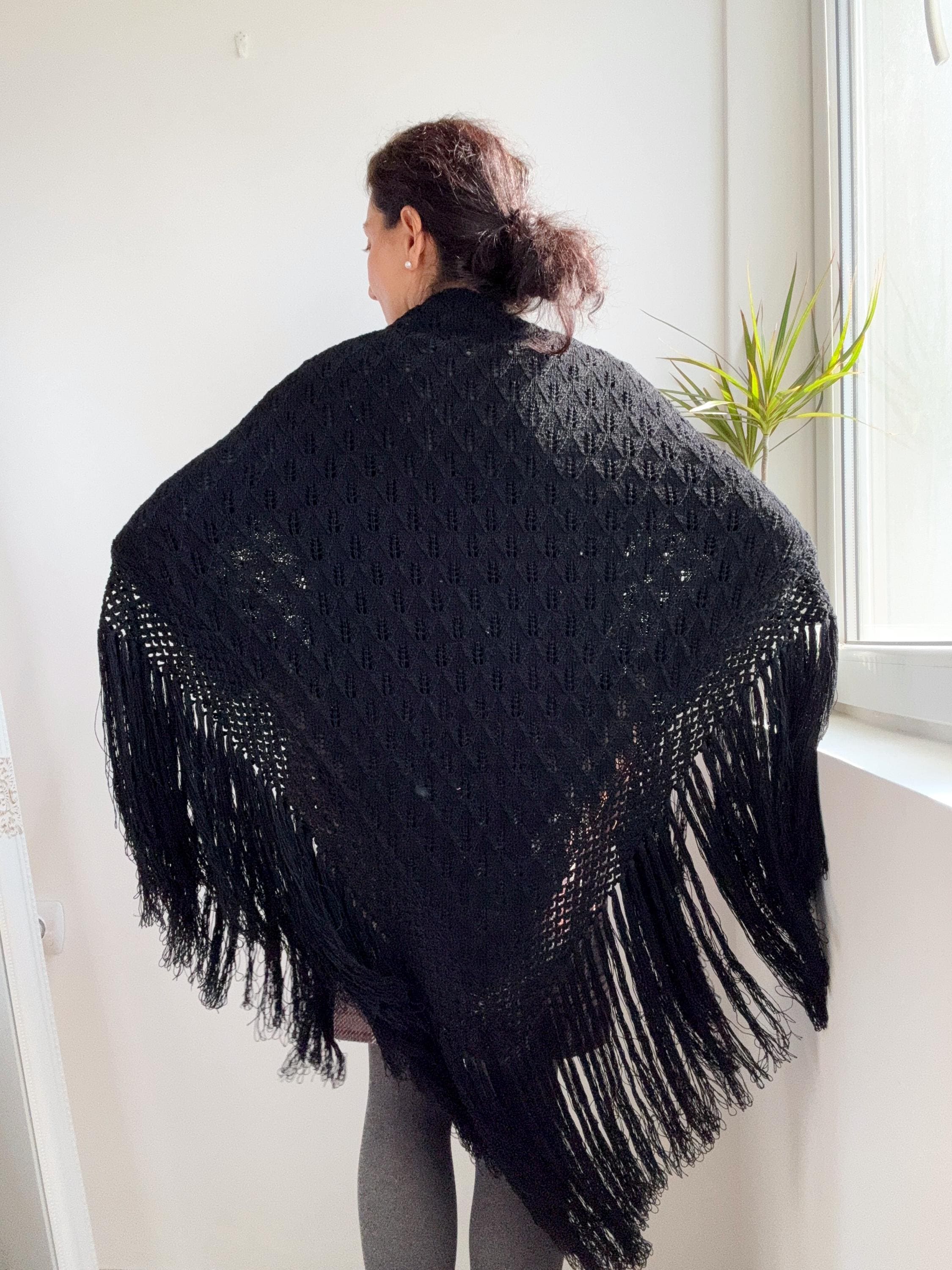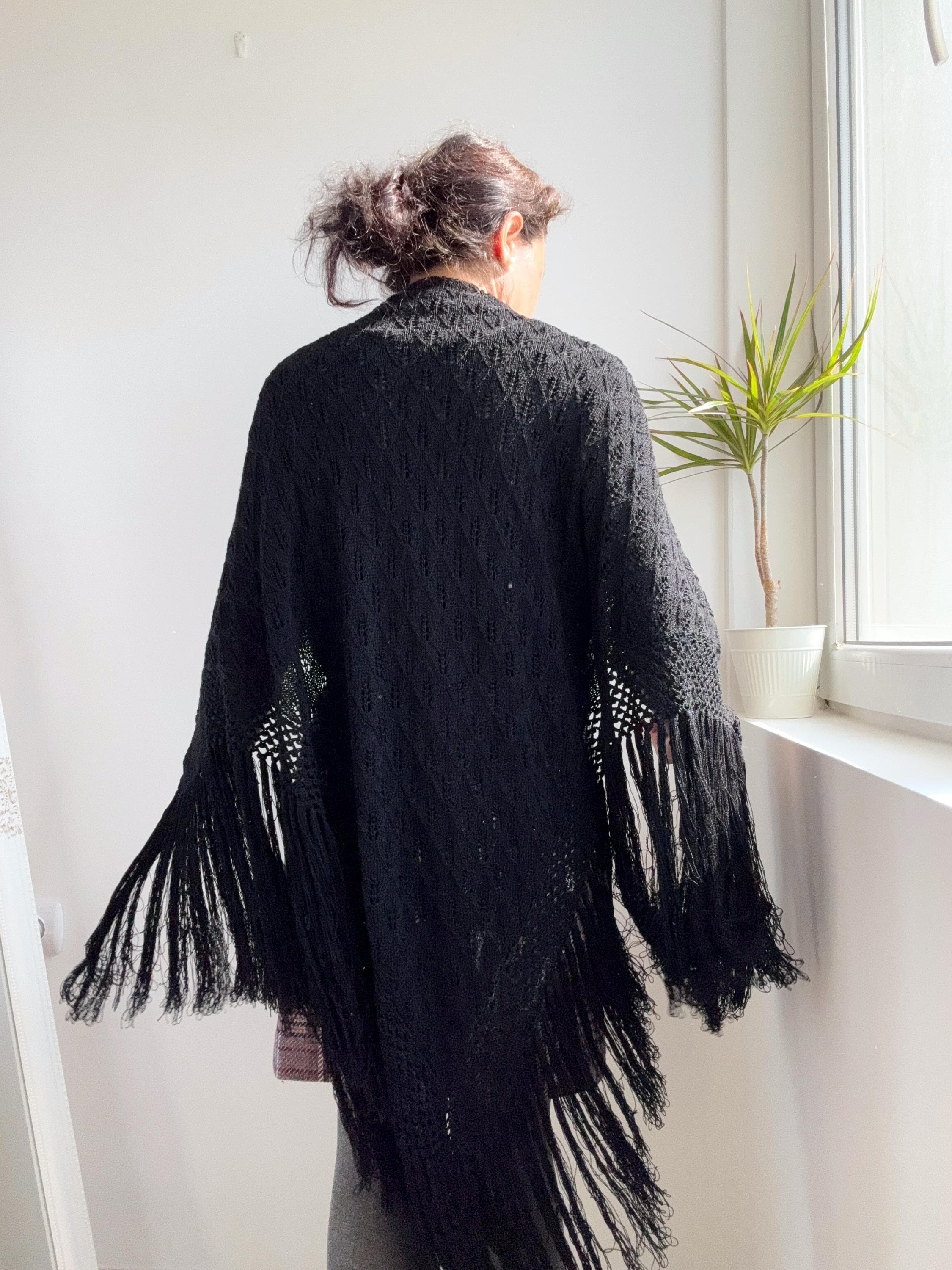 Add a touch of timeless drama to your wardrobe with this exquisite vintage black knitted shawl with leaf pattern and extra long fringe. Hand-crafted with an intricate open-weave pattern, this triangular wrap features spectacular 30 cm (11.8") fringe that creates beautiful movement with every step.