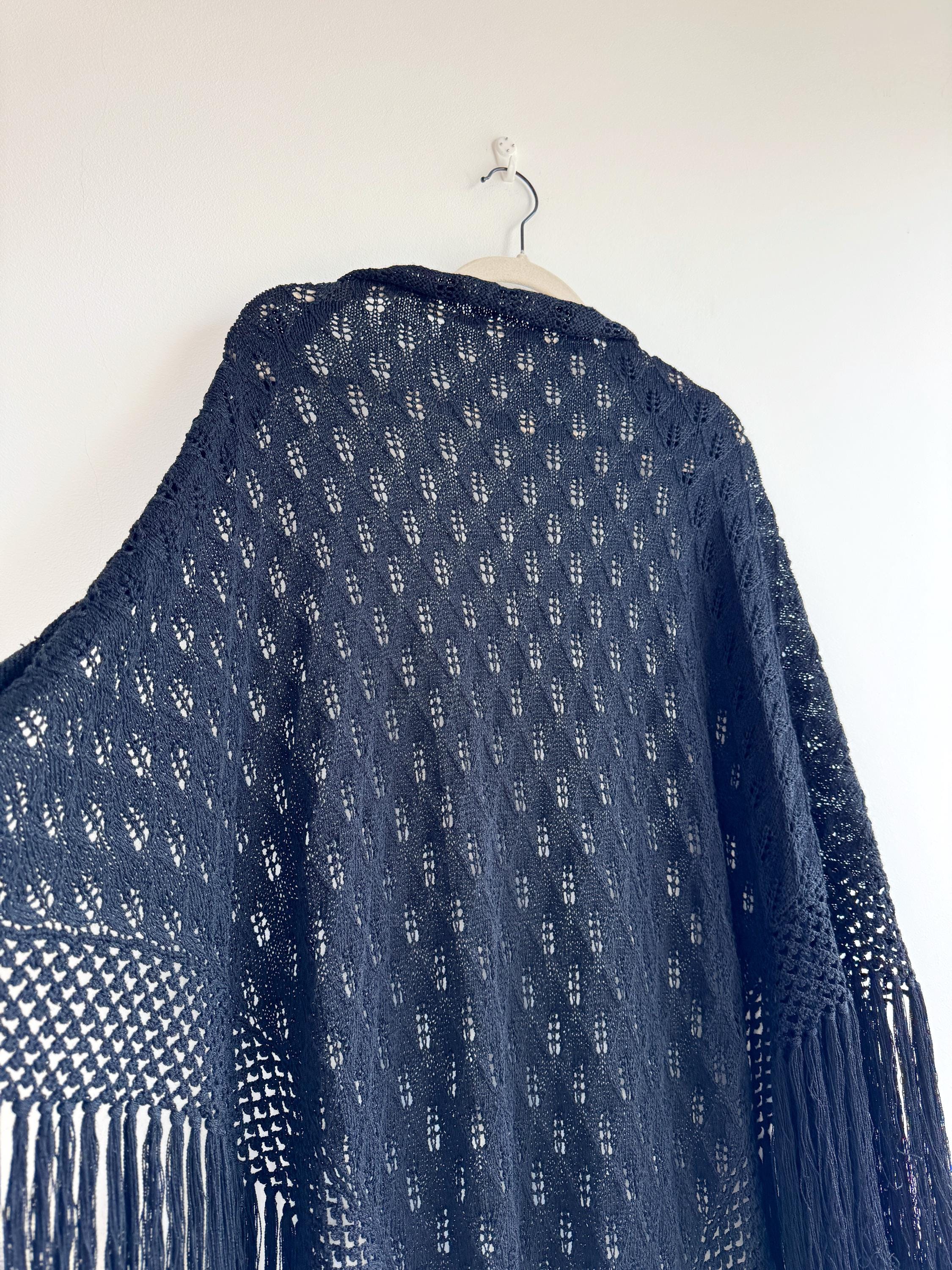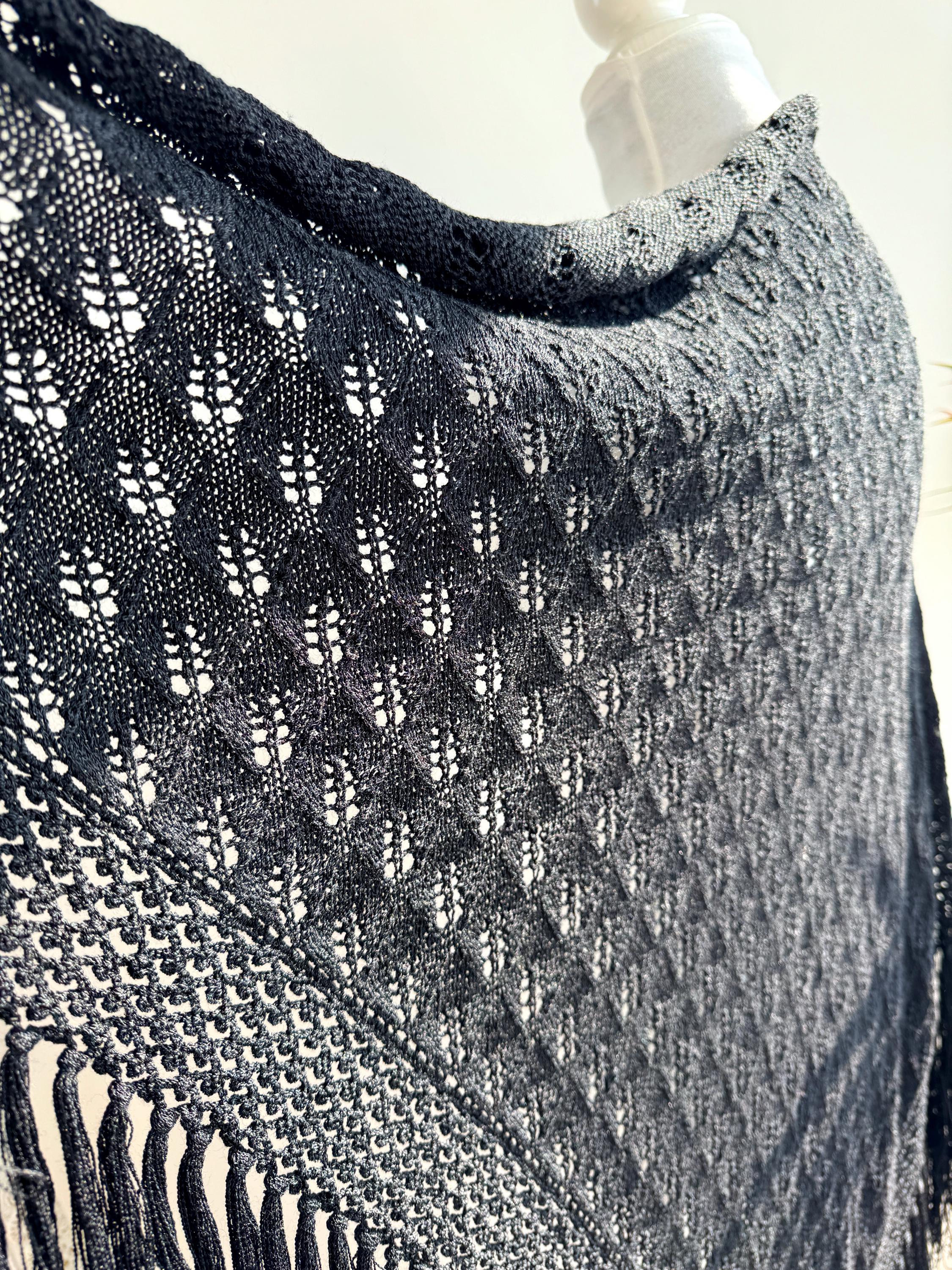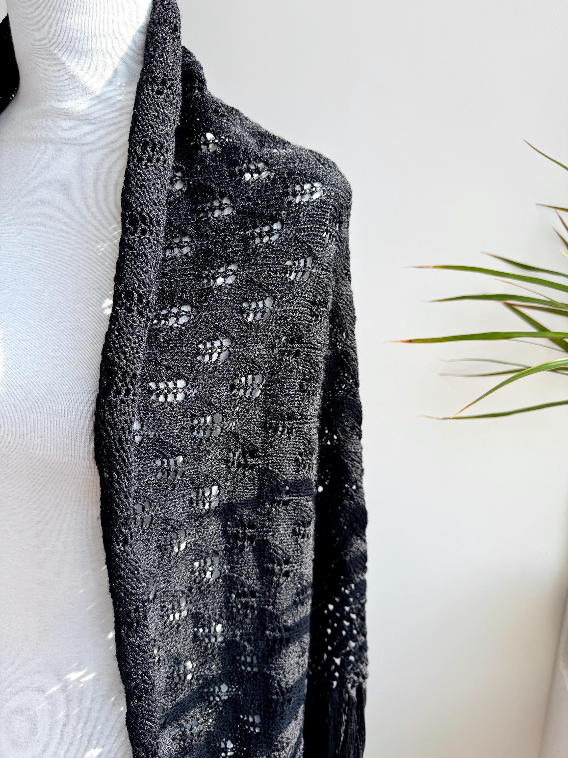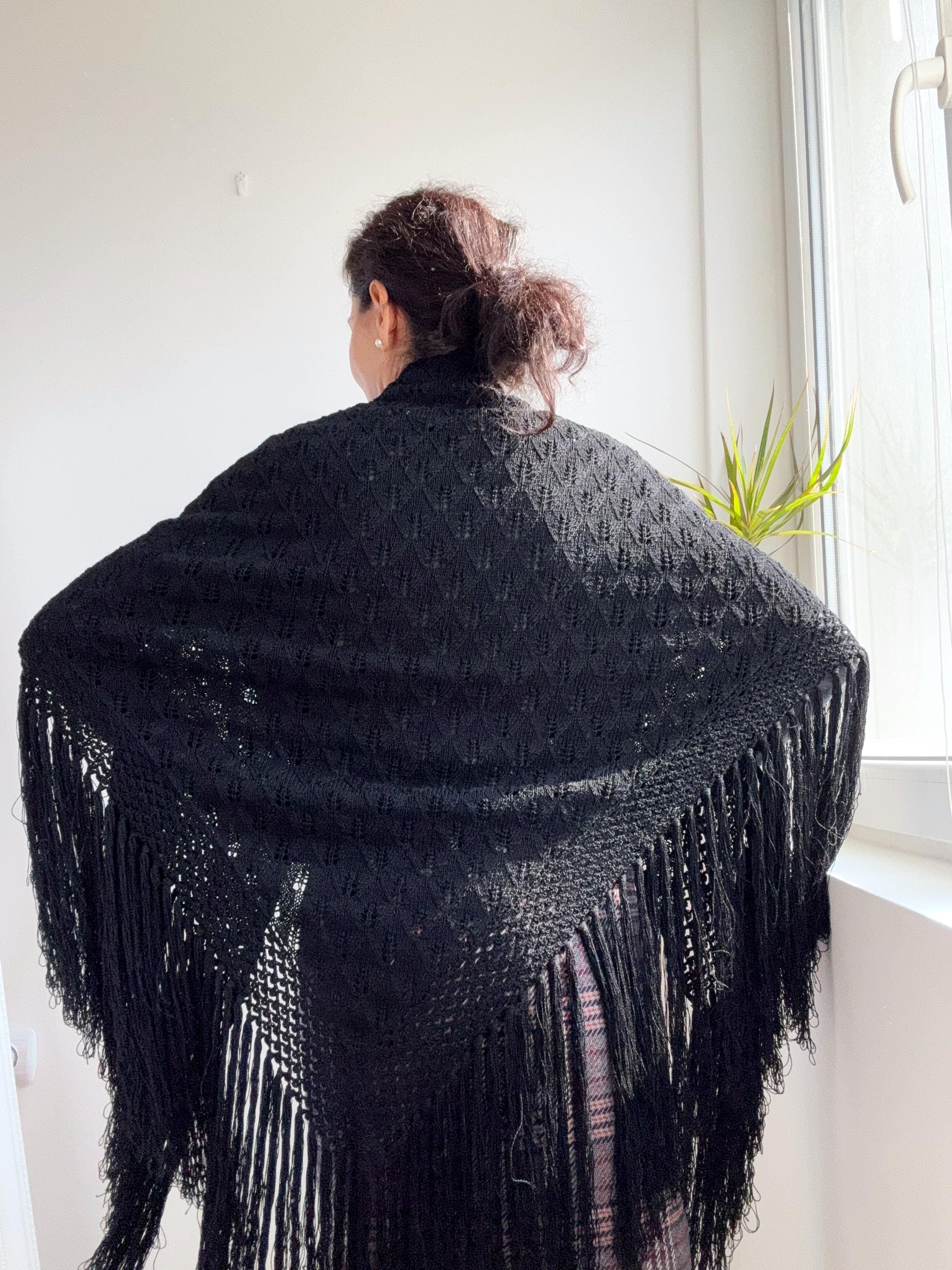 Add a touch of timeless drama to your wardrobe with this exquisite vintage black knitted shawl with leaf pattern and extra long fringe. Hand-crafted with an intricate open-weave pattern, this triangular wrap features spectacular 30 cm (11.8") fringe that creates beautiful movement with every step.