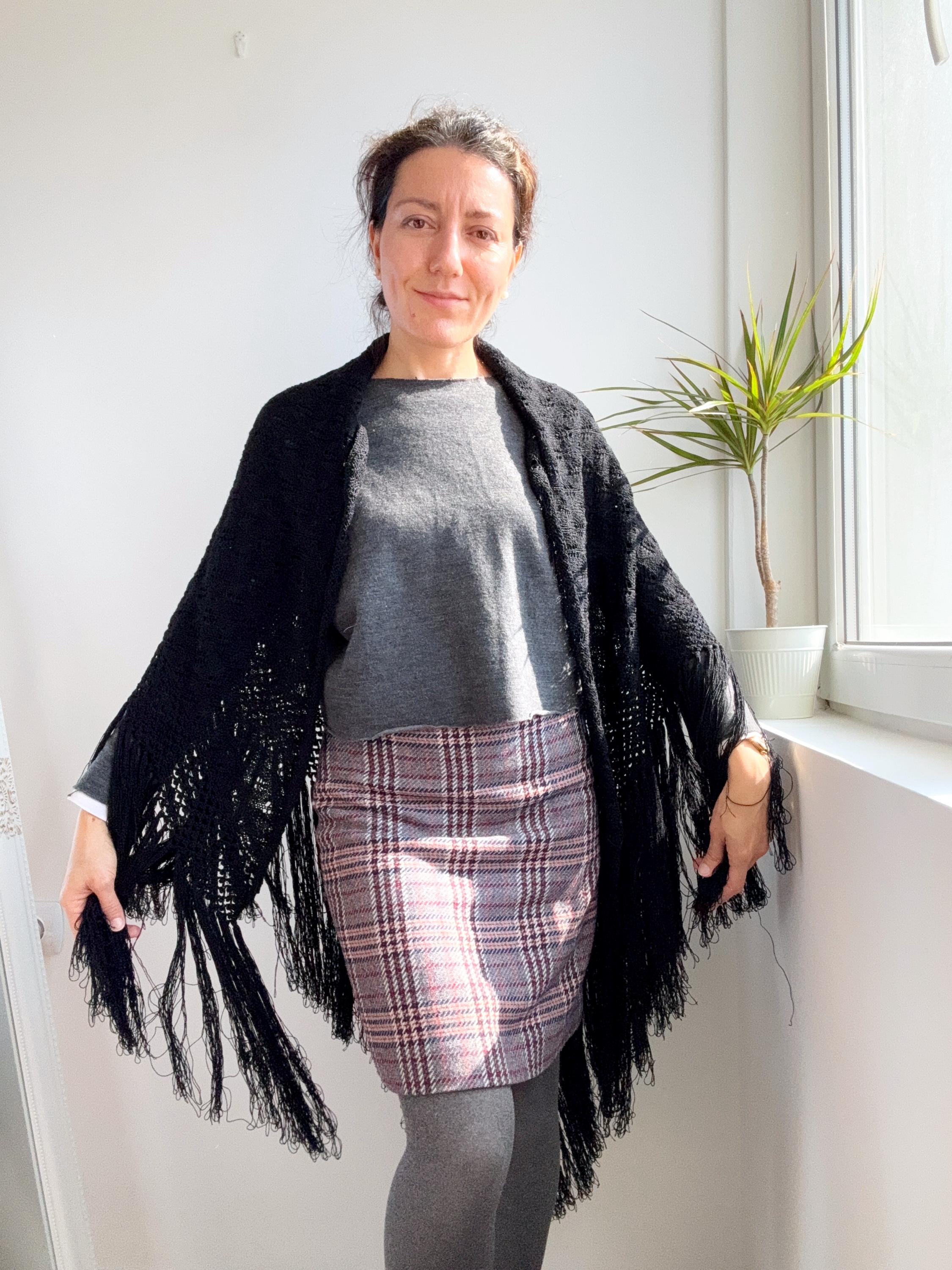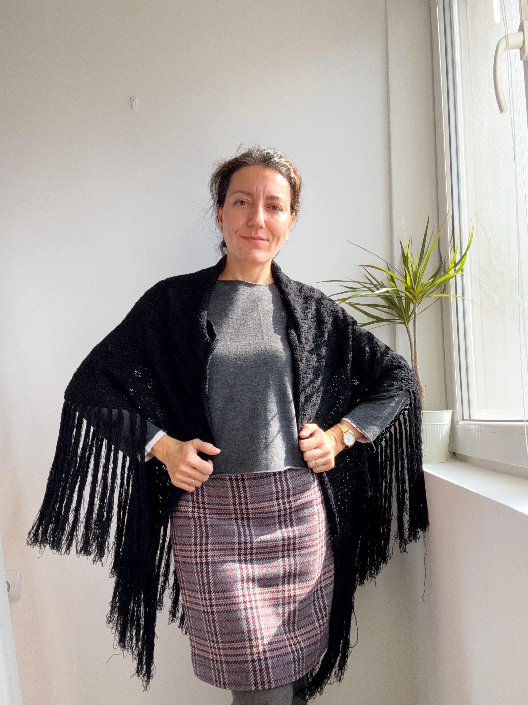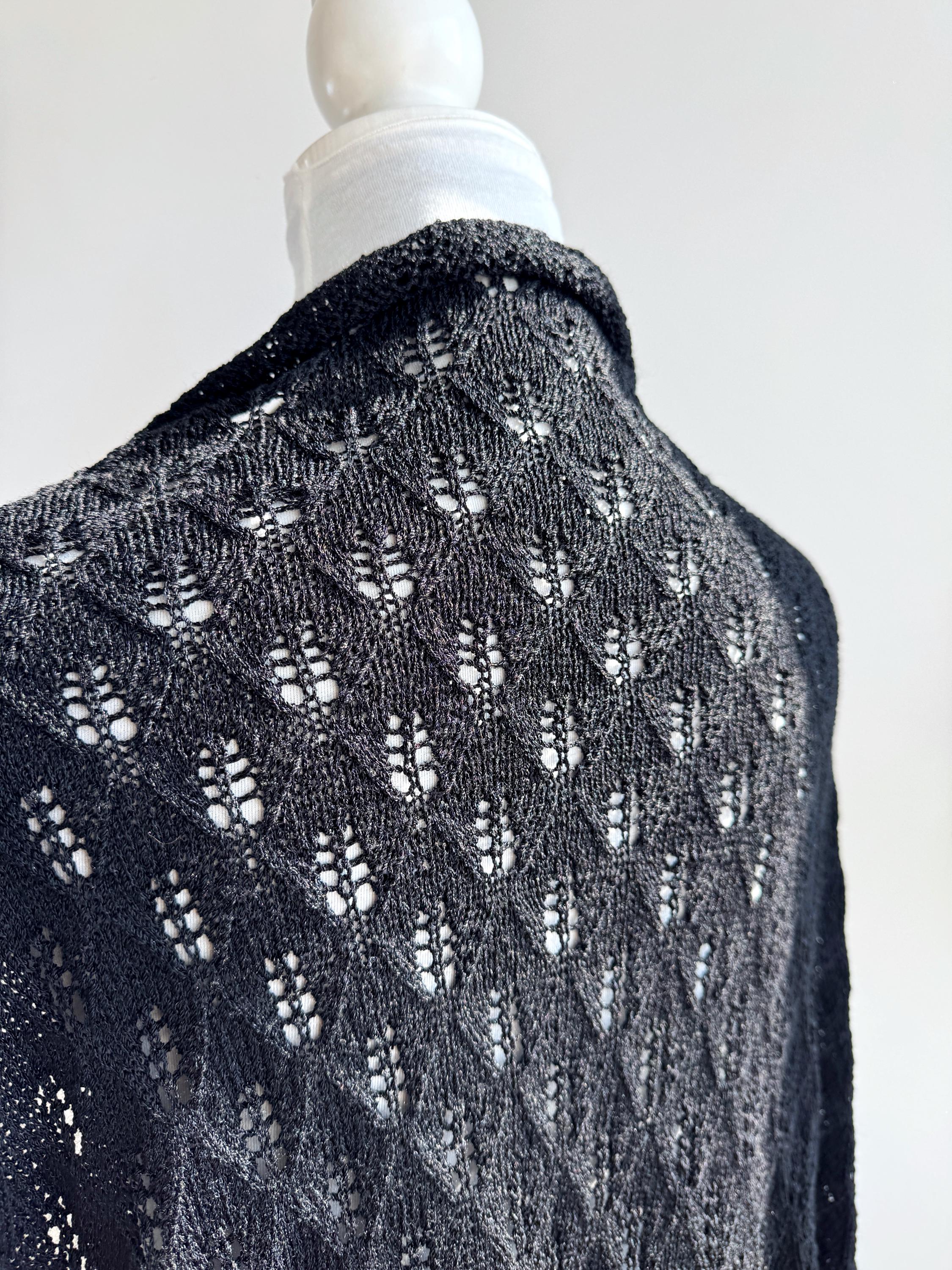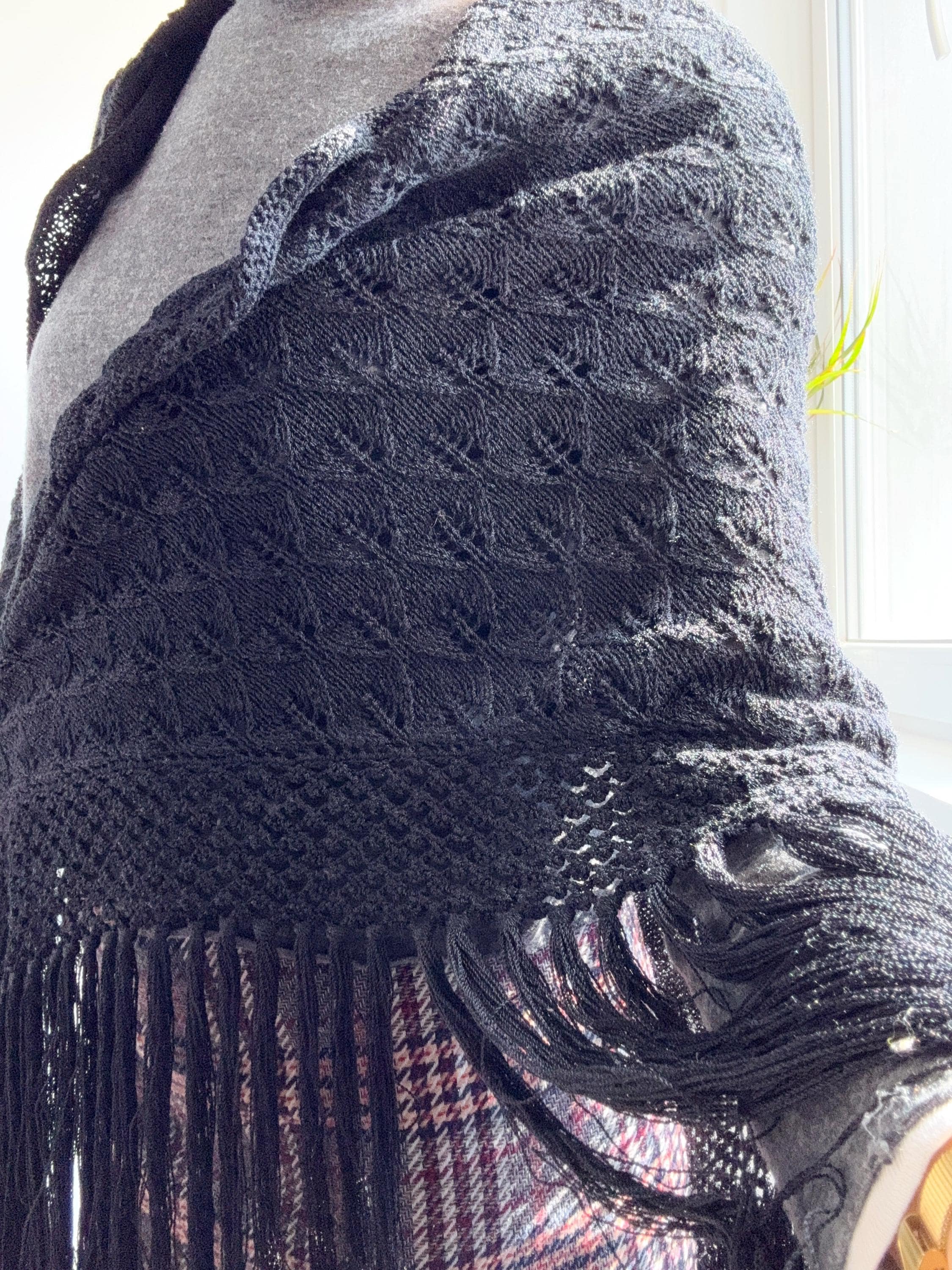 Add a touch of timeless drama to your wardrobe with this exquisite vintage black knitted shawl with leaf pattern and extra long fringe. Hand-crafted with an intricate open-weave pattern, this triangular wrap features spectacular 30 cm (11.8") fringe that creates beautiful movement with every step.