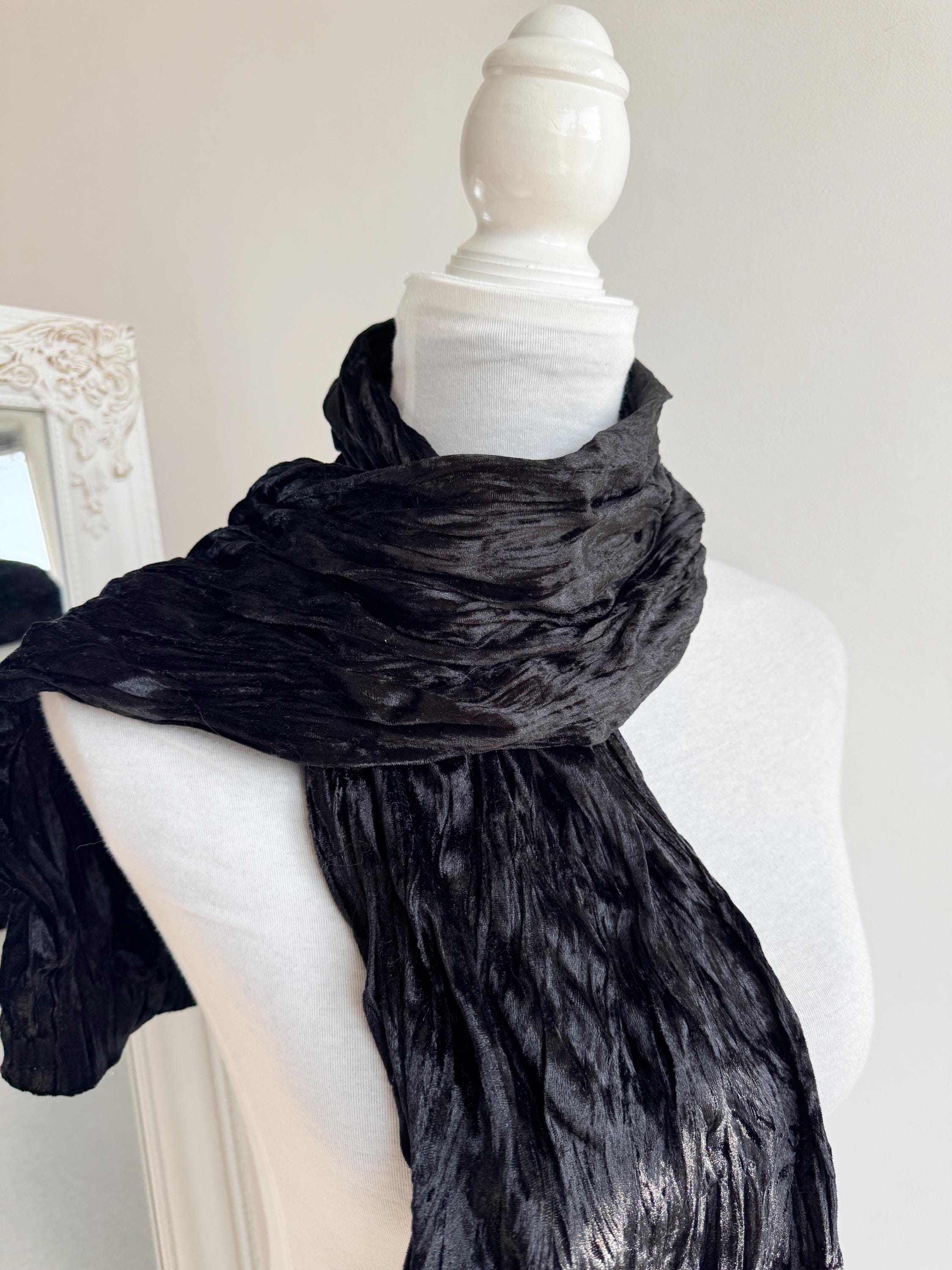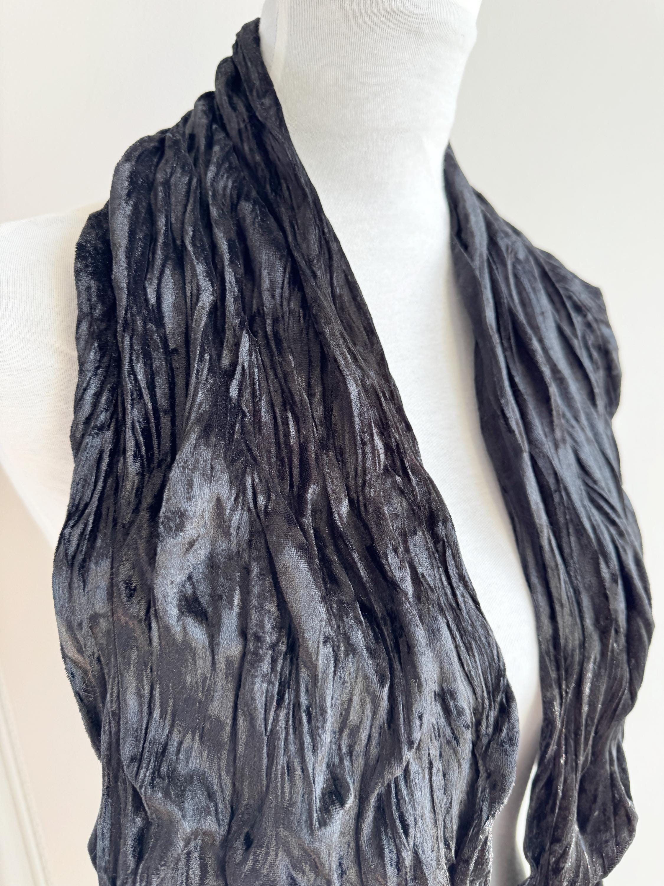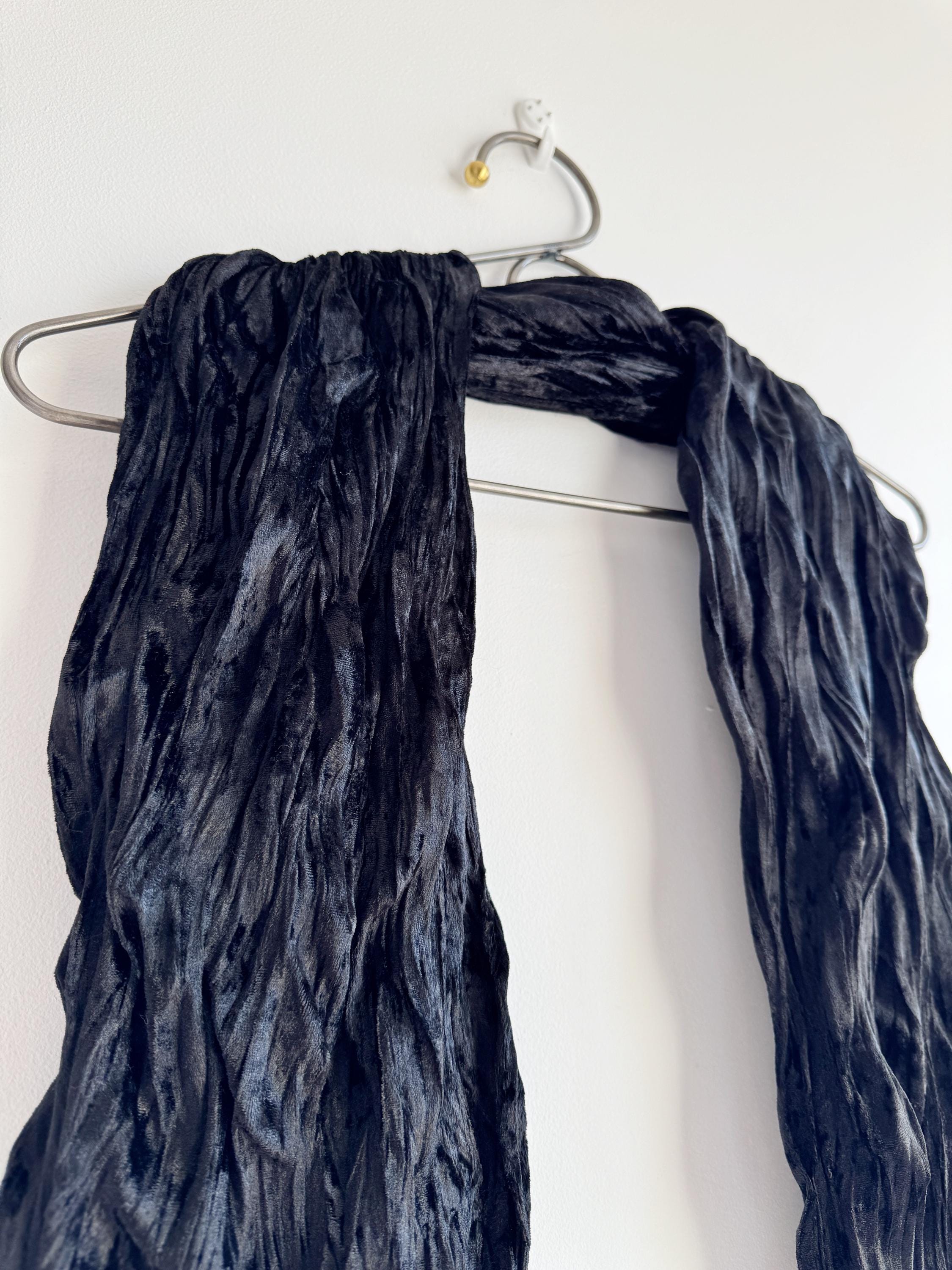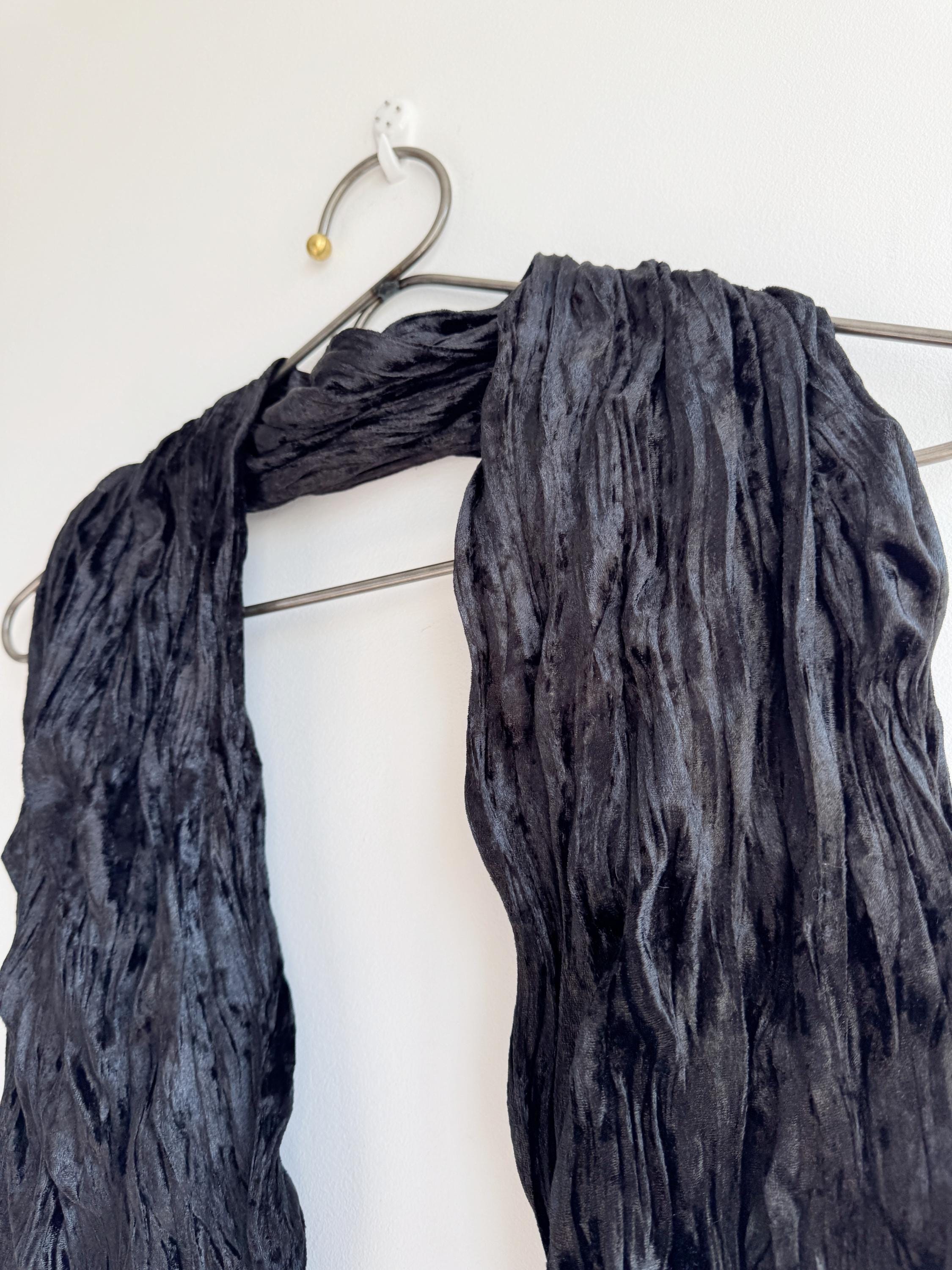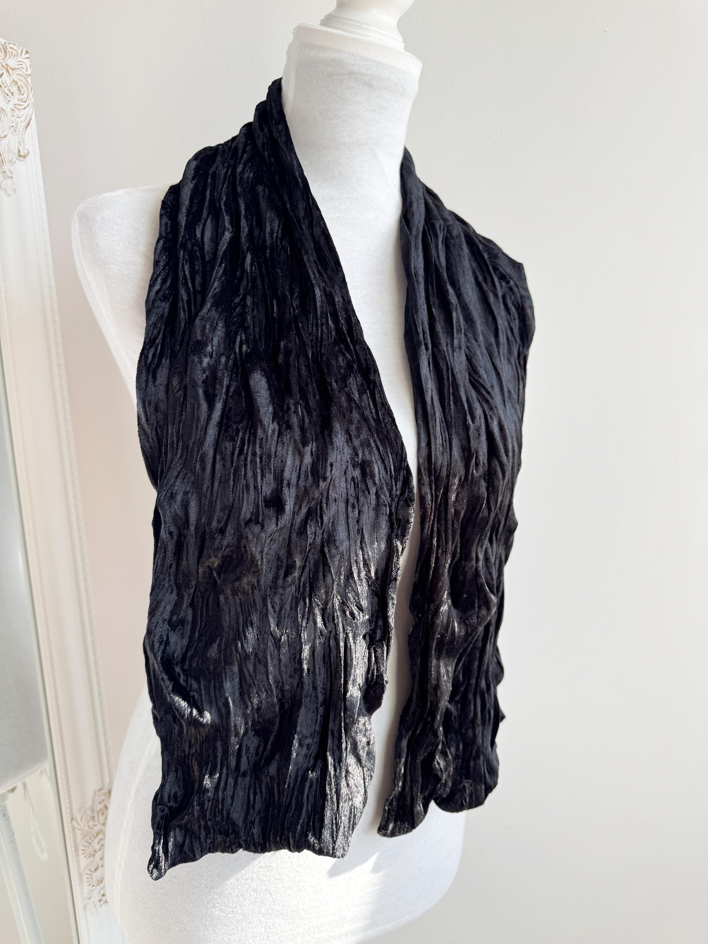 This is a stunning vintage black crinkle velvet scarf made of tectured intentionally wrinkled soft velvet fabric. This double sided velvet wrap is identical on both sides. This art deco evening wrap features a unique, heavily textured crinkle effect that catches the light beautifully, giving off a subtle metallic-like shimmer. Its long, skinny silhouette makes it incredibly versatile—drape it loosely over your shoulders for a dramatic evening look, wrap it snugly for a cozy-yet-glamorous winter accent, or tie it in a classic knot to add texture to a simple outfit.