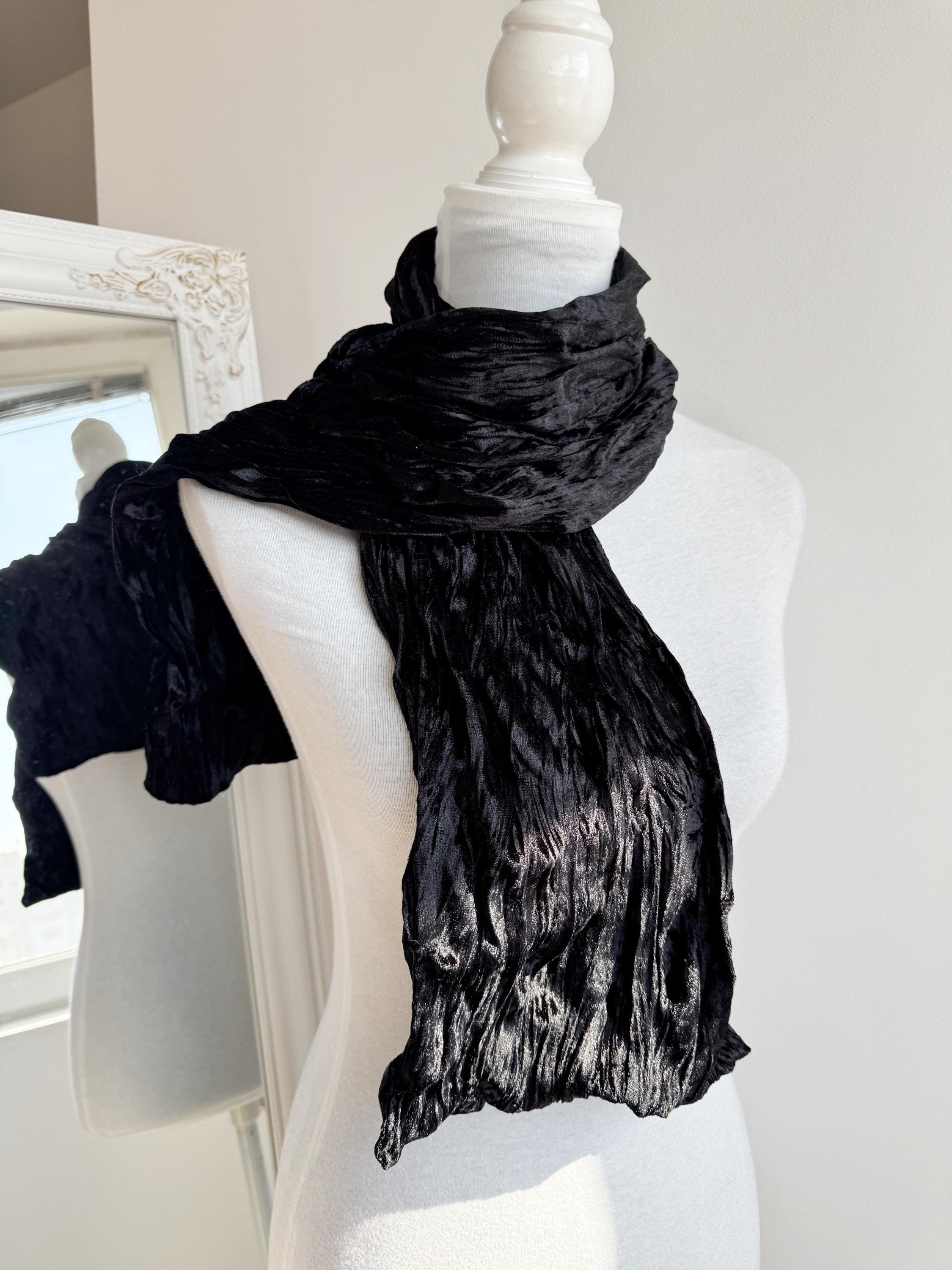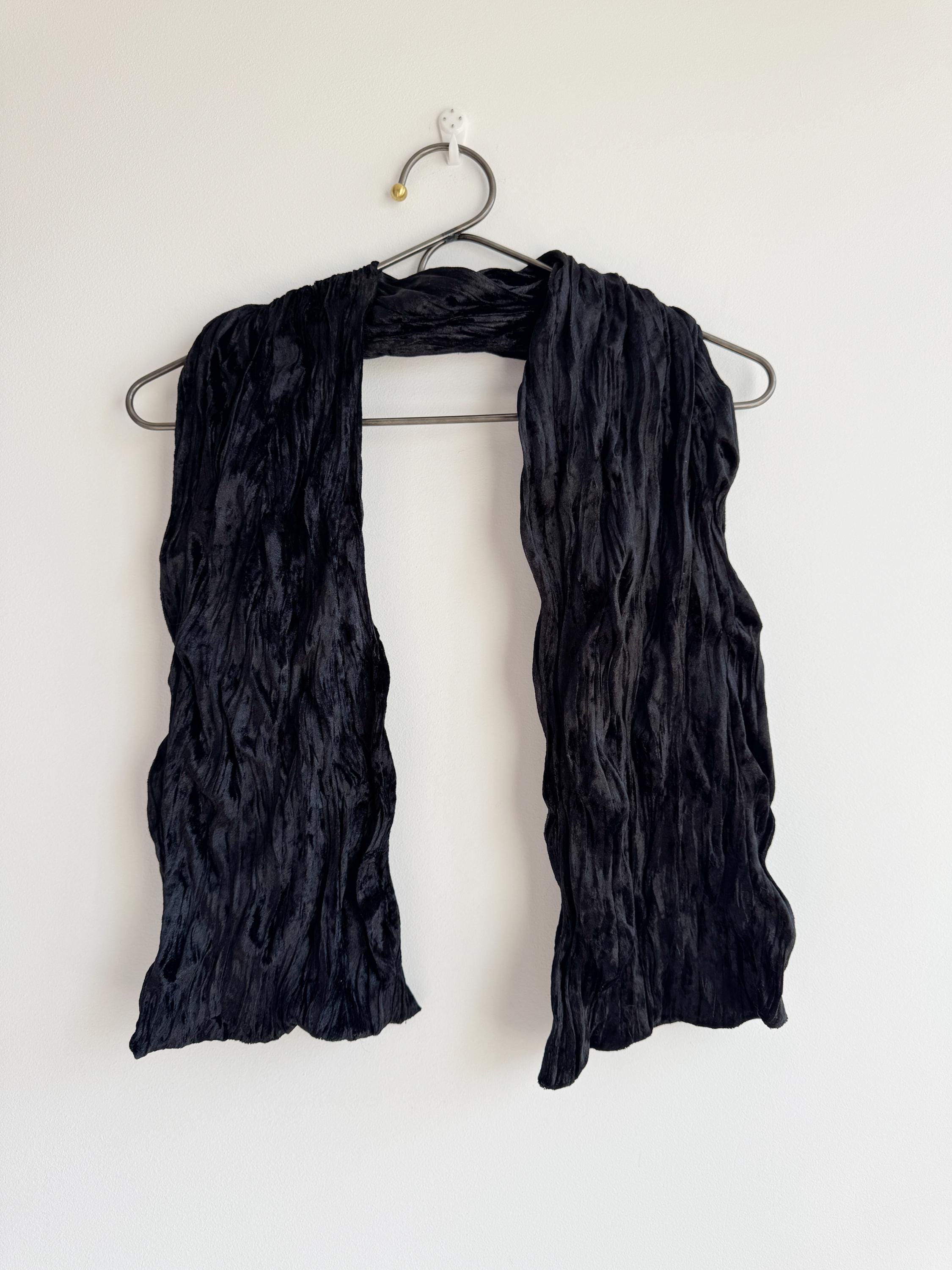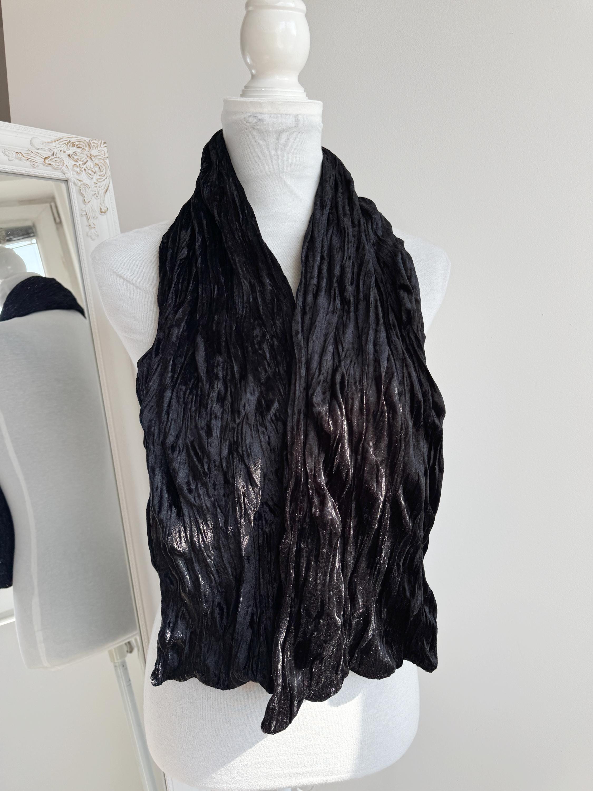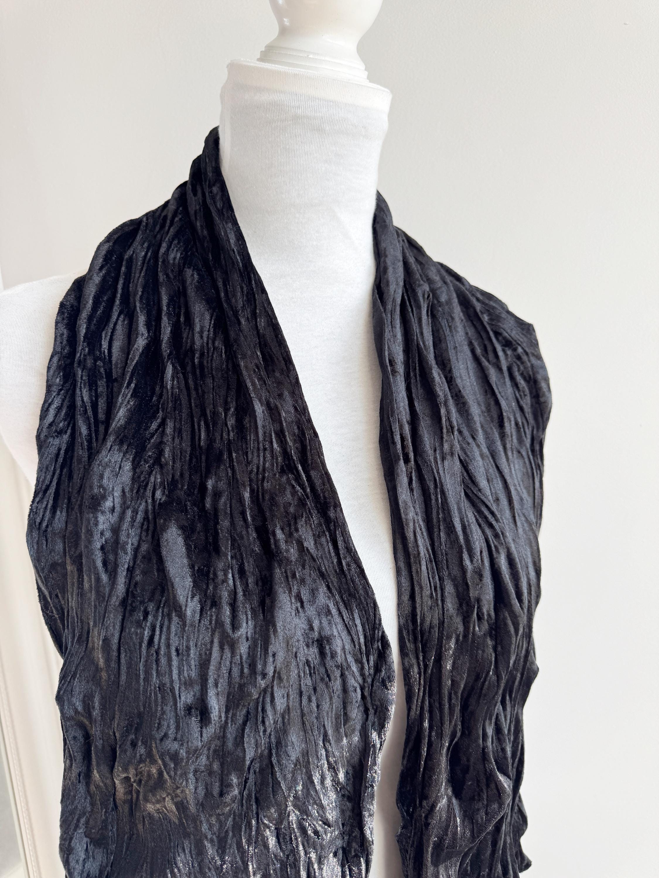 This is a stunning vintage black crinkle velvet scarf made of tectured intentionally wrinkled soft velvet fabric. This double sided velvet wrap is identical on both sides. This art deco evening wrap features a unique, heavily textured crinkle effect that catches the light beautifully, giving off a subtle metallic-like shimmer. Its long, skinny silhouette makes it incredibly versatile—drape it loosely over your shoulders for a dramatic evening look, wrap it snugly for a cozy-yet-glamorous winter accent, or tie it in a classic knot to add texture to a simple outfit.