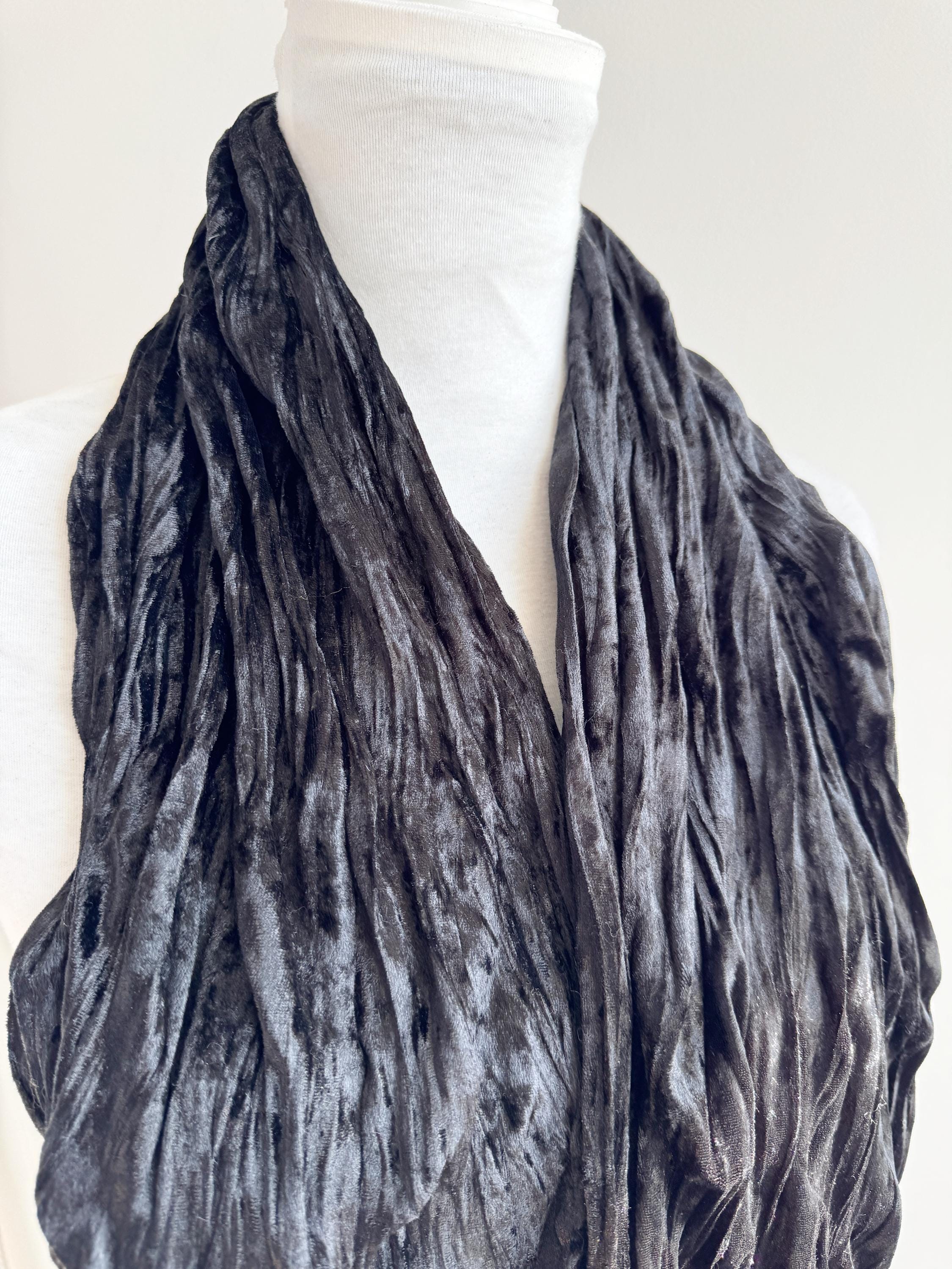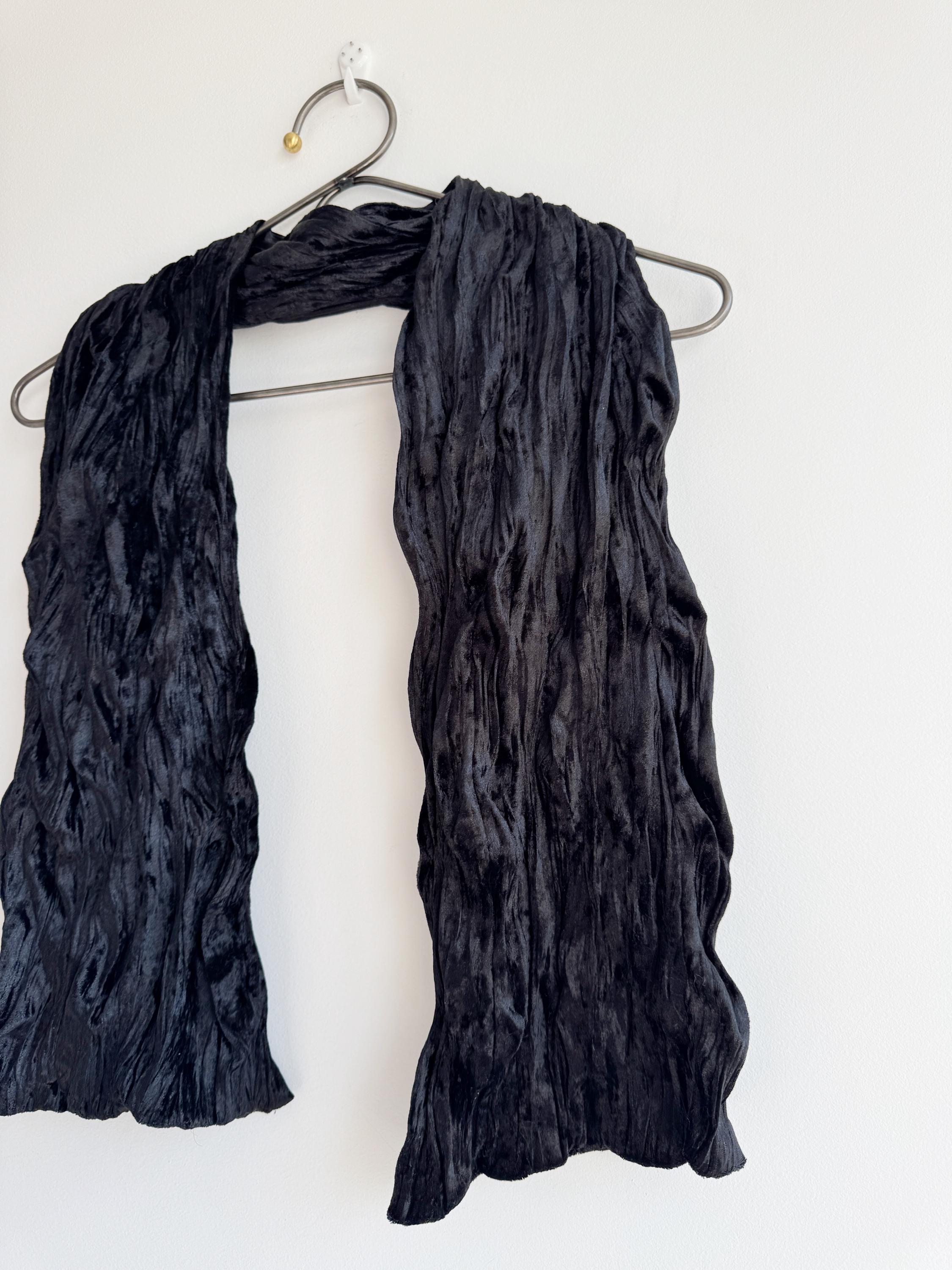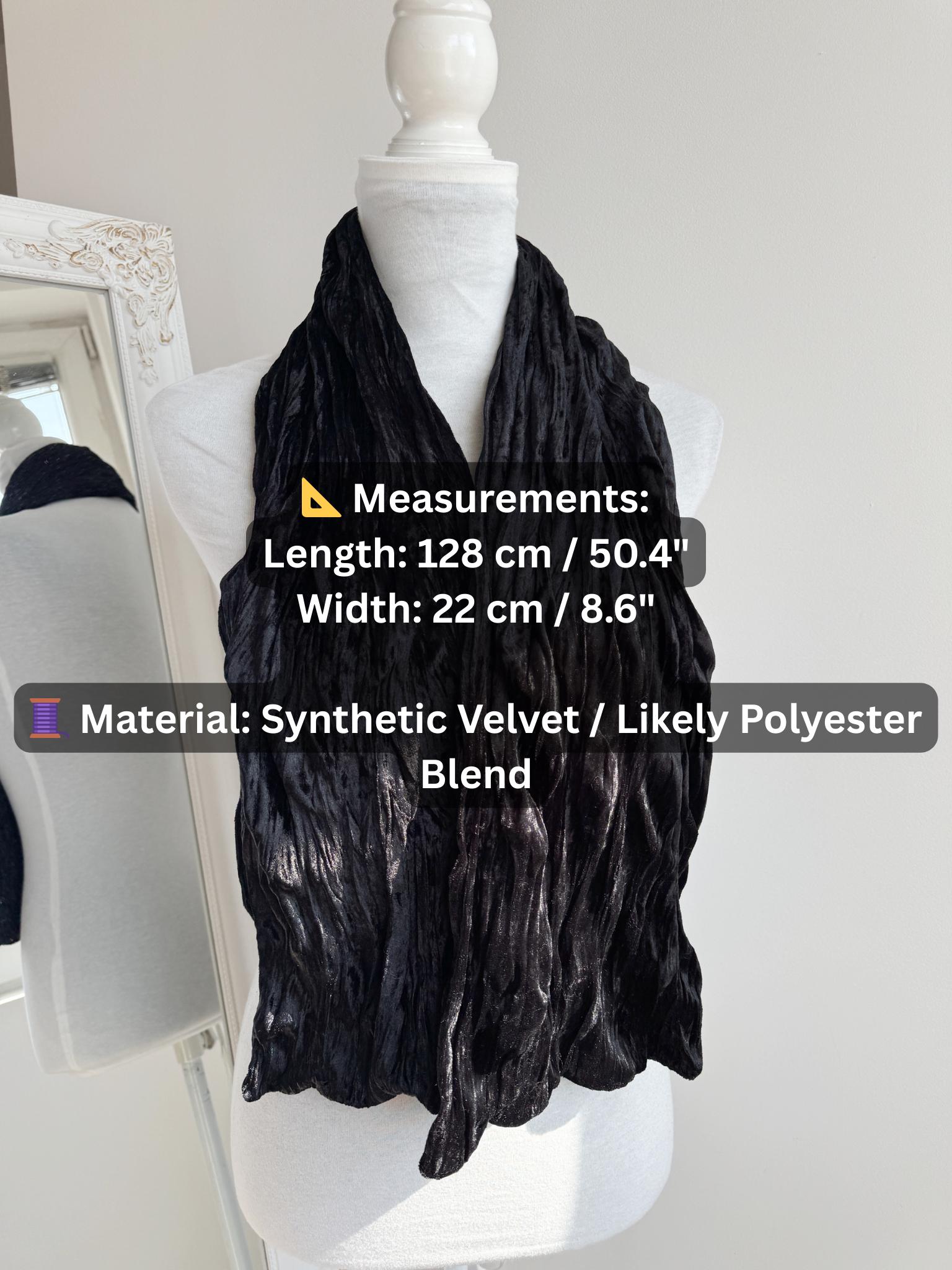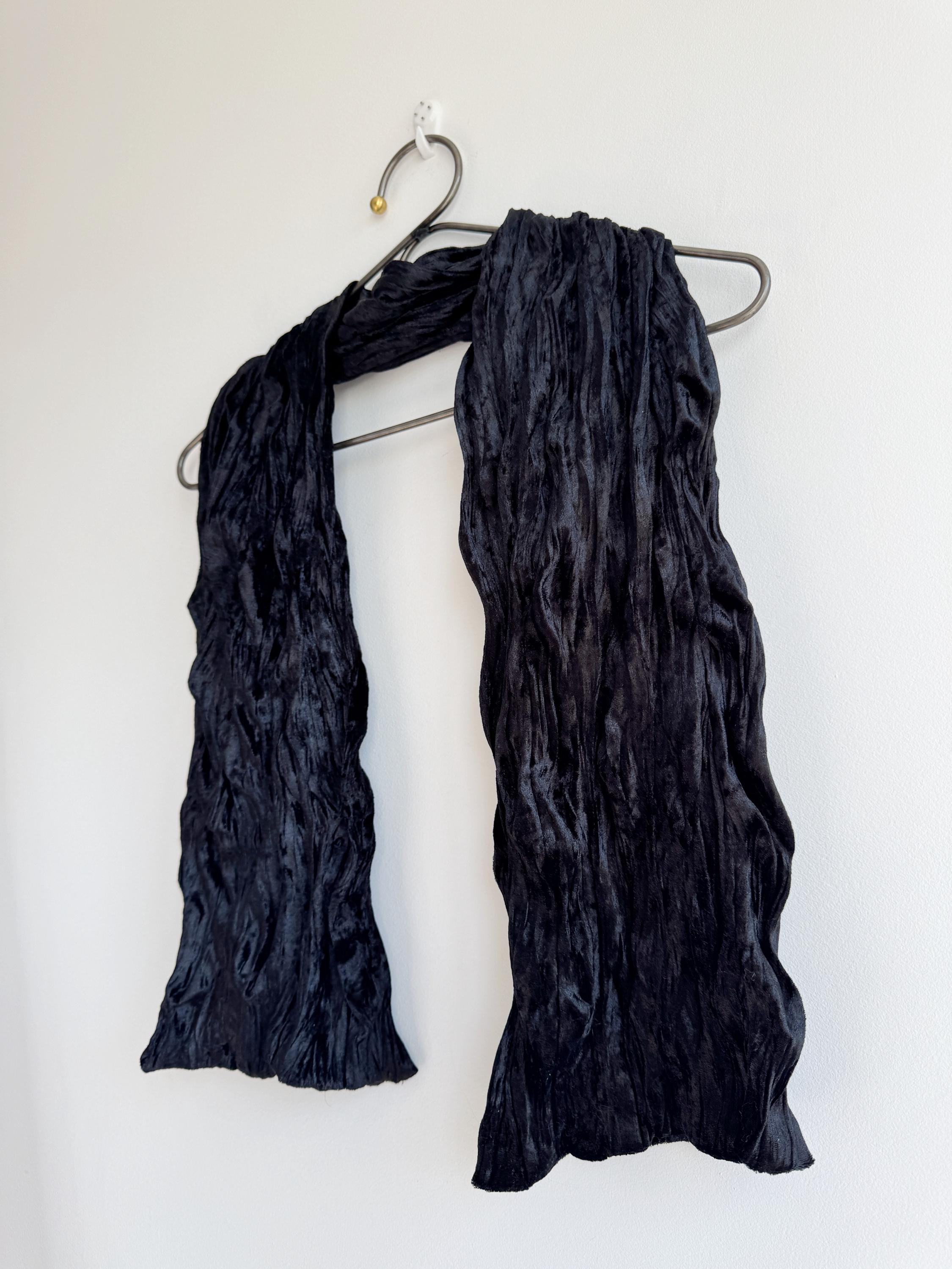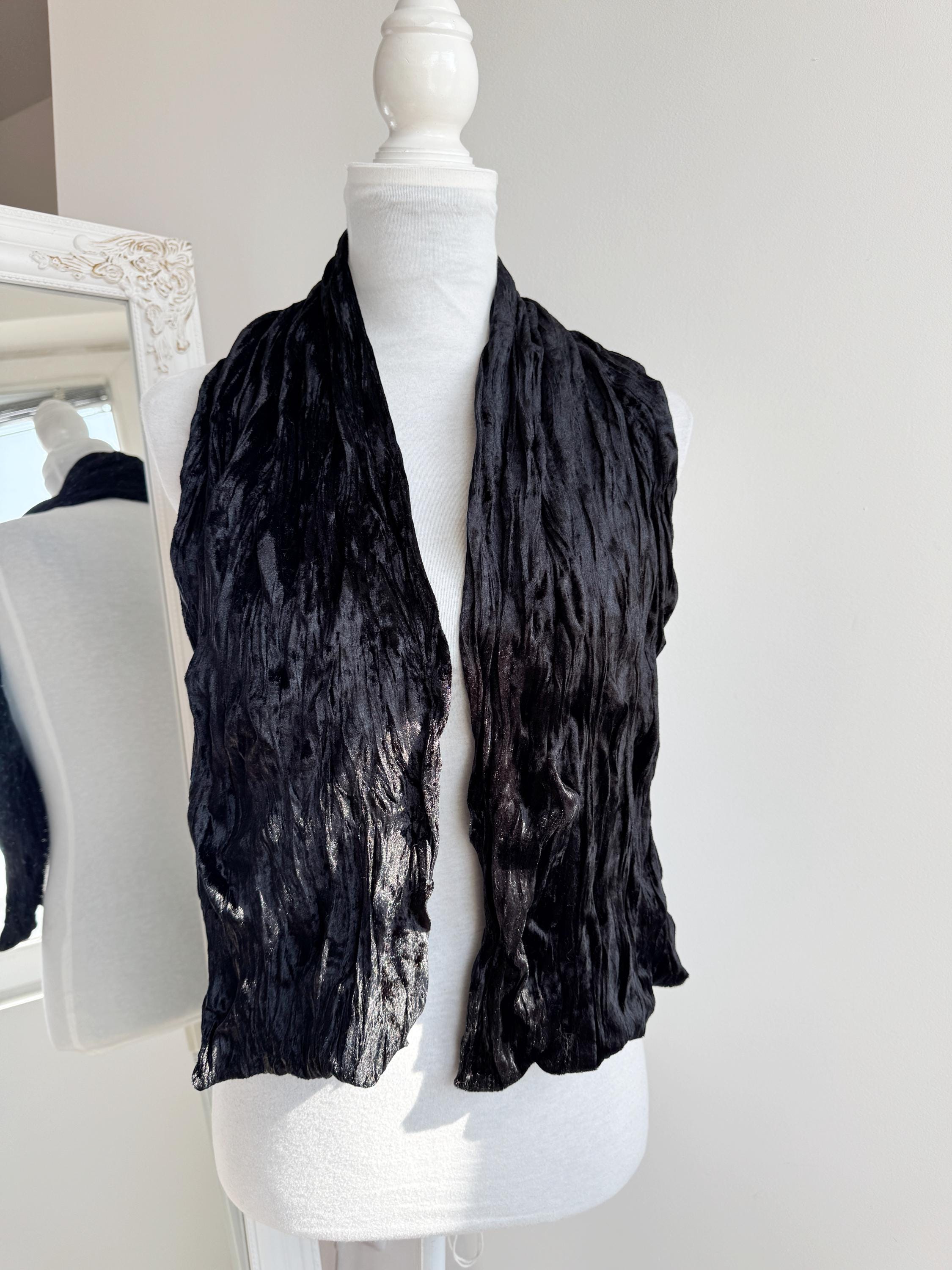 This is a stunning vintage black crinkle velvet scarf made of tectured intentionally wrinkled soft velvet fabric. This double sided velvet wrap is identical on both sides. This art deco evening wrap features a unique, heavily textured crinkle effect that catches the light beautifully, giving off a subtle metallic-like shimmer. Its long, skinny silhouette makes it incredibly versatile—drape it loosely over your shoulders for a dramatic evening look, wrap it snugly for a cozy-yet-glamorous winter accent, or tie it in a classic knot to add texture to a simple outfit.