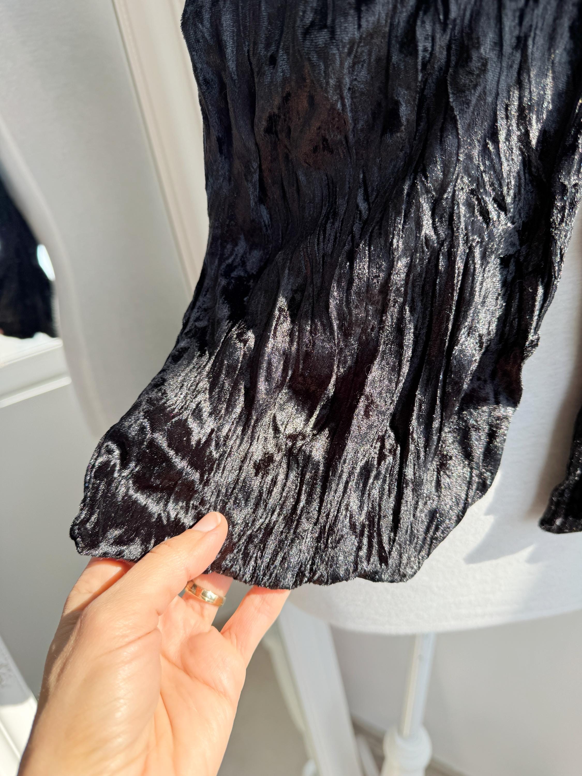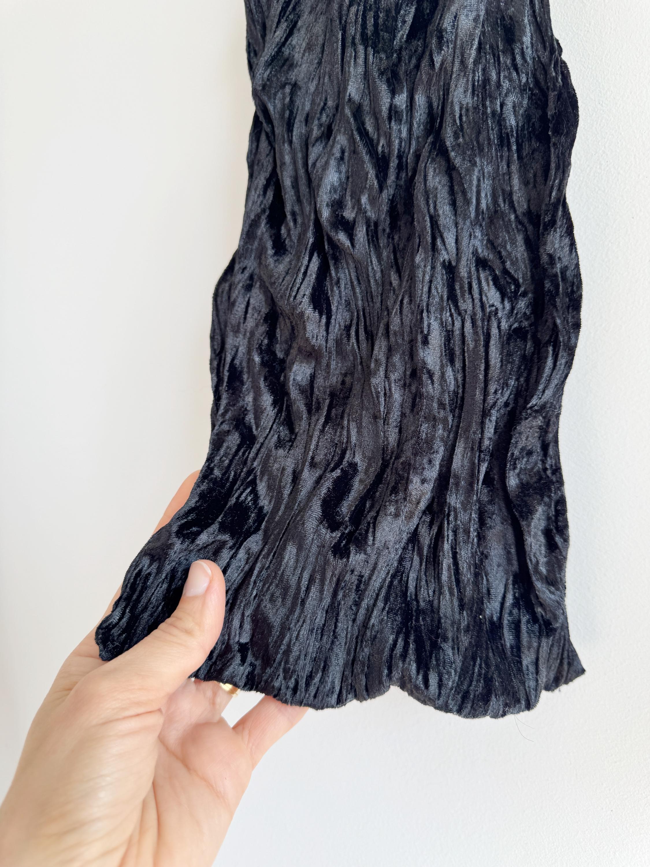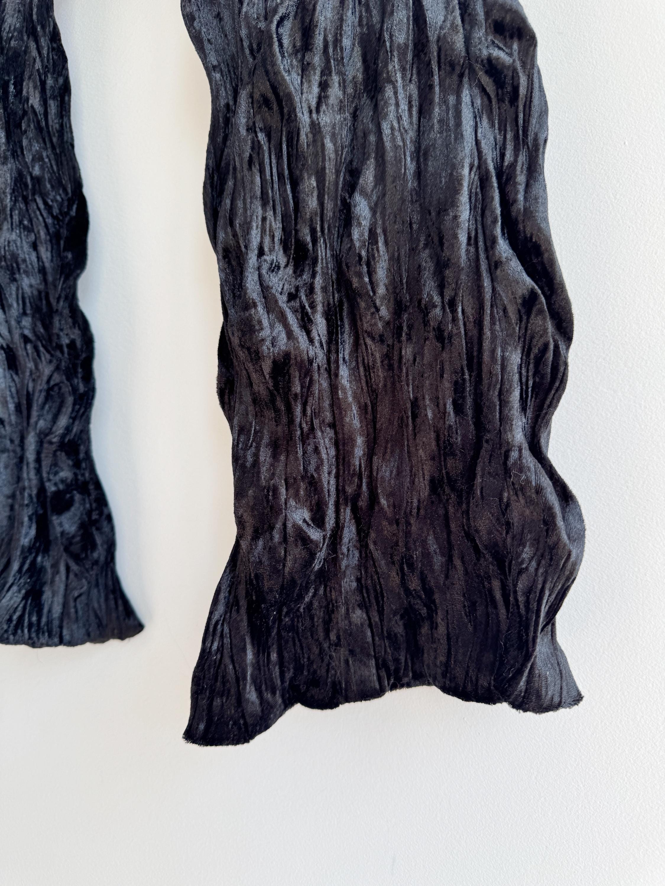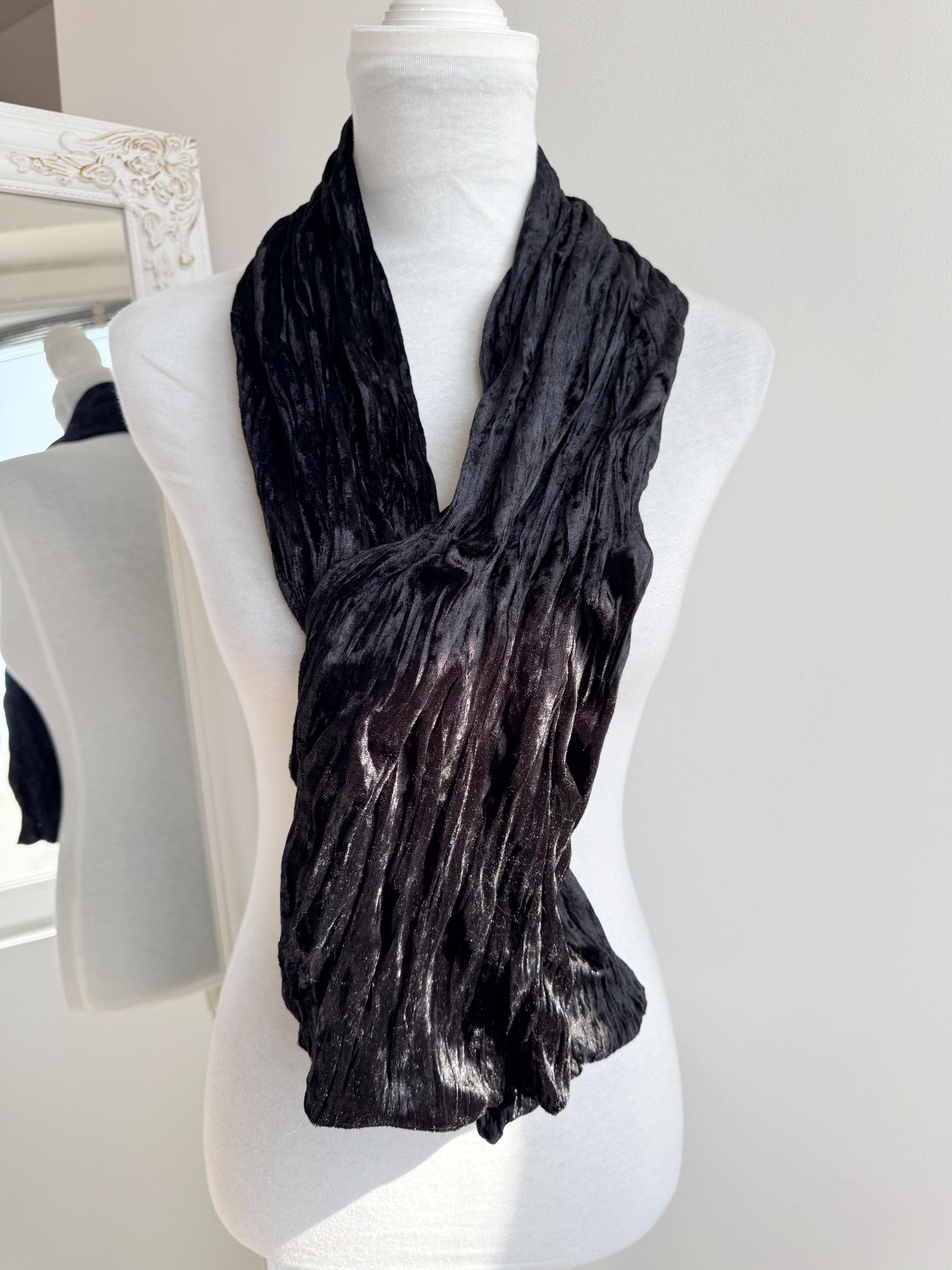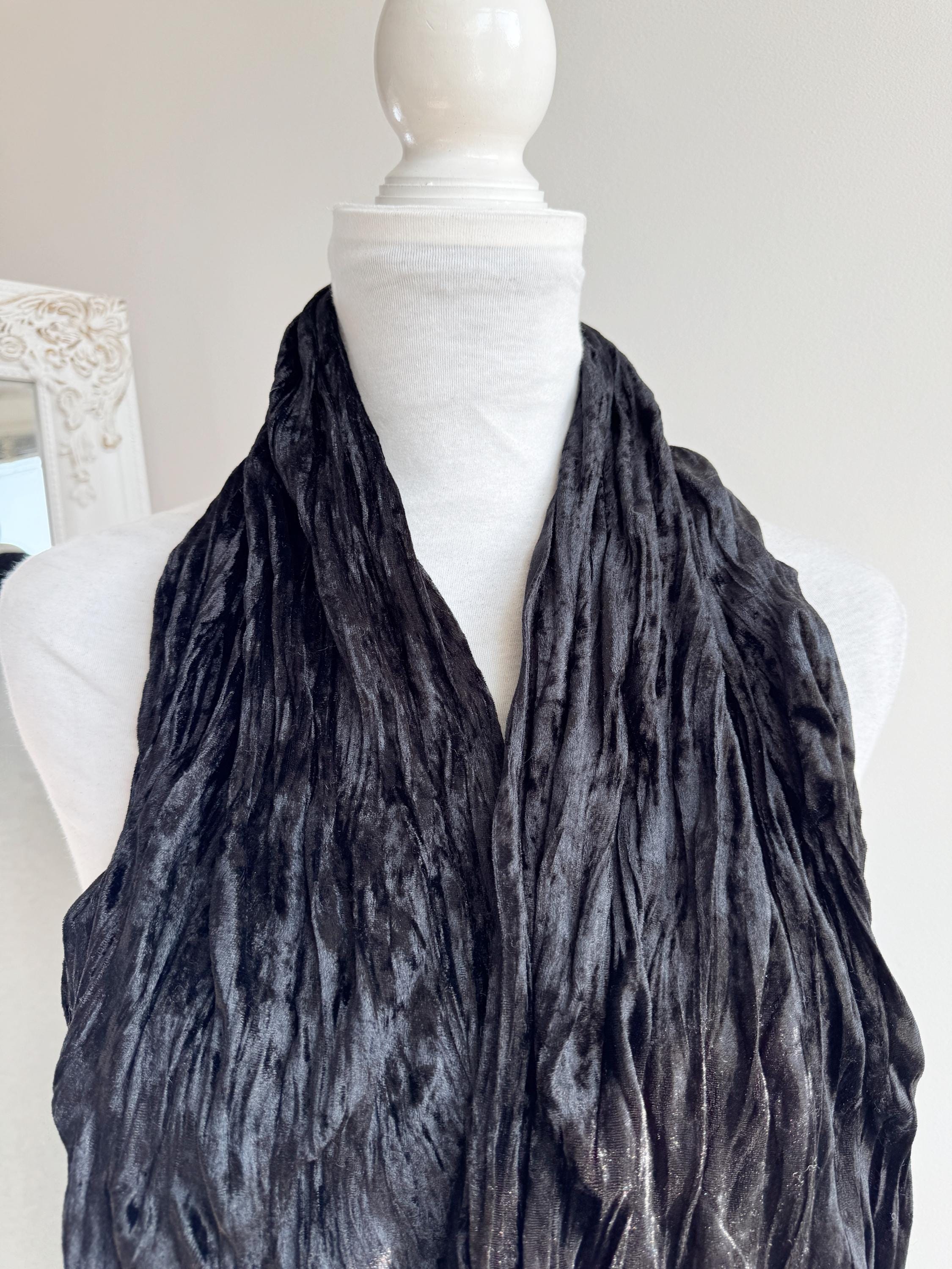 This is a stunning vintage black crinkle velvet scarf made of tectured intentionally wrinkled soft velvet fabric. This double sided velvet wrap is identical on both sides. This art deco evening wrap features a unique, heavily textured crinkle effect that catches the light beautifully, giving off a subtle metallic-like shimmer. Its long, skinny silhouette makes it incredibly versatile—drape it loosely over your shoulders for a dramatic evening look, wrap it snugly for a cozy-yet-glamorous winter accent, or tie it in a classic knot to add texture to a simple outfit.