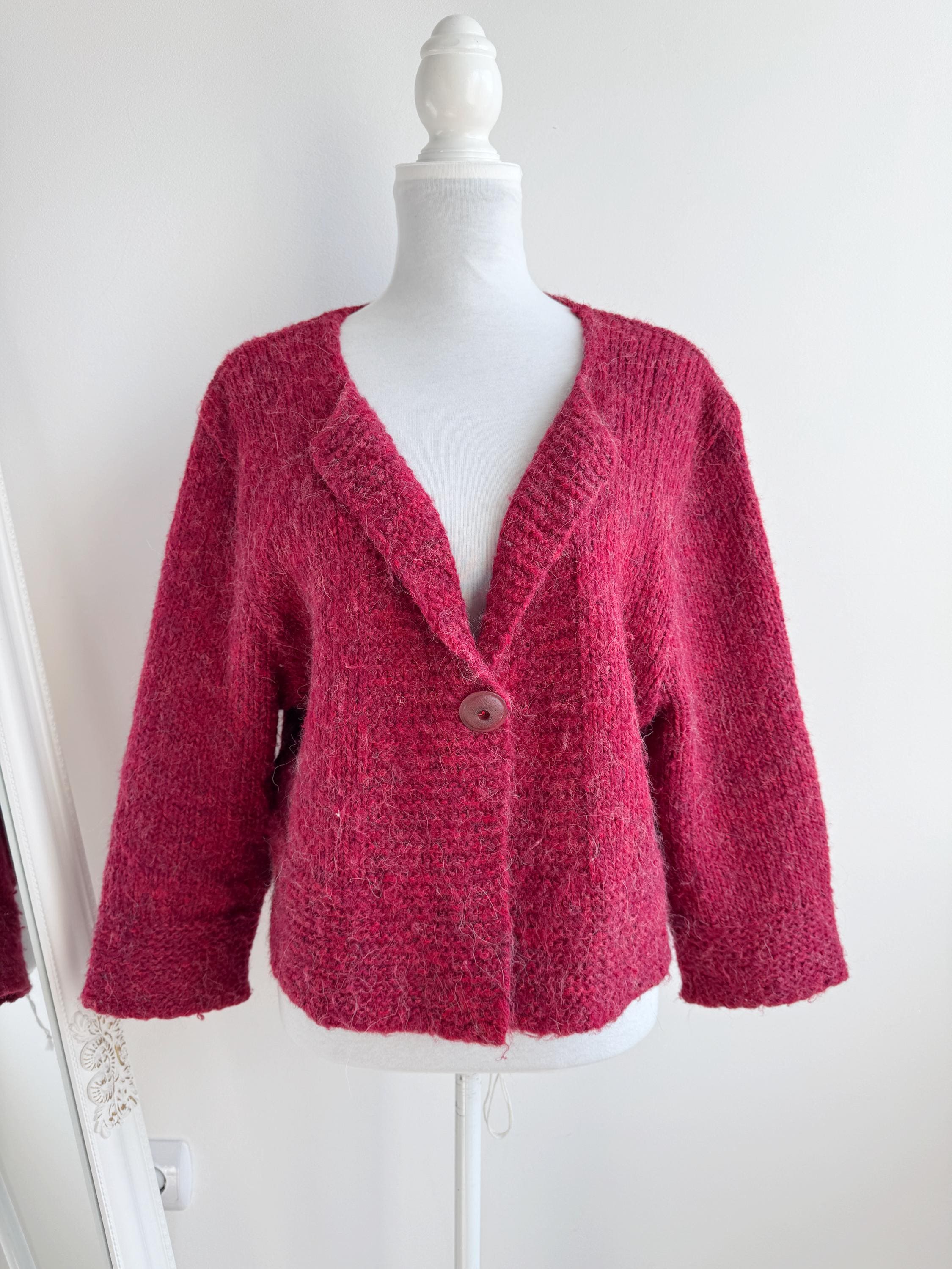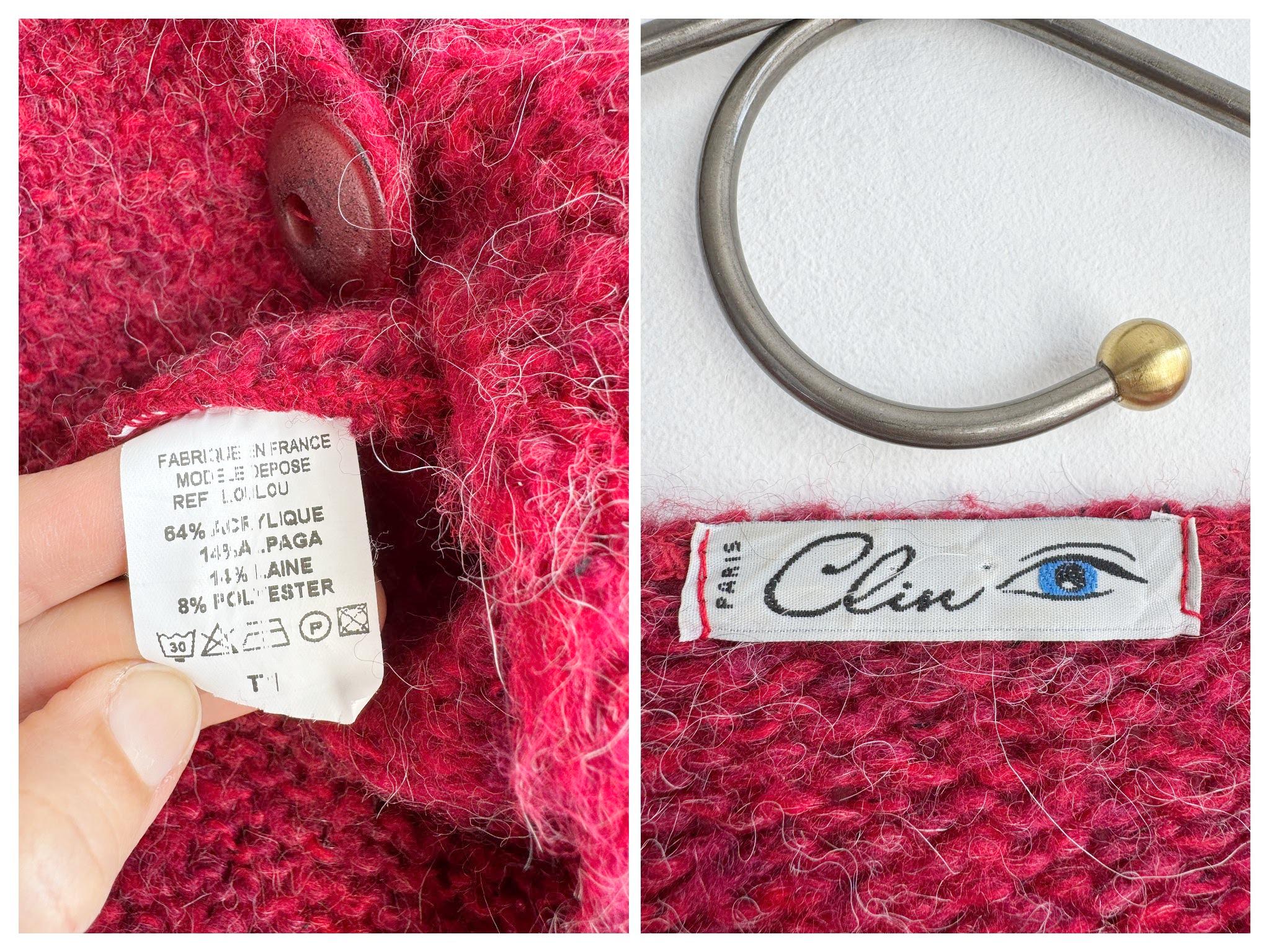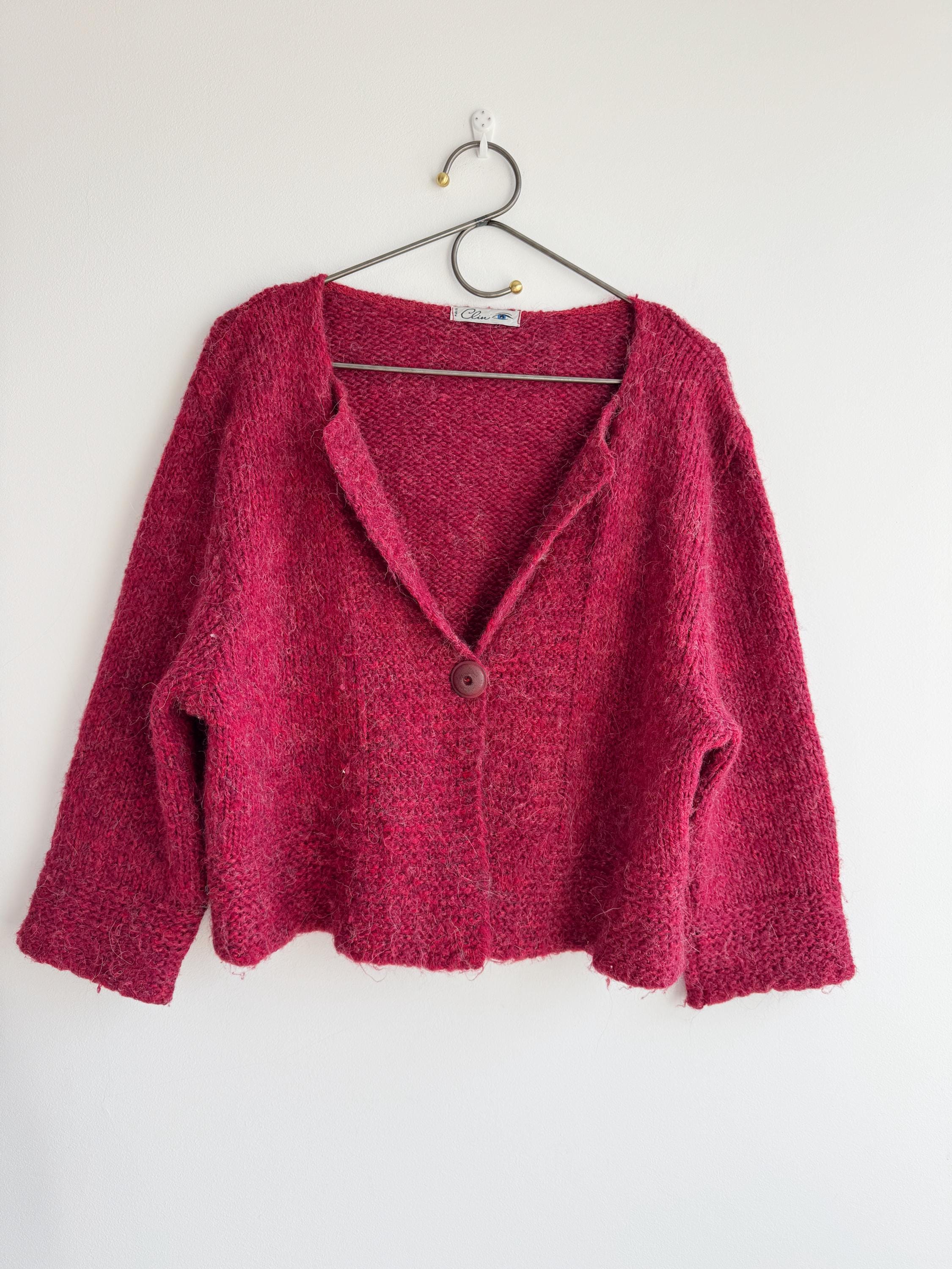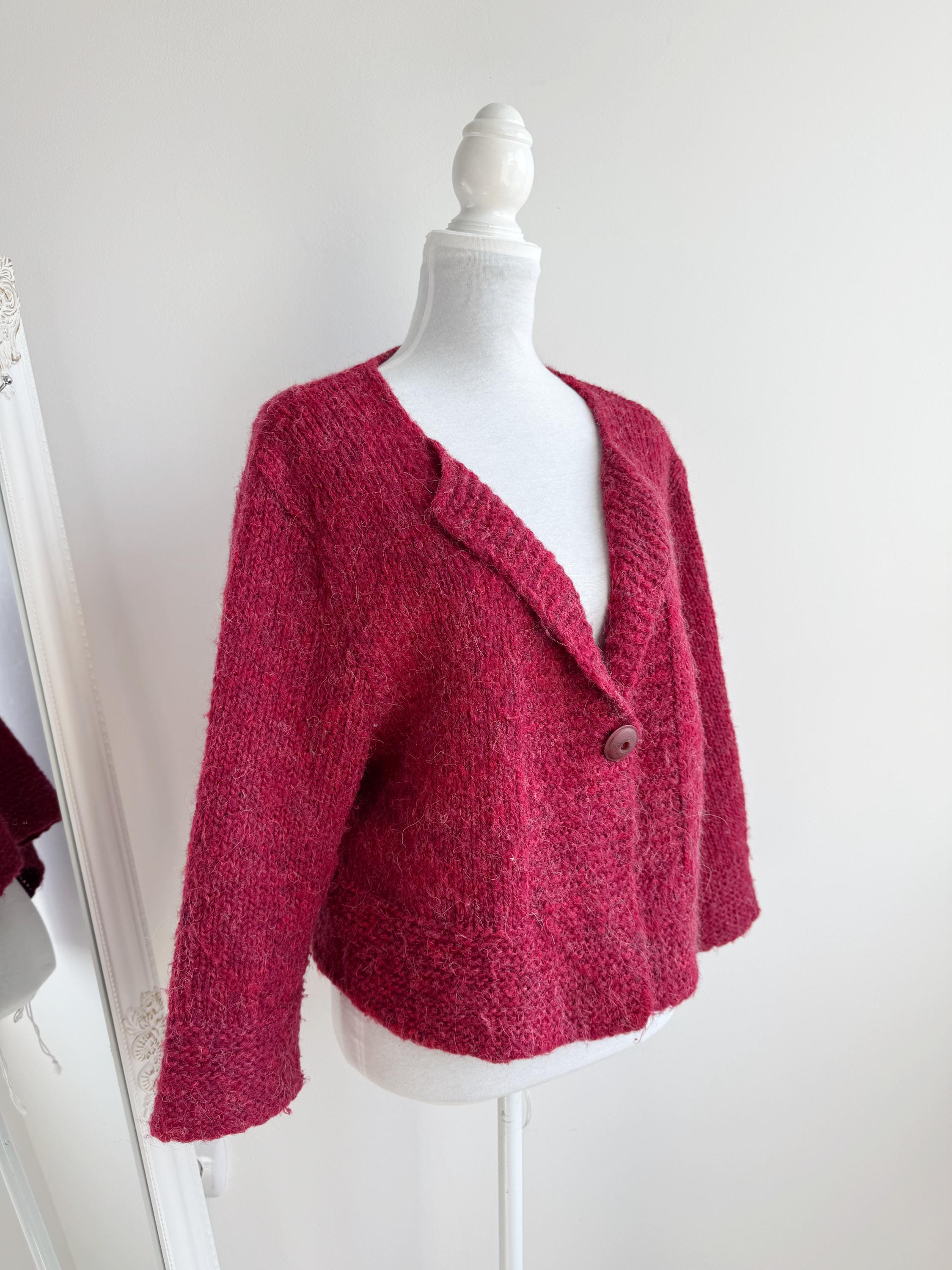 This stunning vintage cardigan sweater from the French label Clin Paris is the perfect blend of cozy comfort and effortless chic. Featuring a rich, deep red (almost raspberry) hue, this mohair style cardigan stands out with its beautiful textured knit and classic loose fit design. The silhouette is slightly cropped with a relaxed, boxy fit and elegant wide sleeves, making it an ideal layering piece over dresses or high-waisted denim.