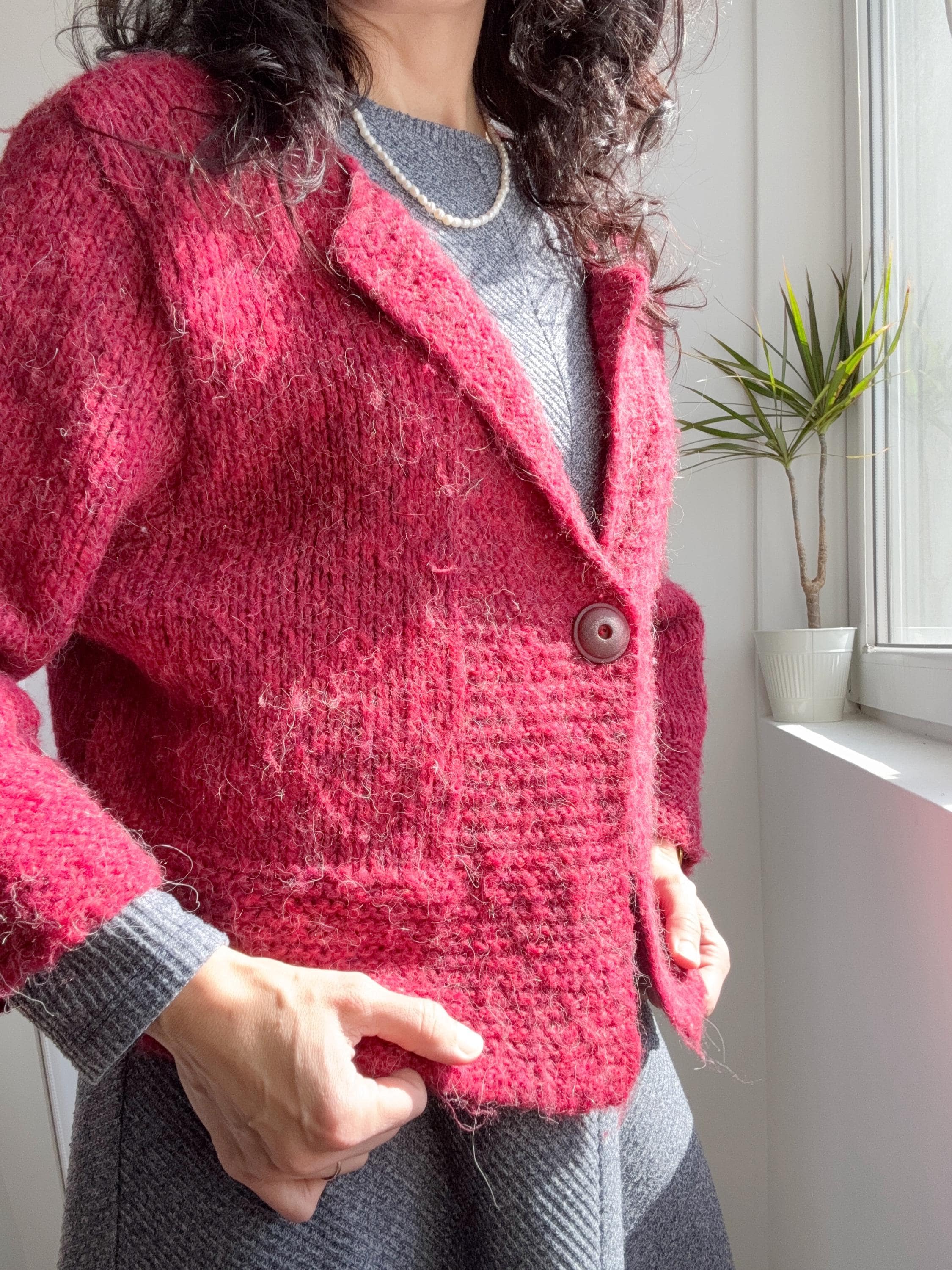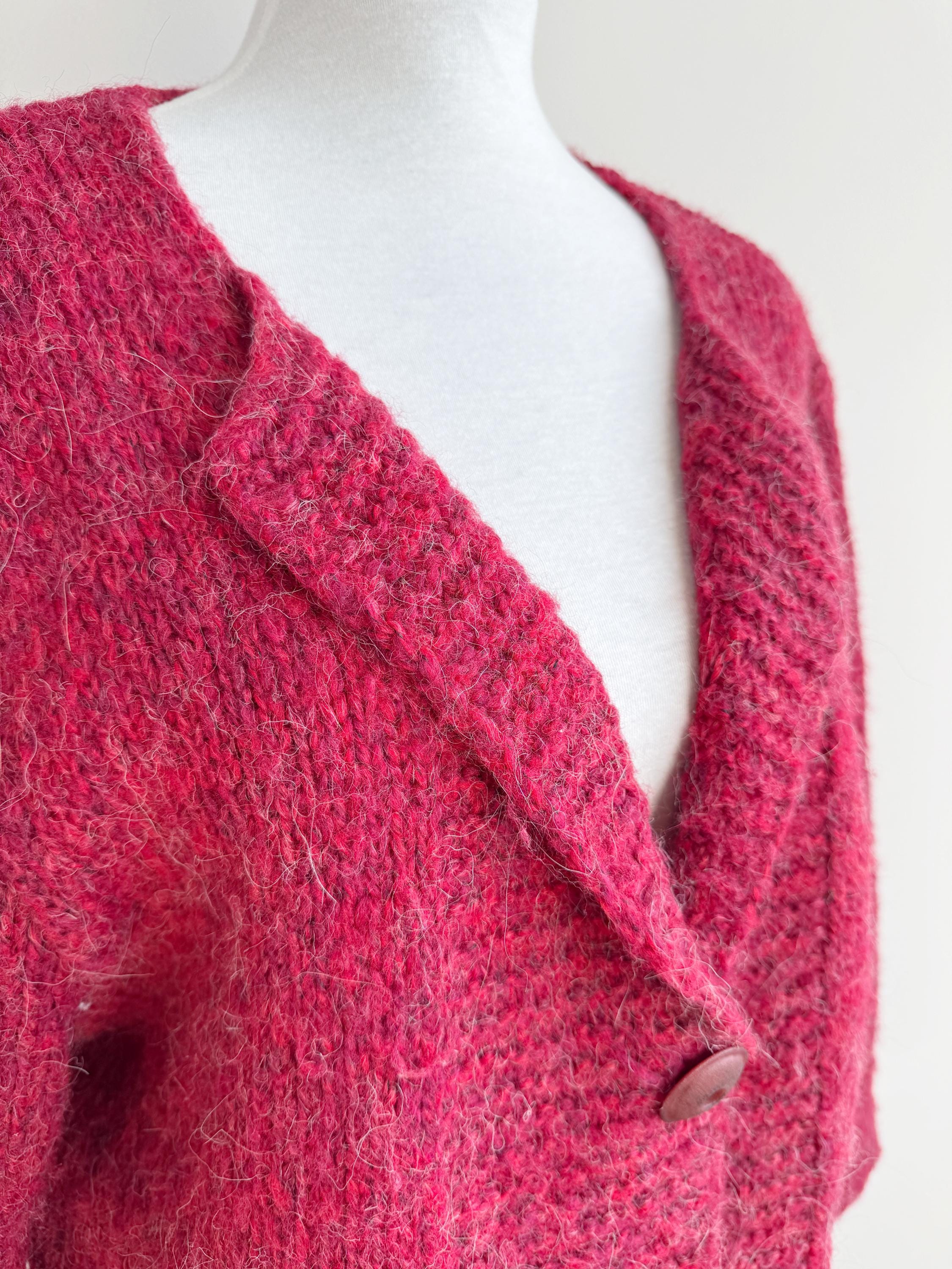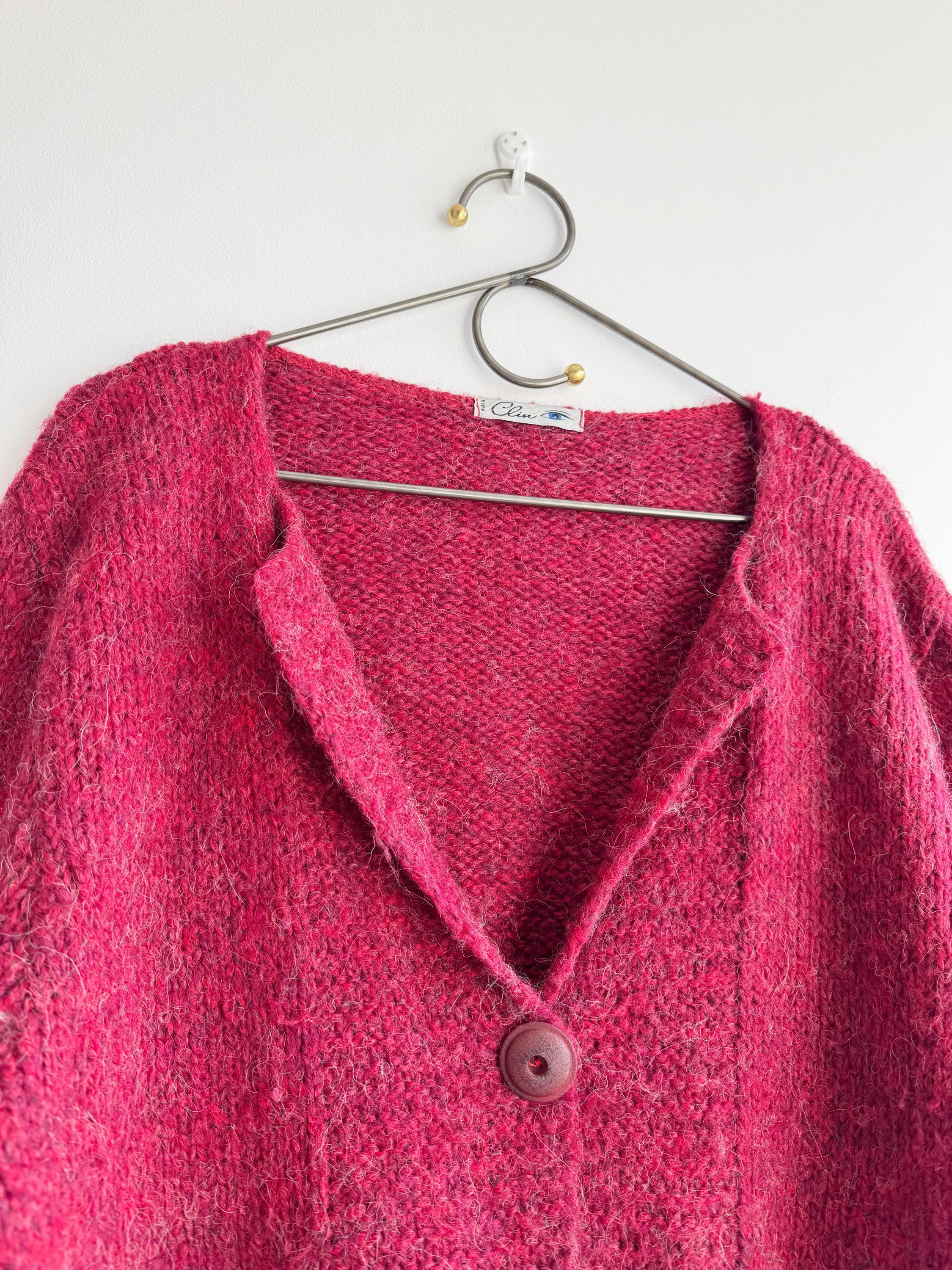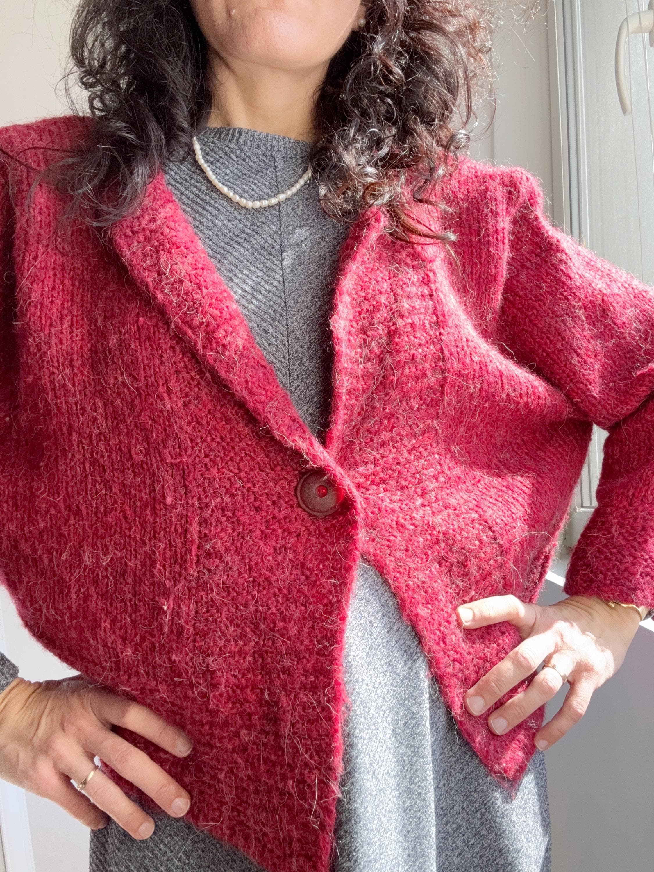 This stunning vintage cardigan sweater from the French label Clin Paris is the perfect blend of cozy comfort and effortless chic. Featuring a rich, deep red (almost raspberry) hue, this mohair style cardigan stands out with its beautiful textured knit and classic loose fit design. The silhouette is slightly cropped with a relaxed, boxy fit and elegant wide sleeves, making it an ideal layering piece over dresses or high-waisted denim.