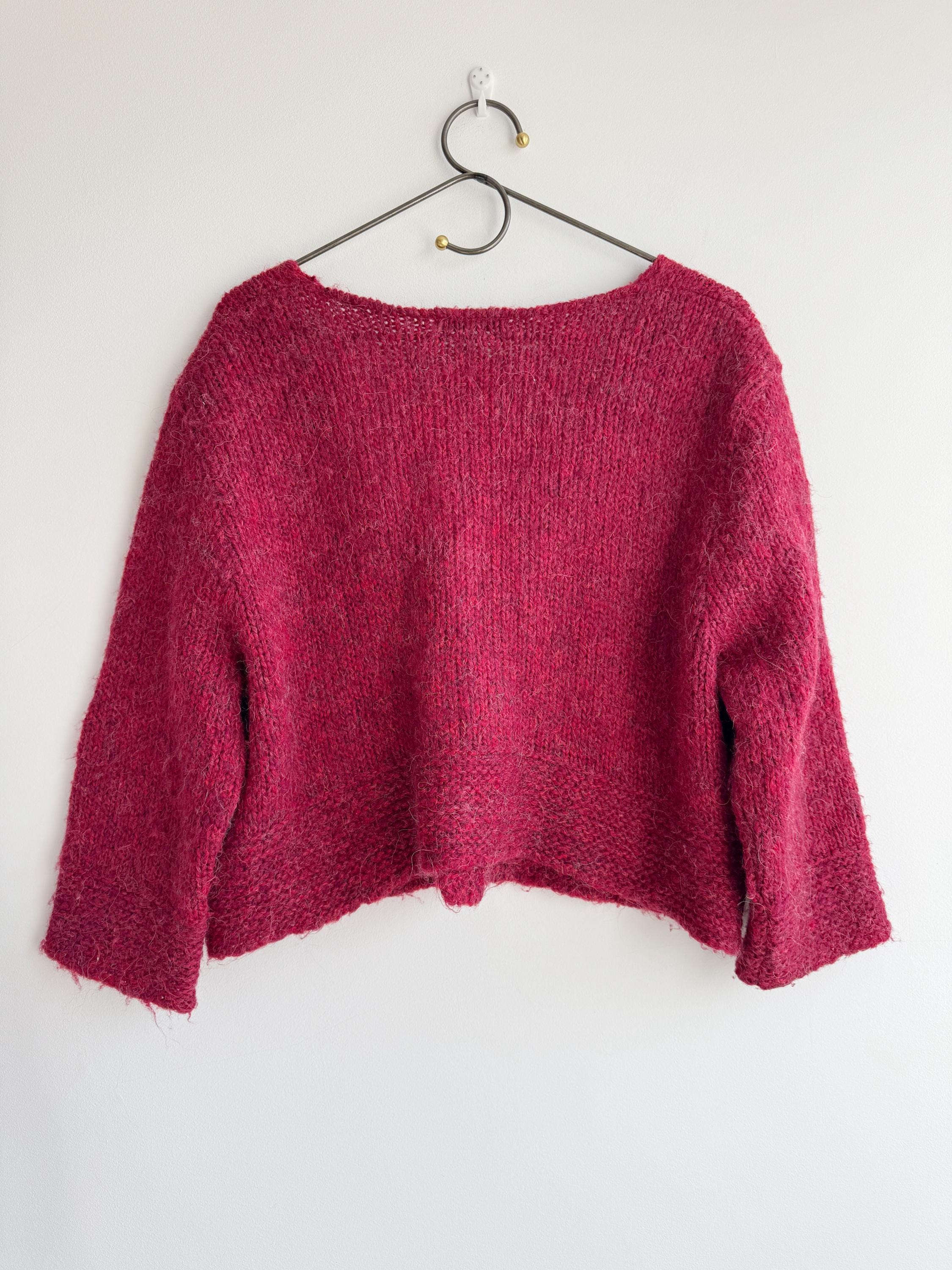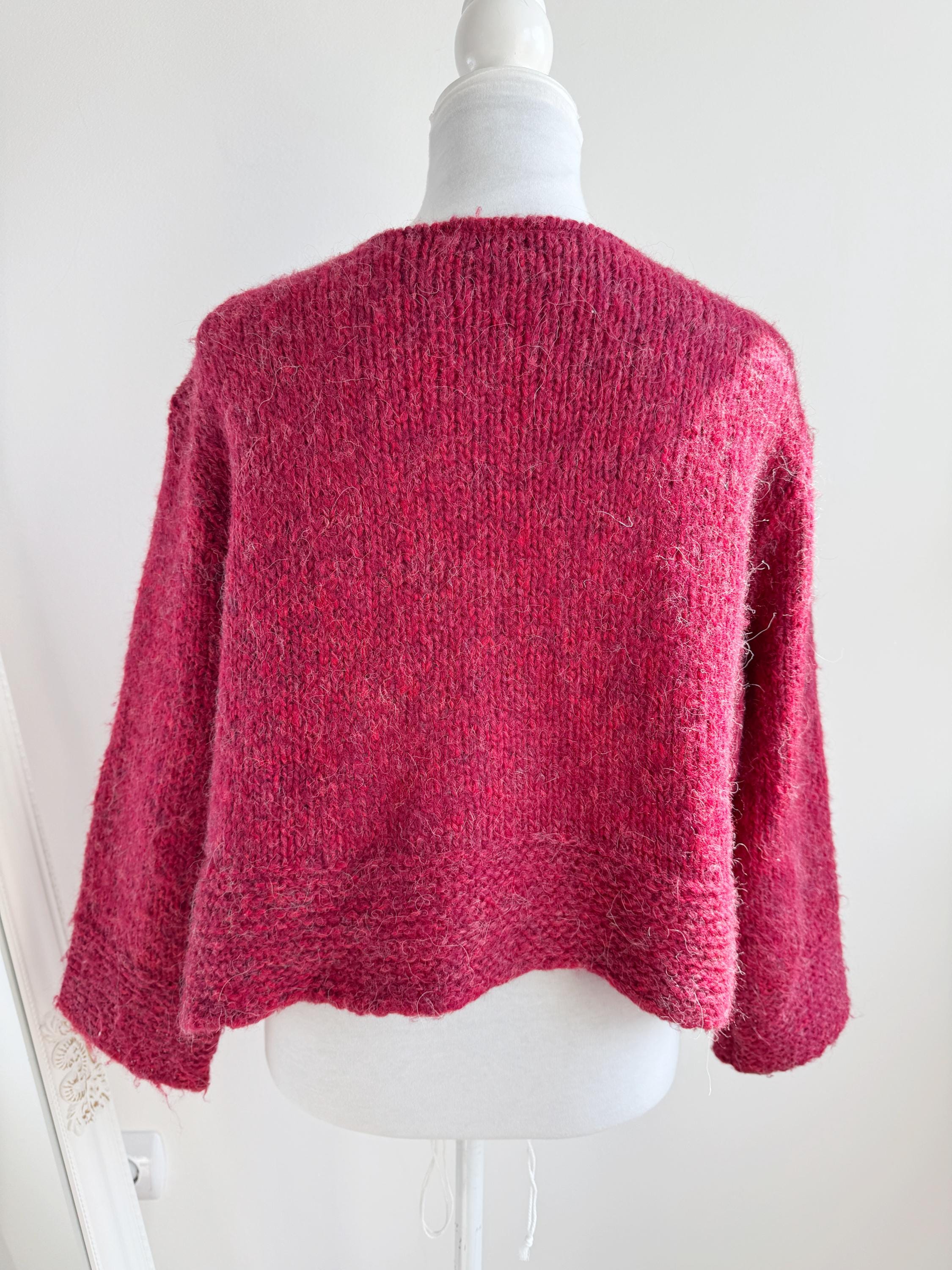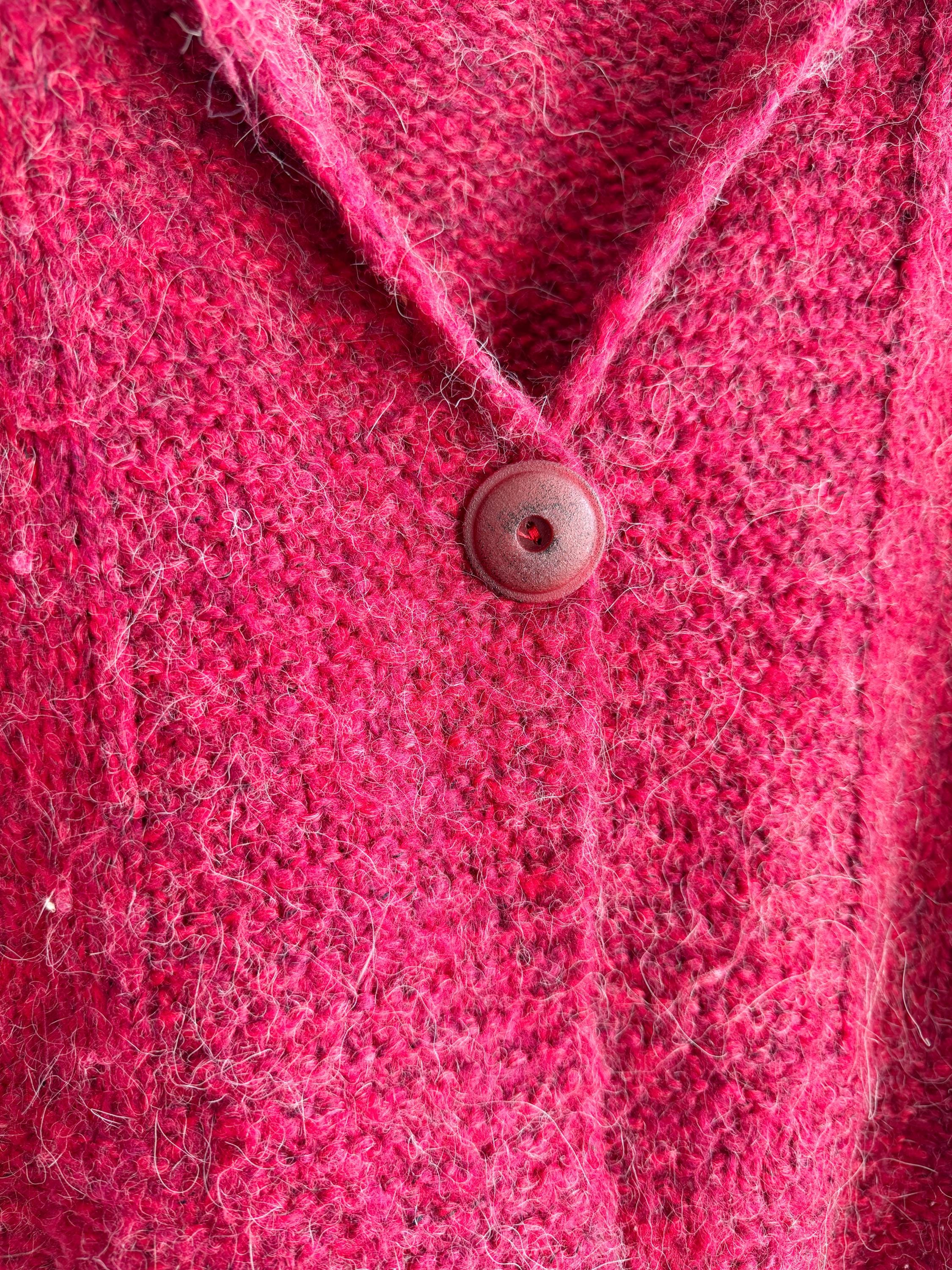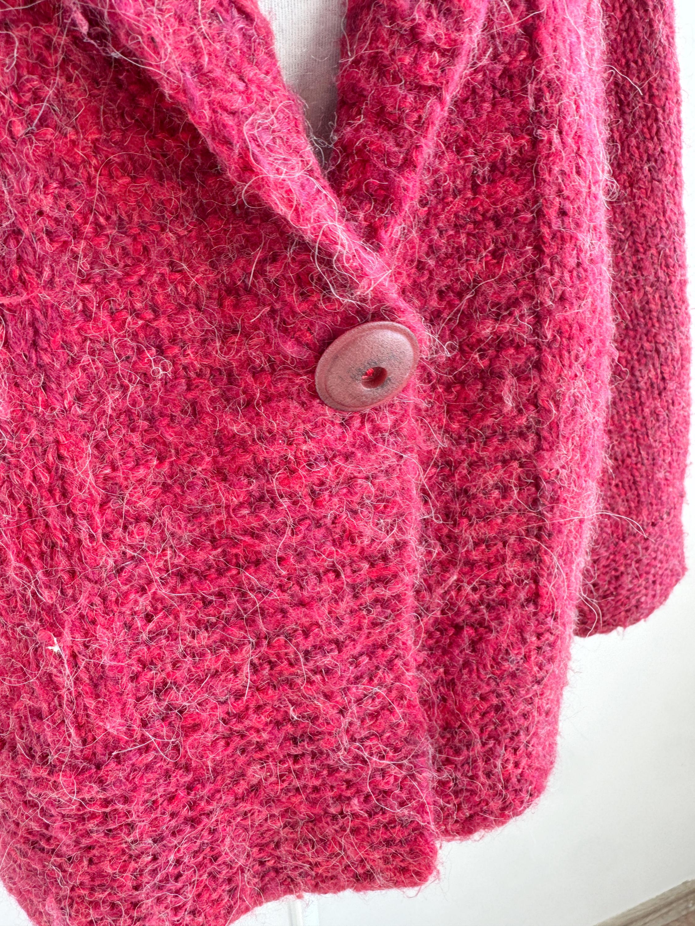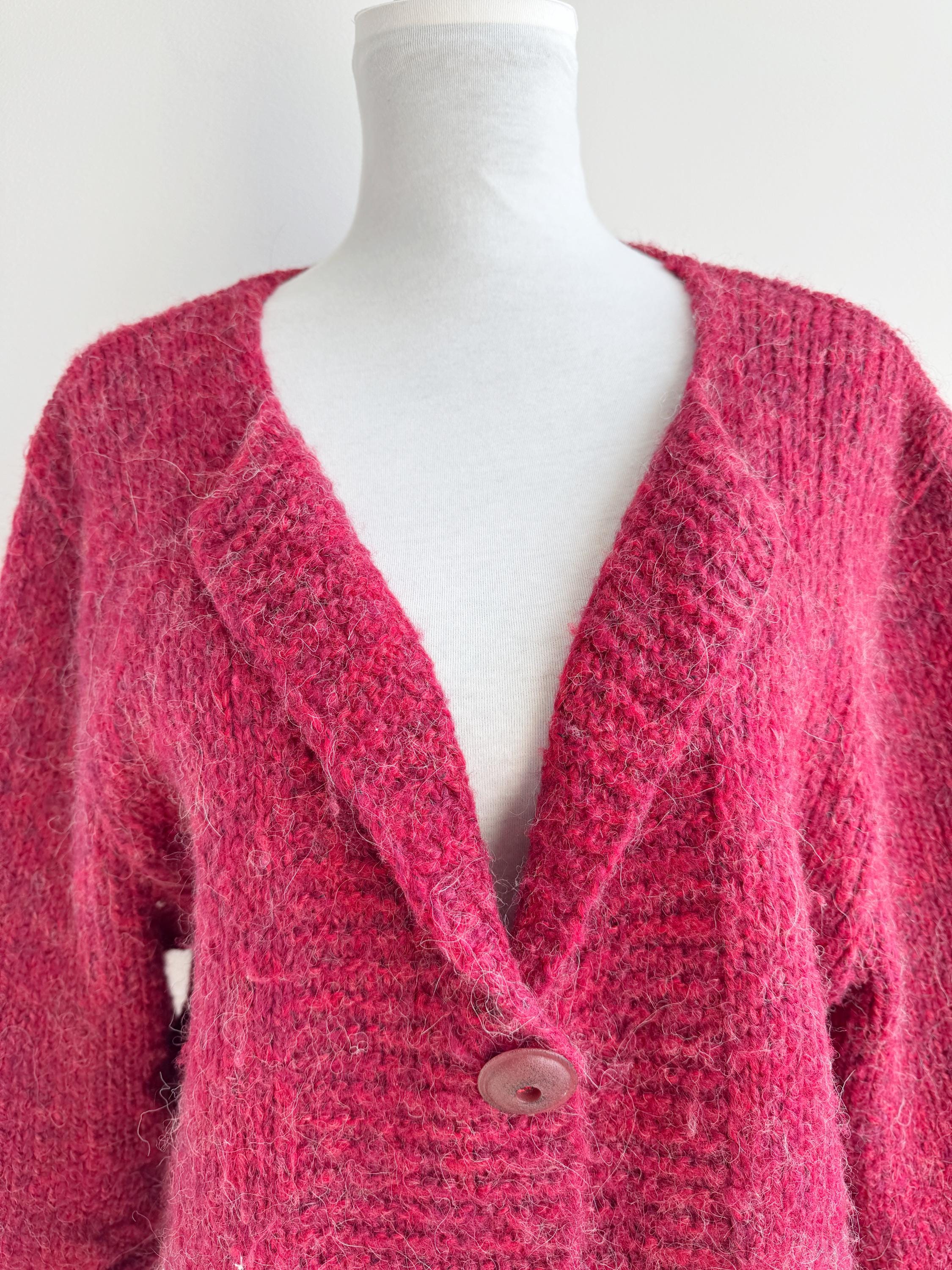 This stunning vintage cardigan sweater from the French label Clin Paris is the perfect blend of cozy comfort and effortless chic. Featuring a rich, deep red (almost raspberry) hue, this mohair style cardigan stands out with its beautiful textured knit and classic loose fit design. The silhouette is slightly cropped with a relaxed, boxy fit and elegant wide sleeves, making it an ideal layering piece over dresses or high-waisted denim.