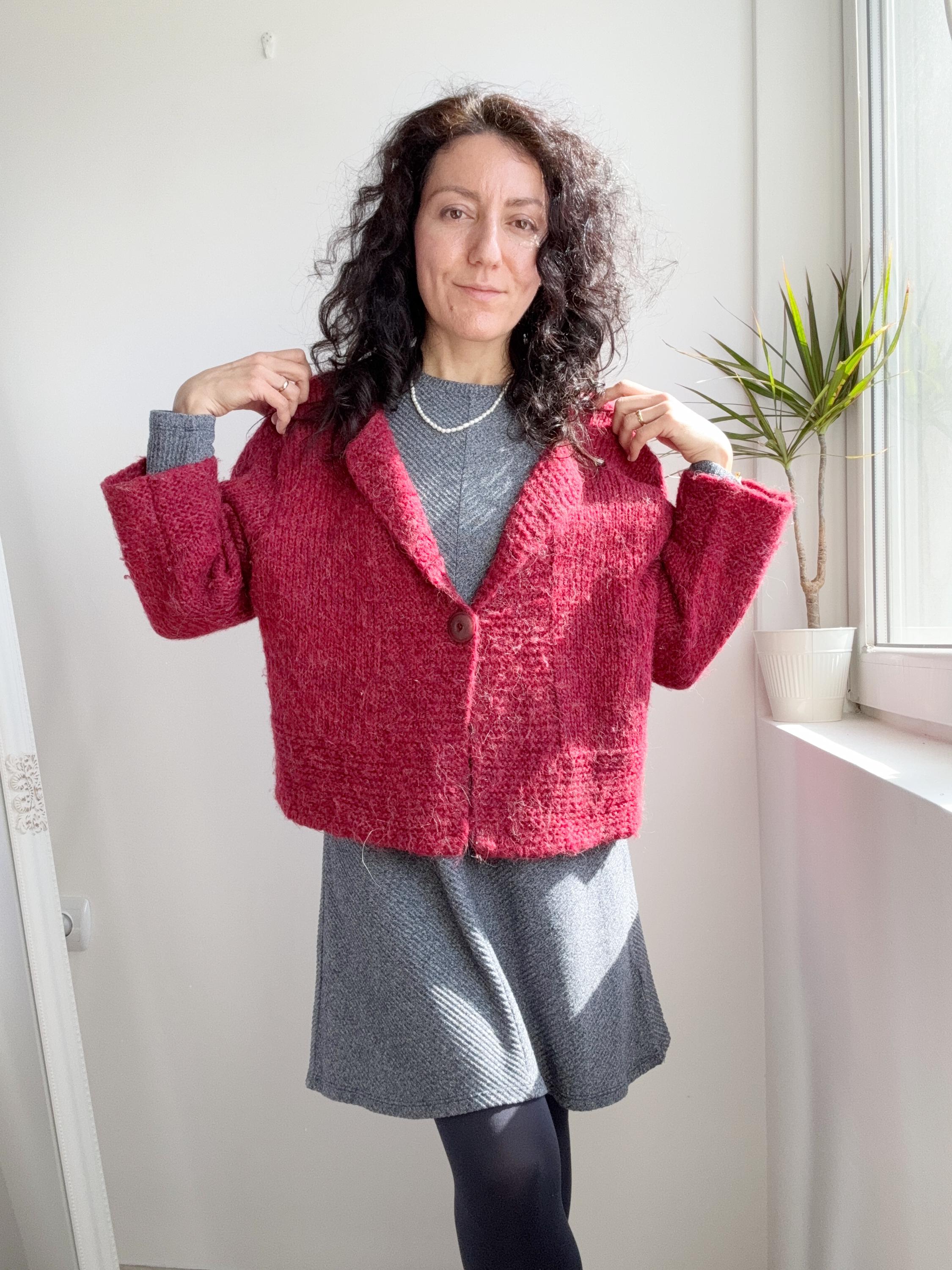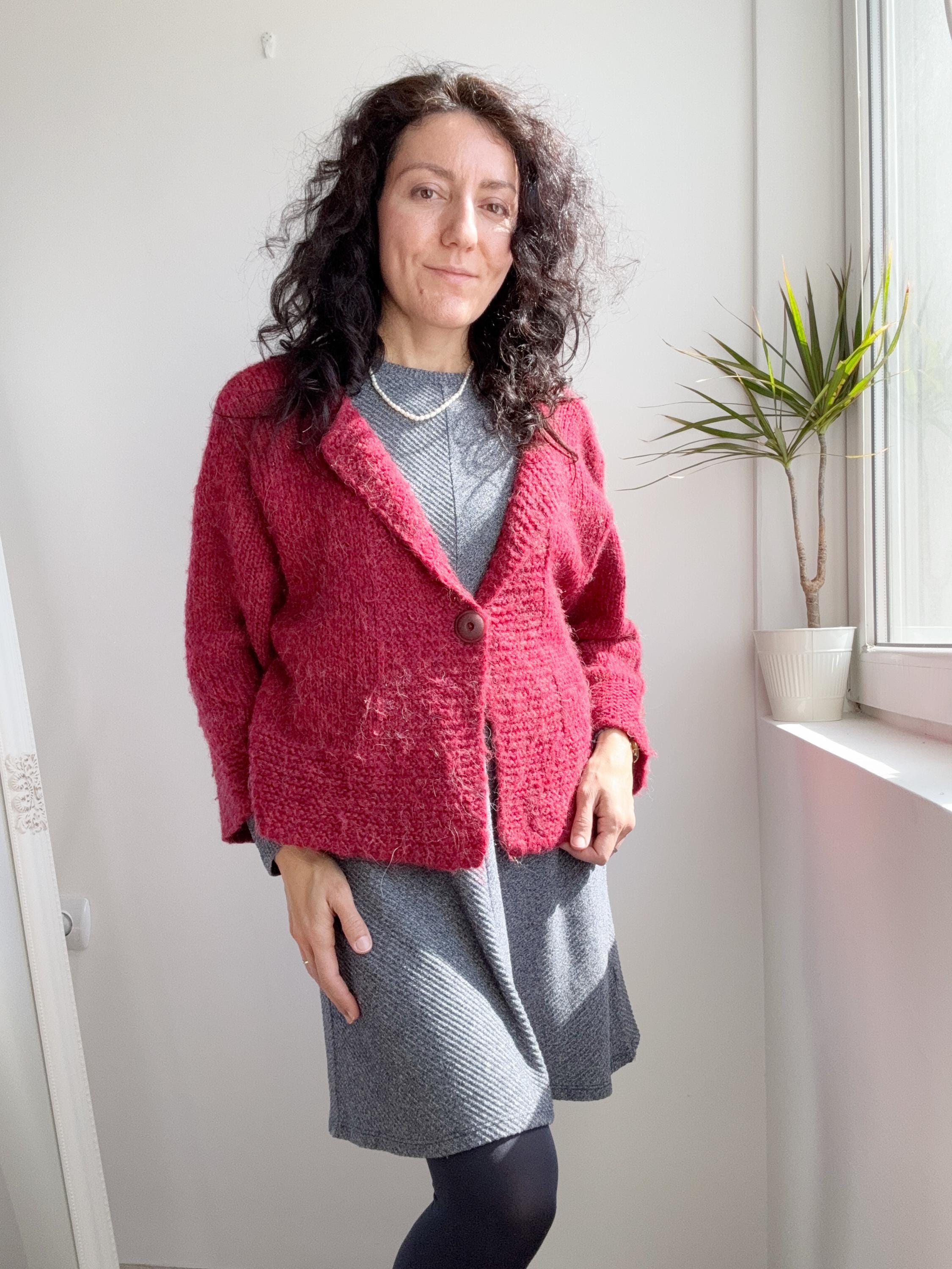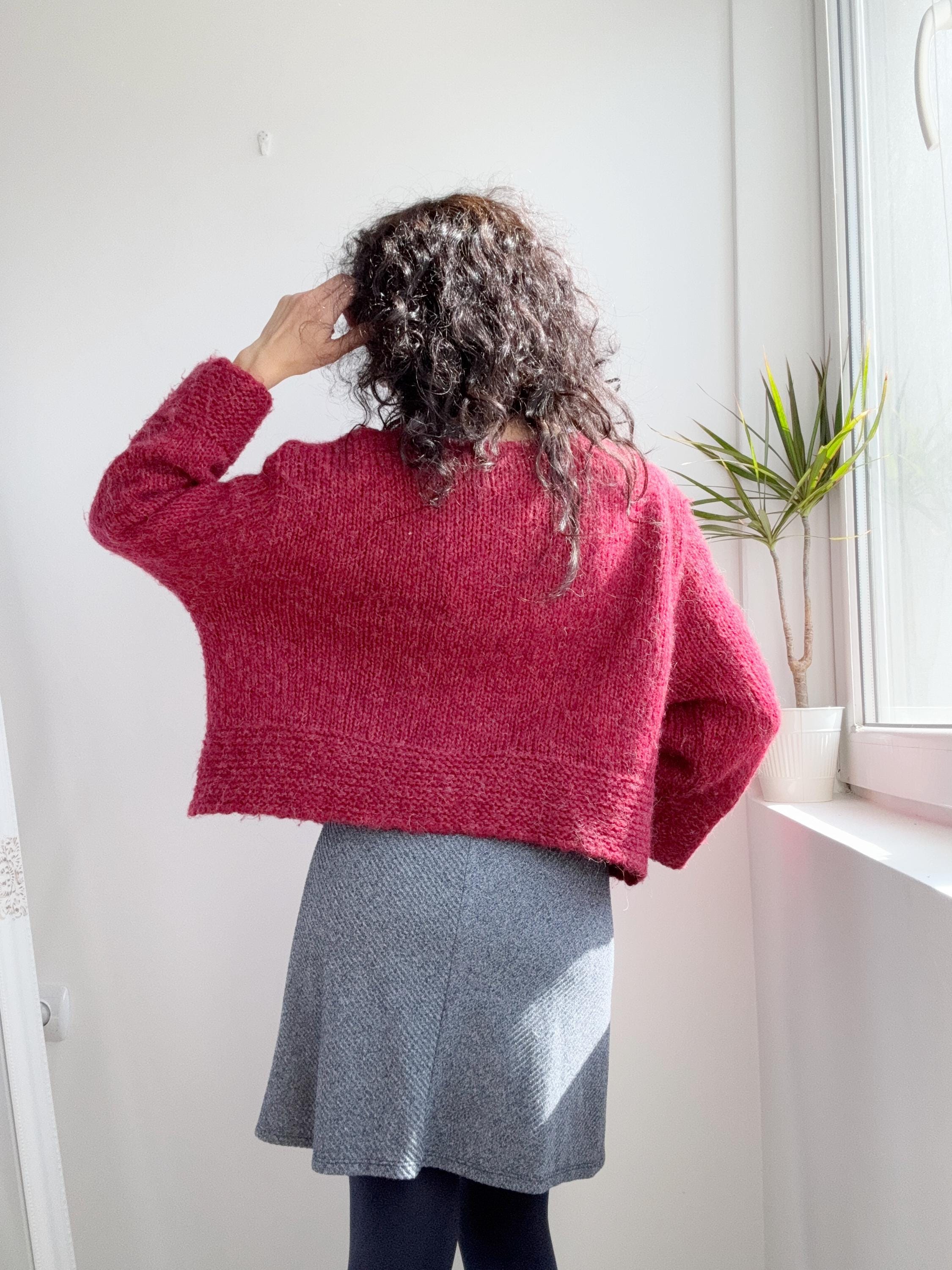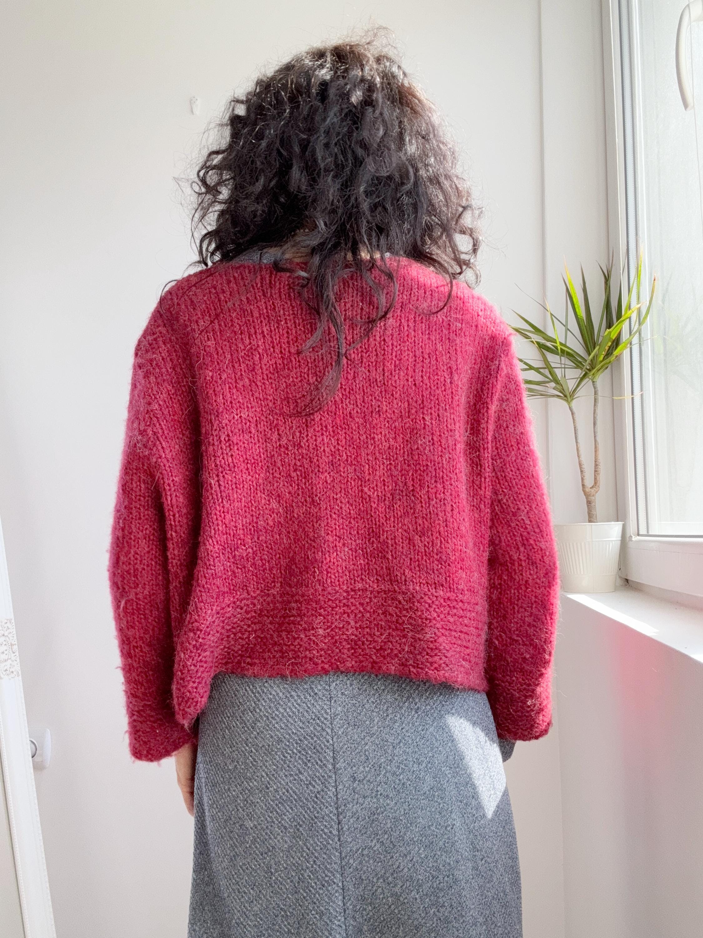 This stunning vintage cardigan sweater from the French label Clin Paris is the perfect blend of cozy comfort and effortless chic. Featuring a rich, deep red (almost raspberry) hue, this mohair style cardigan stands out with its beautiful textured knit and classic loose fit design. The silhouette is slightly cropped with a relaxed, boxy fit and elegant wide sleeves, making it an ideal layering piece over dresses or high-waisted denim.