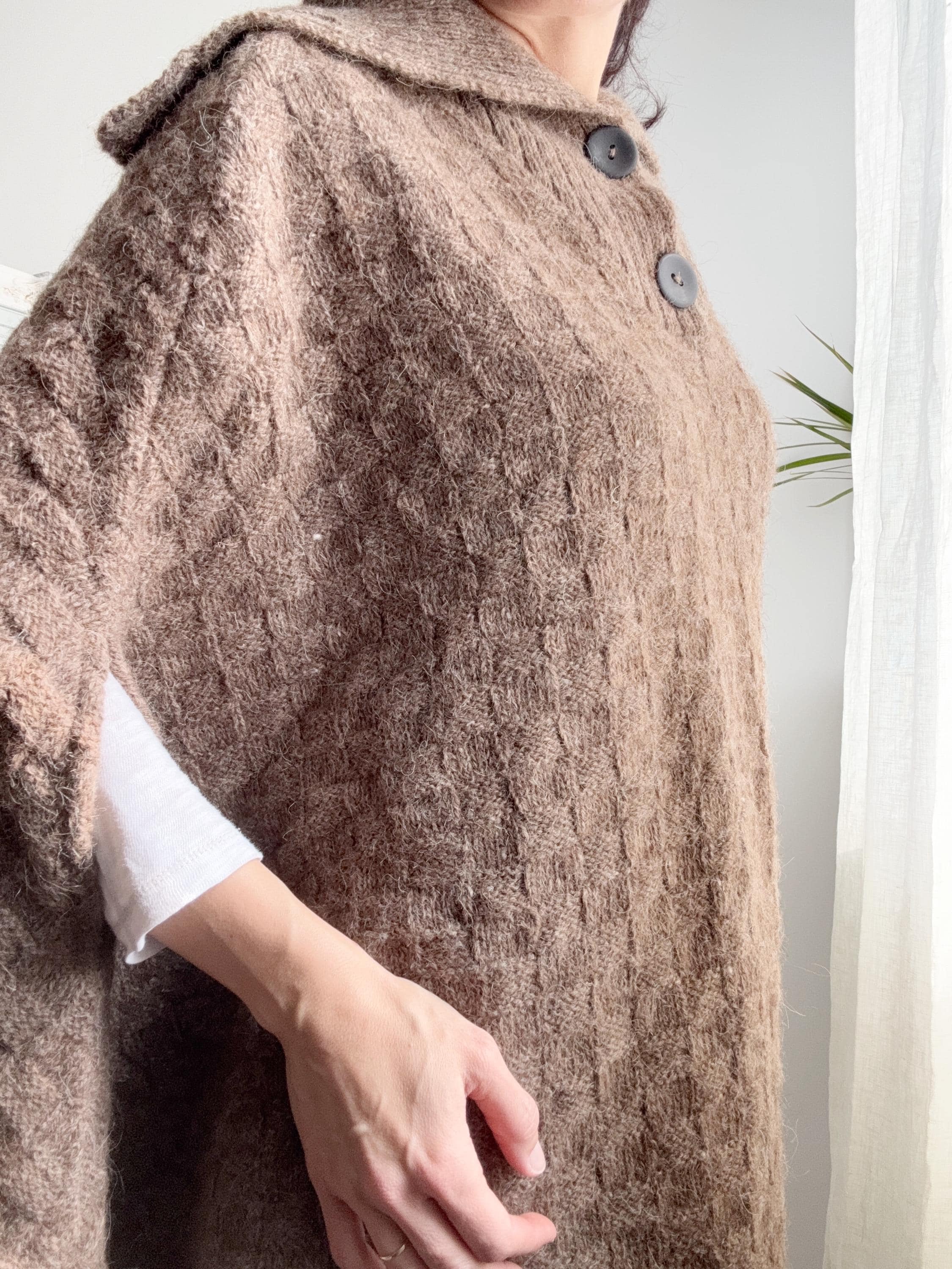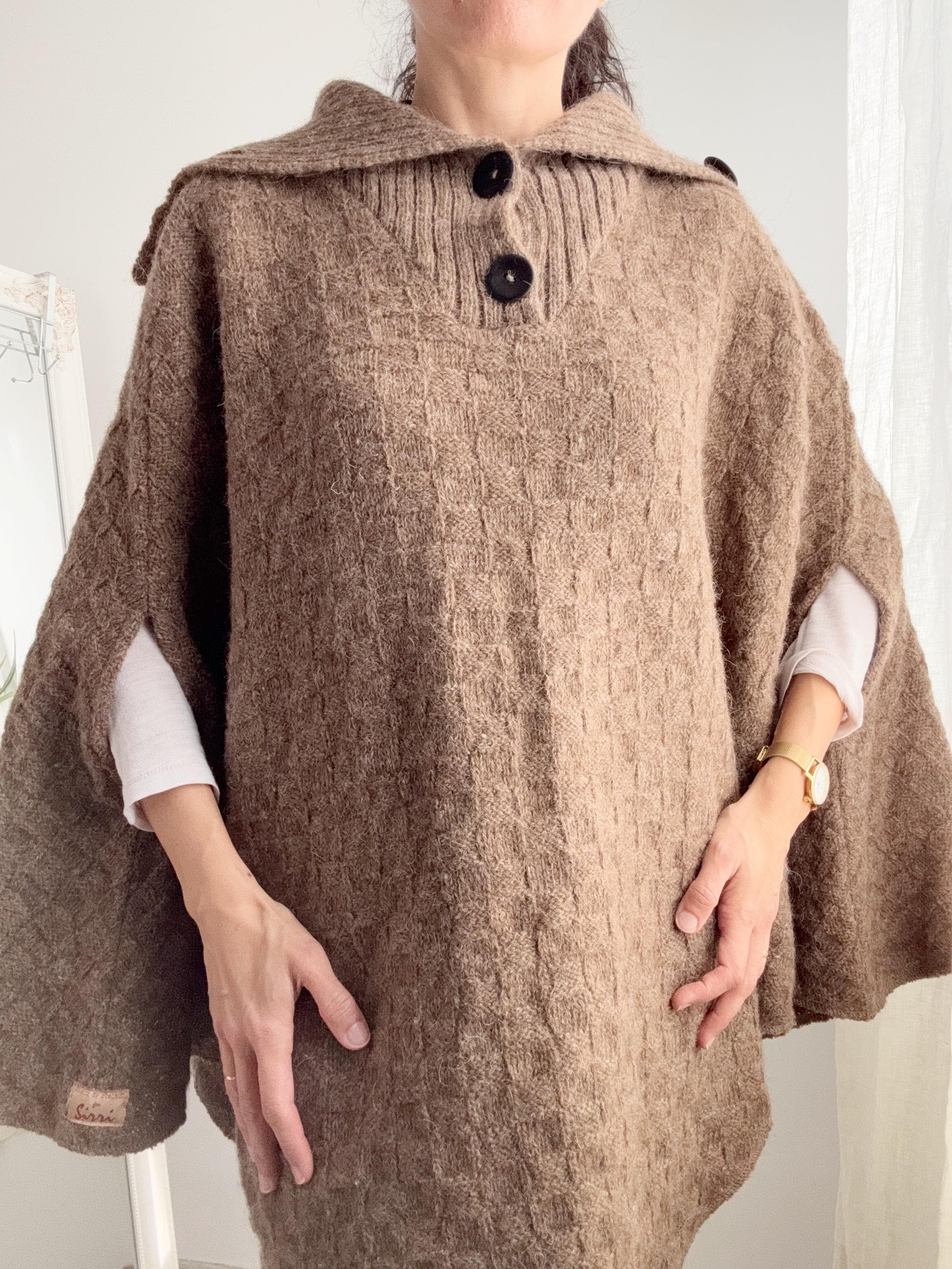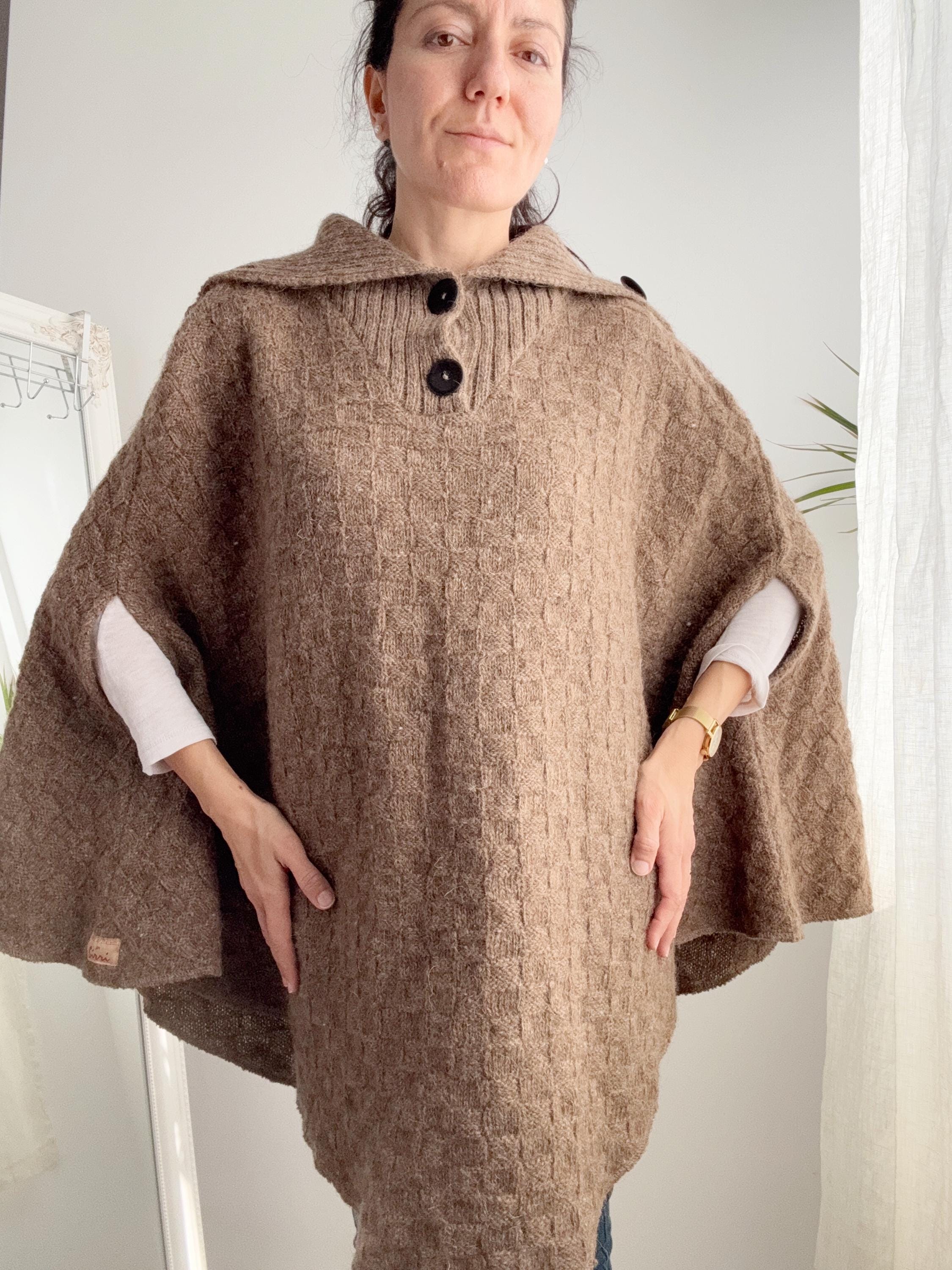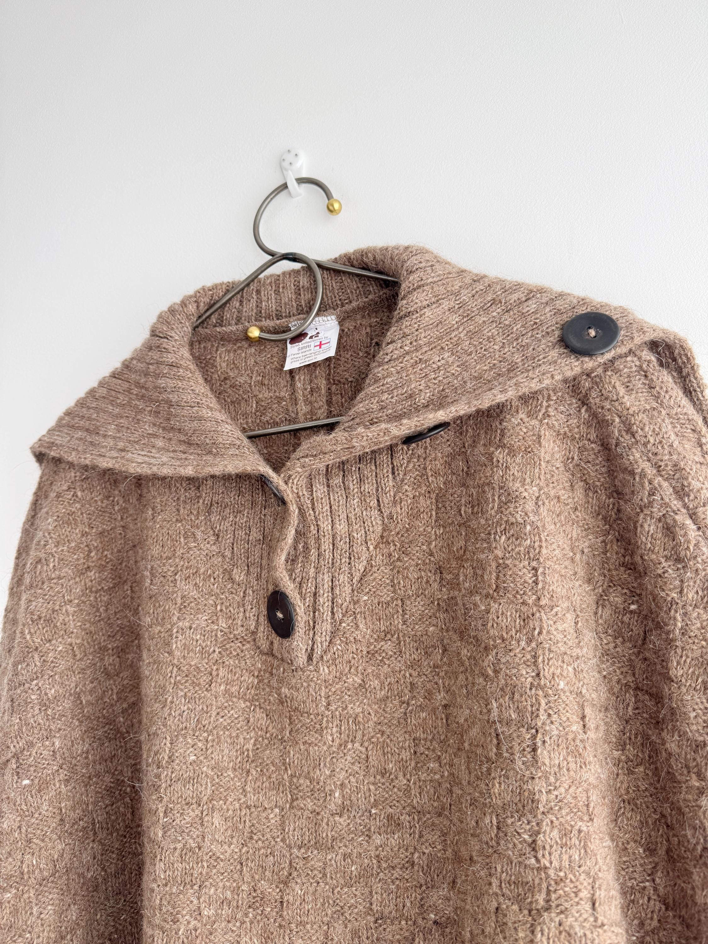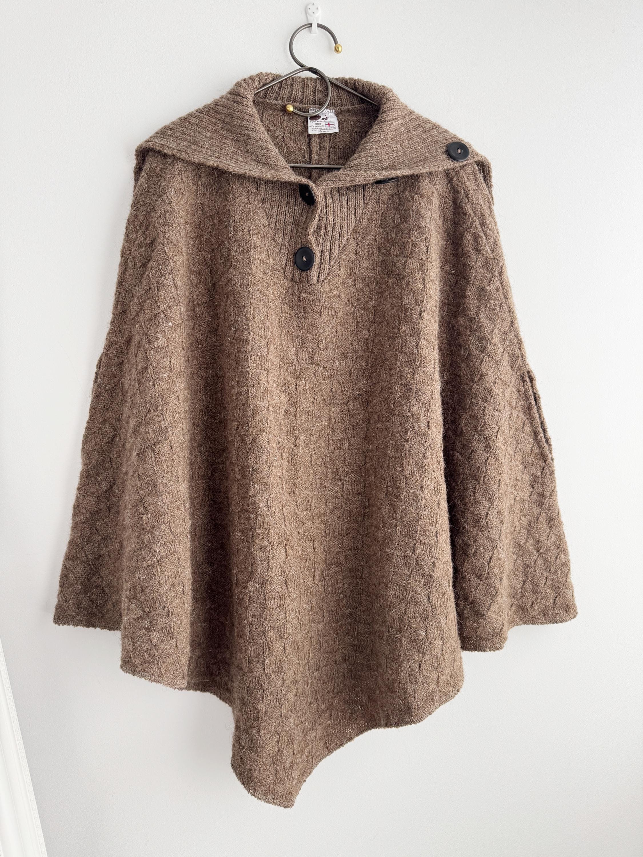 This is an exquisite vintage 100% Faroese wool poncho top. This camel brown wool poncho is crafted by Johanna av Steinum for SIRRI, this unisex faroese wool poncho is a testament to the rugged beauty of the Faroe Islands. Made from 100% pure Faroese wool, the knit features a unique textured "brick" or "basketweave" pattern that provides incredible depth and warmth.