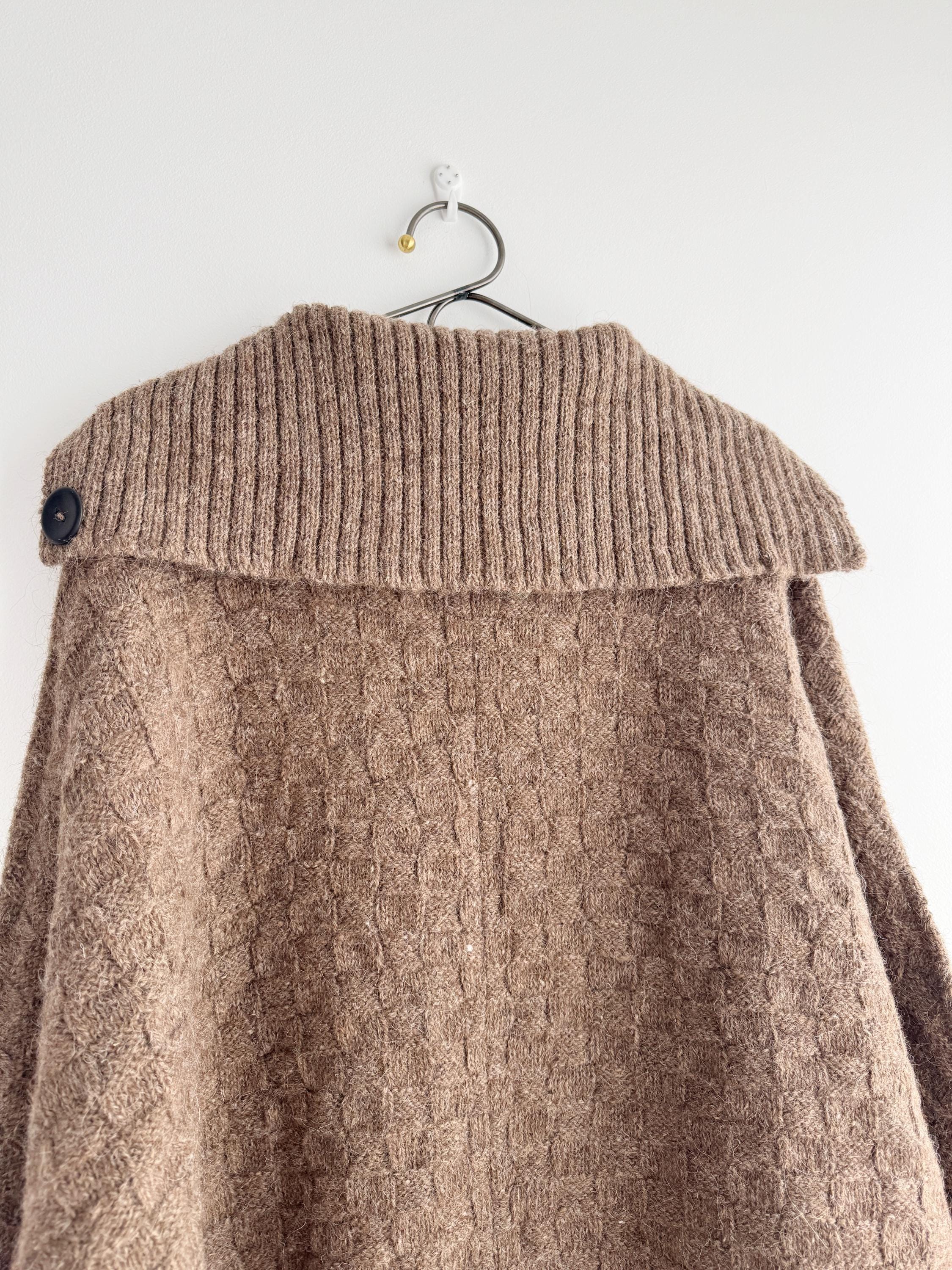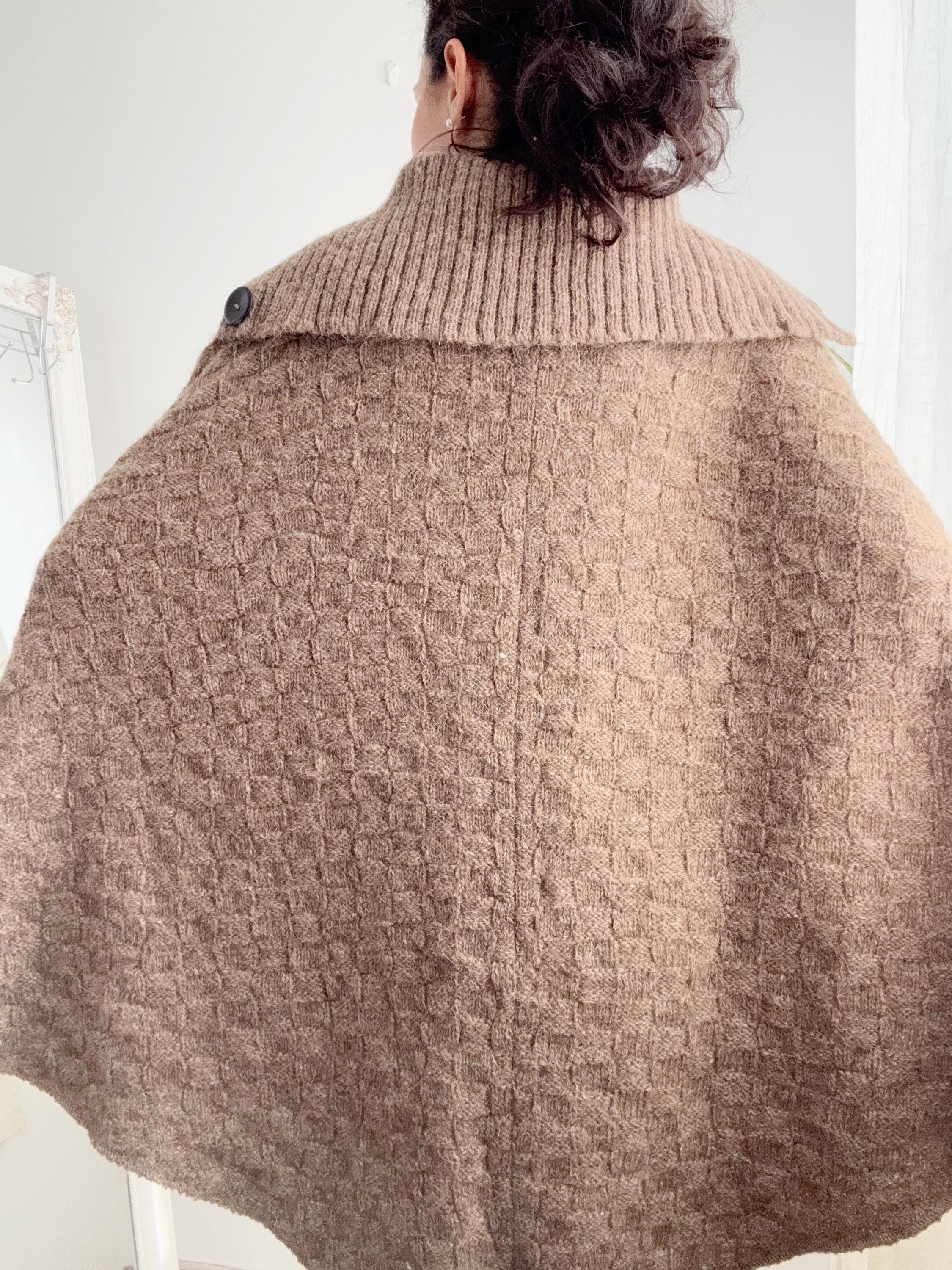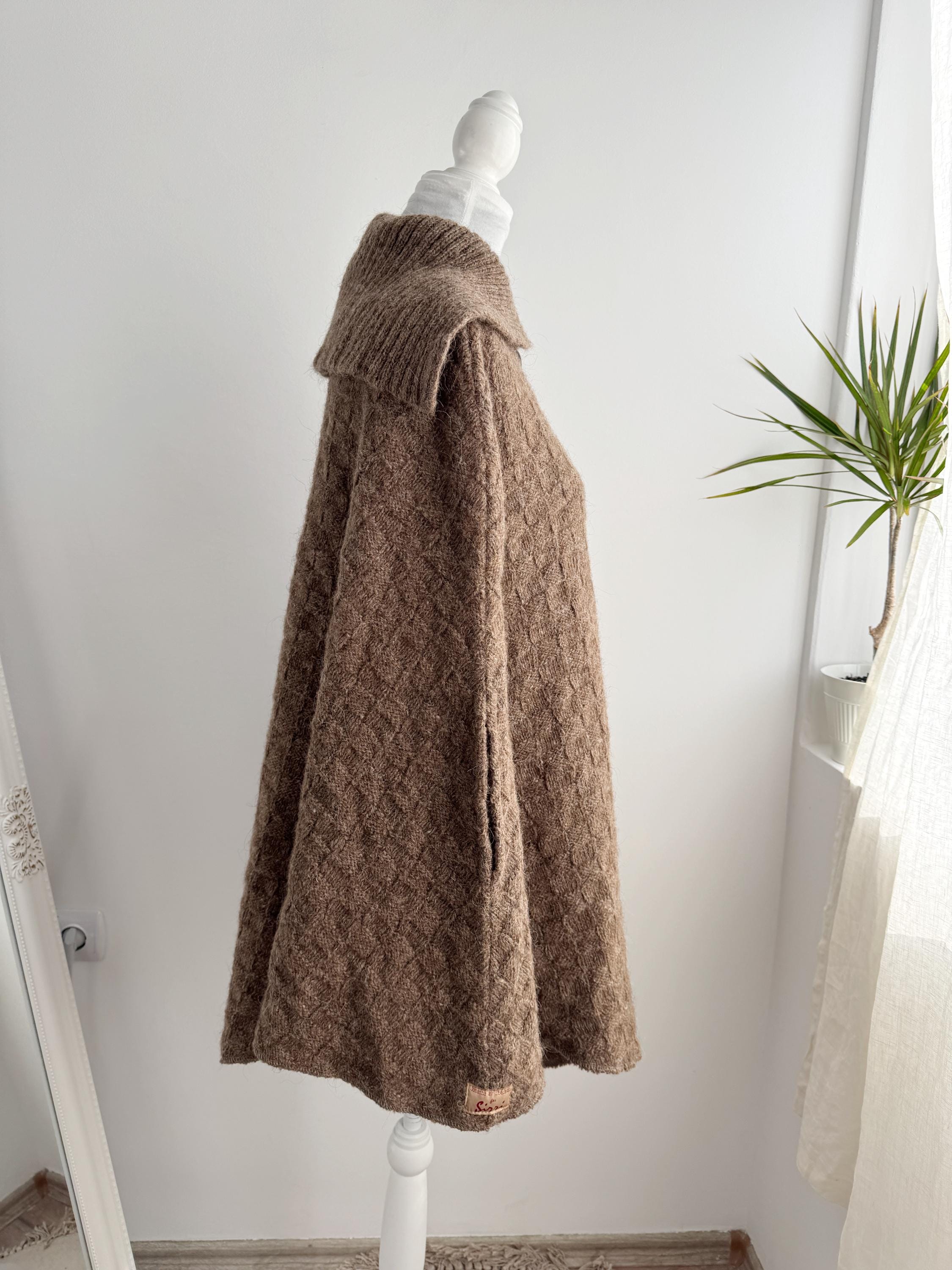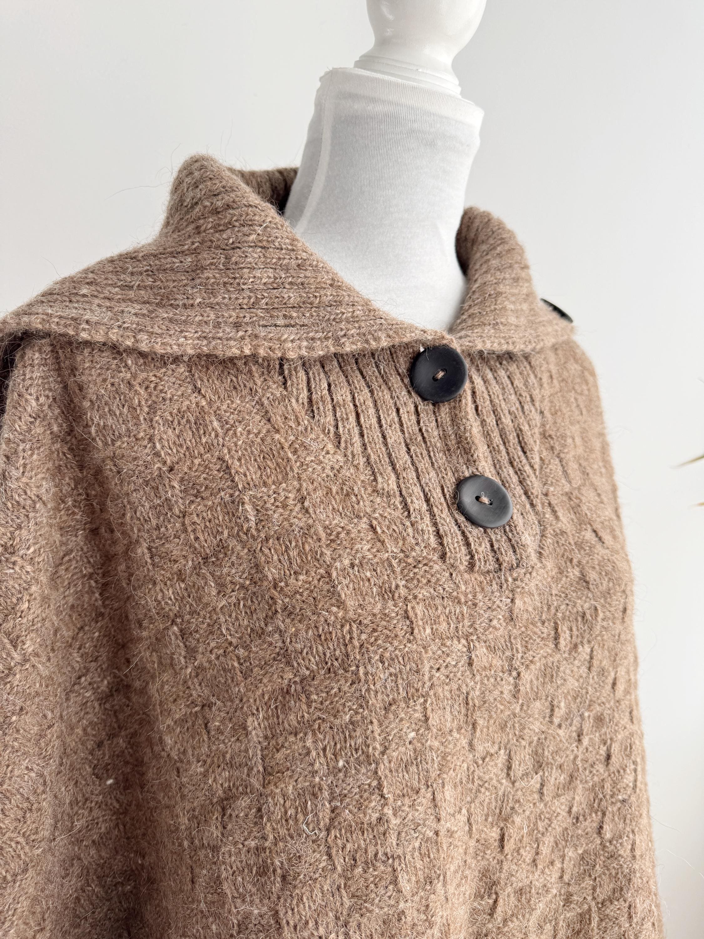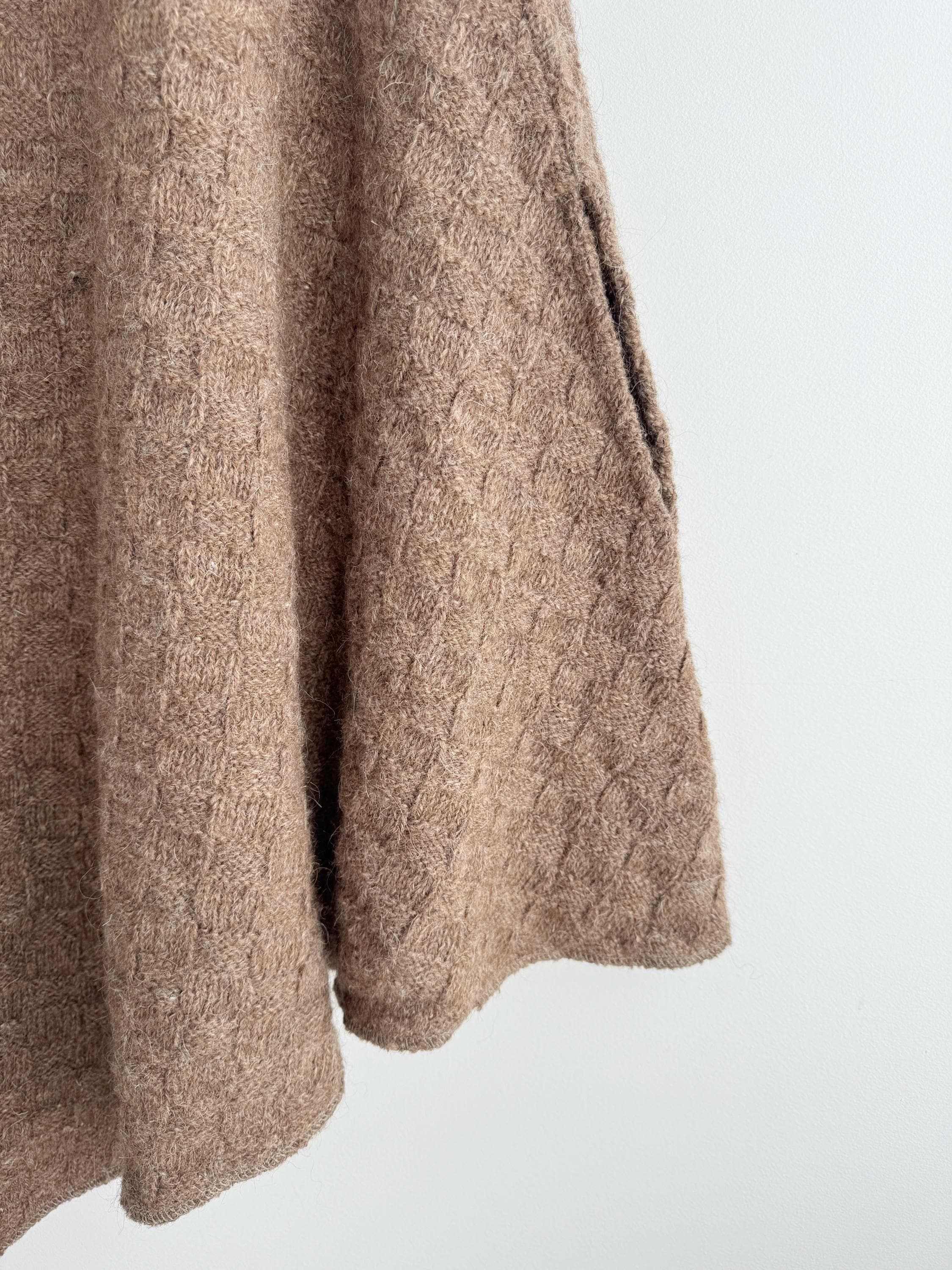 This is an exquisite vintage 100% Faroese wool poncho top. This camel brown wool poncho is crafted by Johanna av Steinum for SIRRI, this unisex faroese wool poncho is a testament to the rugged beauty of the Faroe Islands. Made from 100% pure Faroese wool, the knit features a unique textured "brick" or "basketweave" pattern that provides incredible depth and warmth.