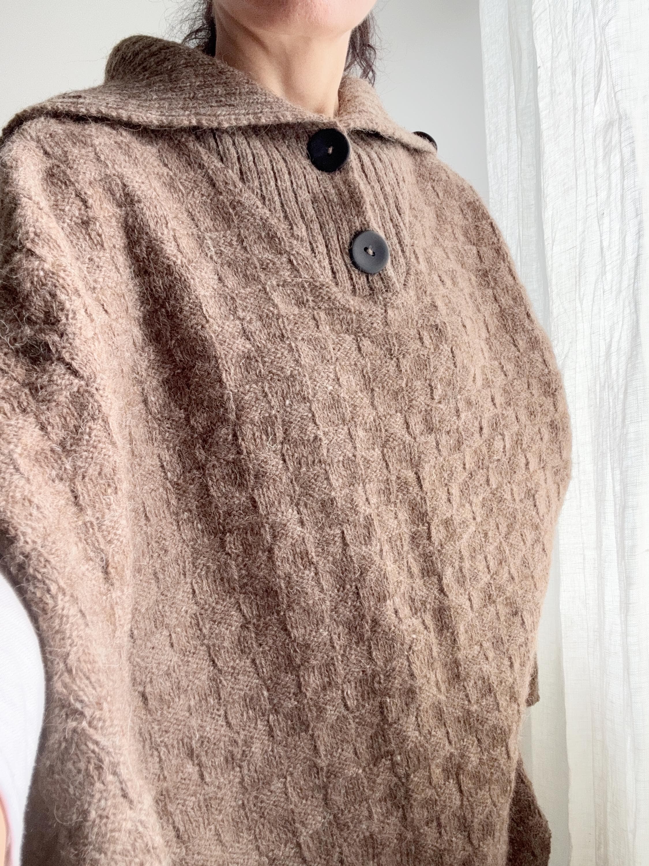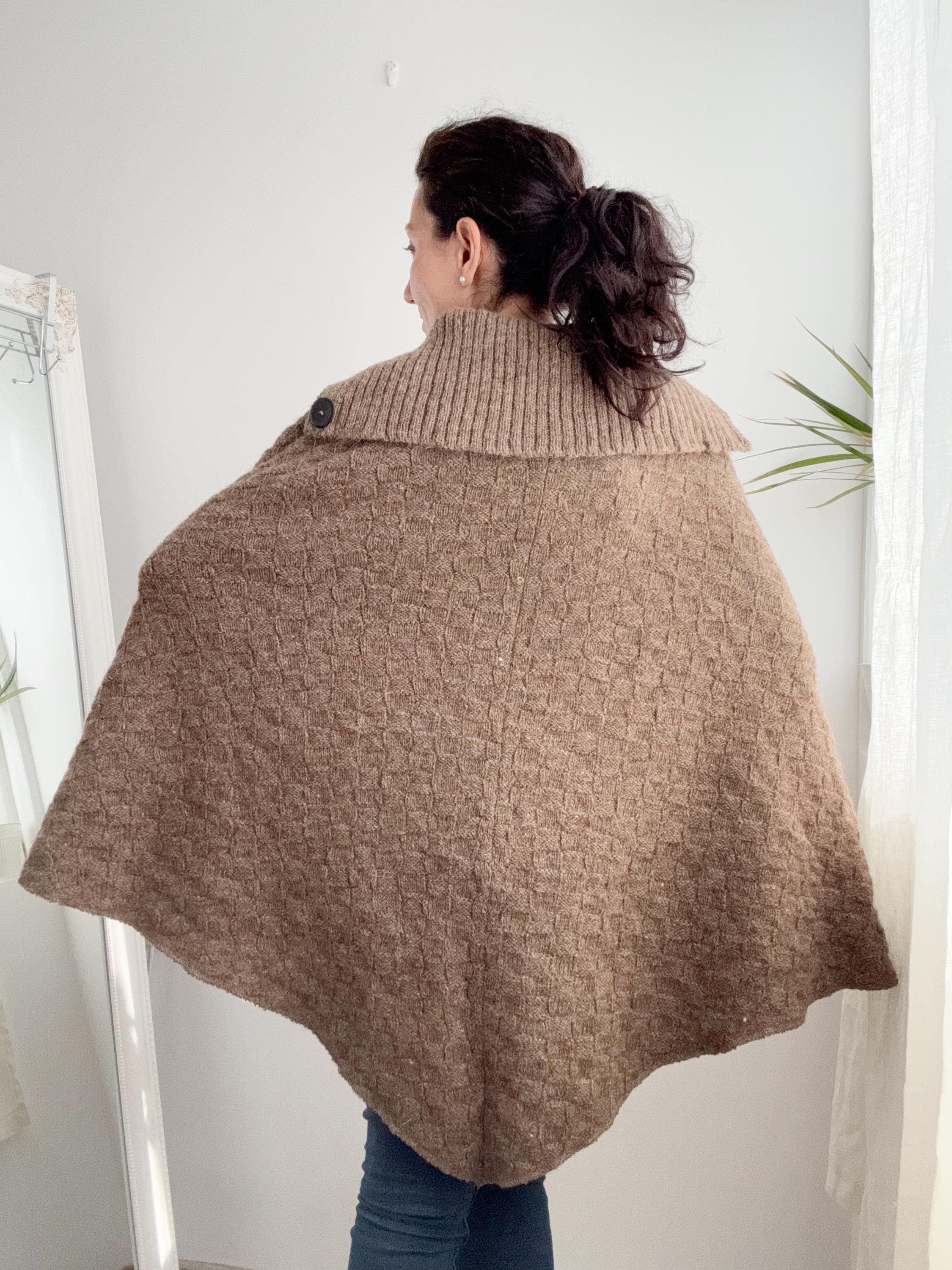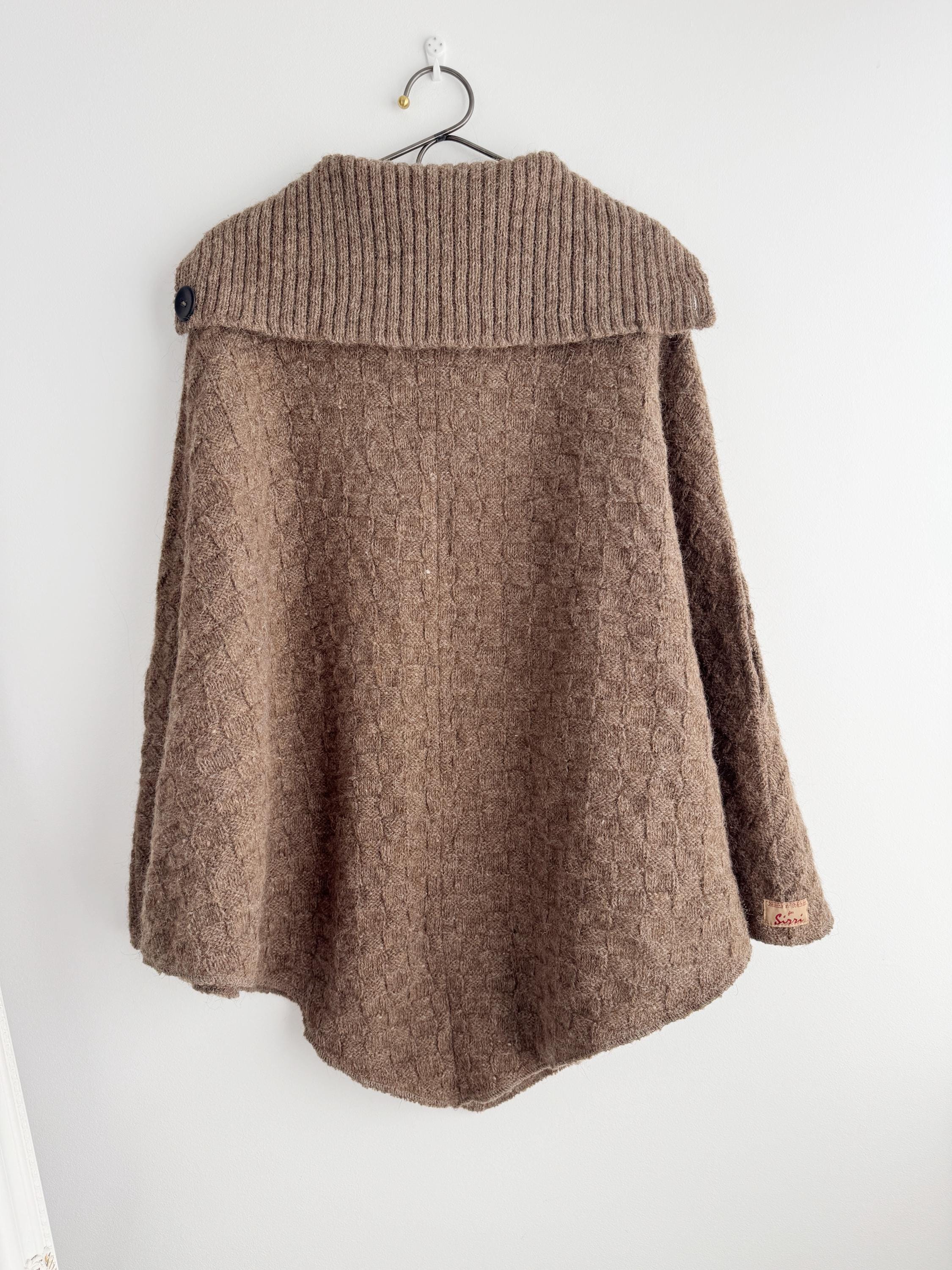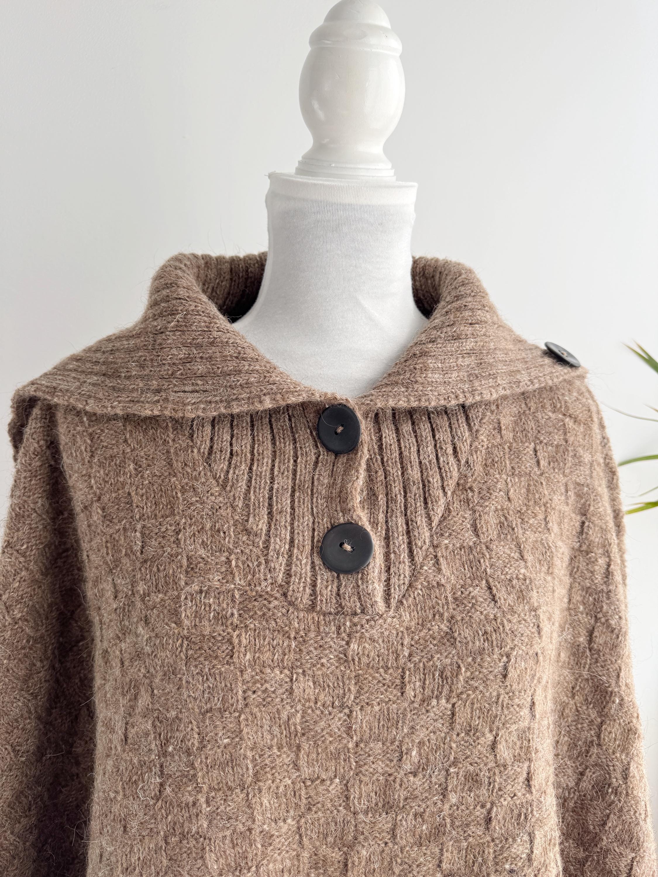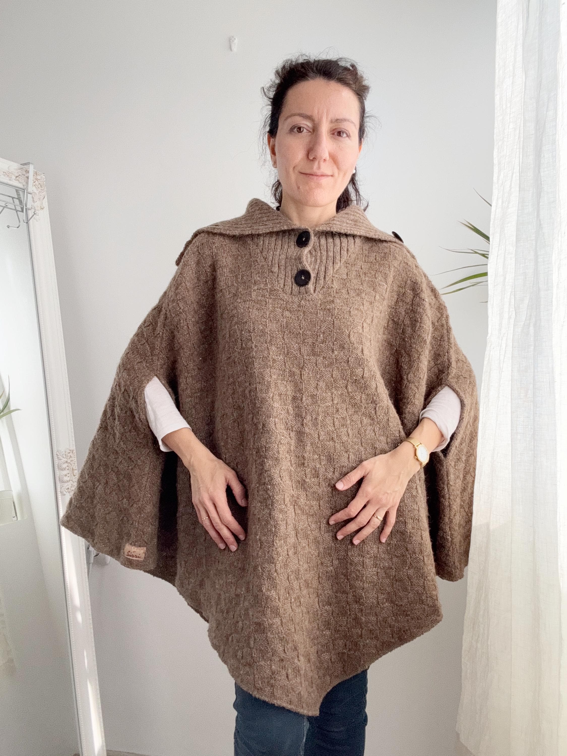 This is an exquisite vintage 100% Faroese wool poncho top. This camel brown wool poncho is crafted by Johanna av Steinum for SIRRI, this unisex faroese wool poncho is a testament to the rugged beauty of the Faroe Islands. Made from 100% pure Faroese wool, the knit features a unique textured "brick" or "basketweave" pattern that provides incredible depth and warmth.