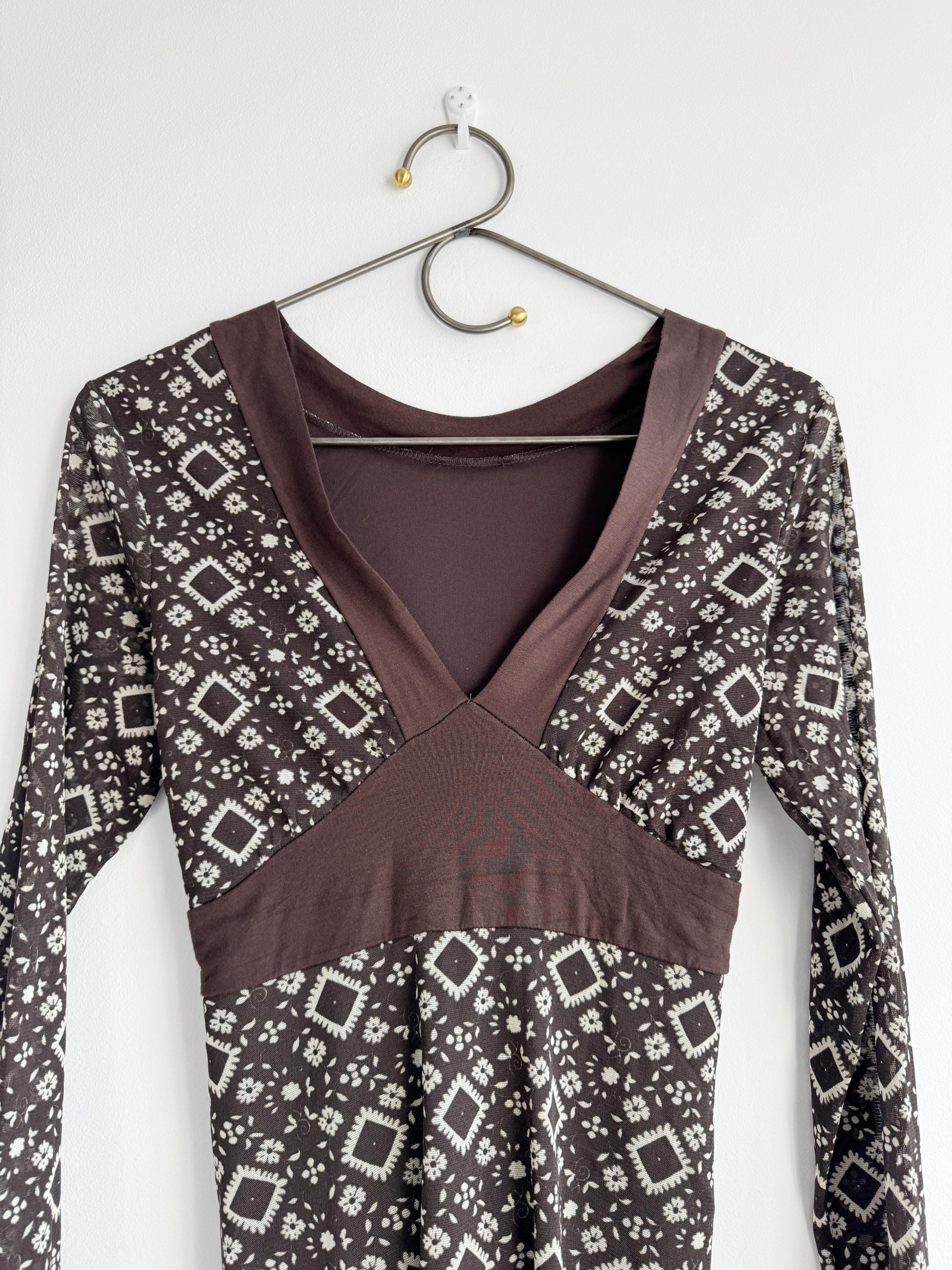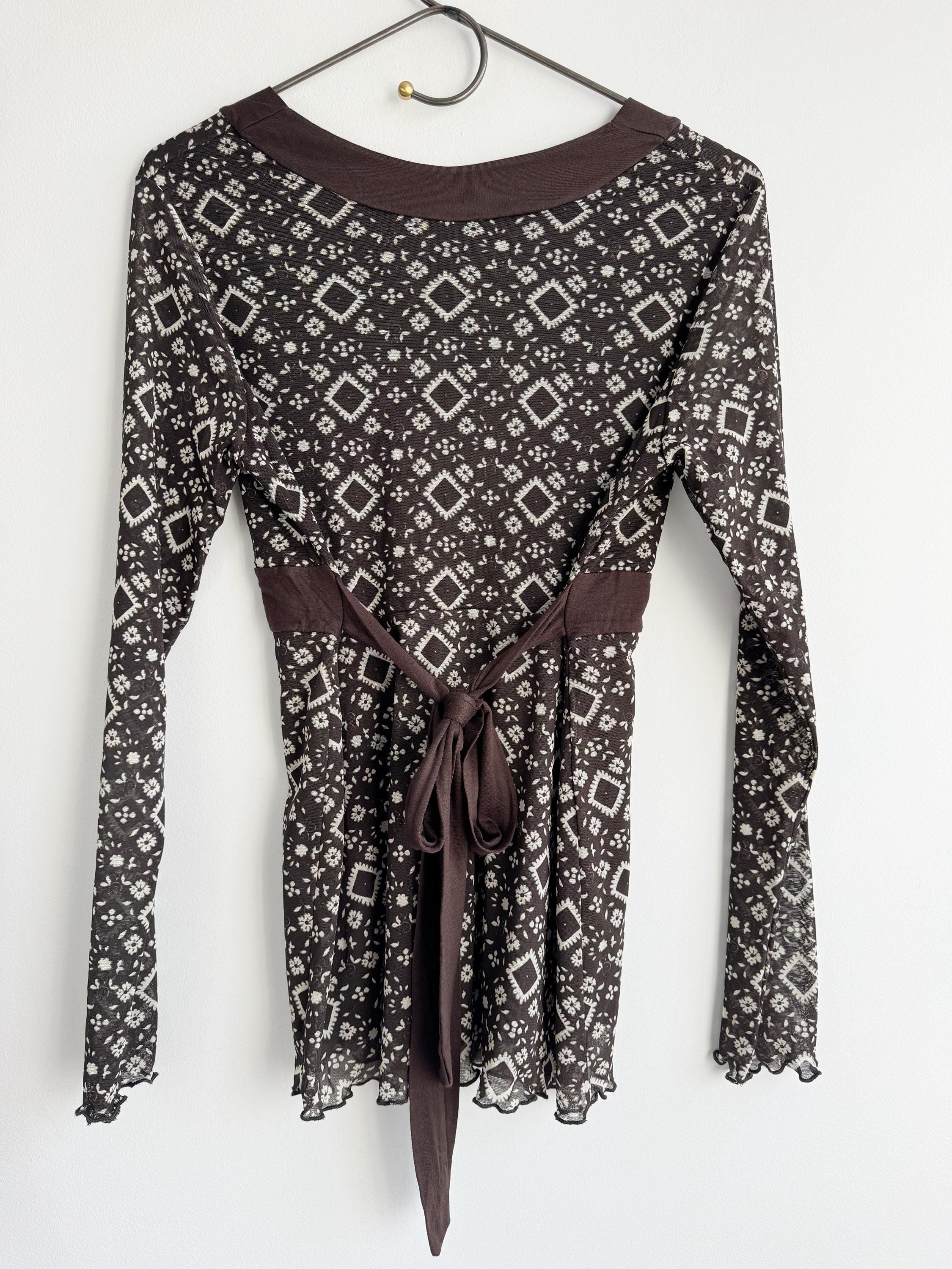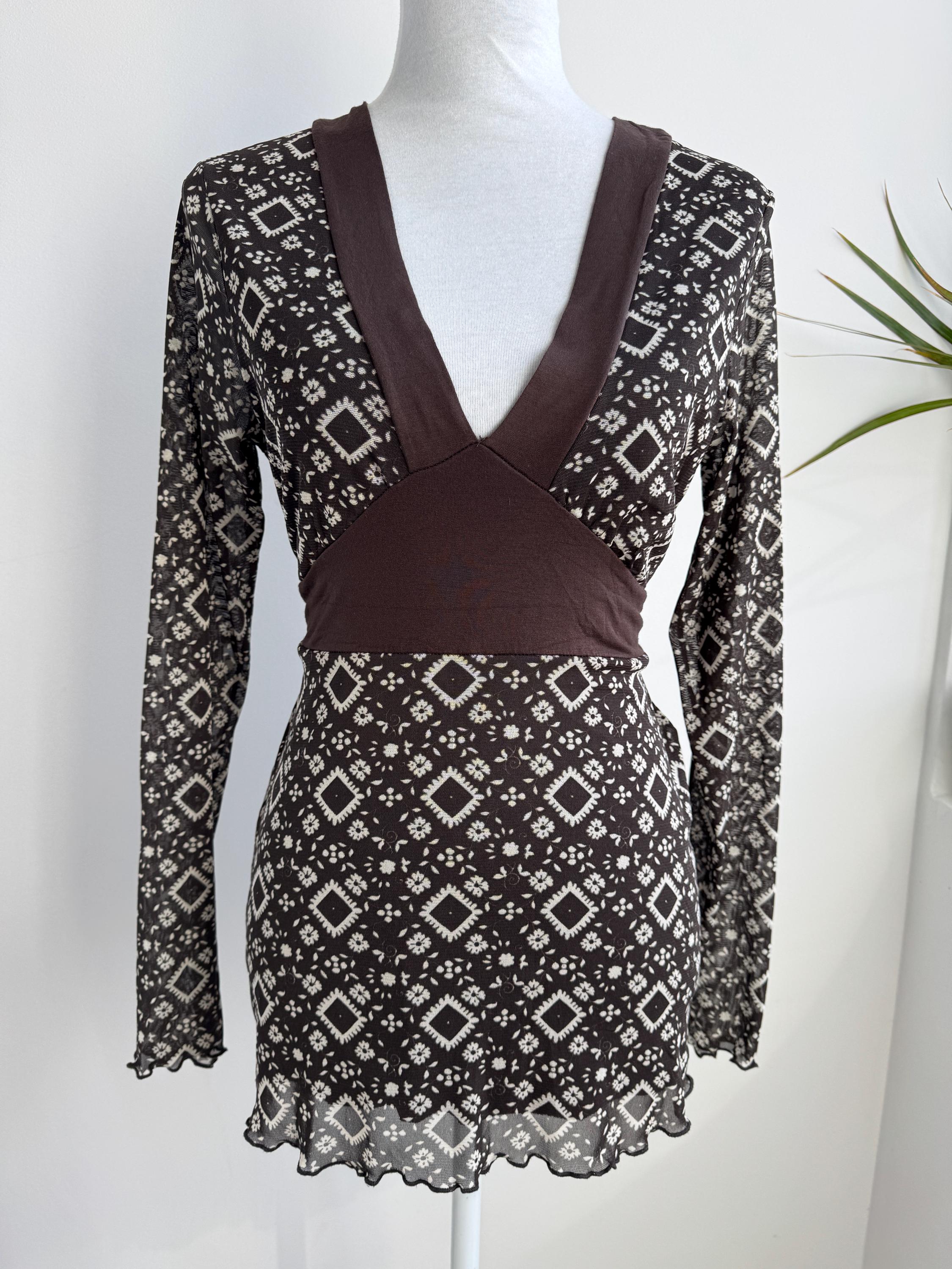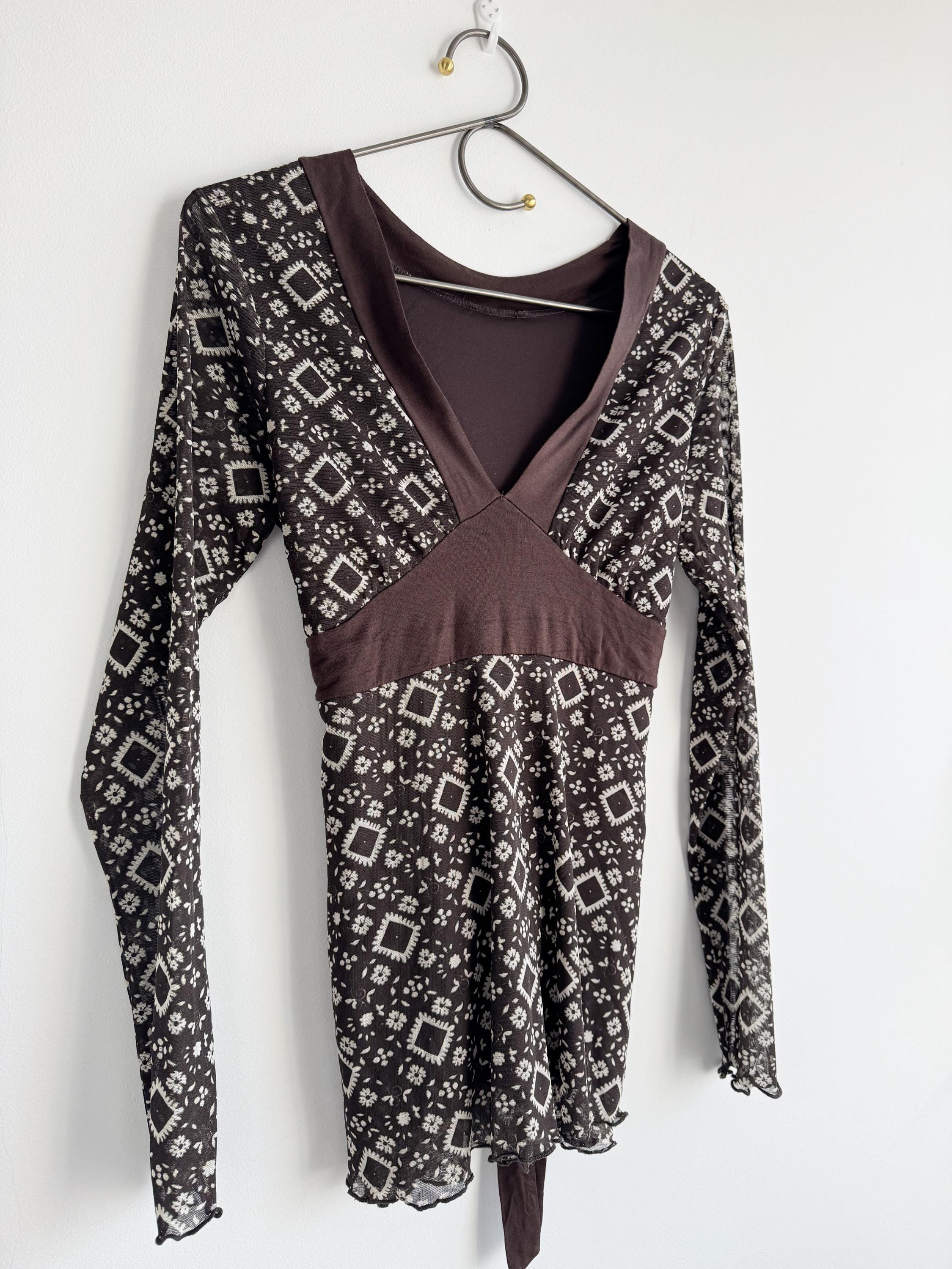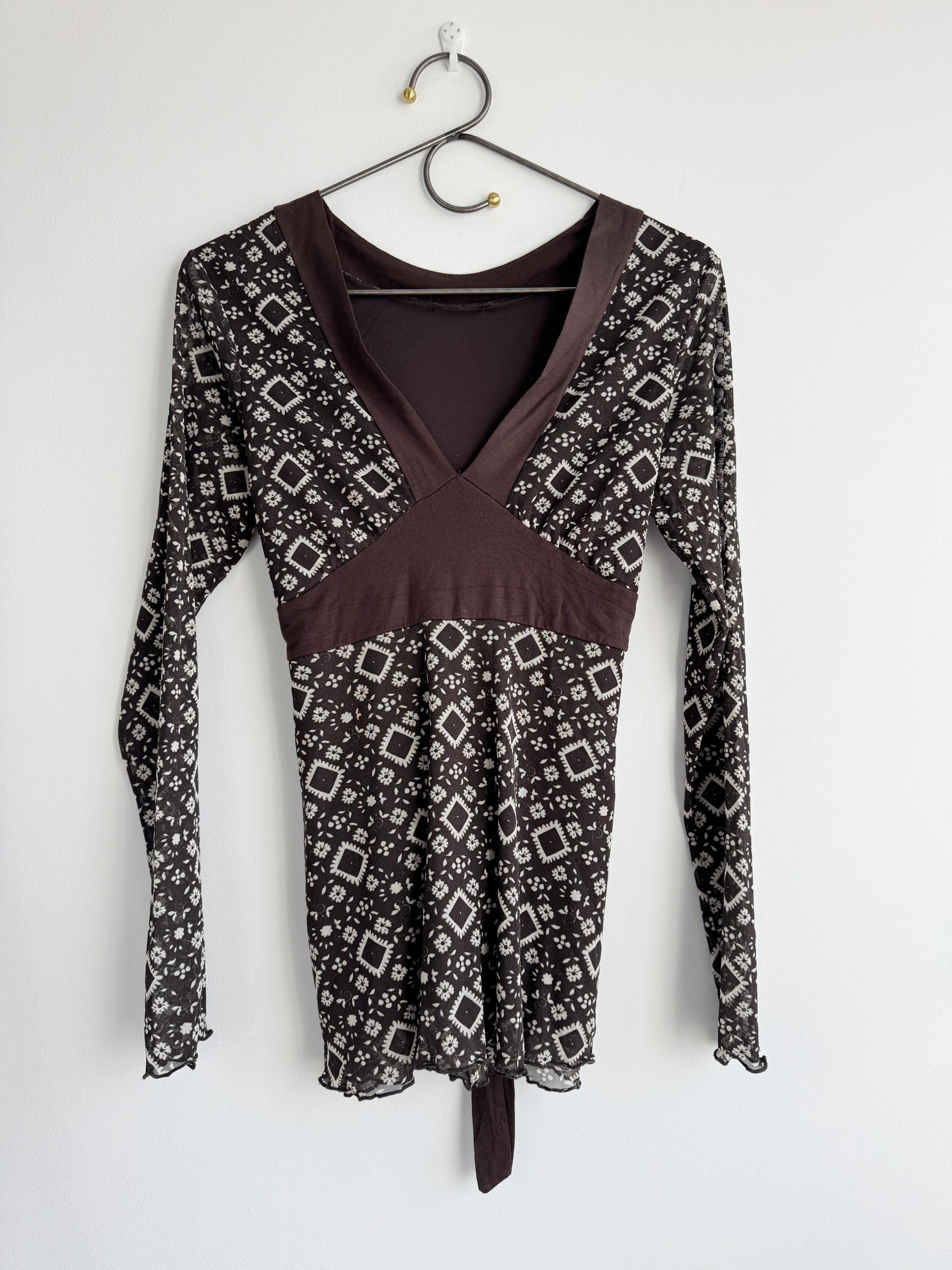 Step into the Y2K archives with this stunning vintage mesh long-sleeve top. Featuring an intricate, earthy geometric "tattoo" style print in shades of chocolate brown and cream, this piece perfectly captures the edgy yet ethereal aesthetic of the late 90s and early 2000s.