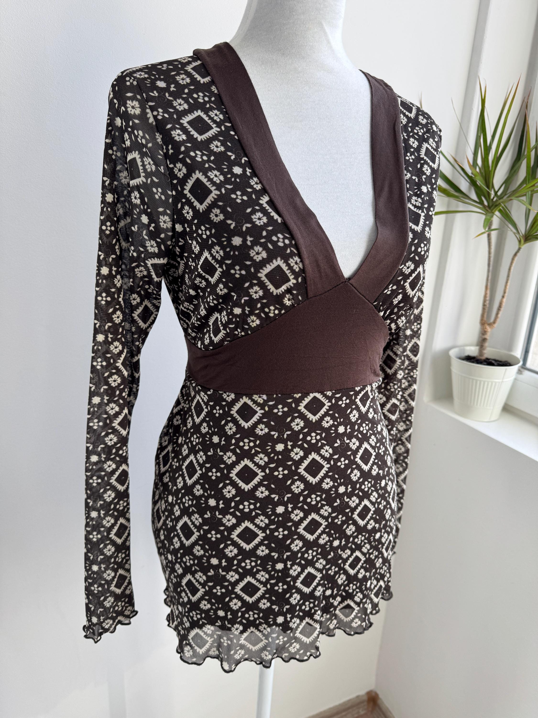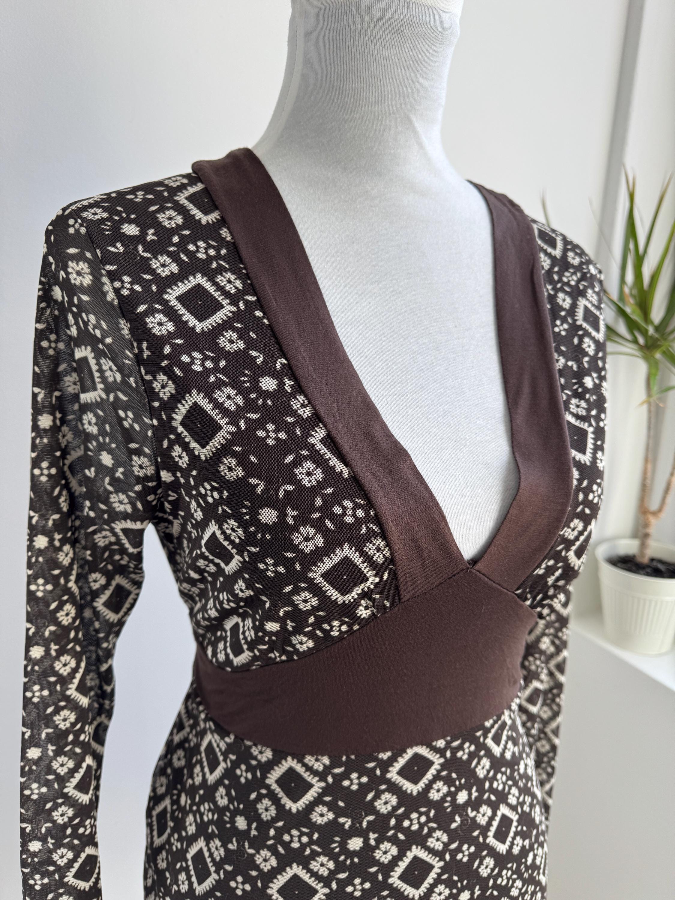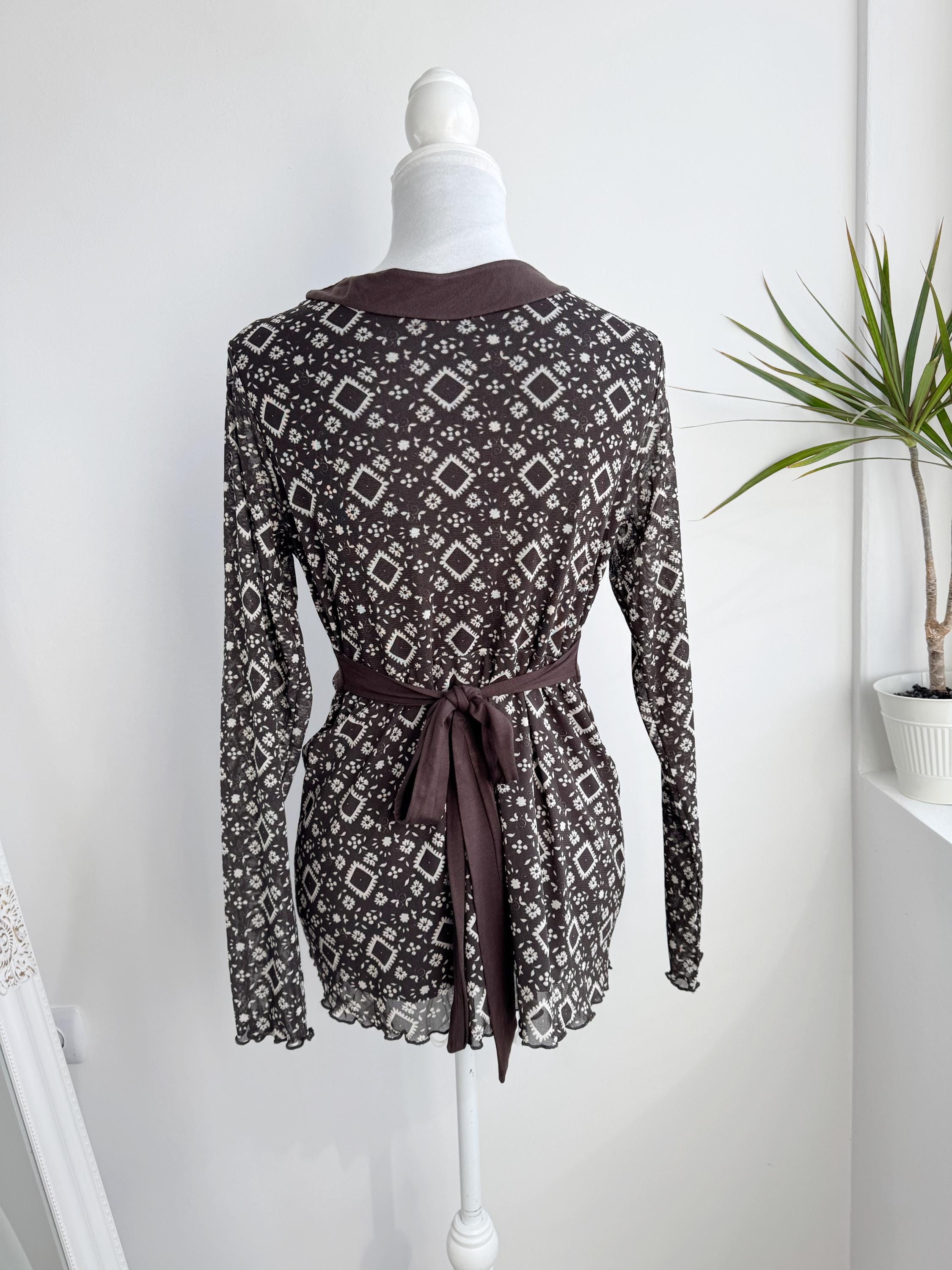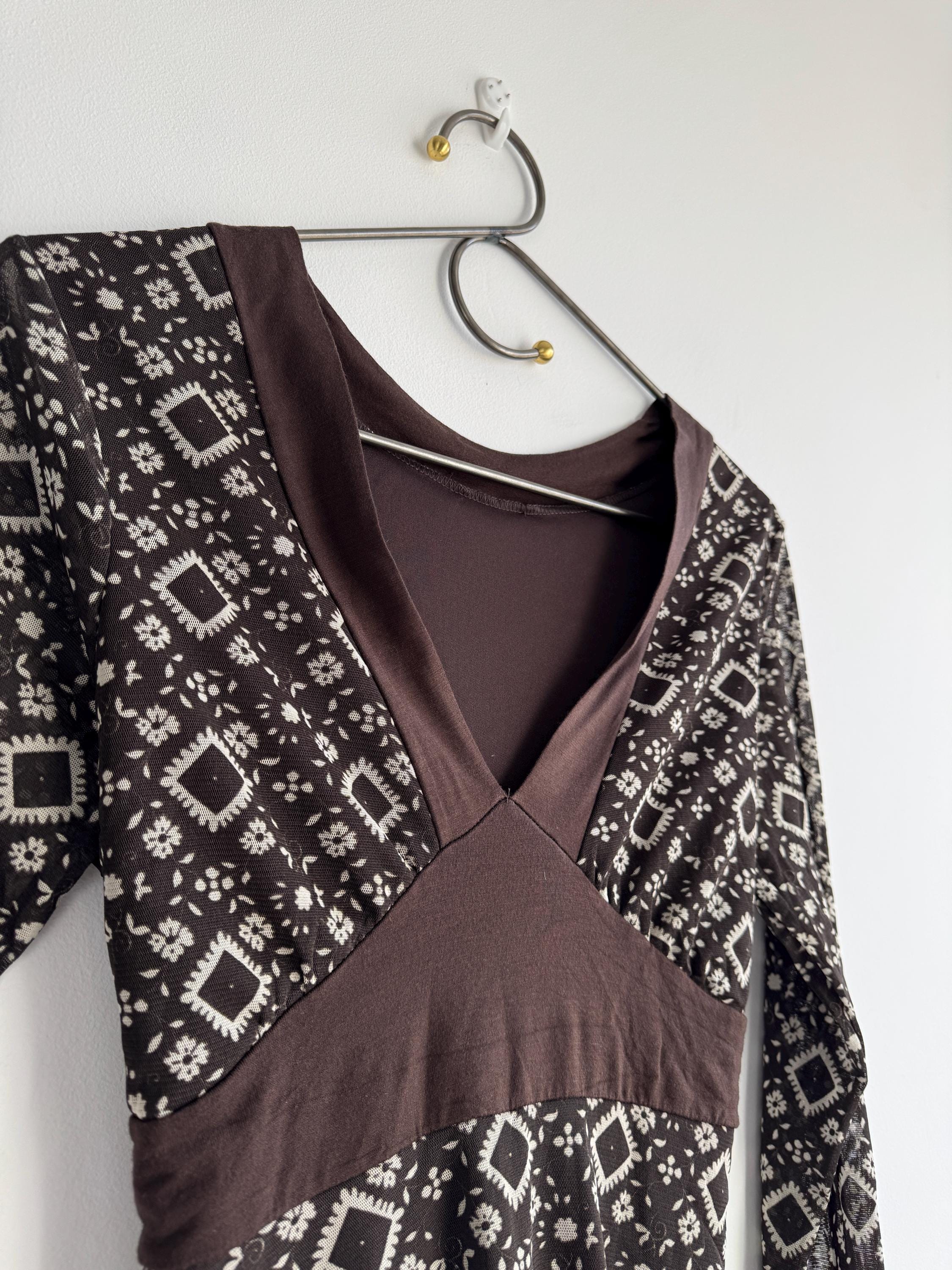 Step into the Y2K archives with this stunning vintage mesh long-sleeve top. Featuring an intricate, earthy geometric "tattoo" style print in shades of chocolate brown and cream, this piece perfectly captures the edgy yet ethereal aesthetic of the late 90s and early 2000s.