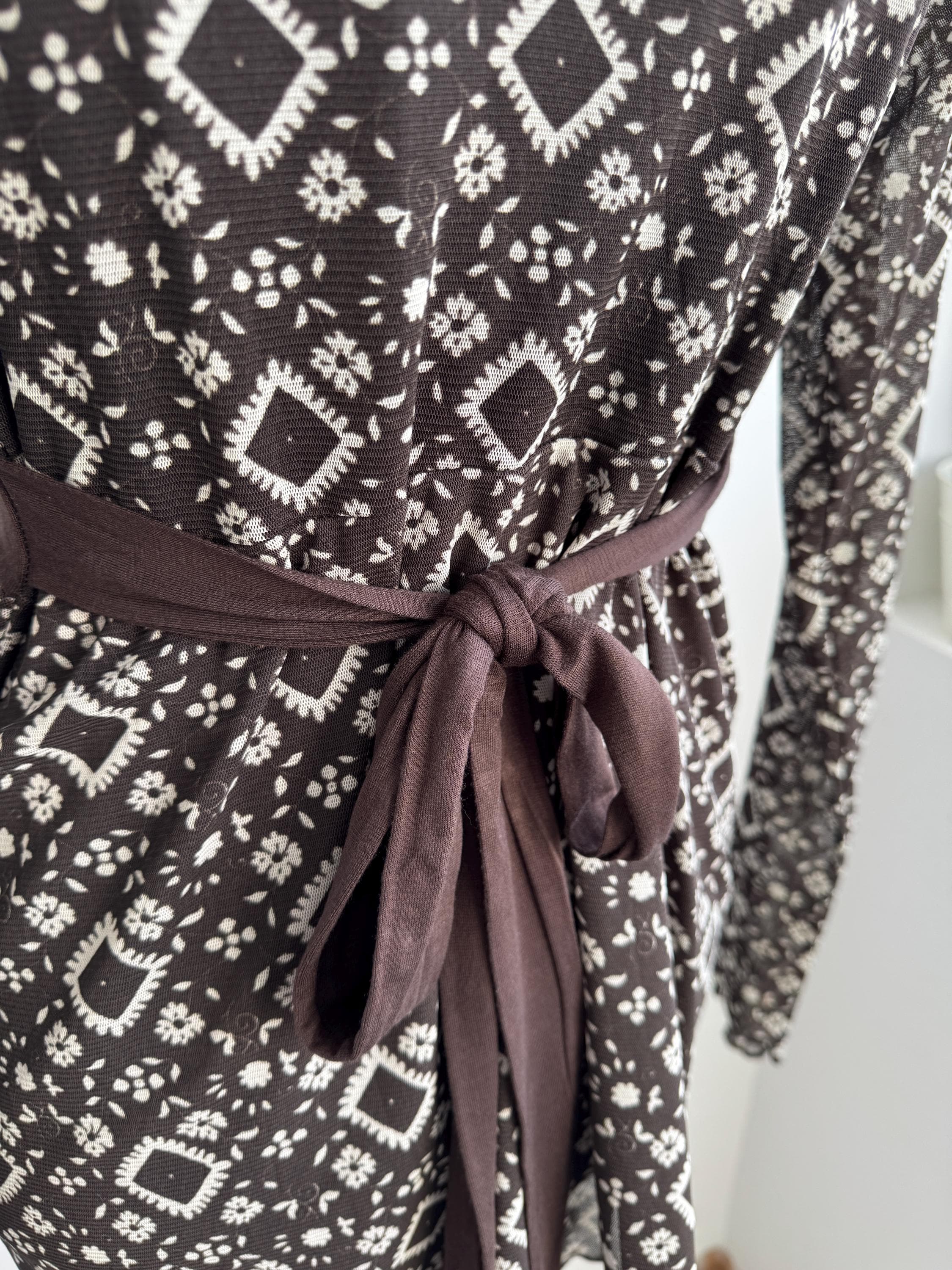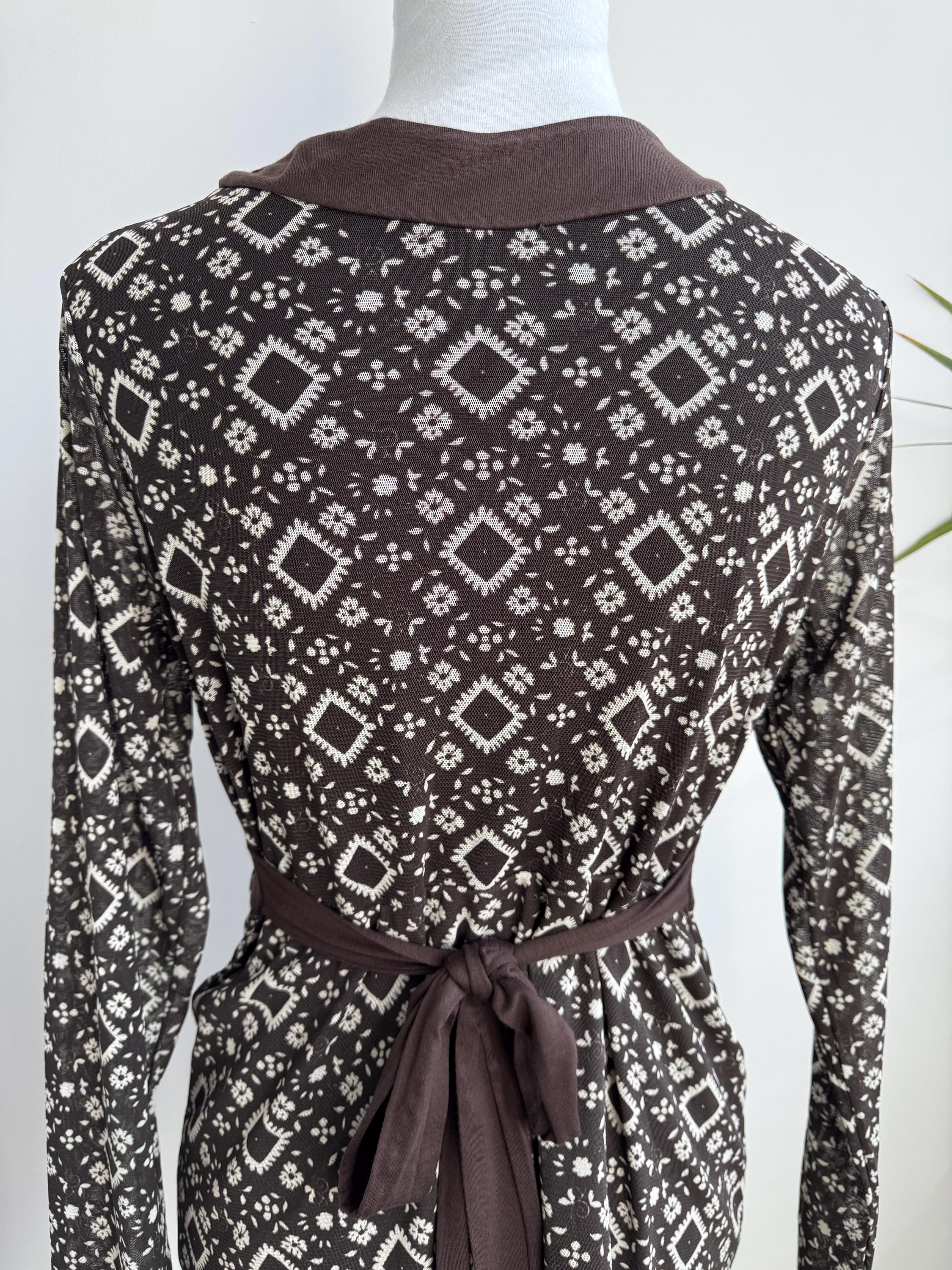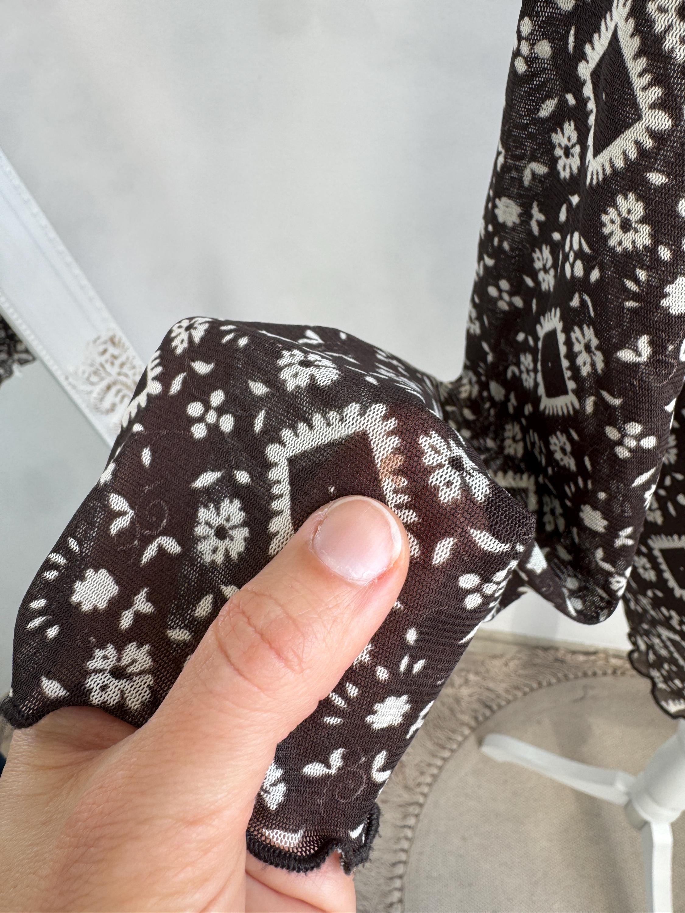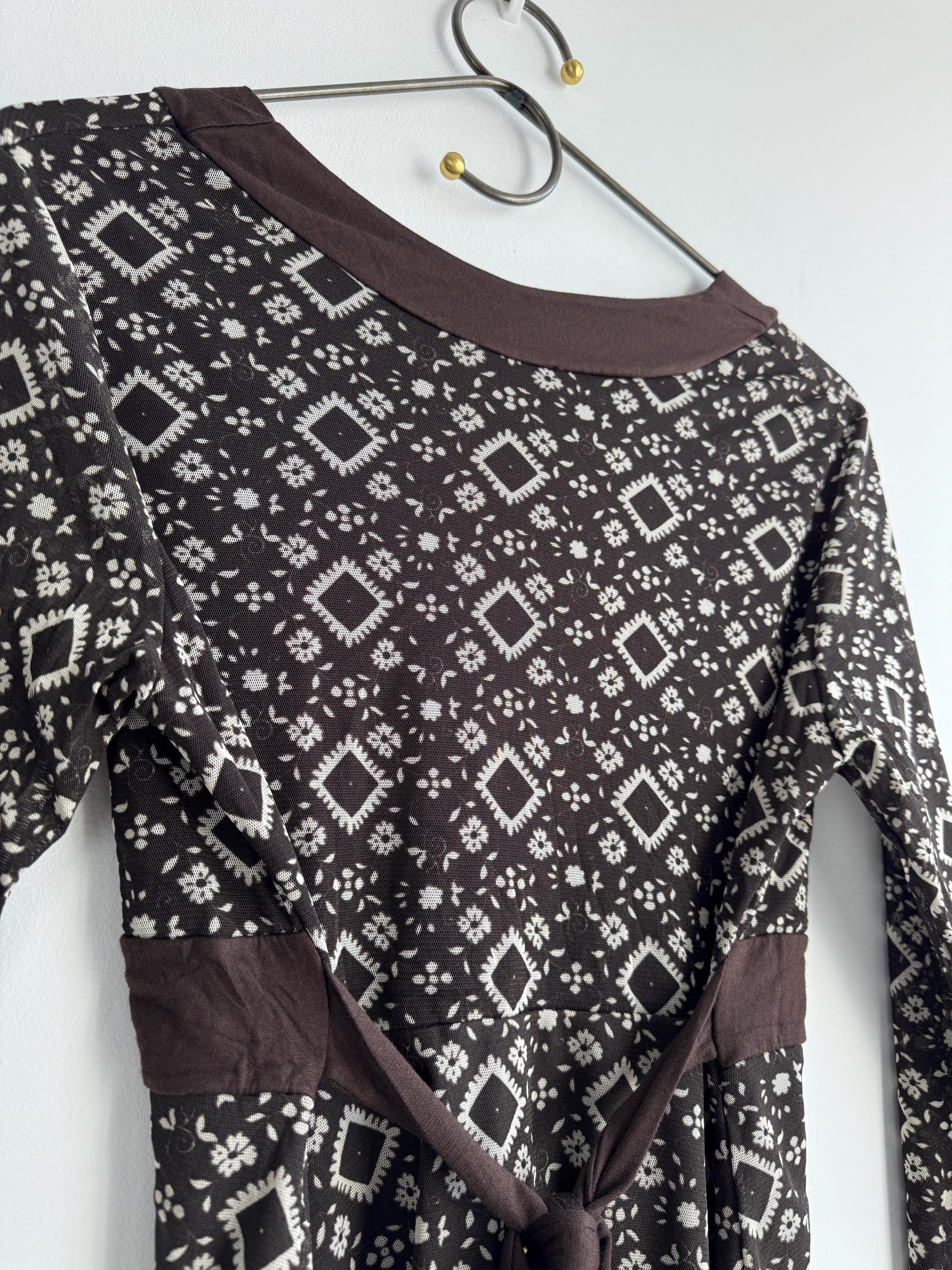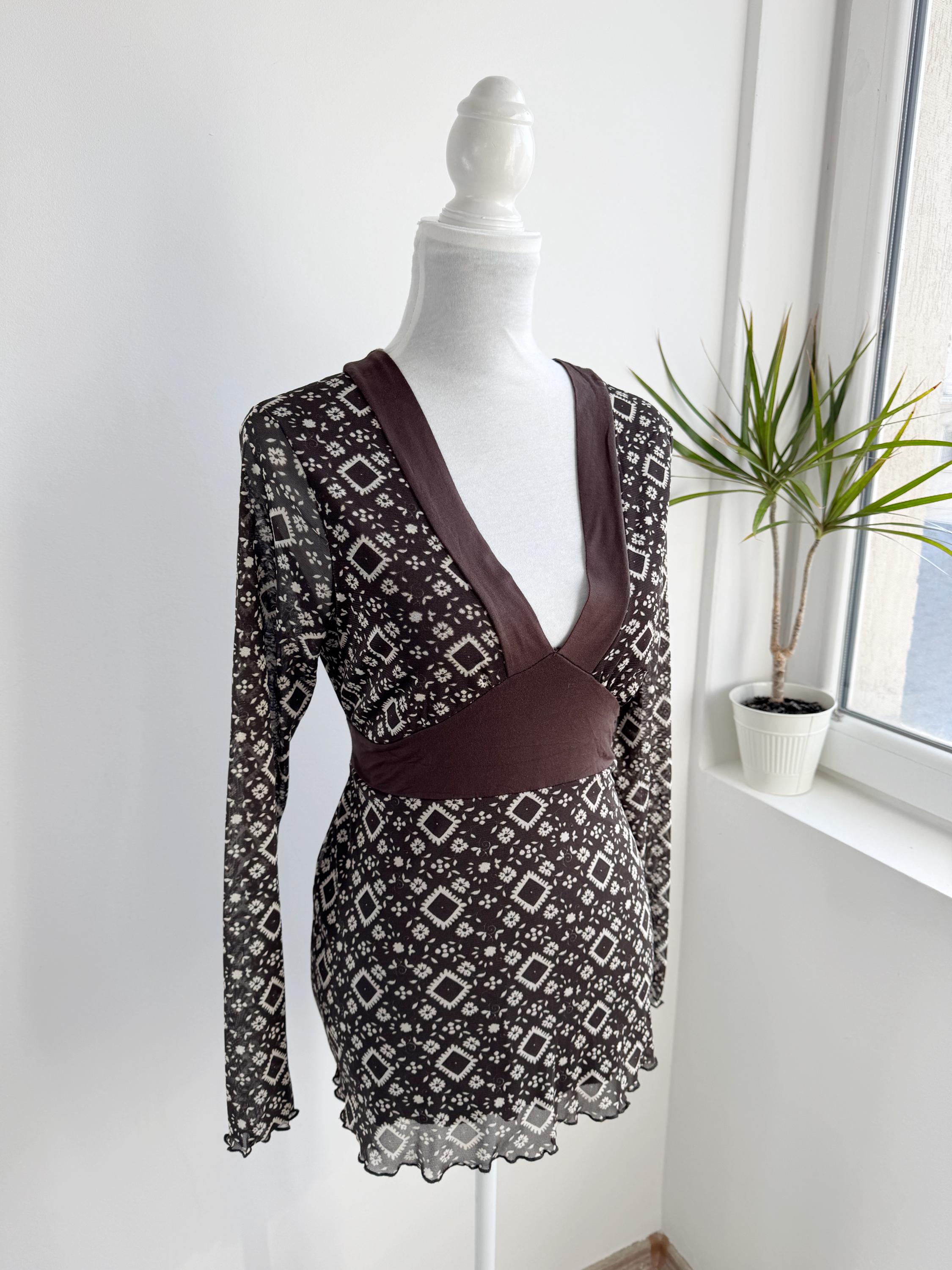 Step into the Y2K archives with this stunning vintage mesh long-sleeve top. Featuring an intricate, earthy geometric "tattoo" style print in shades of chocolate brown and cream, this piece perfectly captures the edgy yet ethereal aesthetic of the late 90s and early 2000s.