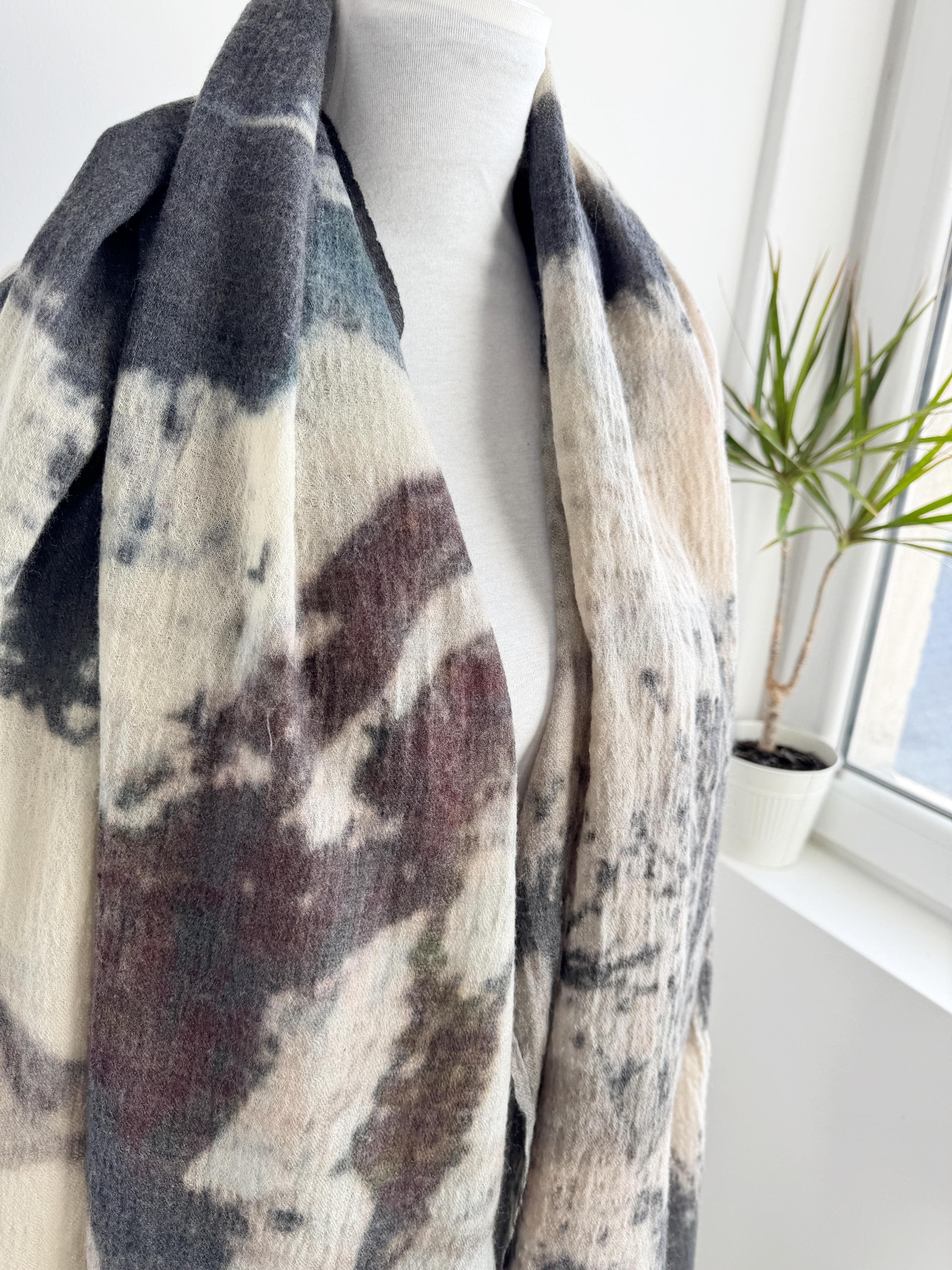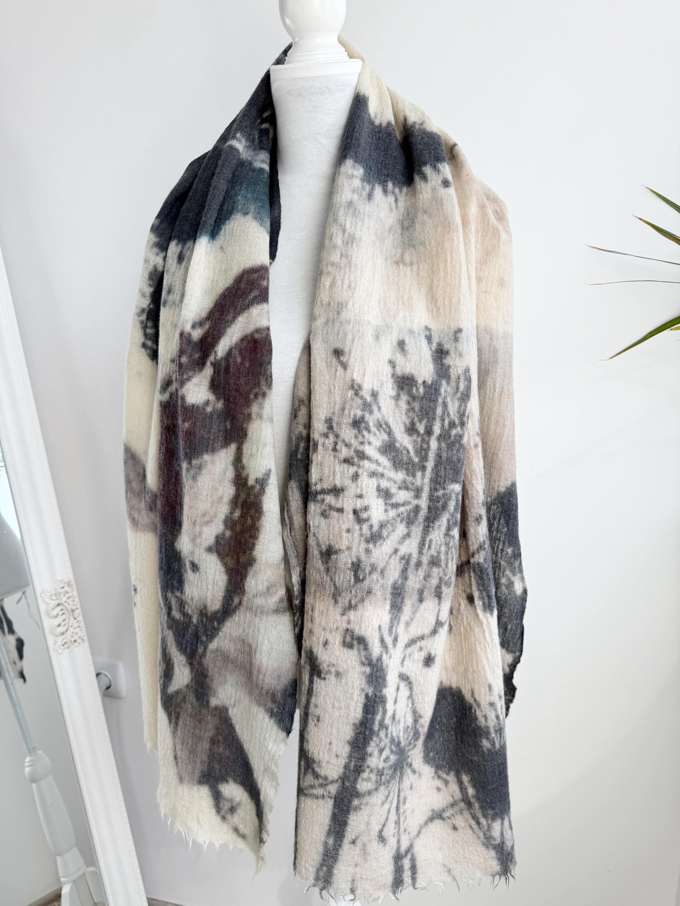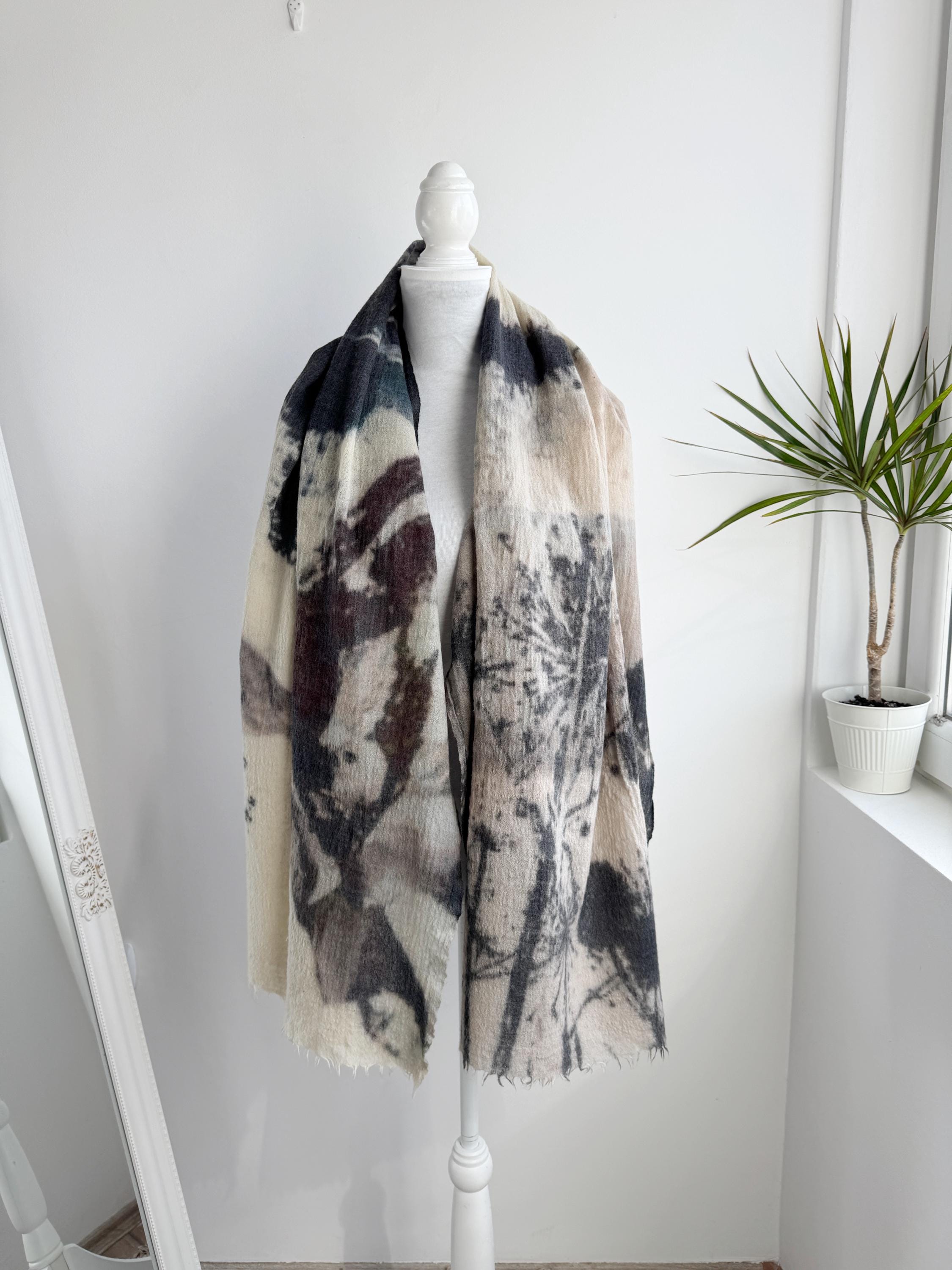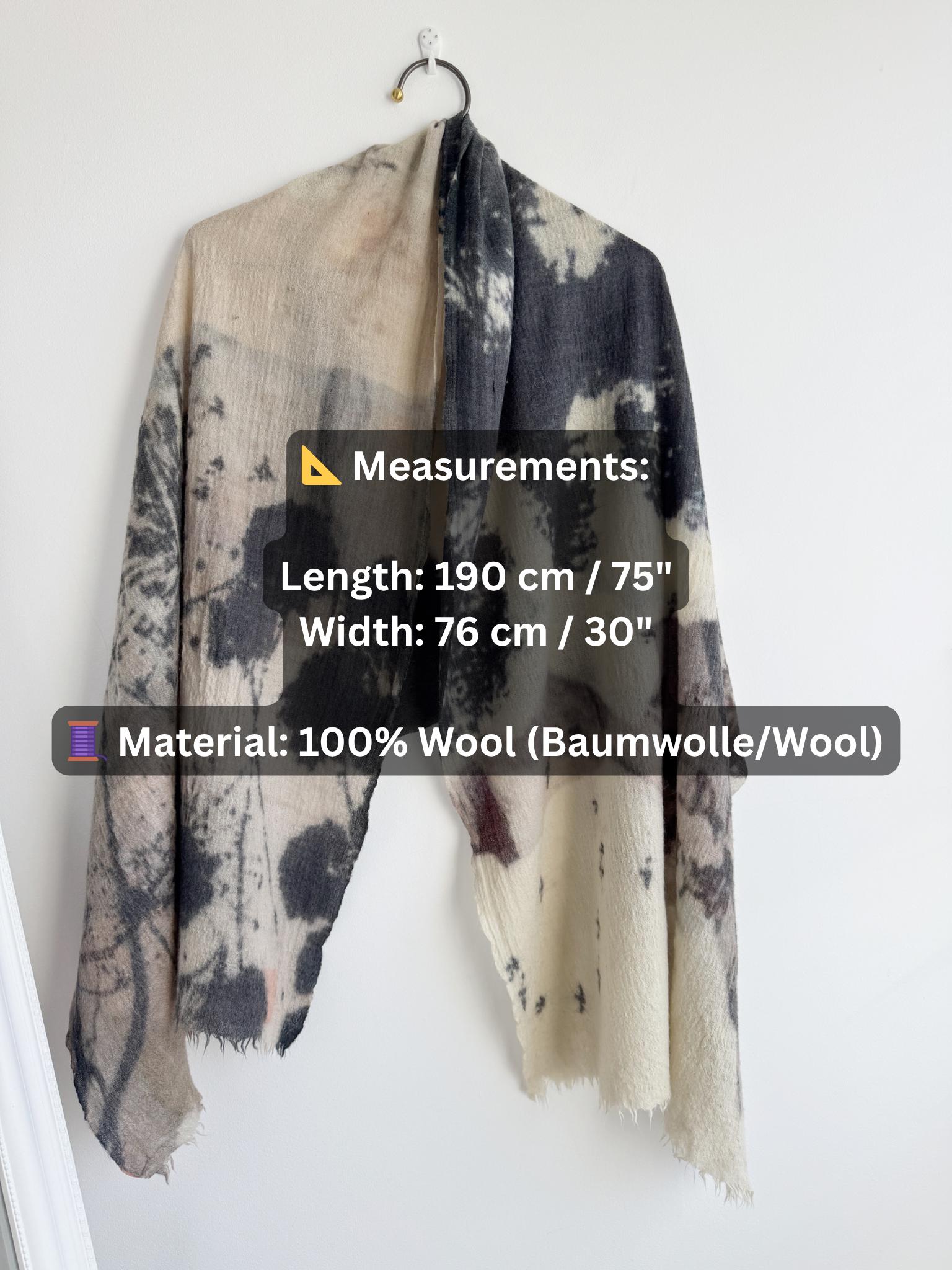 The natural 100% wool fibers offer breathable warmth without the bulk, while the raw, slightly frayed edges give it a modern, bohemian edge. Whether you're layering it over a classic trench coat or a simple black dress, this oversized wrap adds an instant touch of Scandinavian chic to any outfit. It's a timeless, high-quality piece for anyone who appreciates artistic prints and natural materials.