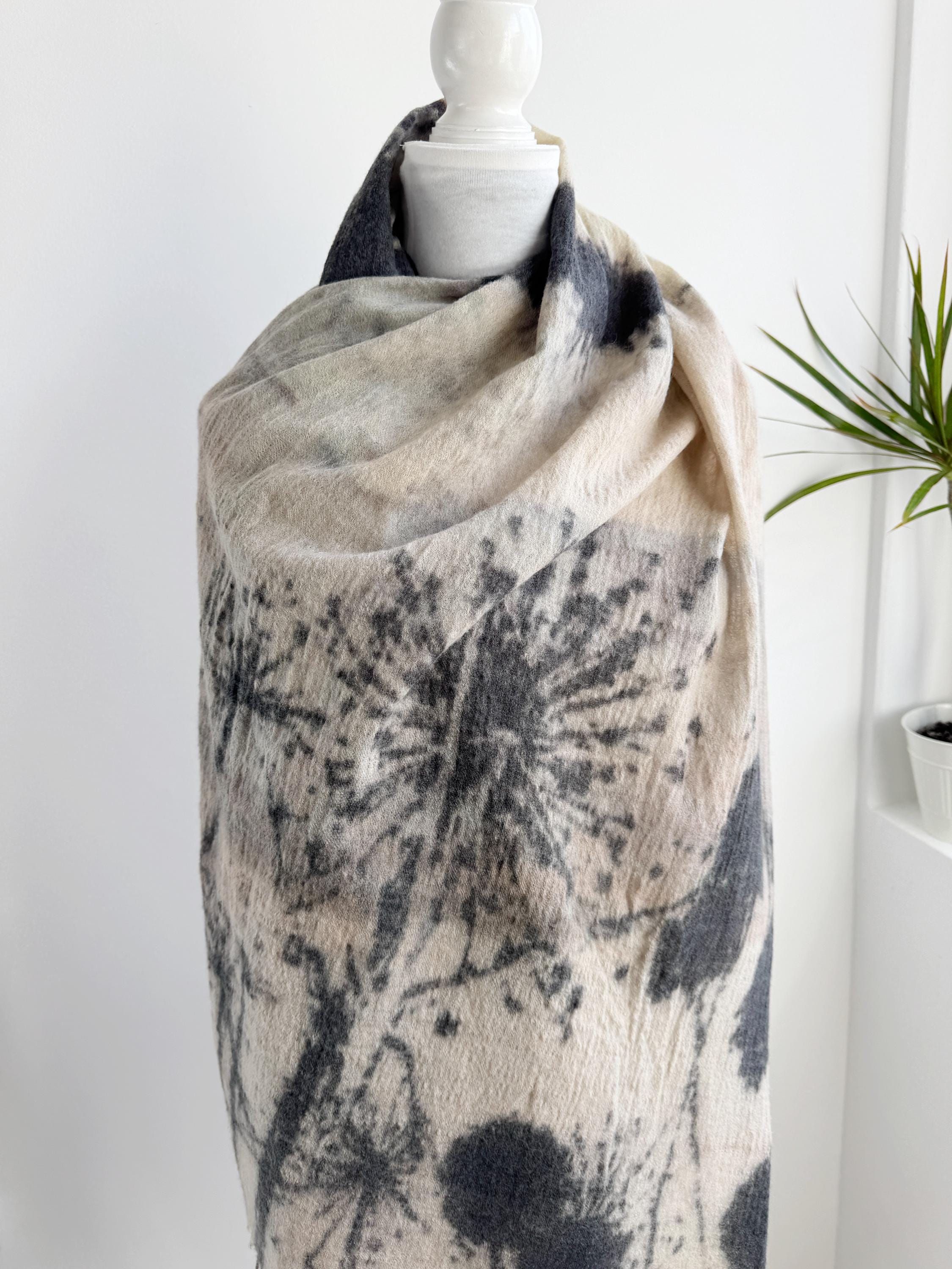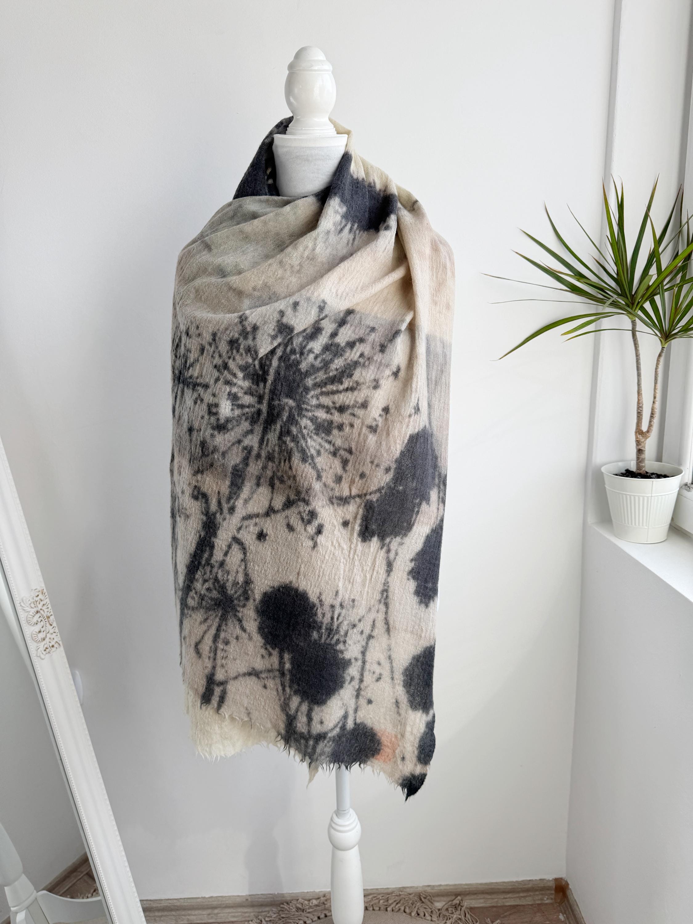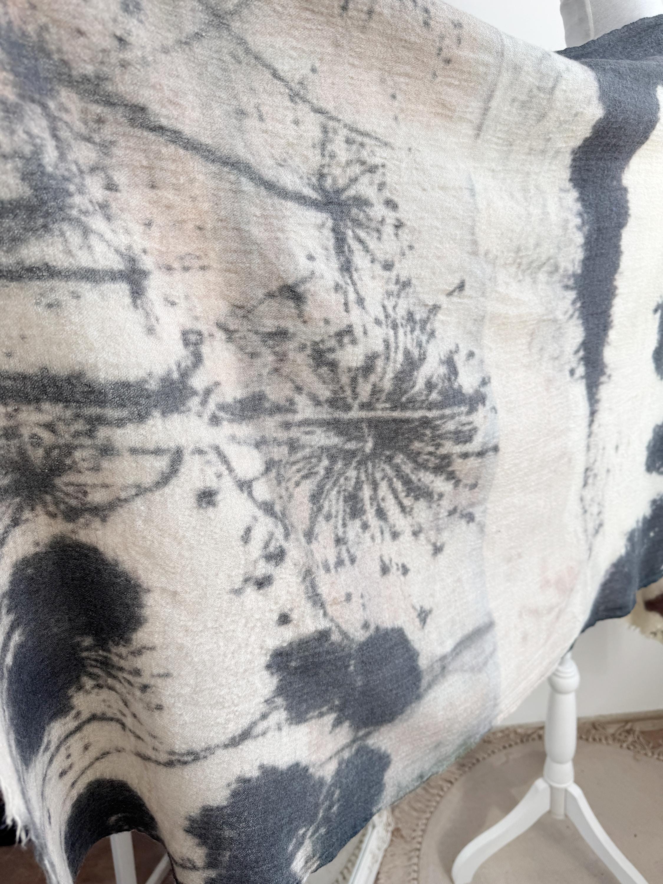 Elevate your accessory game with this stunning, lightweight wool wrap by the renowned Danish brand Becksöndergaard. This isn't just a scarf; it’s a wearable piece of art made of all natural fibers - 100% wool. The design features a bold, moody dandelion and floral silhouette print in deep charcoal grey over a creamy ivory base. The semi-sheer, fine-knit wool texture makes it incredibly versatile—drape it over your shoulders as a sophisticated evening shawl or bunch it up for a cozy, textured winter look.