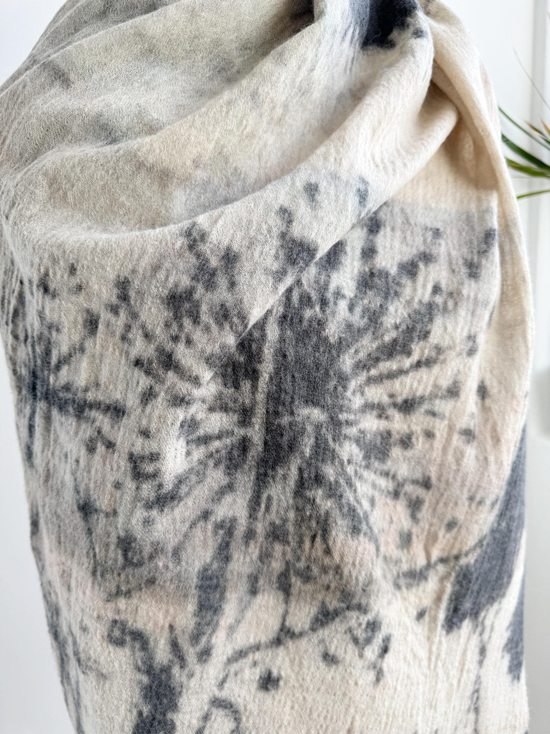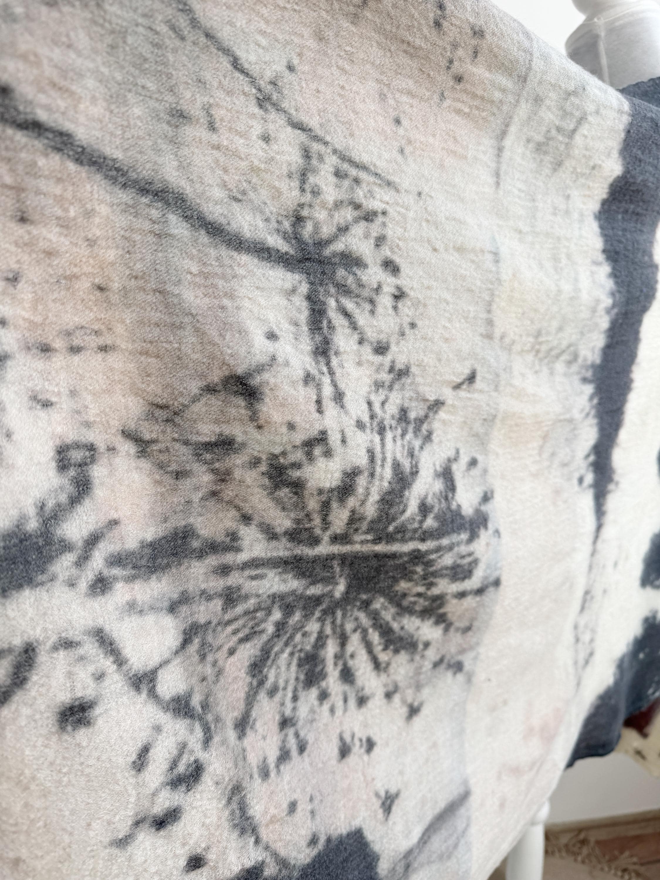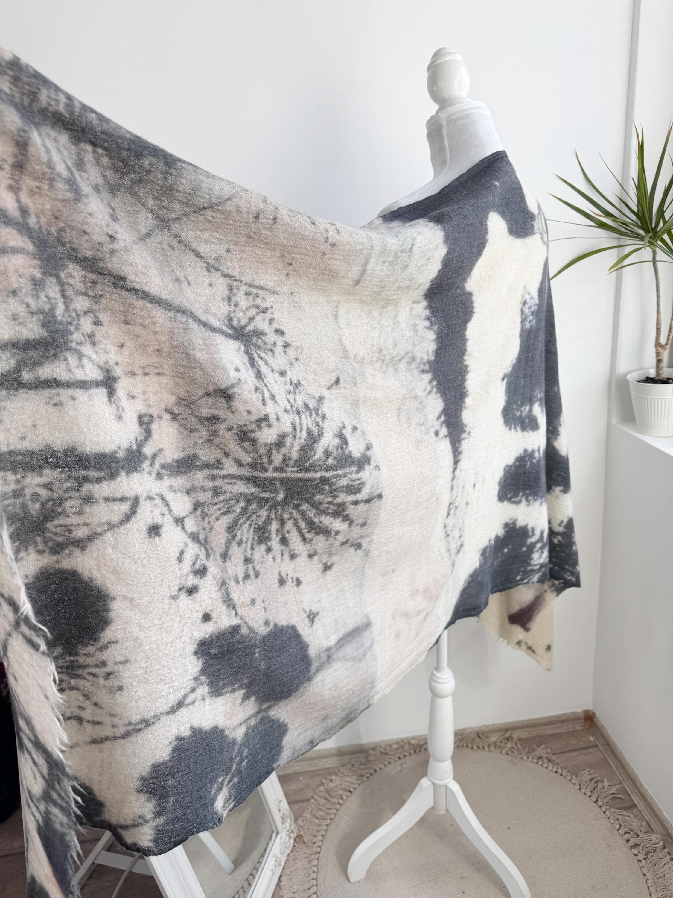 Elevate your accessory game with this stunning, lightweight wool wrap by the renowned Danish brand Becksöndergaard. This isn't just a scarf; it’s a wearable piece of art made of all natural fibers - 100% wool. The design features a bold, moody dandelion and floral silhouette print in deep charcoal grey over a creamy ivory base. The semi-sheer, fine-knit wool texture makes it incredibly versatile—drape it over your shoulders as a sophisticated evening shawl or bunch it up for a cozy, textured winter look.