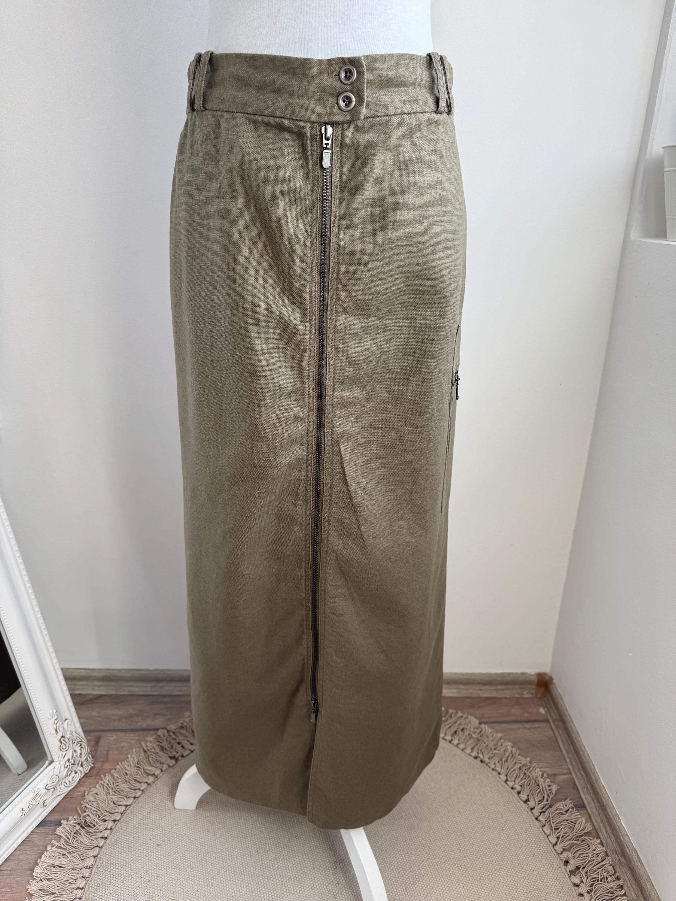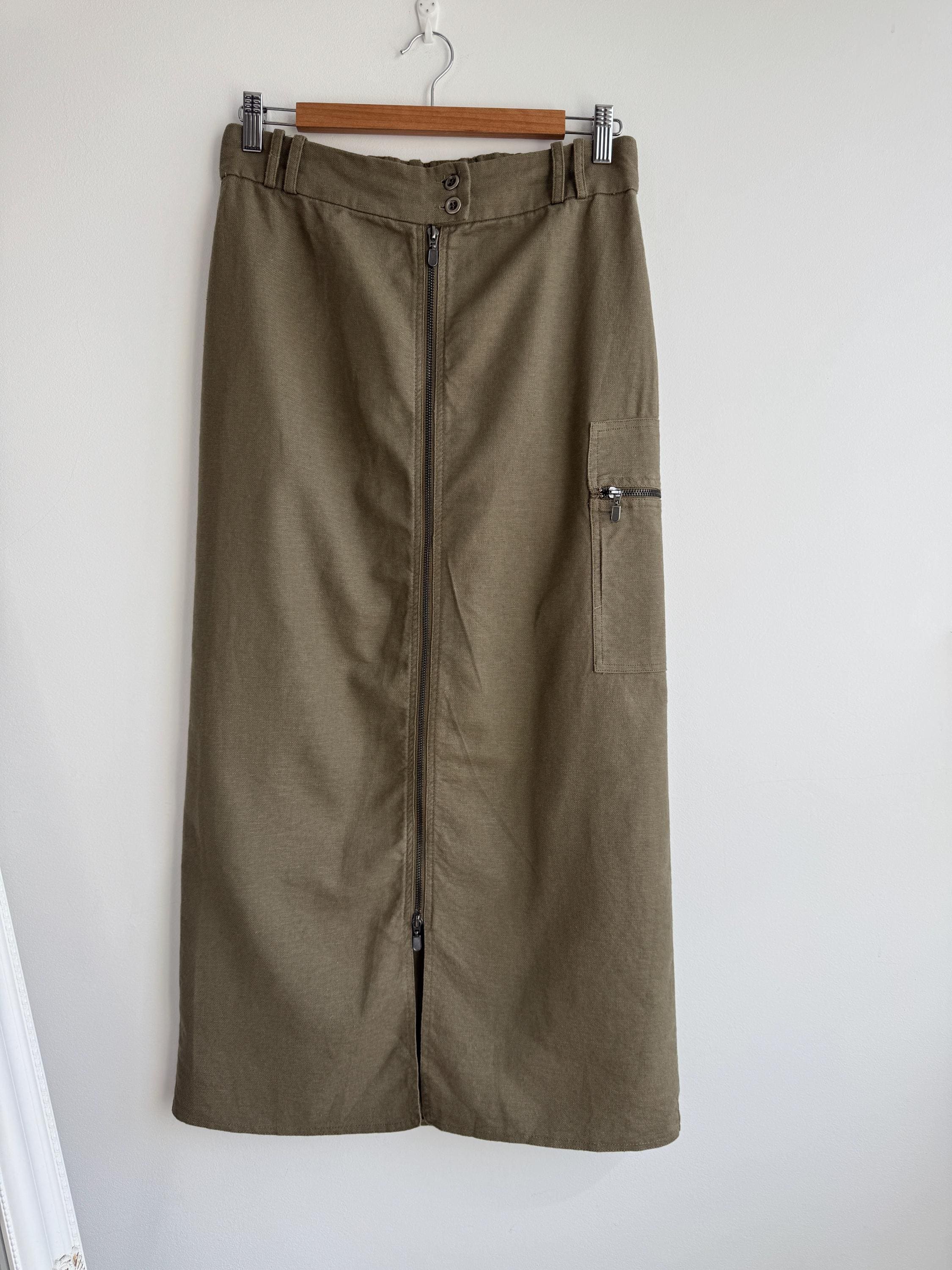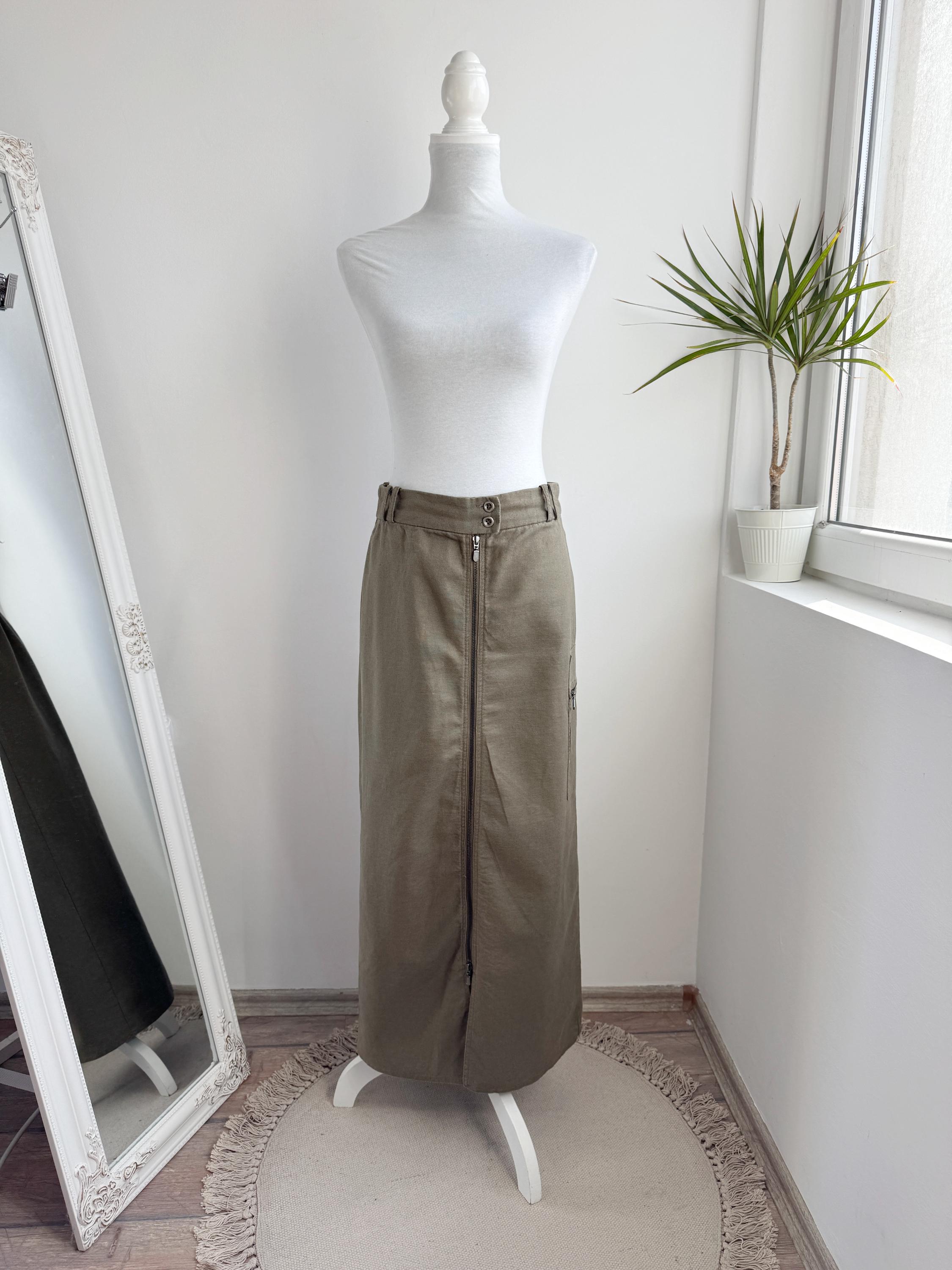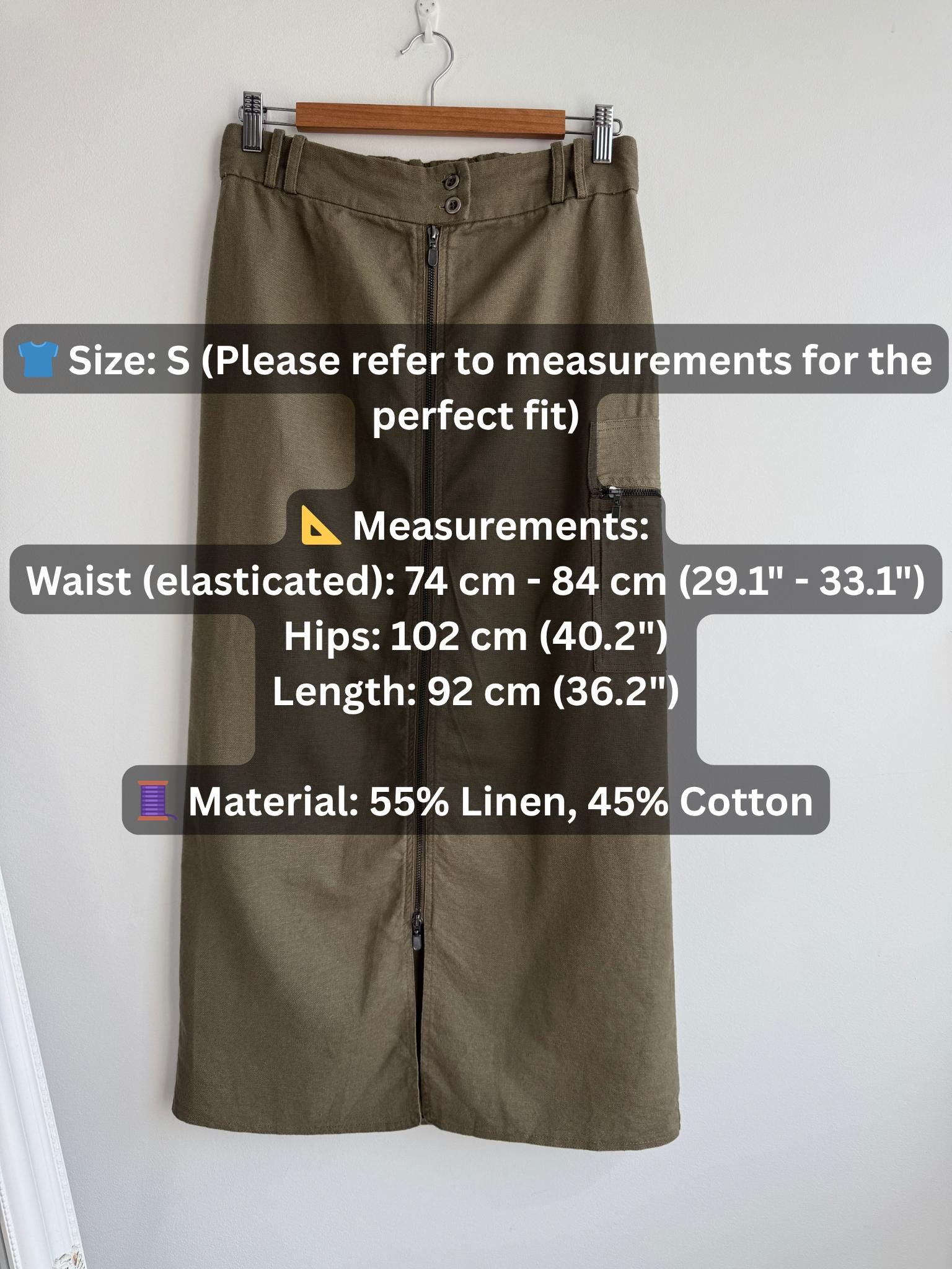 Elevate your summer wardrobe with this perfectly weathered vintage khaki maxi skirt from Divino in size S. Combining the rugged utility of cargo styling with the effortless flow of a long silhouette, this linen cotton blend skirt is a must-have for anyone leaning into the "utility chic" or cottagecore trends this season.