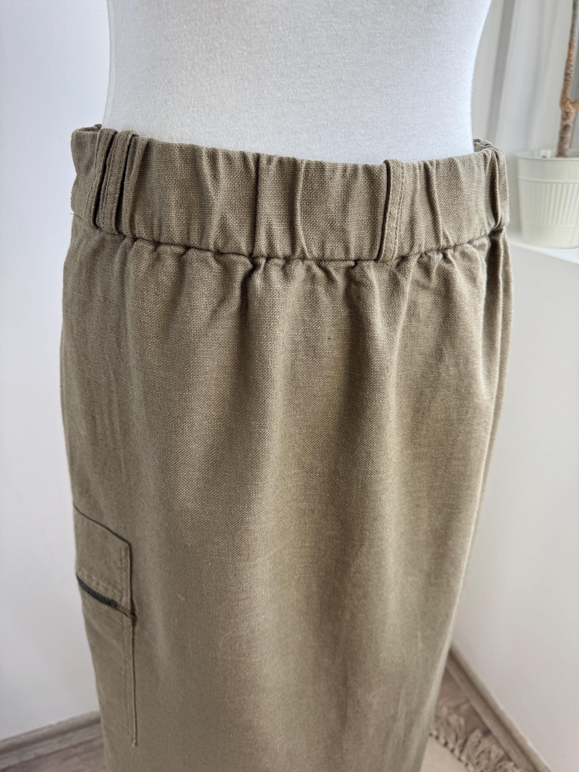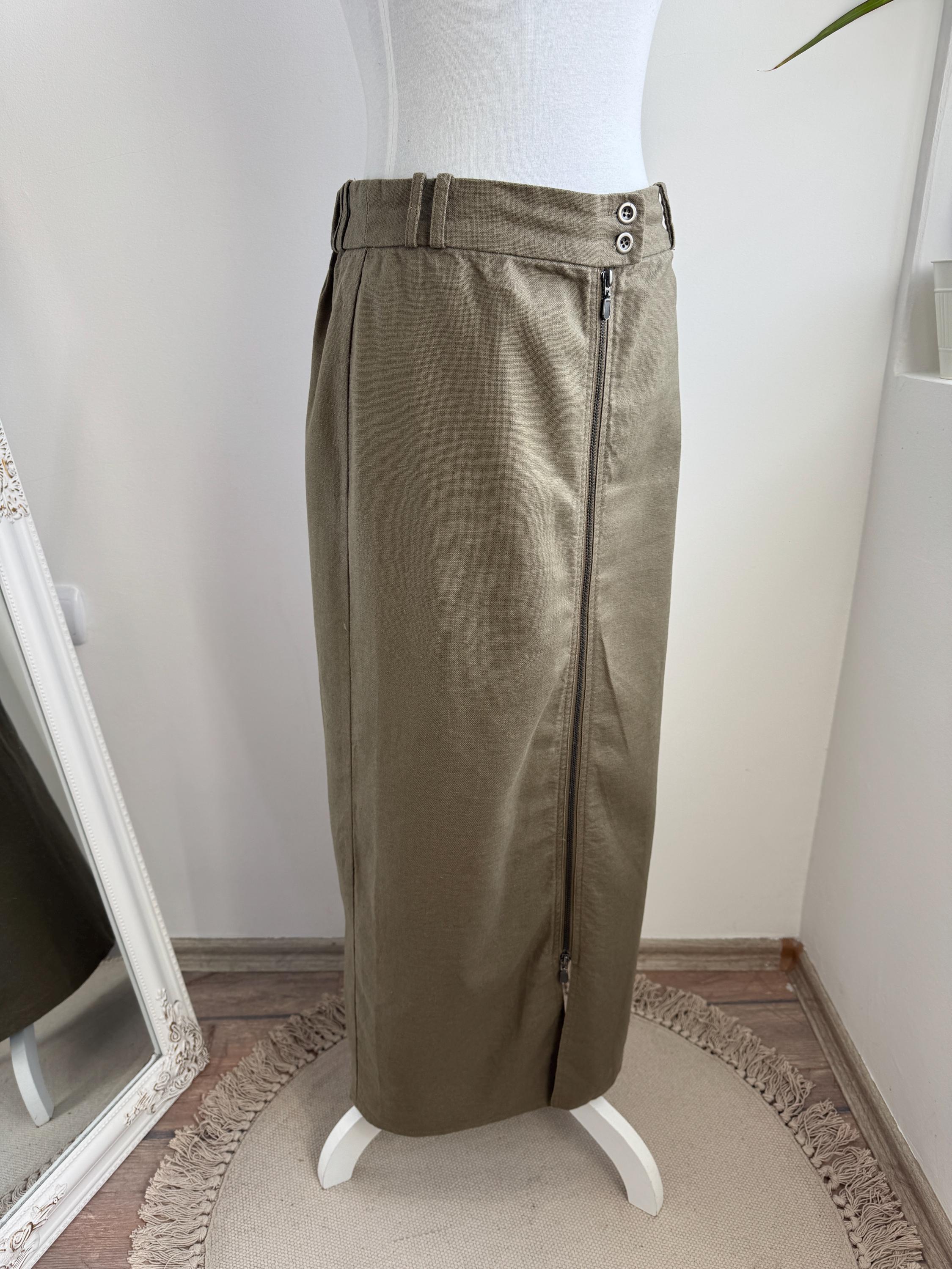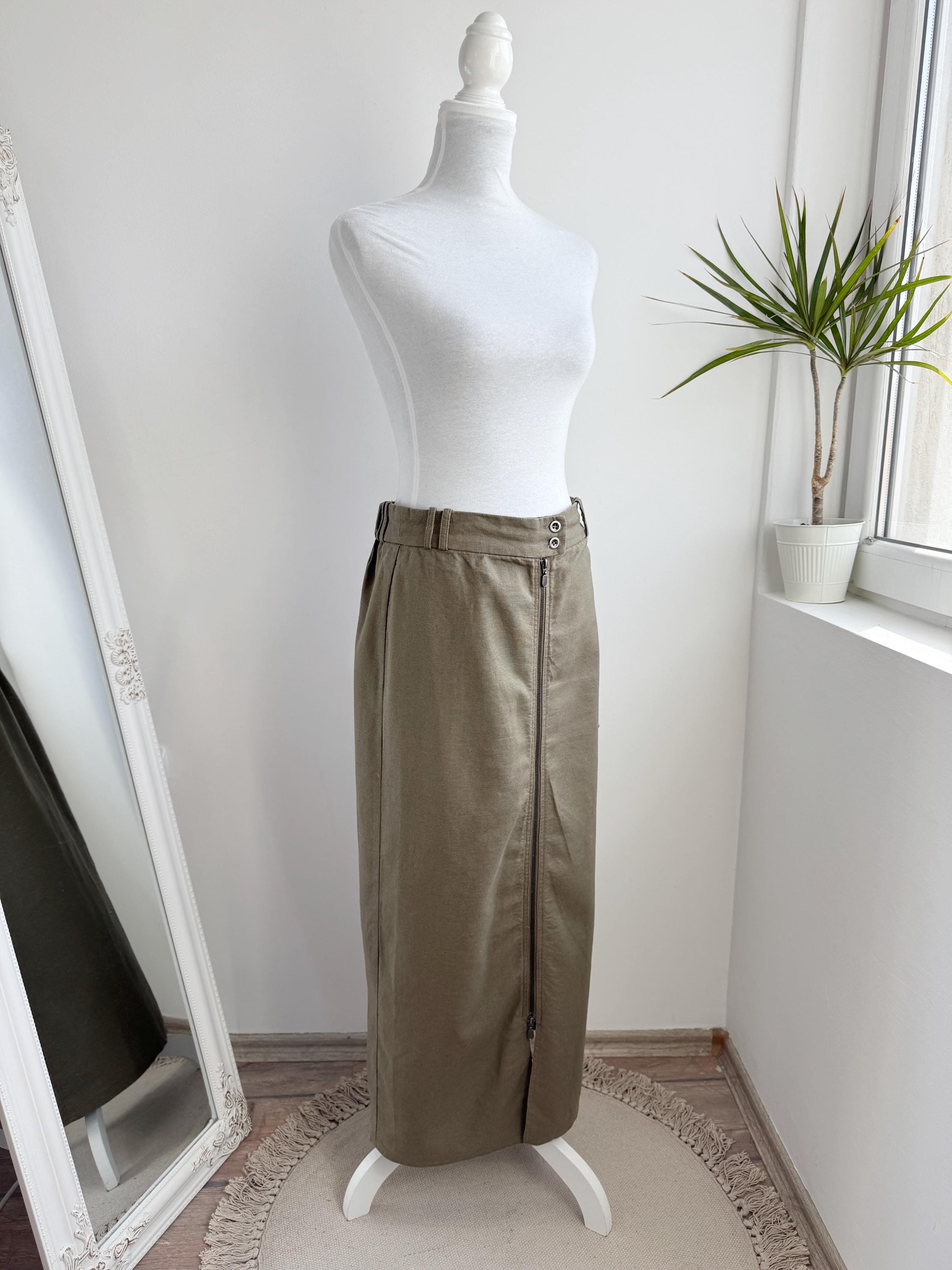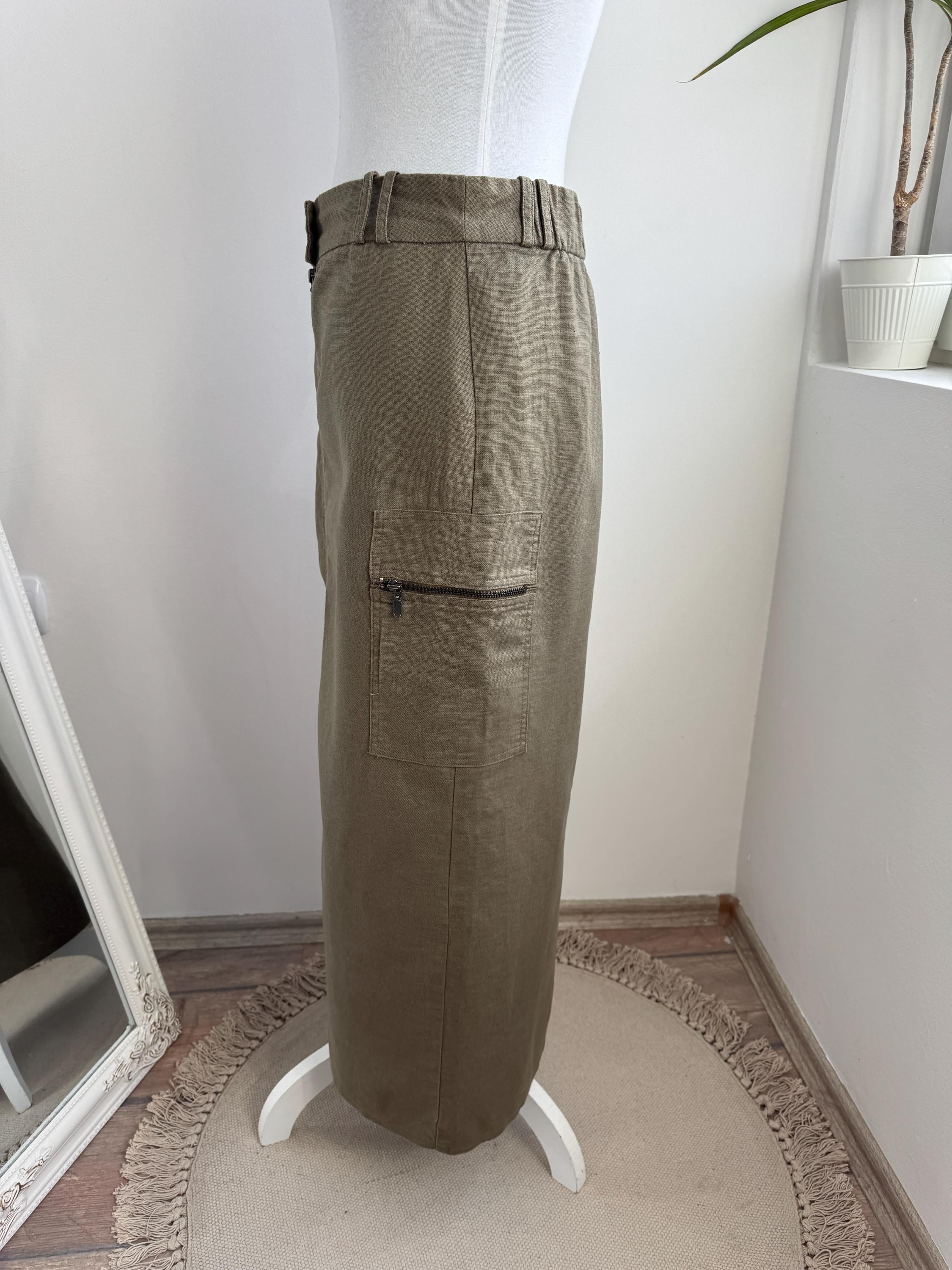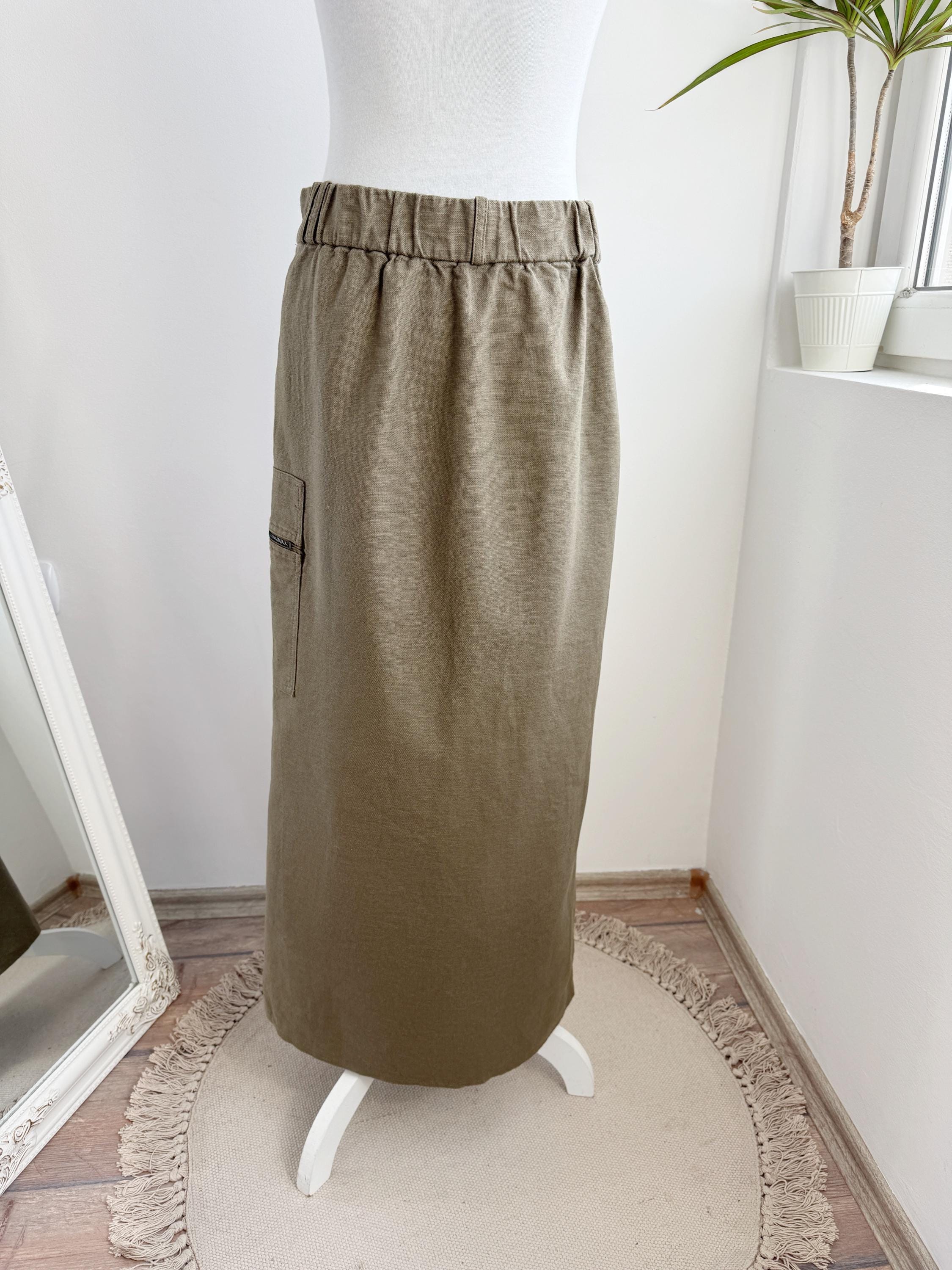 Elevate your summer wardrobe with this perfectly weathered vintage khaki maxi skirt from Divino in size S. Combining the rugged utility of cargo styling with the effortless flow of a long silhouette, this linen cotton blend skirt is a must-have for anyone leaning into the "utility chic" or cottagecore trends this season.