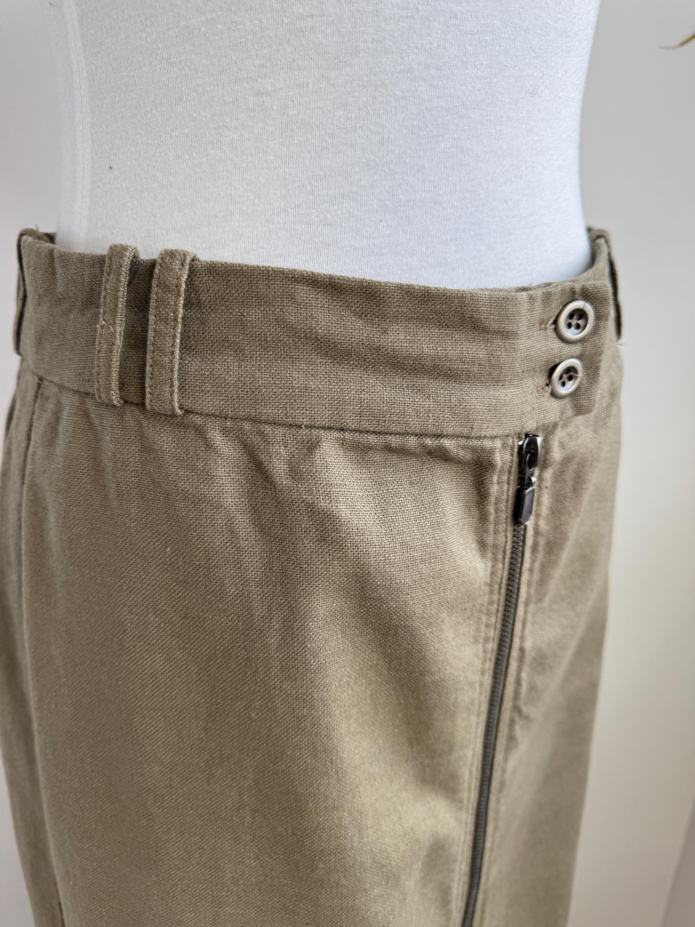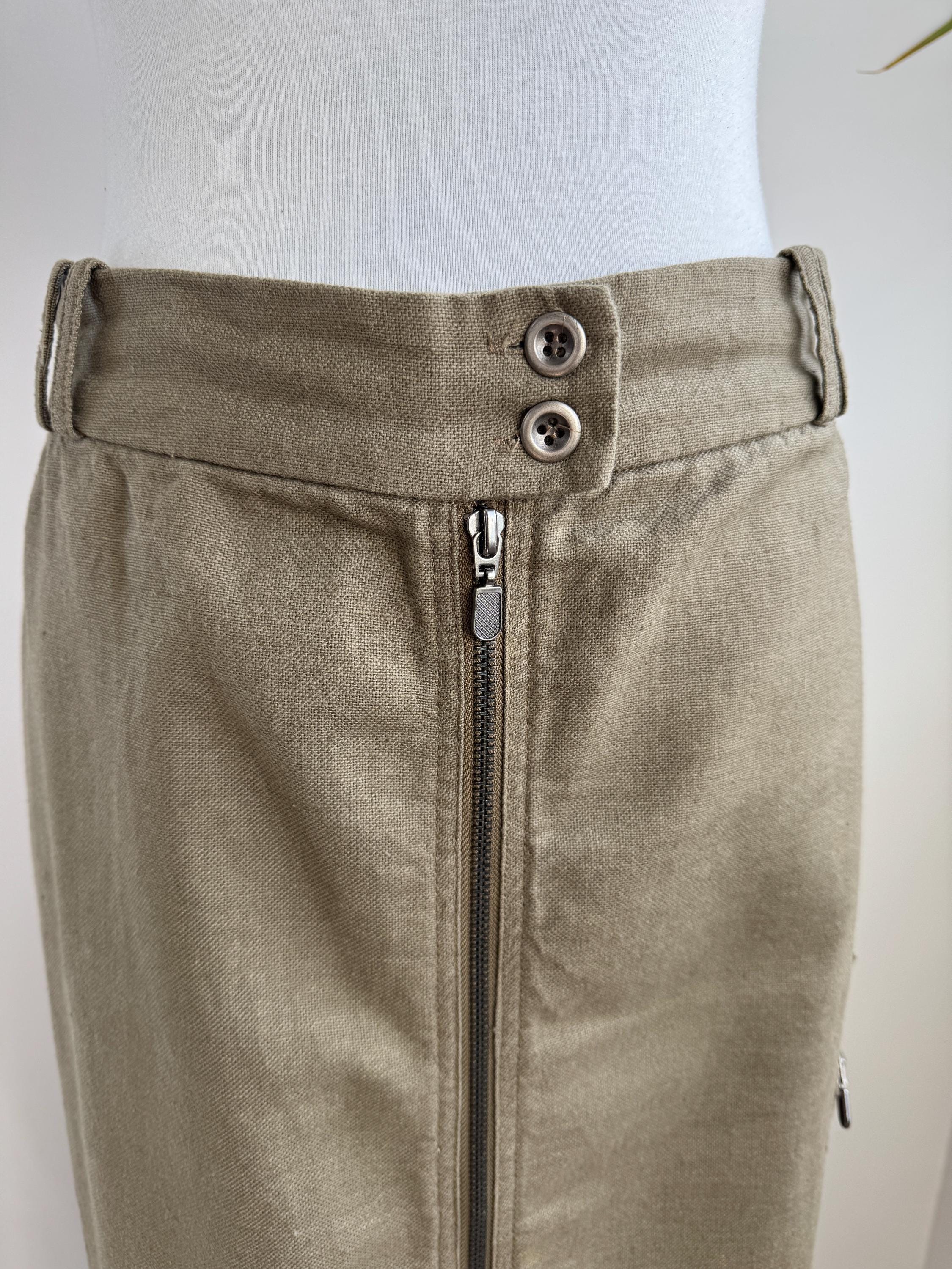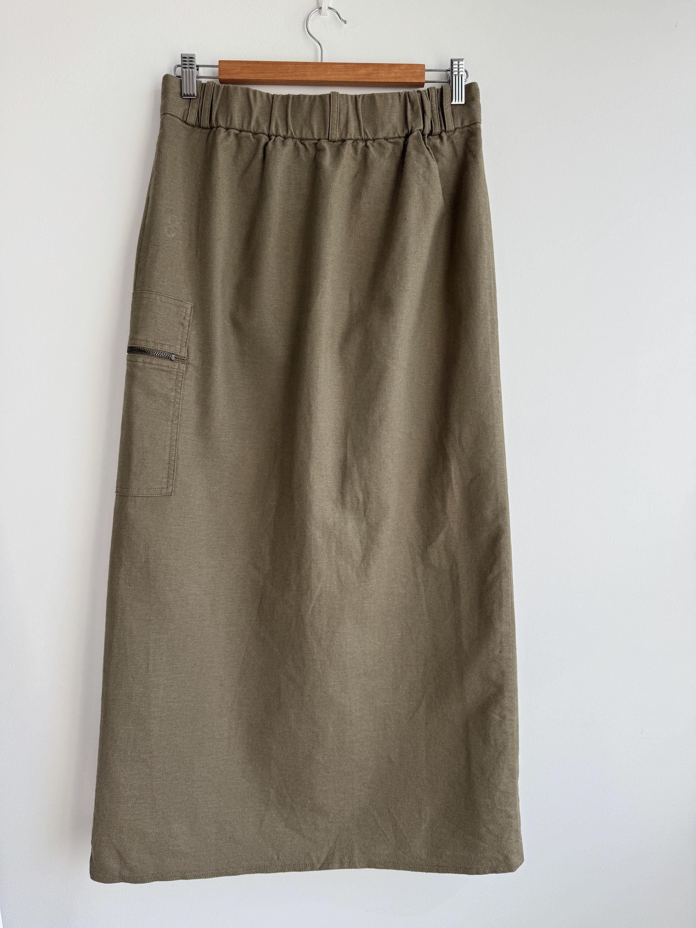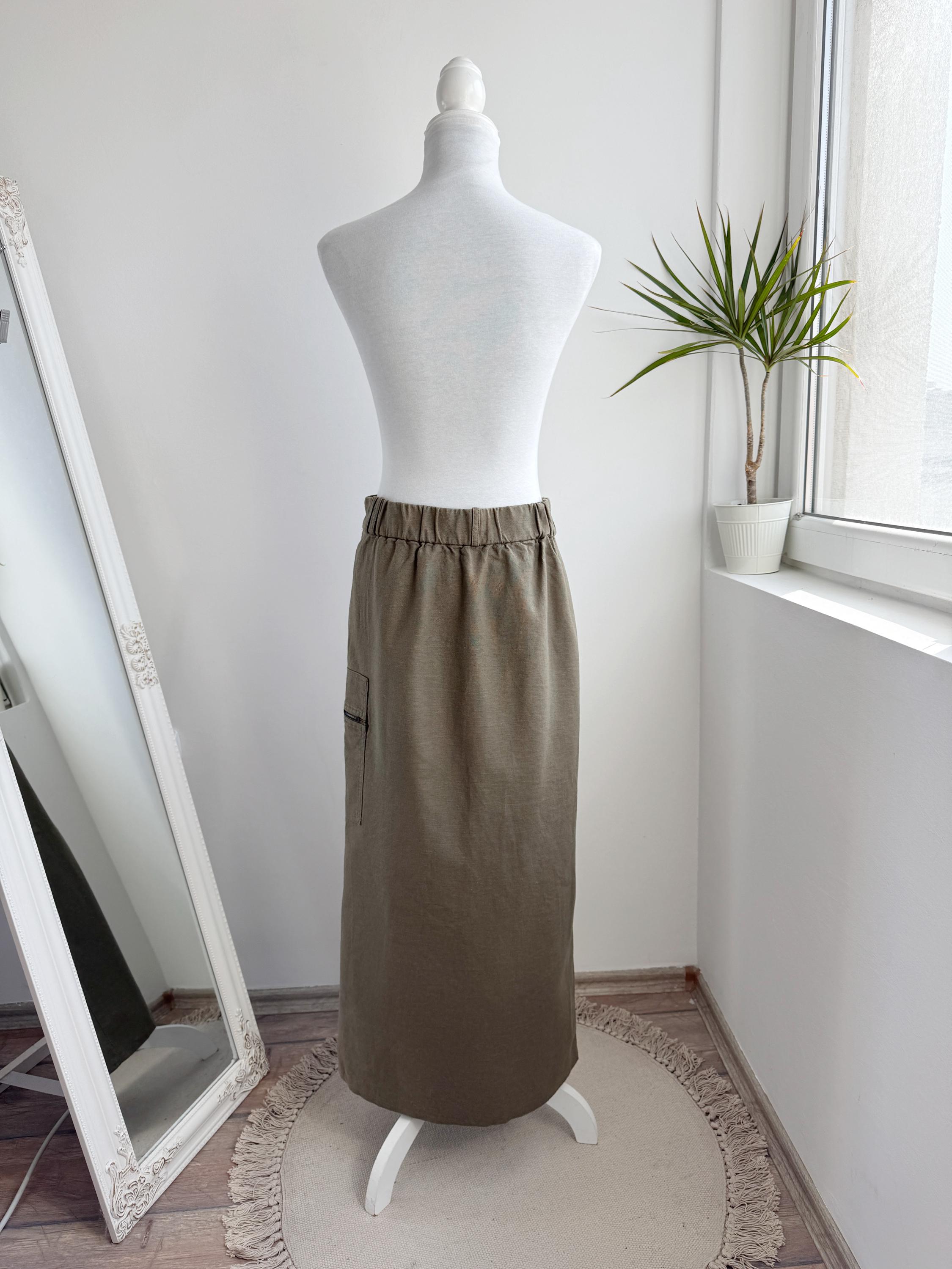 Elevate your summer wardrobe with this perfectly weathered vintage khaki maxi skirt from Divino in size S. Combining the rugged utility of cargo styling with the effortless flow of a long silhouette, this linen cotton blend skirt is a must-have for anyone leaning into the "utility chic" or cottagecore trends this season.
