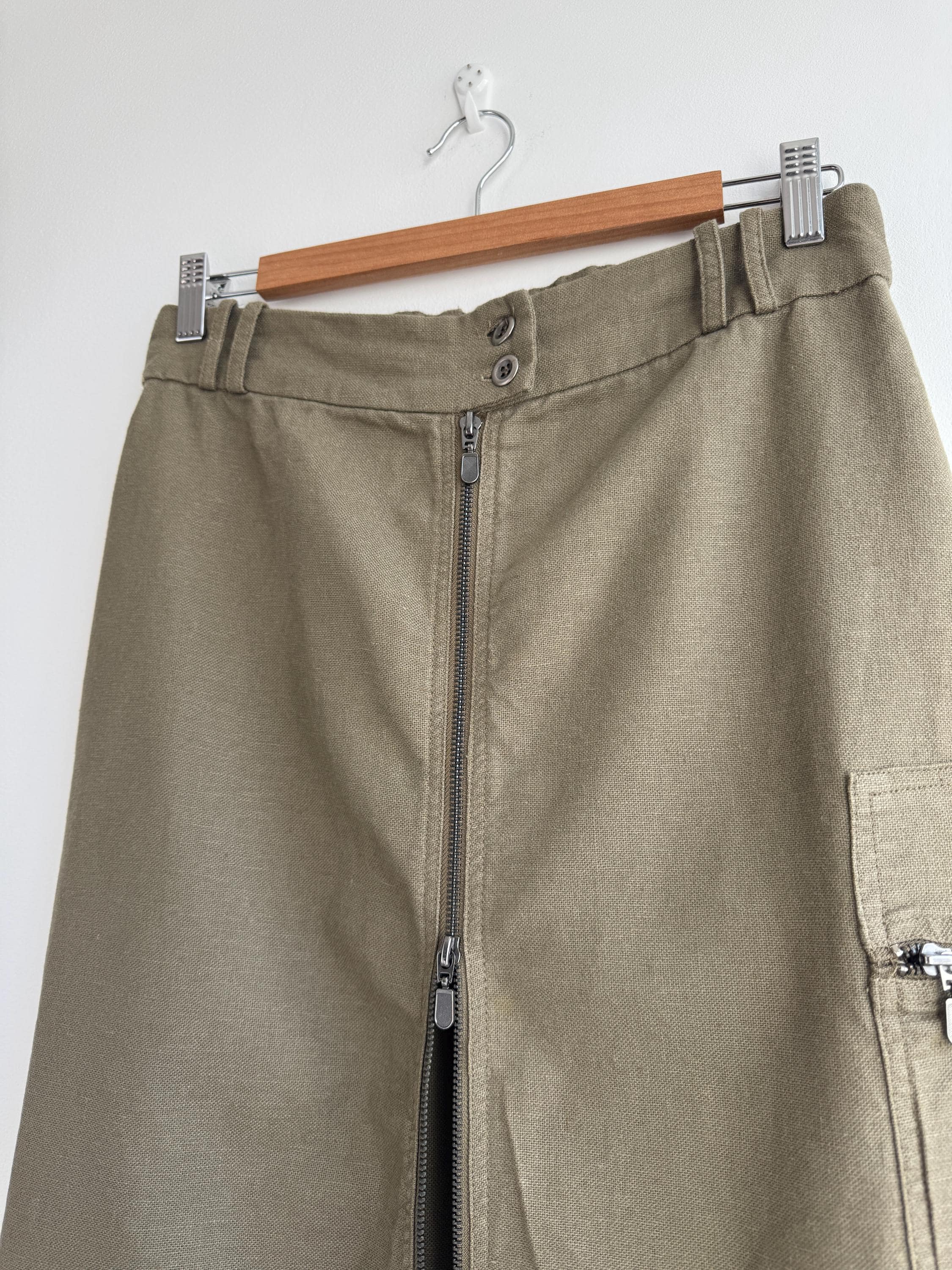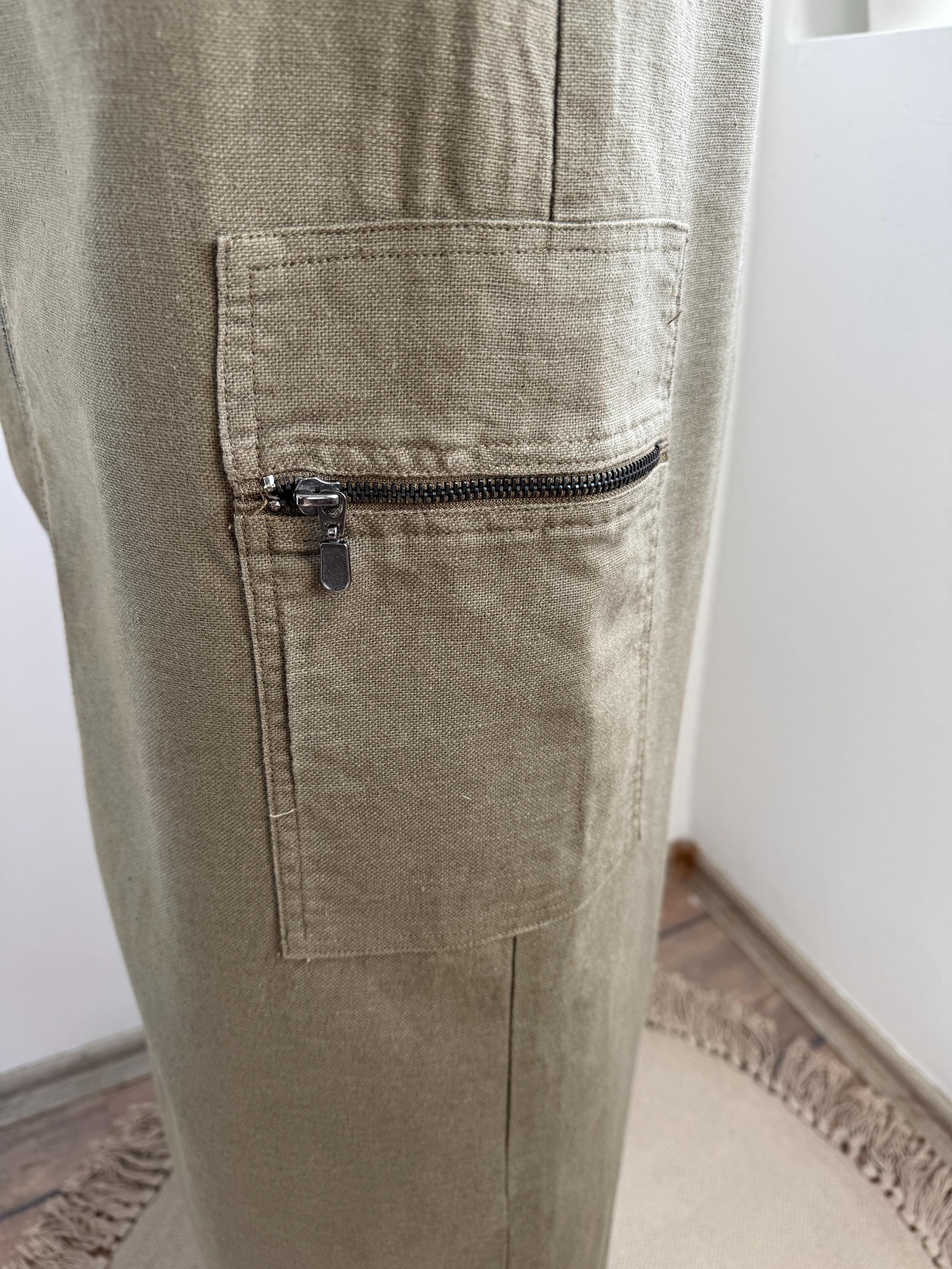 Crafted from a high-quality cotton and linen blend (55% linen and 45% cotton), it offers that sought-after breathable, structured feel that only gets better with age. The earthy khaki tone makes it incredibly versatile—pair it with a simple white tank and sandals for a coastal look, or style it with a cropped jacket and boots for a more edgy, 90s-inspired street style. Featuring functional side pocket, zip up front and a comfortable fit, it’s as practical as it is stylish.
