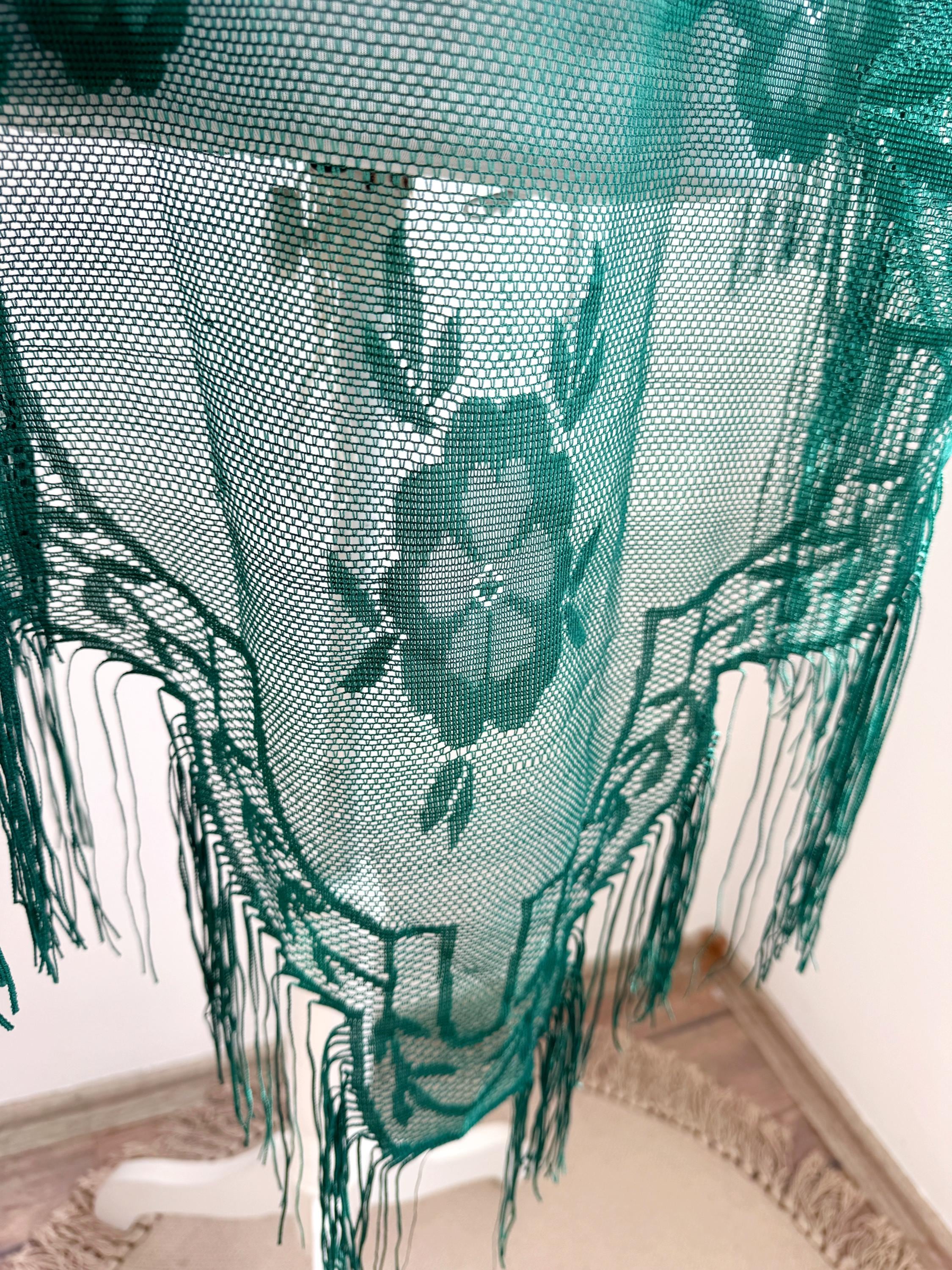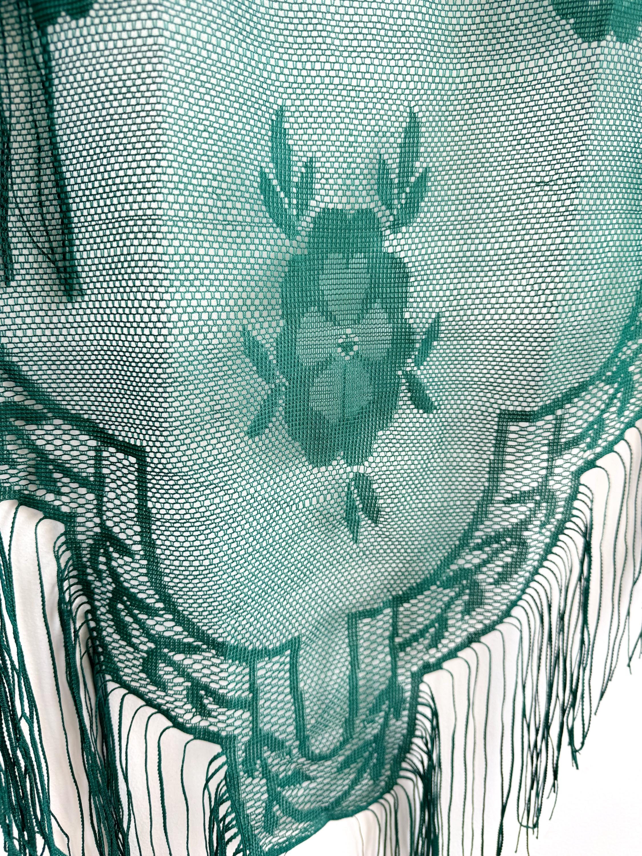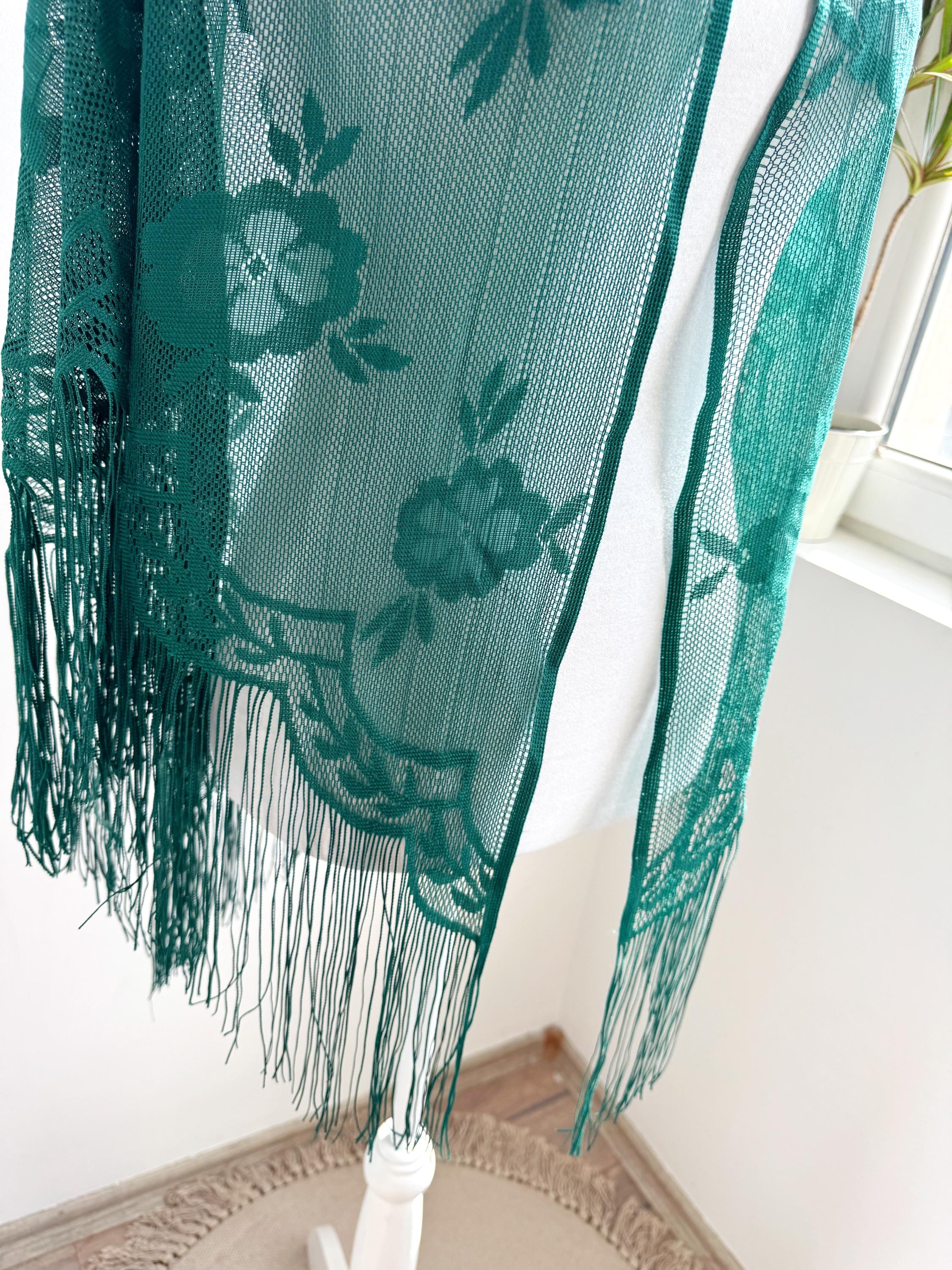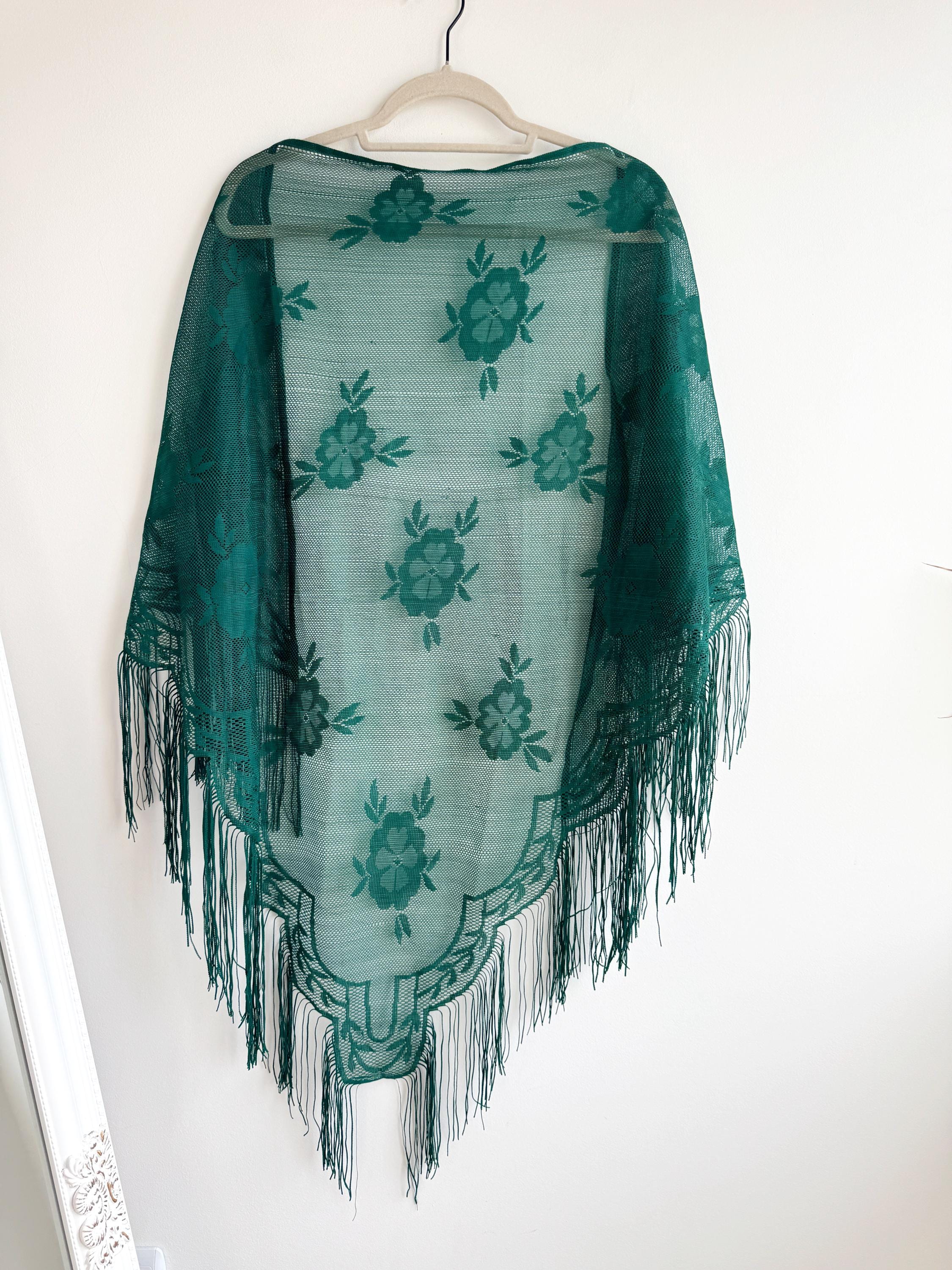 This stunning vintage emerald green lace shawl is the perfect blend of romantic Victorian aesthetic and bohemian flair. Featuring an intricate floral mesh pattern and long, swaying fringe, this piece adds a touch of timeless elegance to any outfit.
