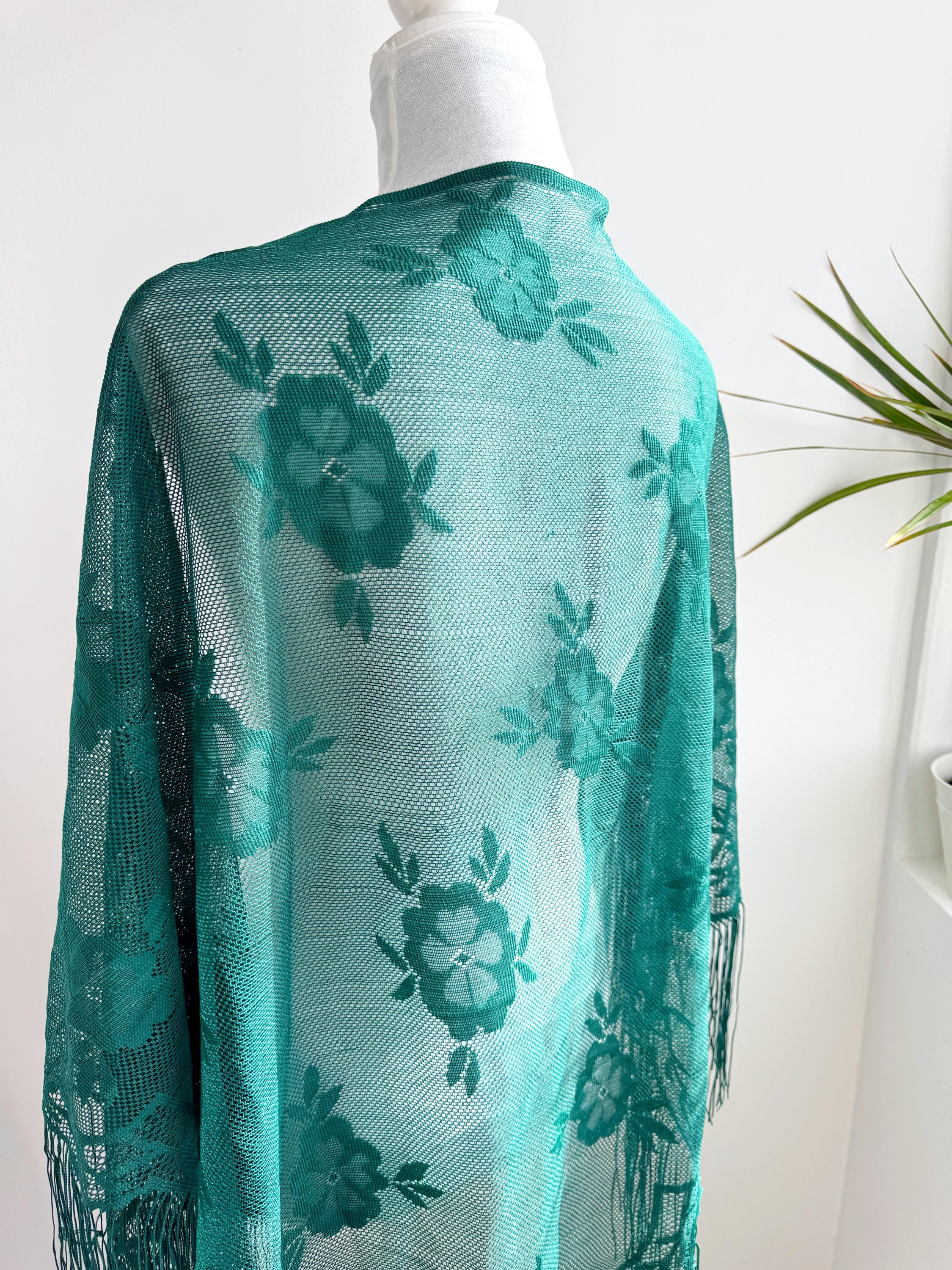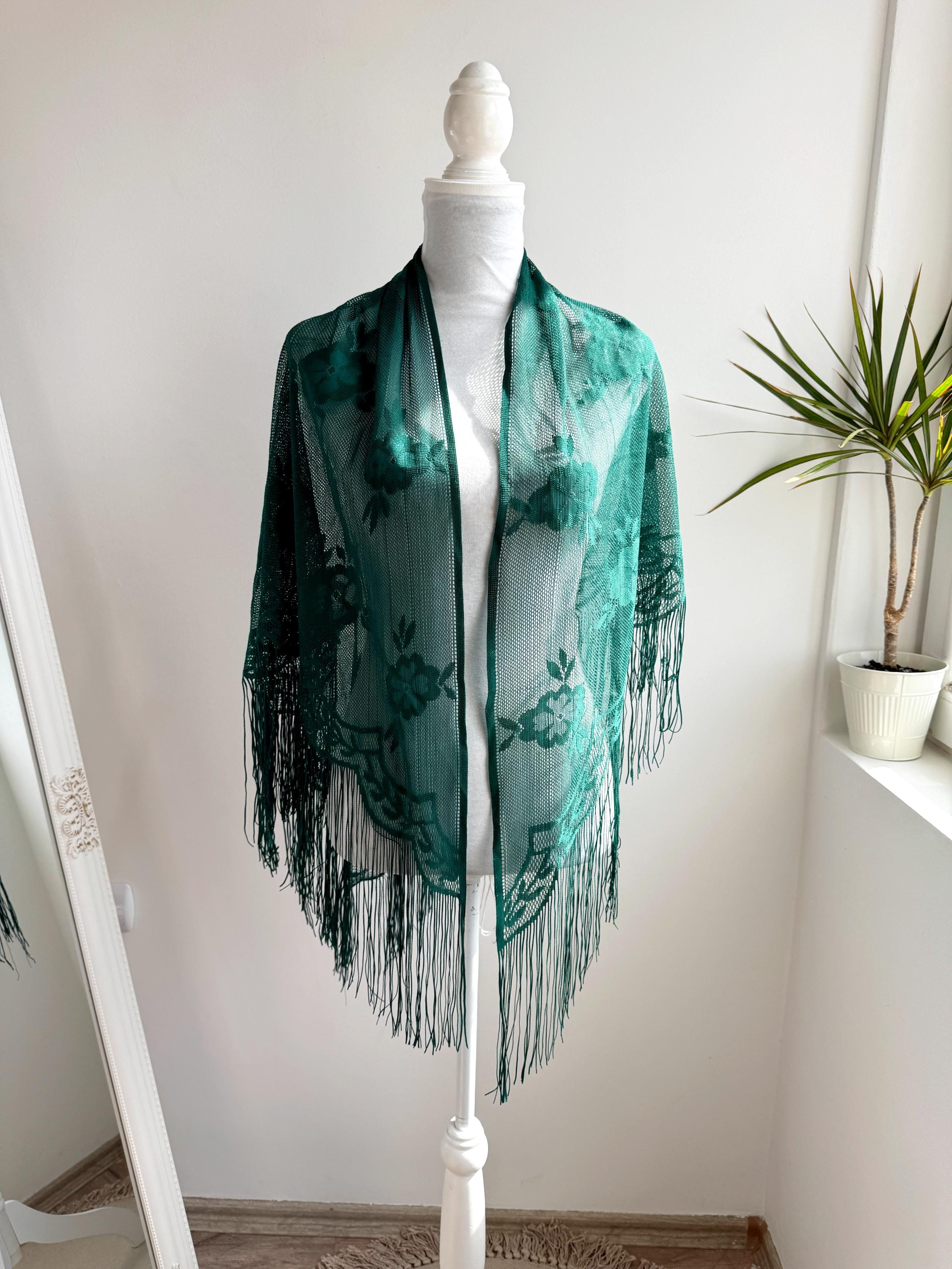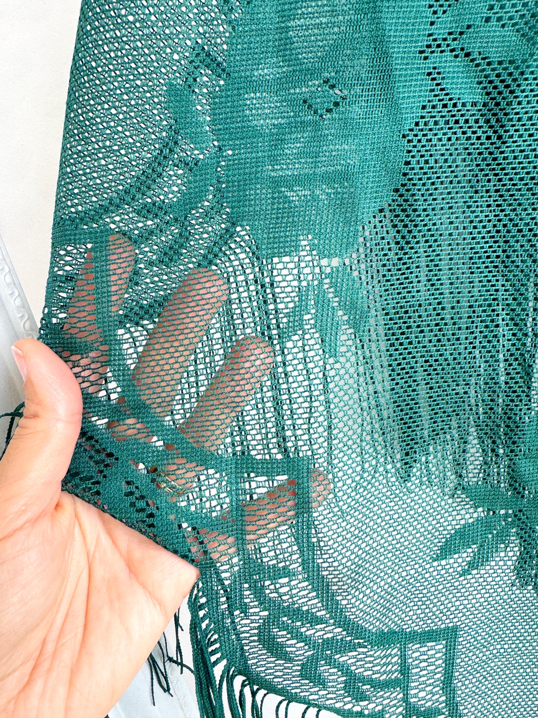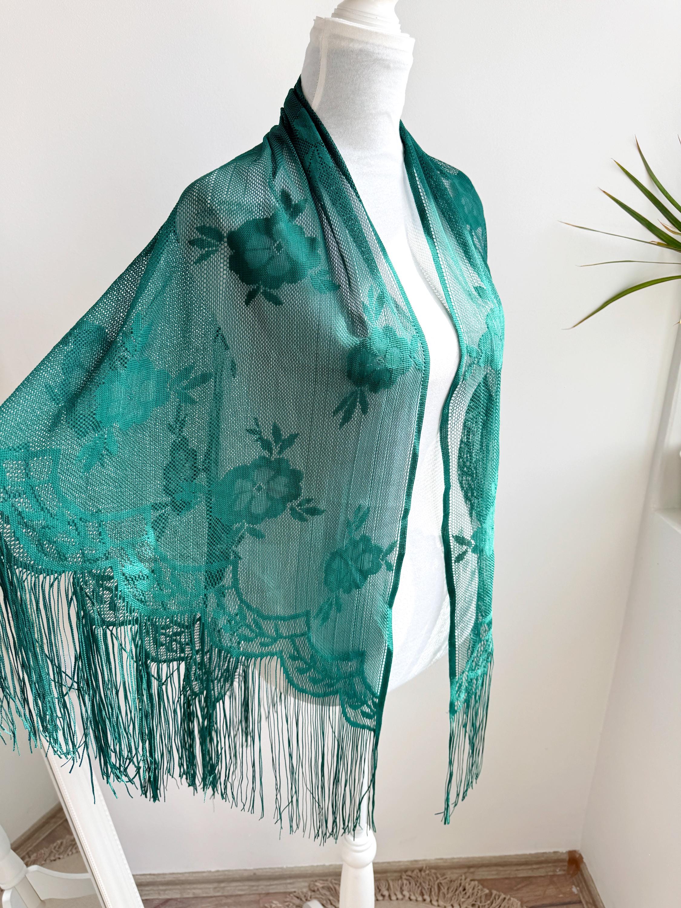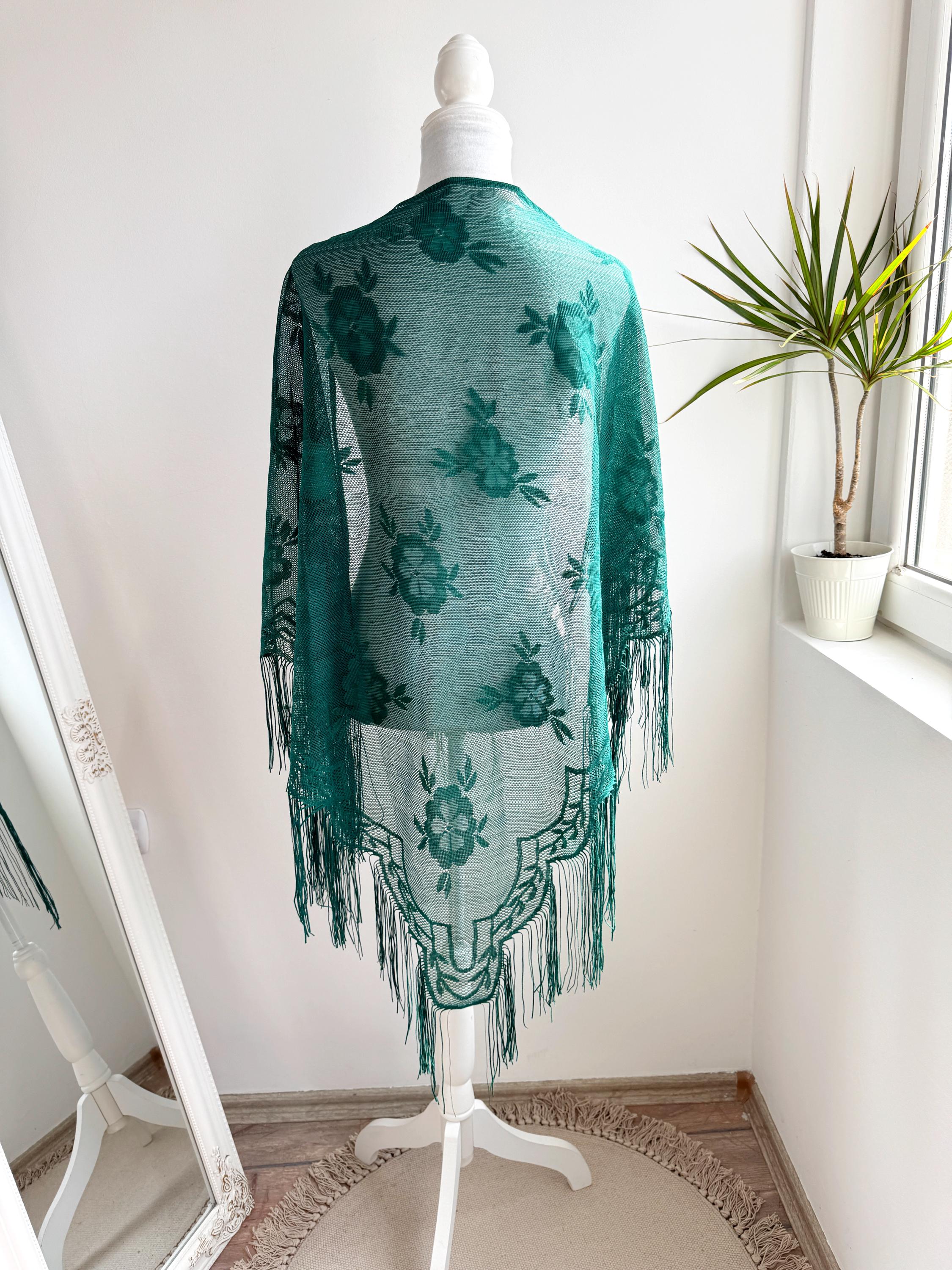 This stunning vintage emerald green lace shawl is the perfect blend of romantic Victorian aesthetic and bohemian flair. Featuring an intricate floral mesh pattern and long, swaying fringe, this piece adds a touch of timeless elegance to any outfit.