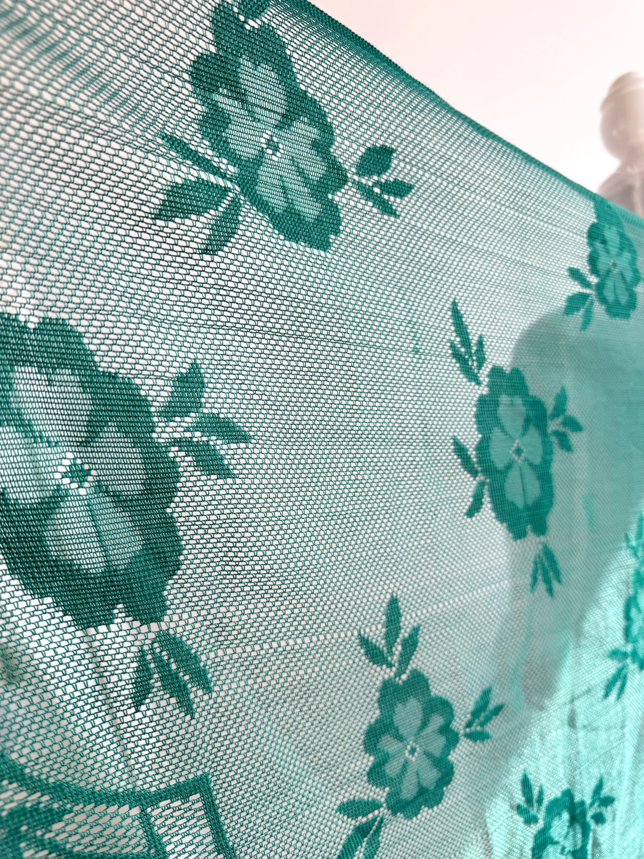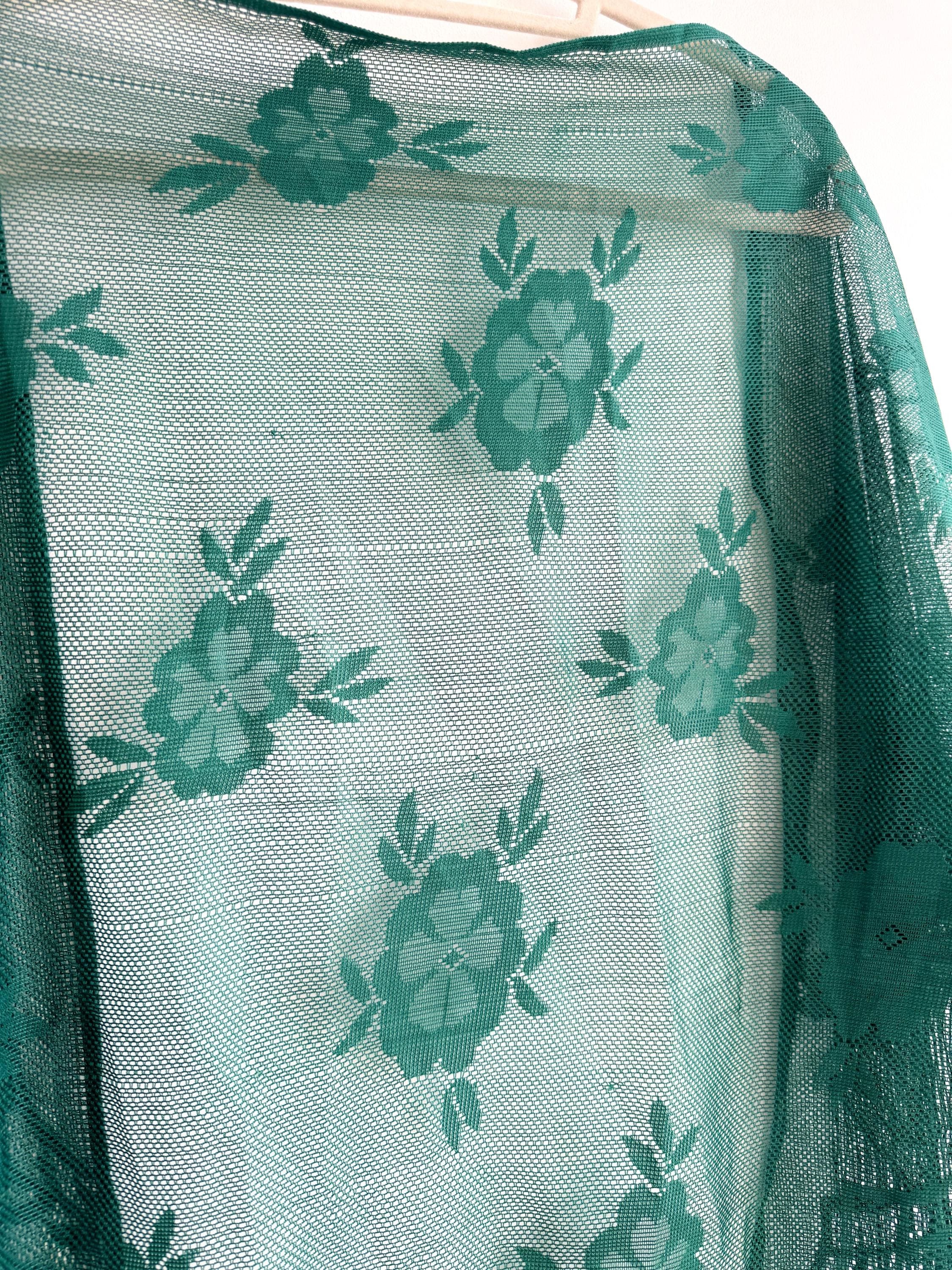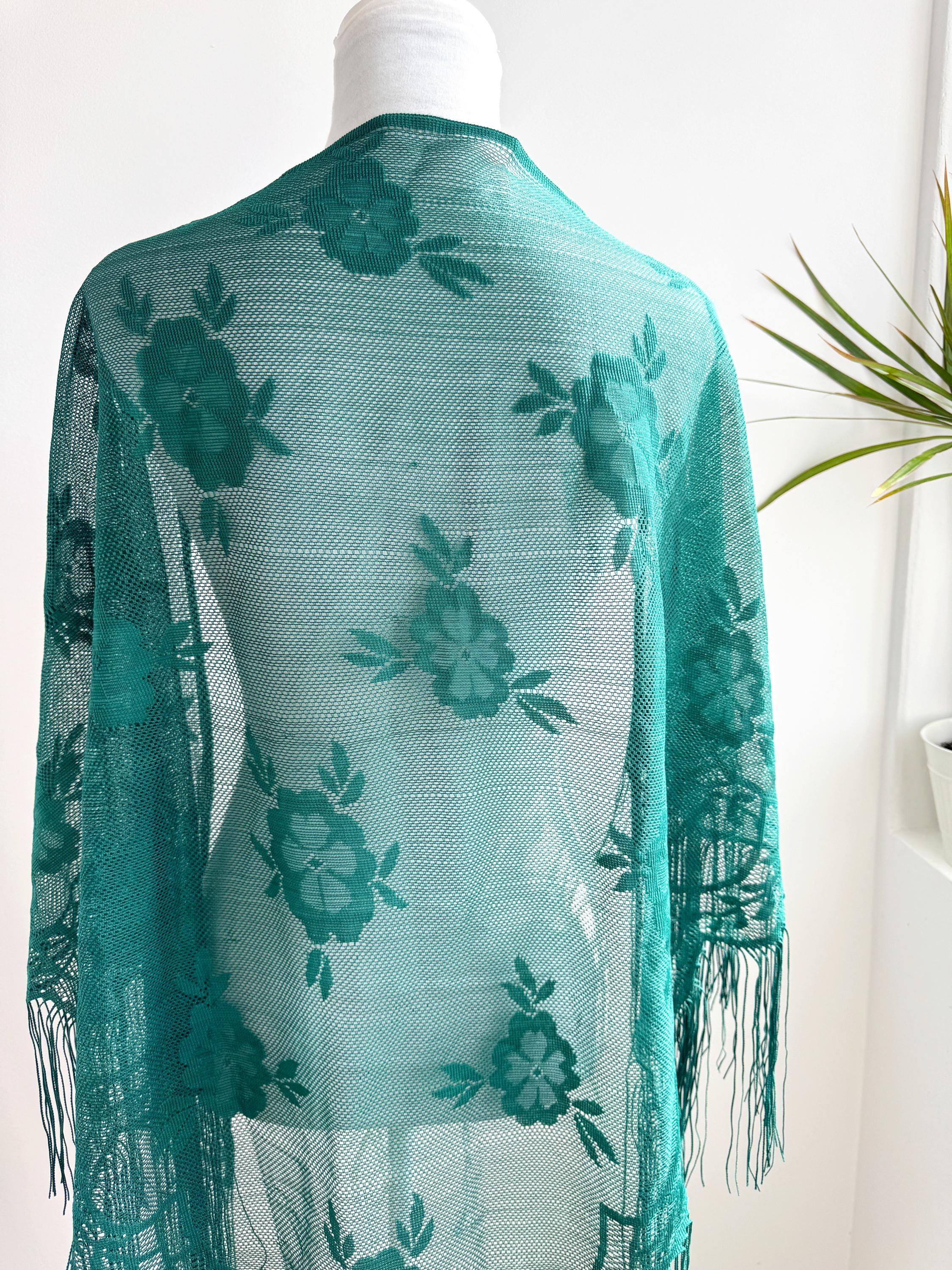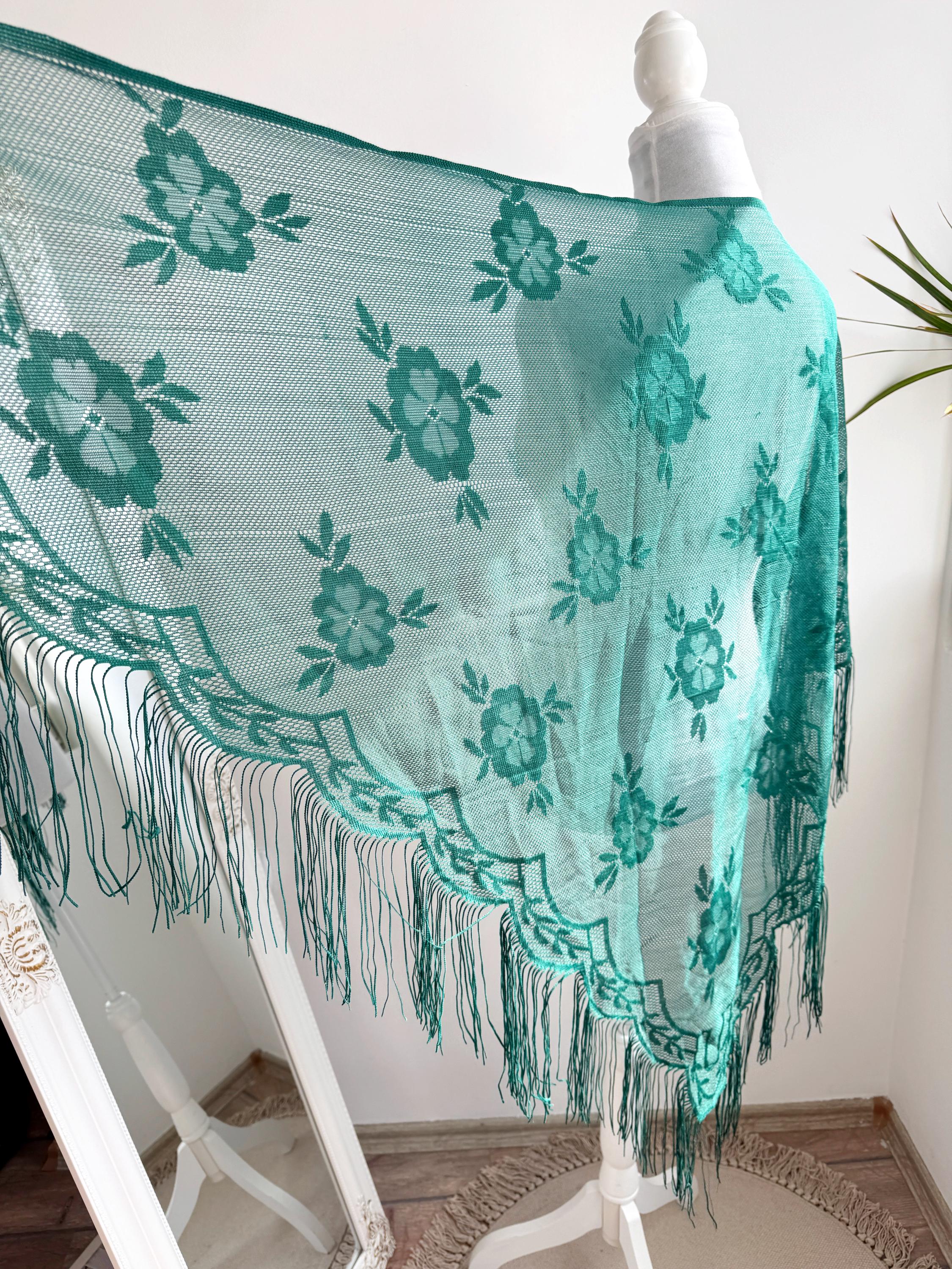 This stunning vintage emerald green lace shawl is the perfect blend of romantic Victorian aesthetic and bohemian flair. Featuring an intricate floral mesh pattern and long, swaying fringe, this piece adds a touch of timeless elegance to any outfit.