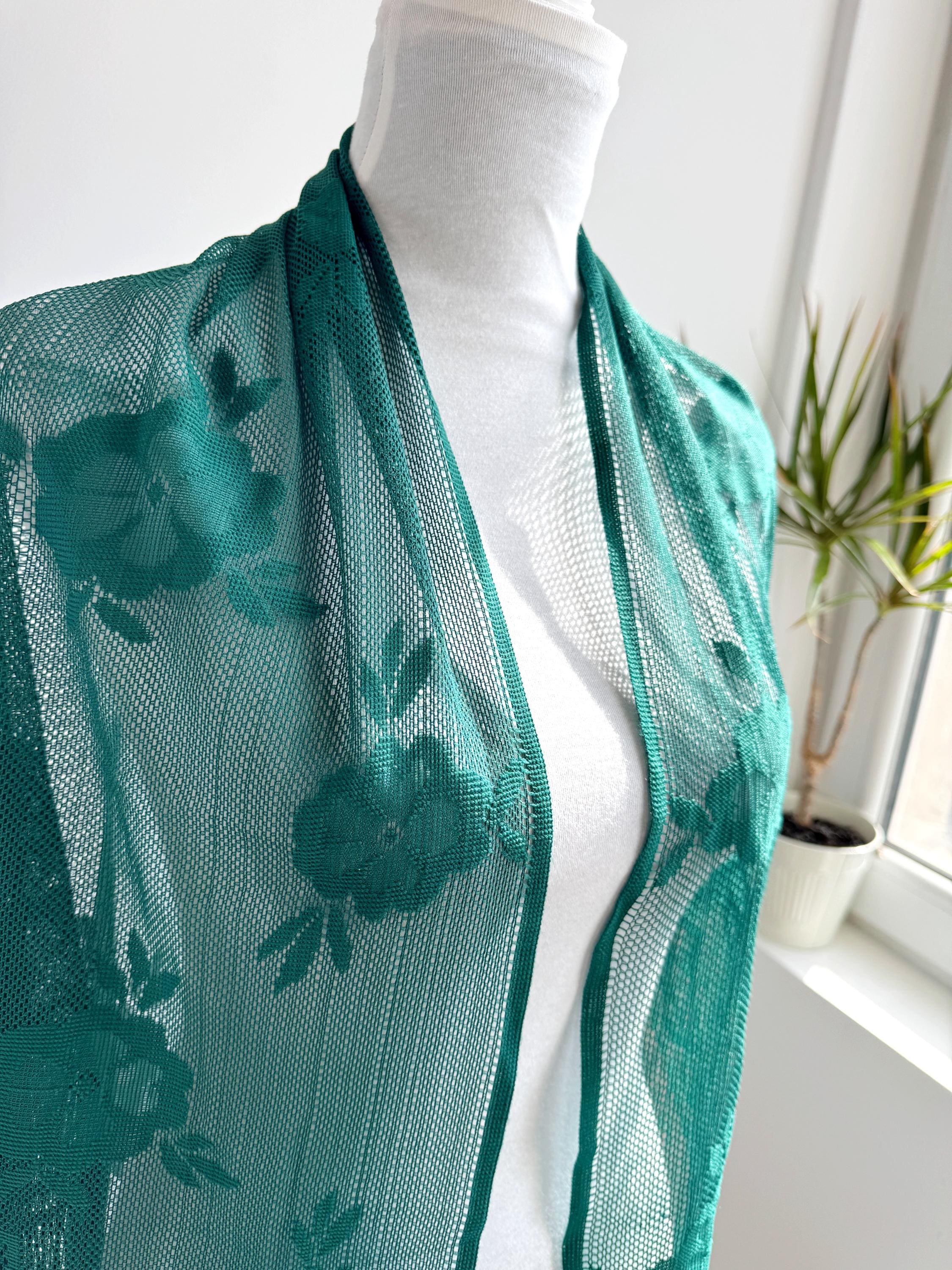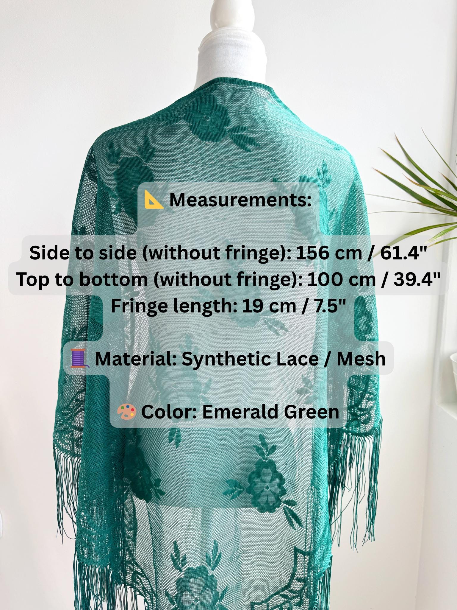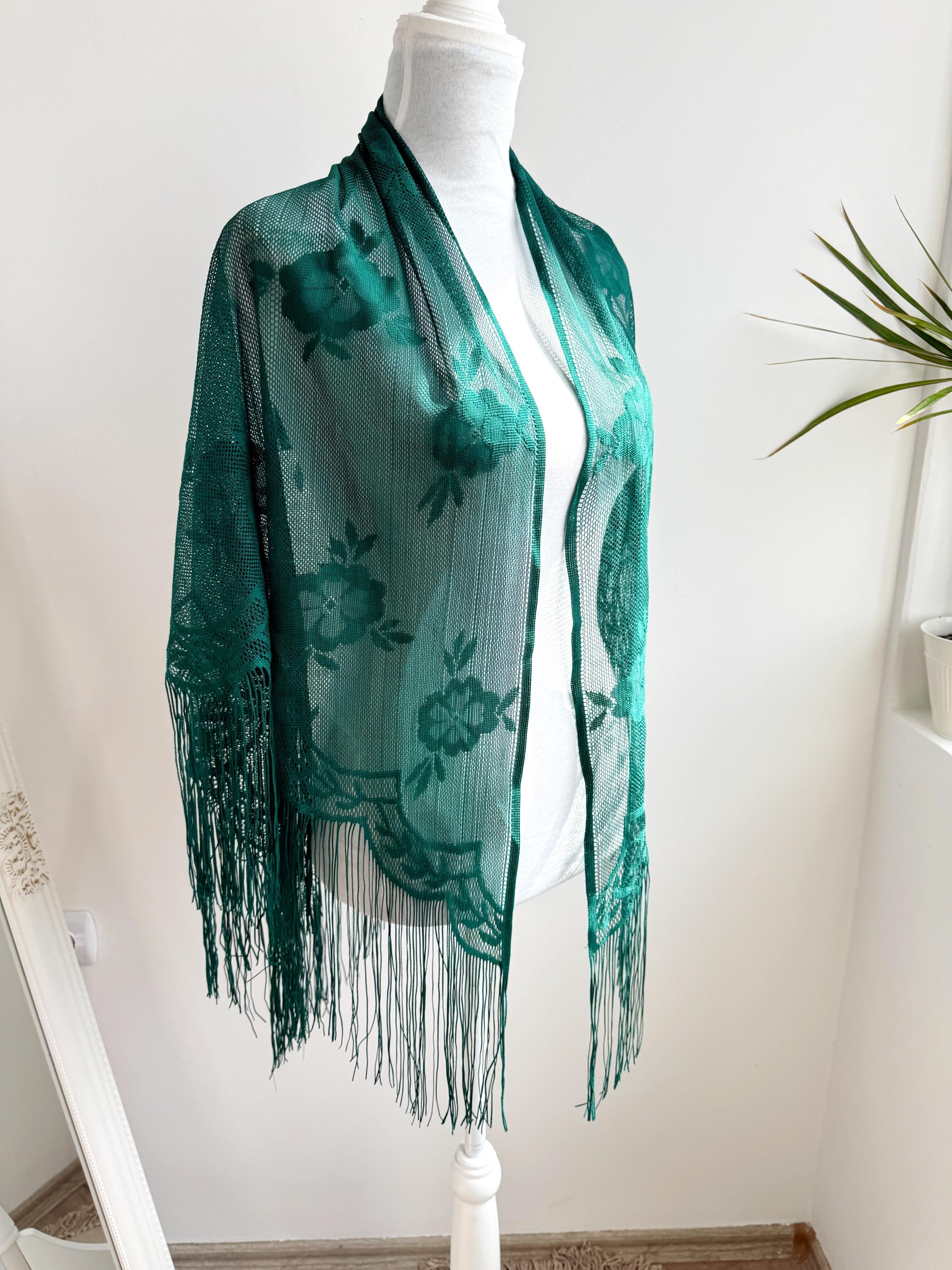 Whether you're looking for a unique evening wrap for a wedding, a sheer layering piece for a festival, or a classic mantilla-style head covering, this jewel-toned shawl drapes beautifully. The rich green hue is vibrant yet sophisticated, making it a standout accessory for any season.