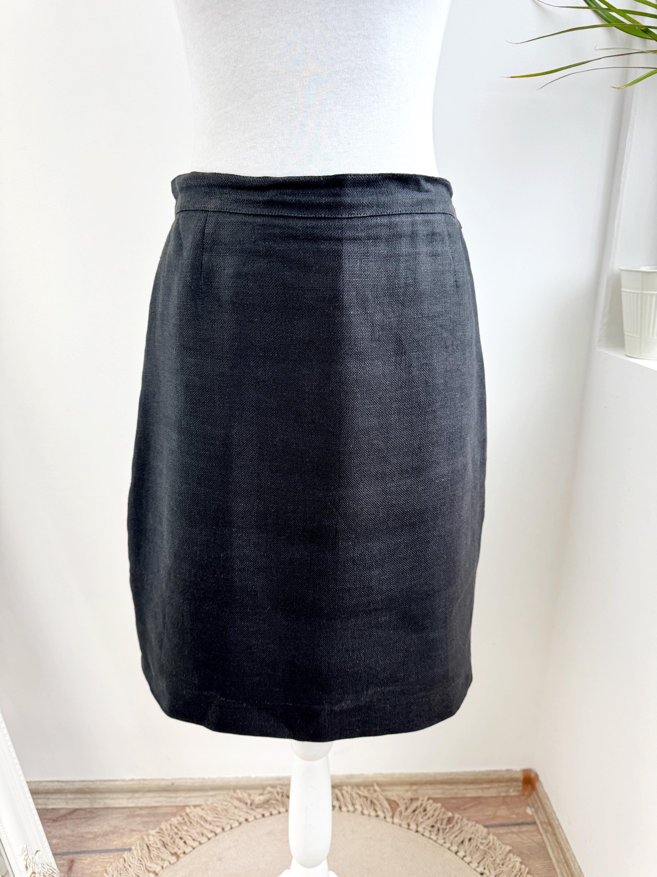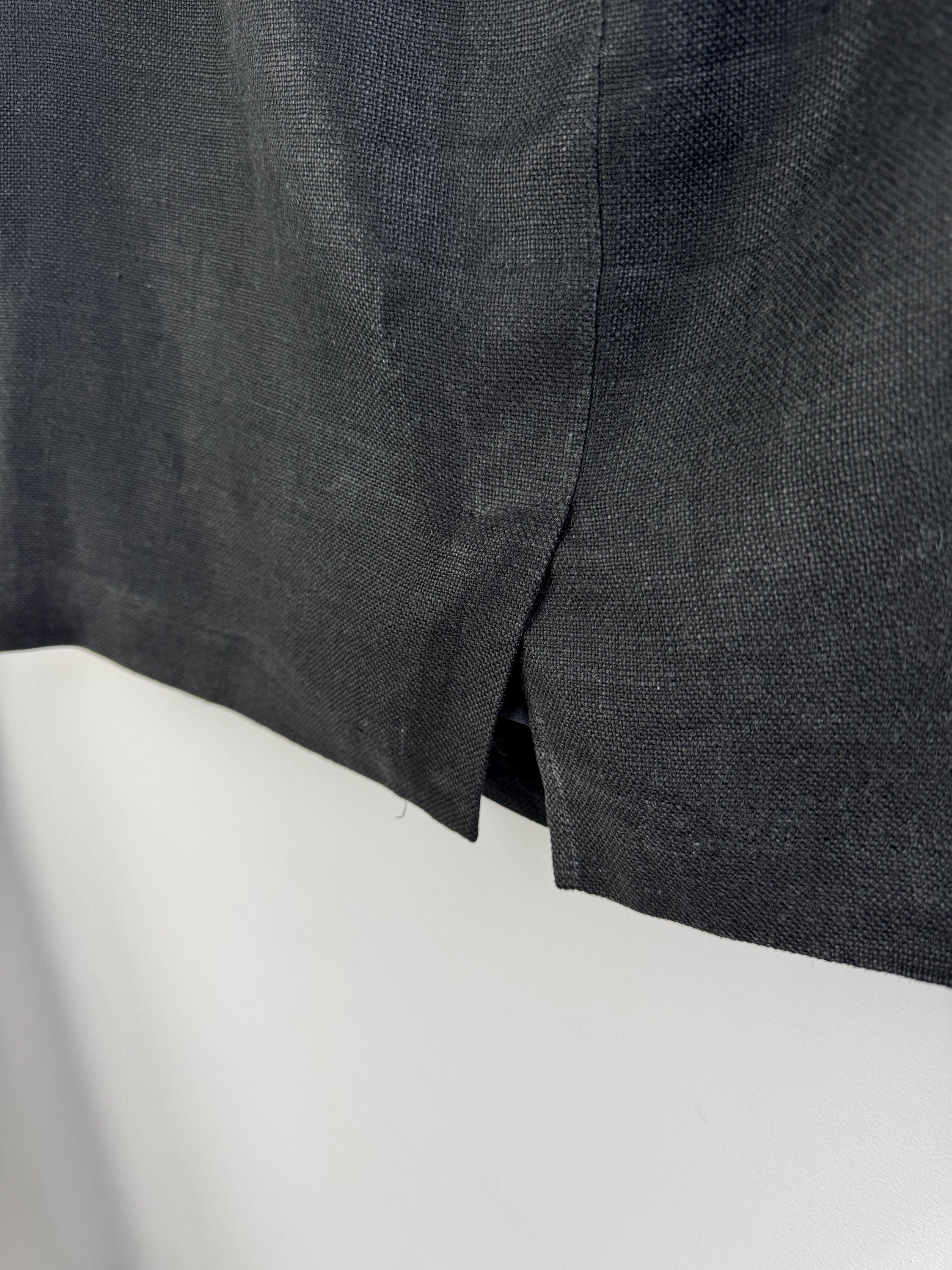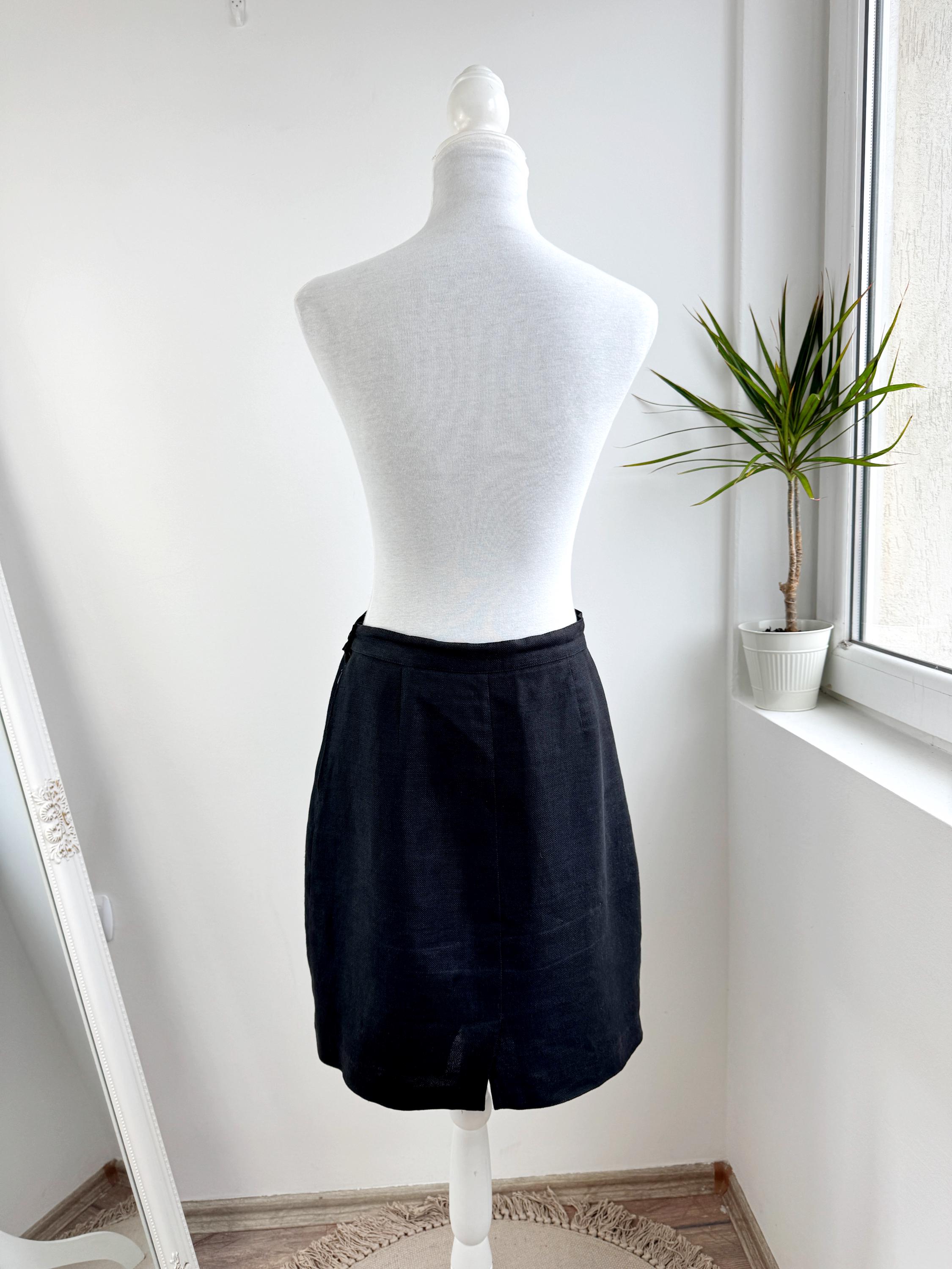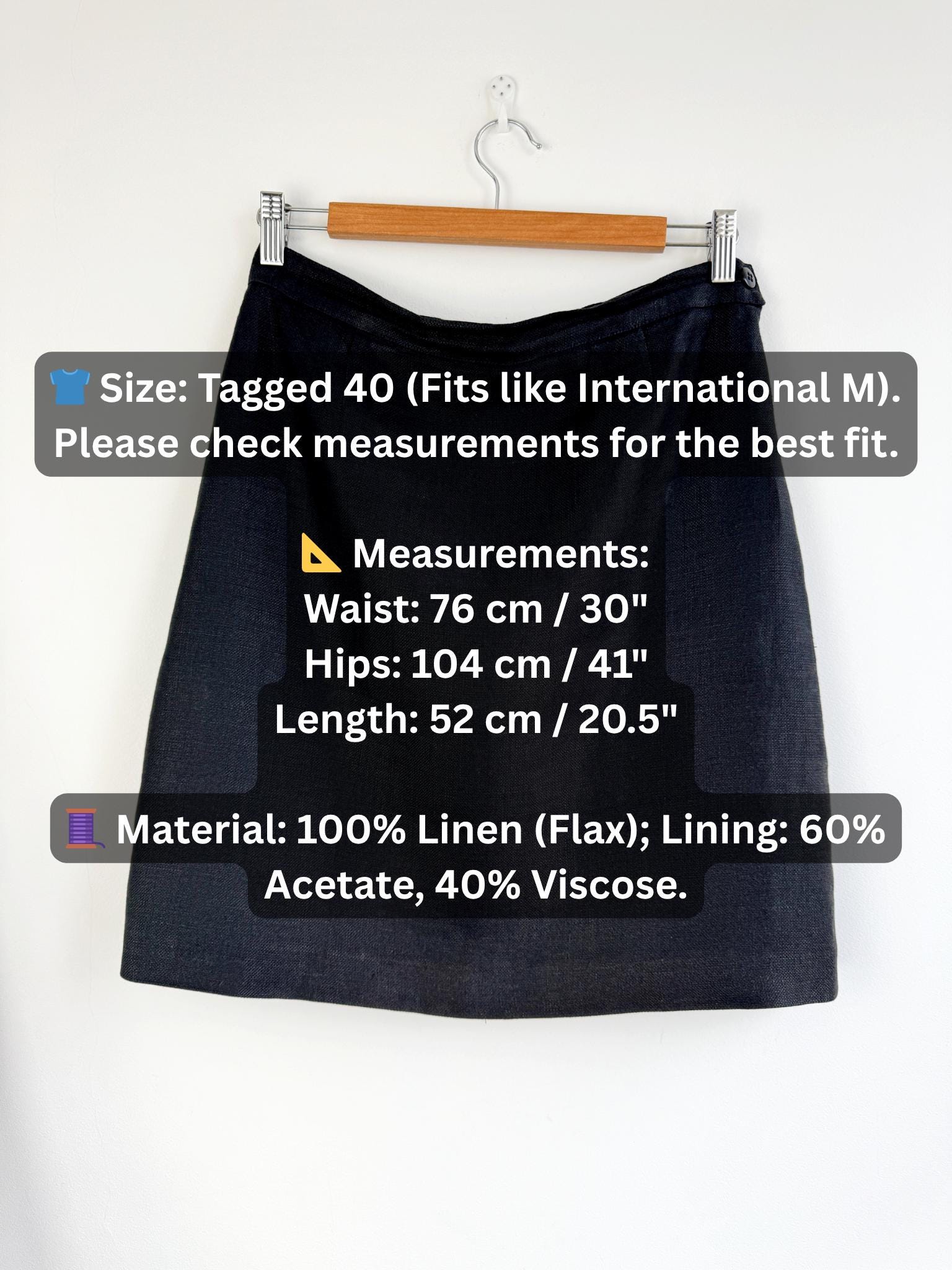 This classic black linen mini skirt by LUI & LEI is the epitome of 90s minimalist chic. Crafted from 100% high-quality flax linen, it features a structured yet breathable weave that makes it a perfect year-round staple. The sleek A-line silhouette is complemented by a high-waisted fit, a side zipper with a matching black button closure, and a full inner lining for a smooth, comfortable fit.